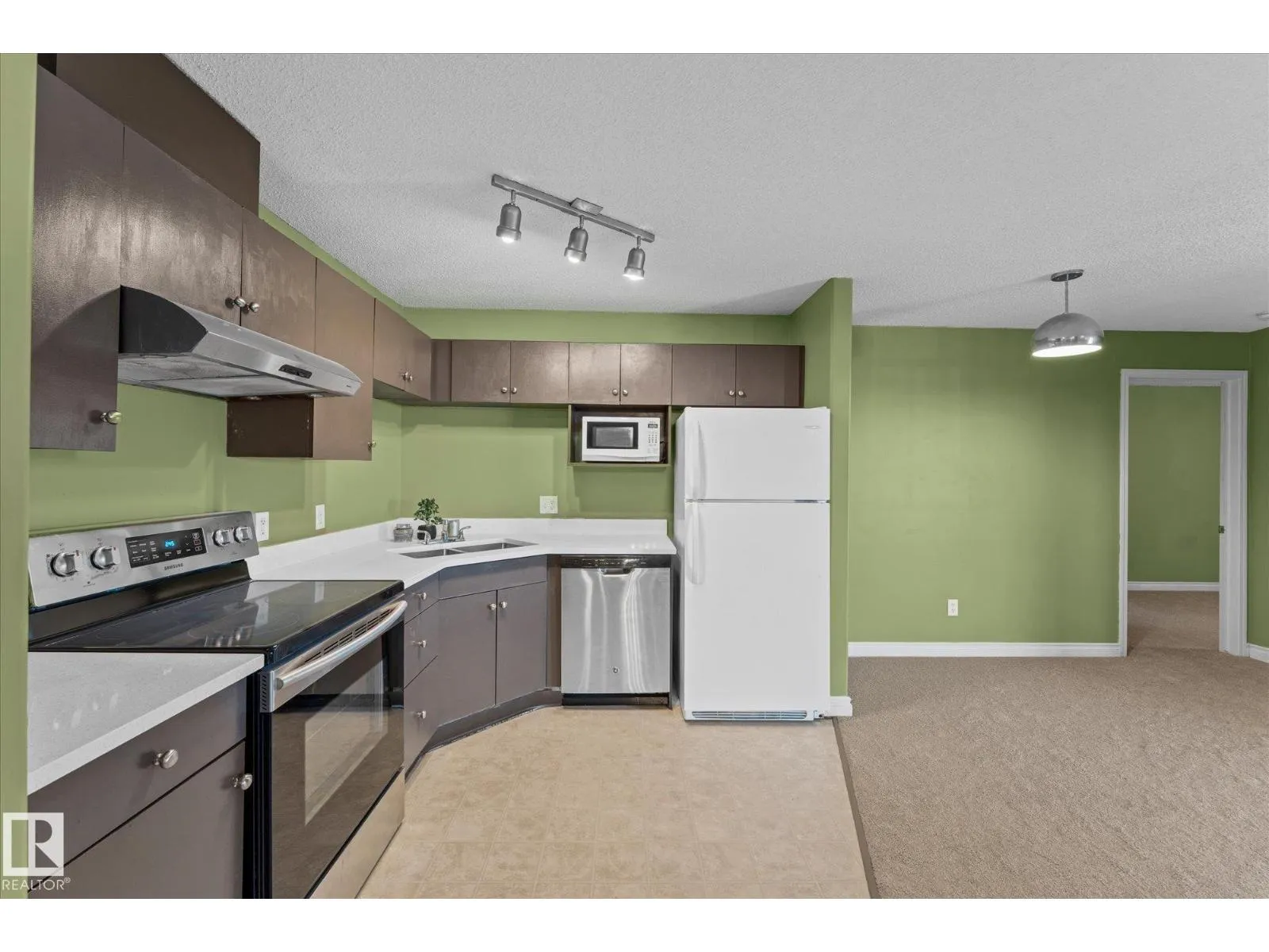 TOP-FLOOR GEM IN PARKDALE! Stylish and move-in ready, this spacious 1-BEDROOM + OPEN DEN condo (can be converted to a 2nd bedroom) offers 2 FULL baths, IN-SUITE LAUNDRY, and energized parking. The bright open layout showcases a modern L-shaped kitchen with NEW QUARTZ COUNTERTOPS, new carpet, and newer appliances. Both bathrooms feature upgraded quartz counters for a sleek touch. The large primary suite includes a walk-through closet and private ensuite, while the open den provides flexibility for a home office or guest space. Enjoy the quiet, SOUTHWEST-FACING BALCONY perfect for relaxing. This secure, newer built, well-managed building offers an elevator and ample visitor parking. STEPS FROM THE LRT, groceries, restaurants, coffee shops, and Commonwealth Stadium with easy access to Downtown, Rogers Place, and U of A. Low condo fees. Exceptional location, modern upgrades, and unbeatable value! *some photos virtually staged (id:27476)