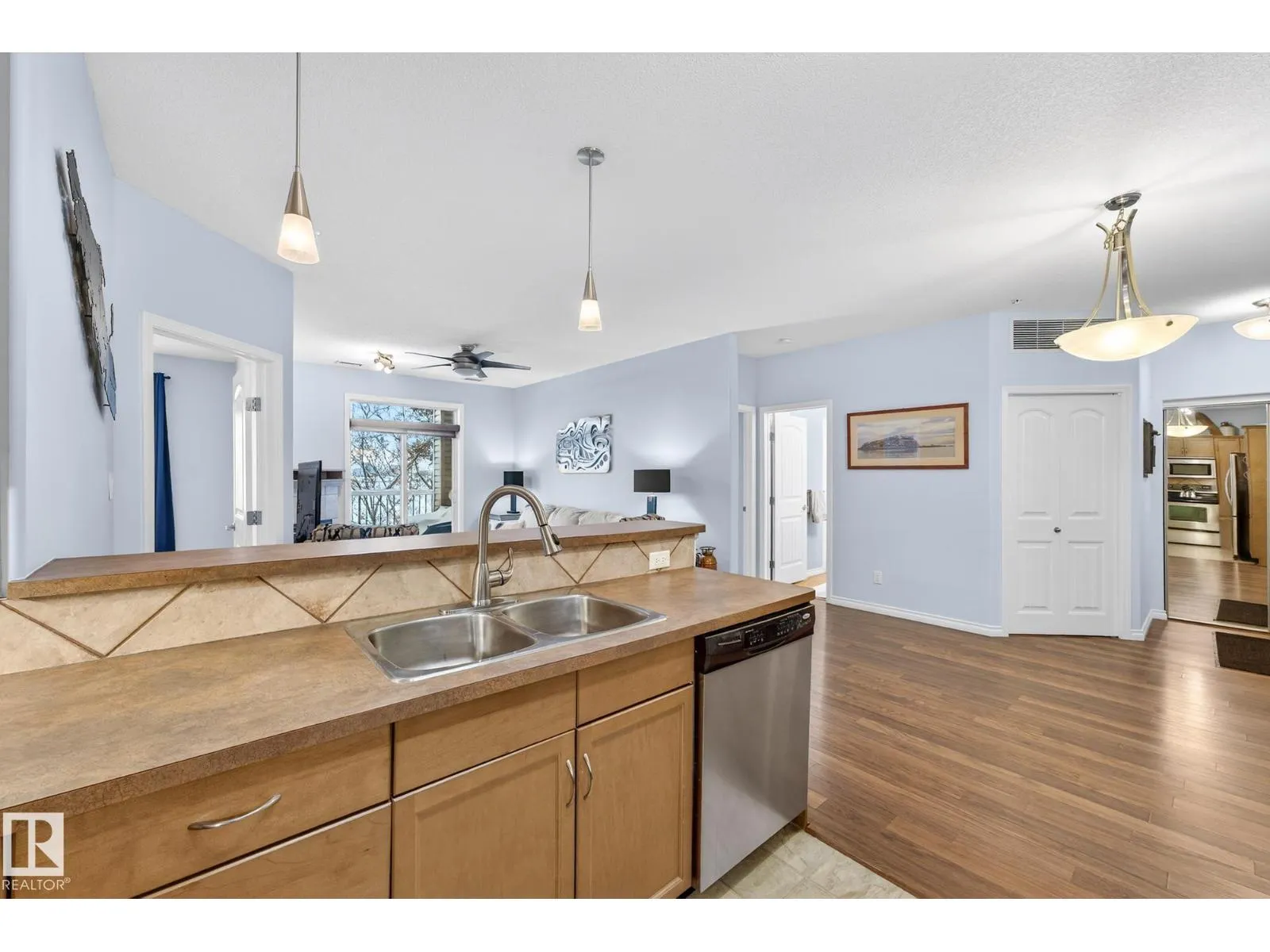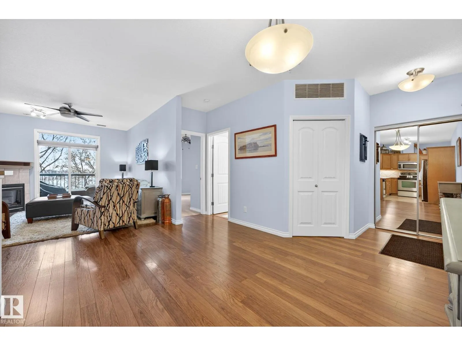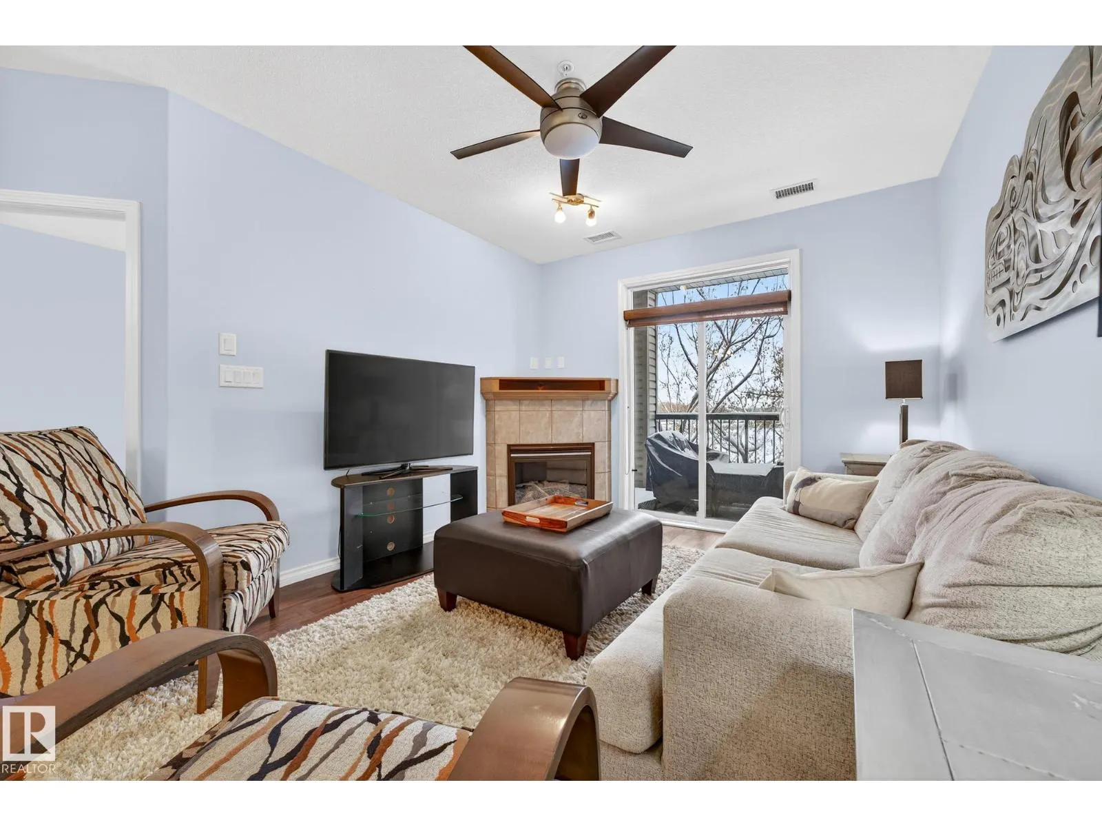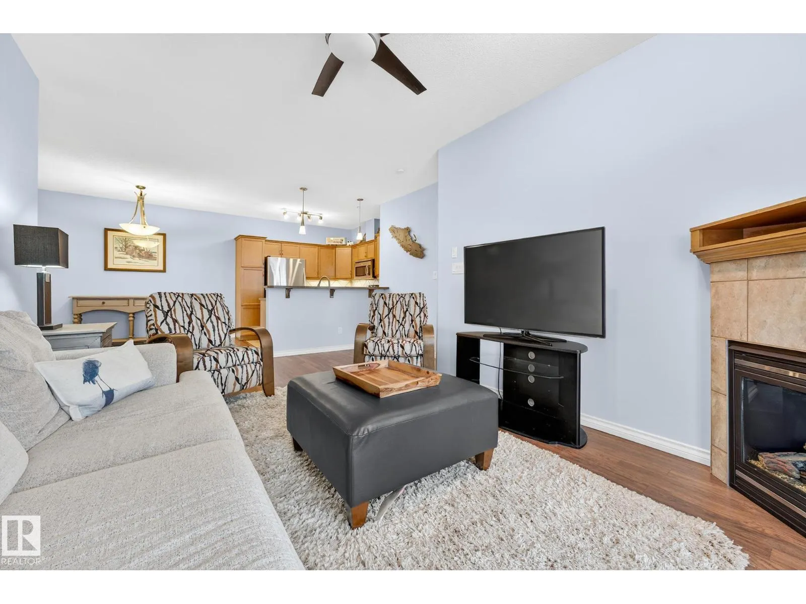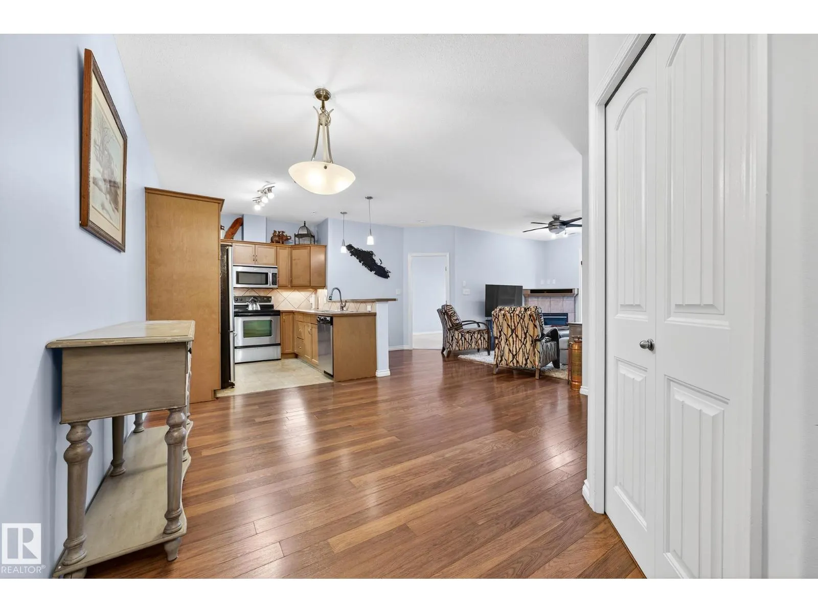 Say hello to this bright, south-facing 2 bed/2 bath open concept condo in Haddow, where comfort meets everyday living. A welcoming foyer leads to in-suite laundry and storage for effortless organization. The dining area flows into a U-shaped kitchen with stainless steel appliances, raised eating bar, pantry, and ample storage, perfect for quiet mornings and entertaining. The living room features a corner gas fireplace for cozy evenings next to a private covered balcony complete with a BBQ gas hook-up. Bedrooms are thoughtfully located on either side of the living room for additional privacy. The primary suite has walkthrough dual-sided mirrored closets with built-in organizers and a 3-piece ensuite. Heated underground parking with 2 titled stalls and 1 storage cage make coming home easy. Amenities to enjoy include the exercise room, social room, theatre, car wash, and guest suite rentals. Close to trails, services, shopping, Whitemud Drive, and Anthony Henday Drive. A place to truly feel at home. (id:27476)