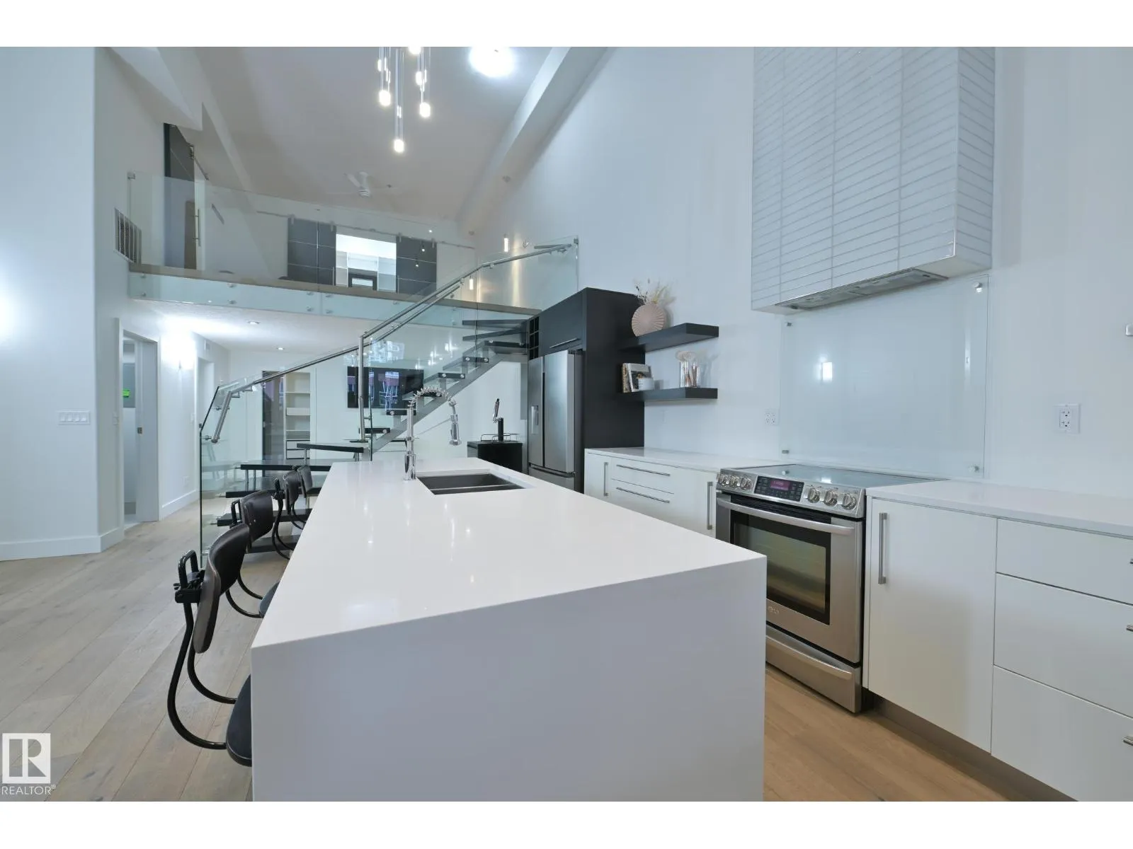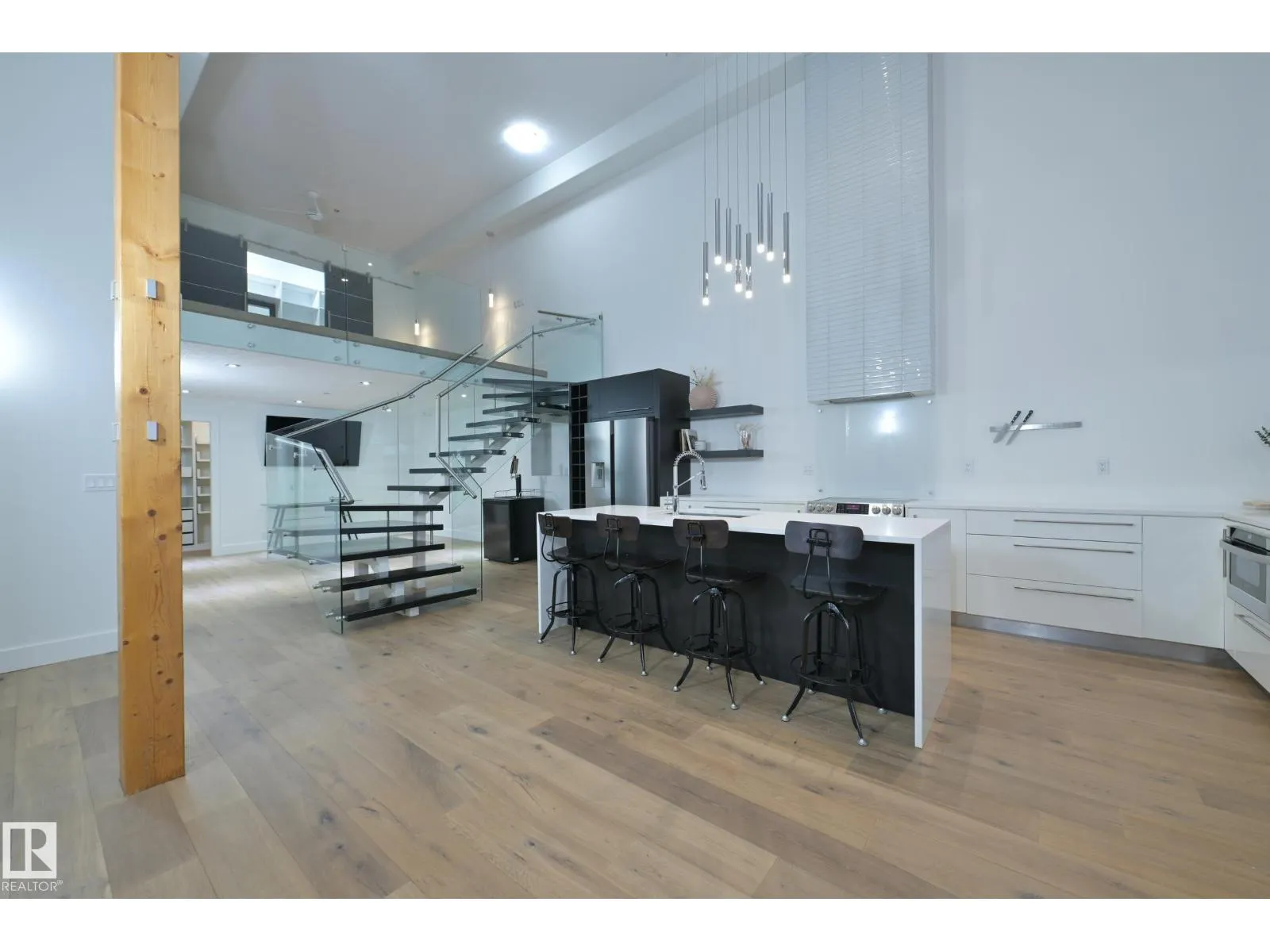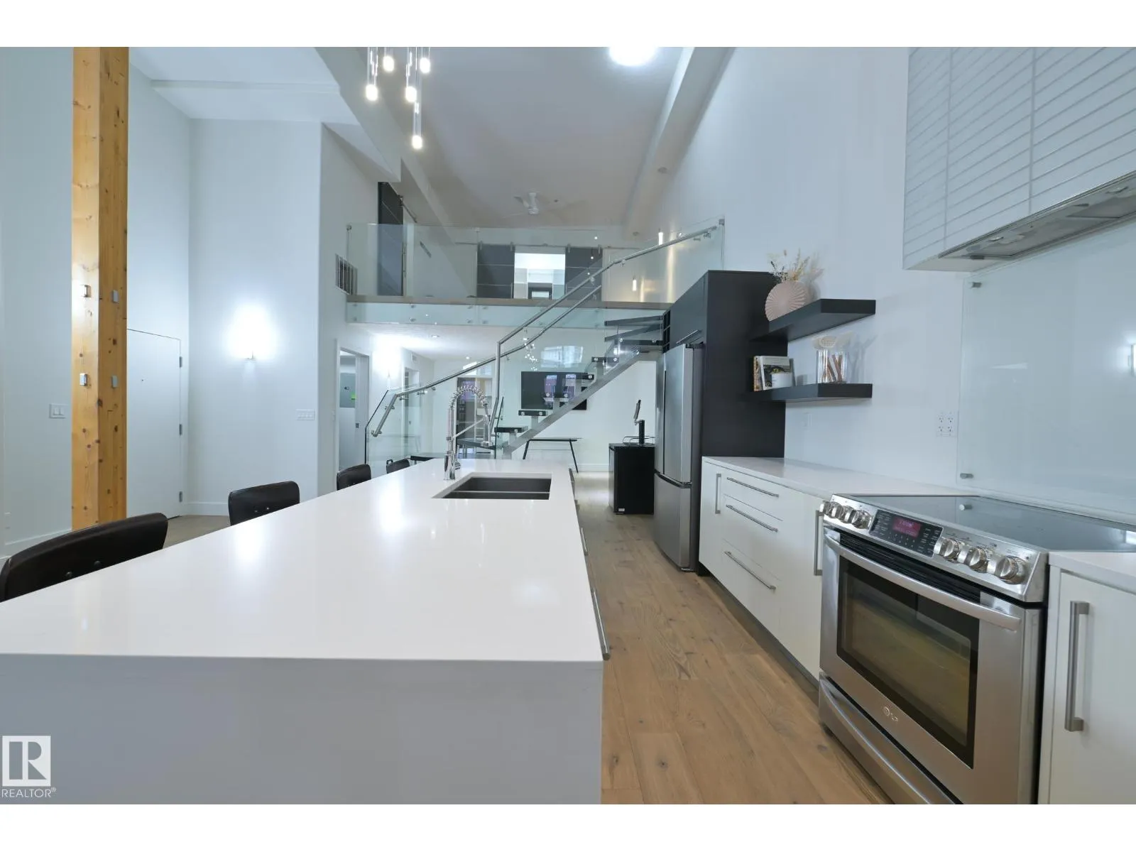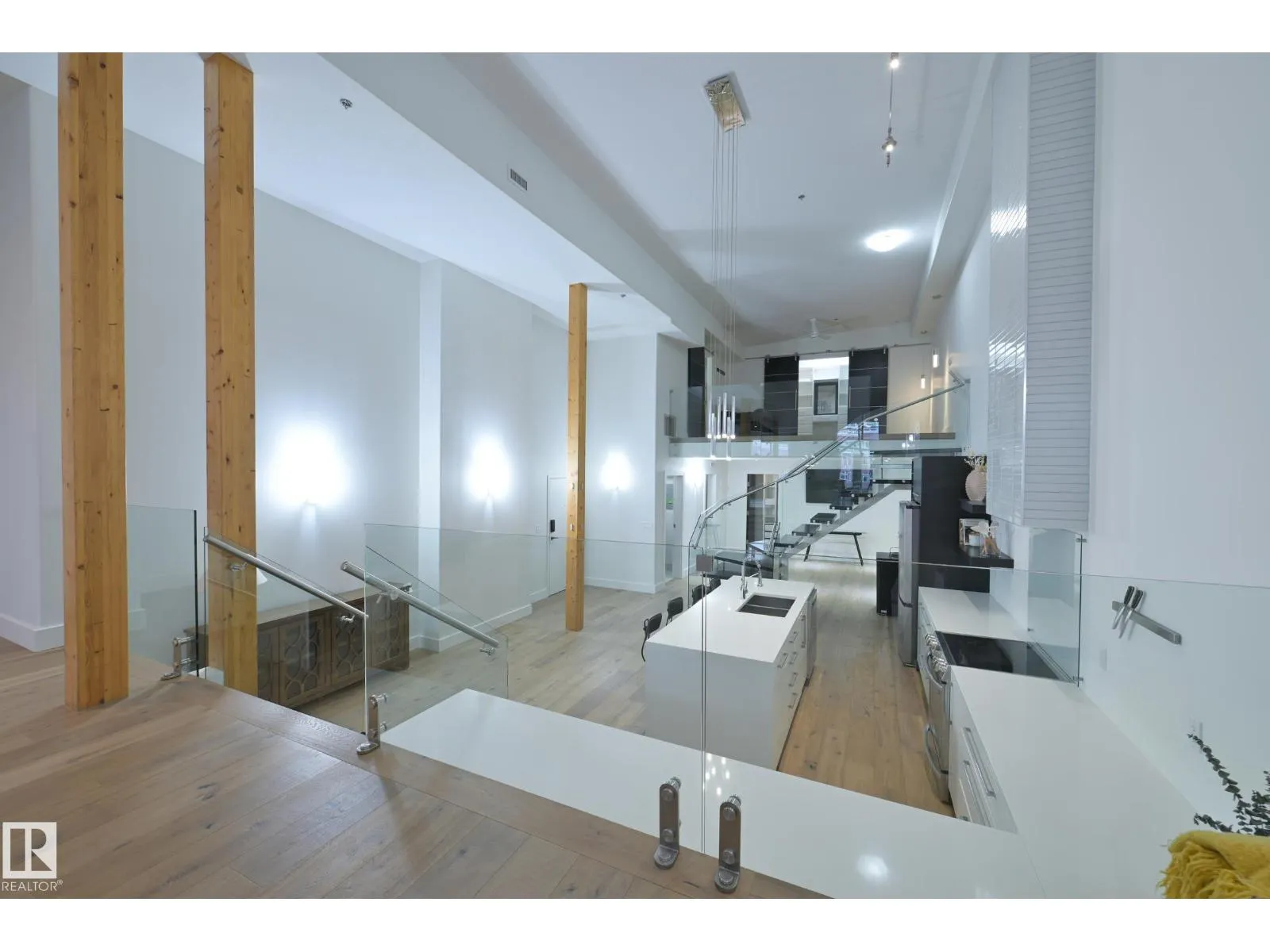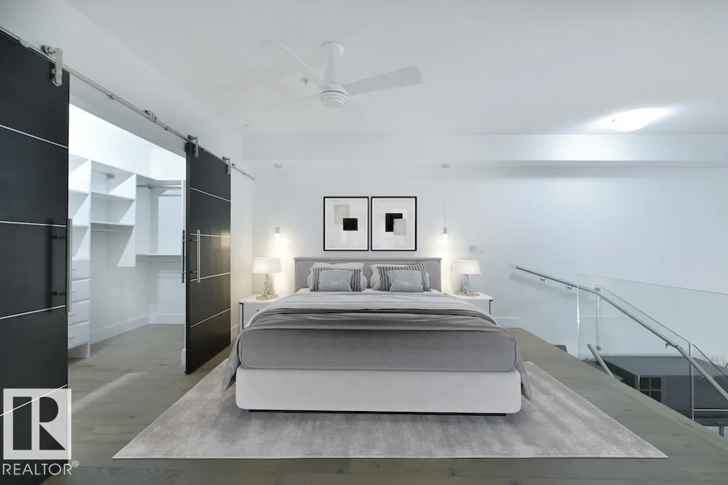 A very rare opportunity to own the PENTHOUSE suite in the sought after Morris Lofts, located in the heart of downtown Edmonton. Like nothing you've seen before, renovated from top to bottom, this home is absolutely spectacular. The bright & airy floor plan is flooding with natural light, hardwood floors, & soaring 24 foot ceilings that will take your breath away upon entry. Every detail of this home is well thought out creating the perfect layout. Offering a large storage room, laundry room, space for an office, pool table or workout space, living & dining space. Kitchen features 8 foot island w/ waterfall quartz countertops, expanding around the exterior allowing for tons of storage & counter space, custom tiled hood fan rising 12 ft, s/s appliances and custom cabinetry. The open glass riser staircase leads you to the luxurious suite with a lrg walk in closet, & tiled en-suite. Enjoy your summer evenings on your covered balcony which offers a view 104th street market & the sunset. (id:27476)