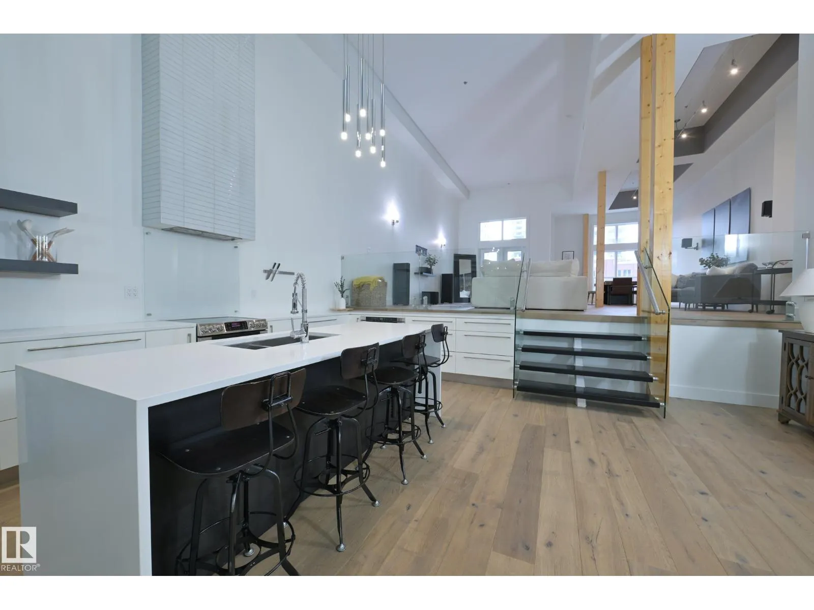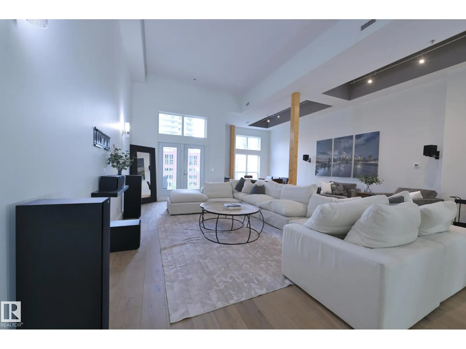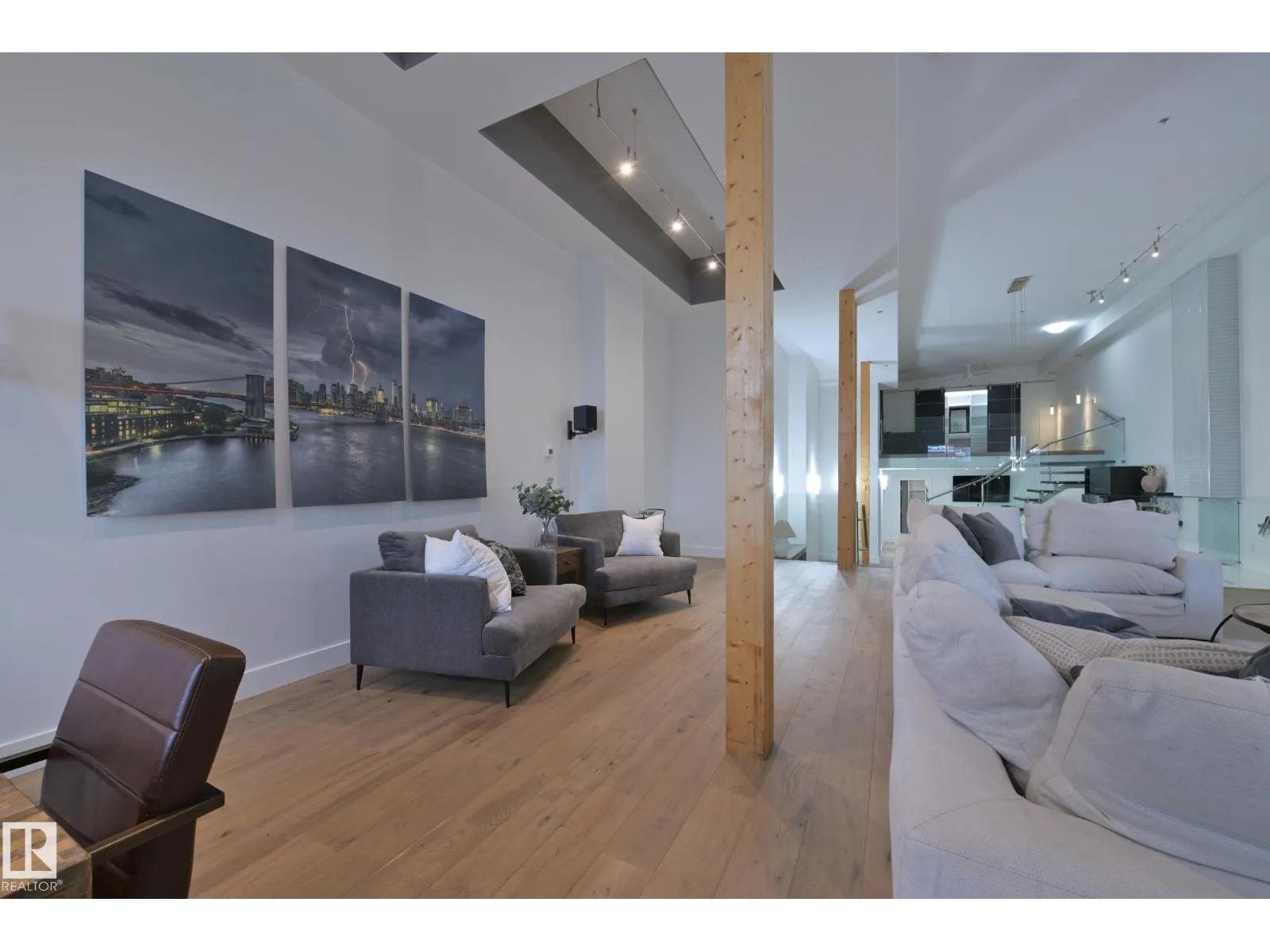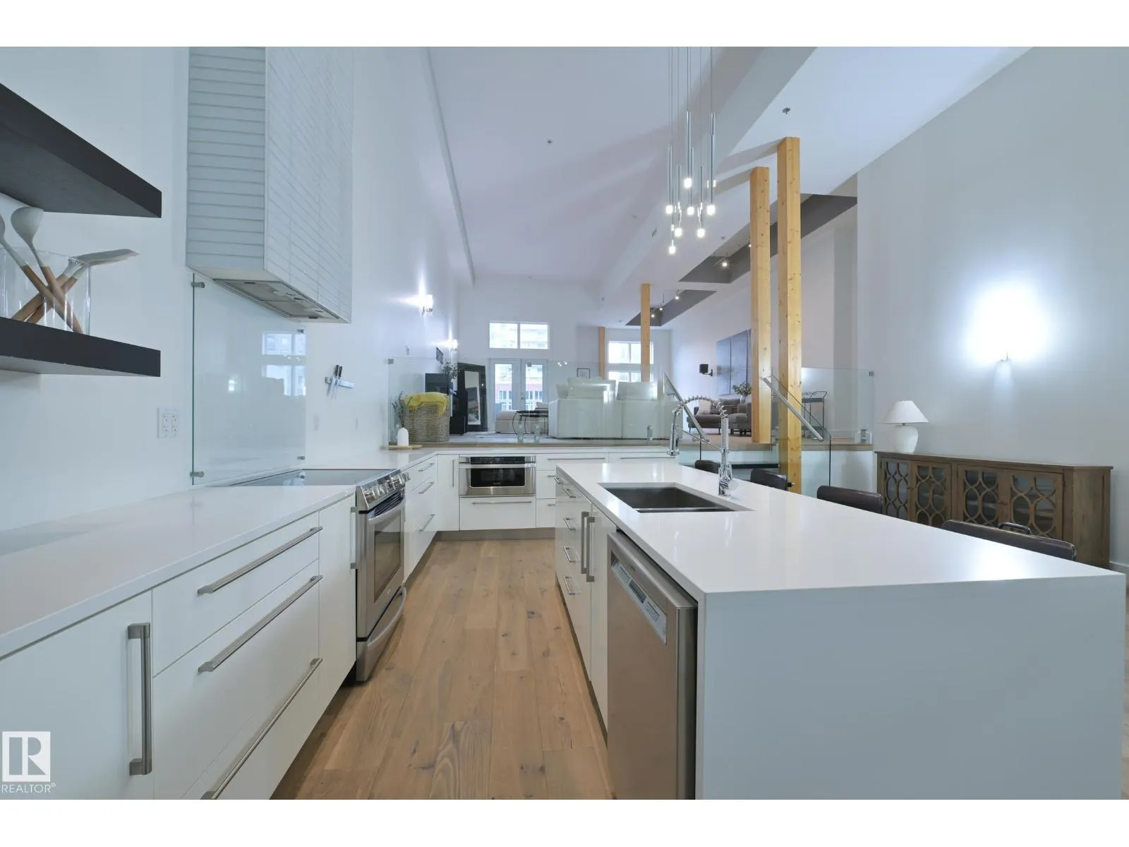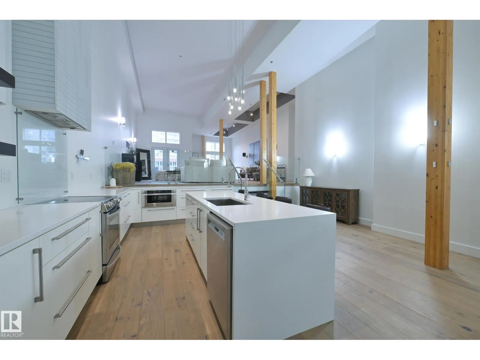 A very rare opportunity to own the PENTHOUSE suite in the sought after Morris Lofts, located in the heart of downtown Edmonton. Like nothing you've seen before, renovated from top to bottom, this home is absolutely spectacular. The bright & airy floor plan is flooding with natural light, hardwood floors, & soaring 24 foot ceilings that will take your breath away upon entry. Every detail of this home is well thought out creating the perfect layout. Offering a large storage room, laundry room, space for an office, pool table or workout space, living & dining space. Kitchen features 8 foot island w/ waterfall quartz countertops, expanding around the exterior allowing for tons of storage & counter space, custom tiled hood fan rising 12 ft, s/s appliances and custom cabinetry. The open glass riser staircase leads you to the luxurious suite with a lrg walk in closet, & tiled en-suite. Enjoy your summer evenings on your covered balcony which offers a view 104th street market & the sunset. (id:27476)