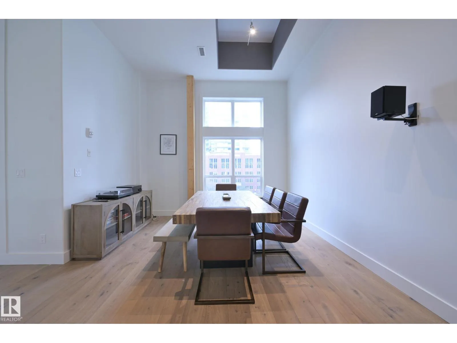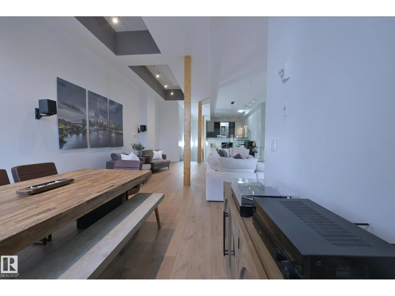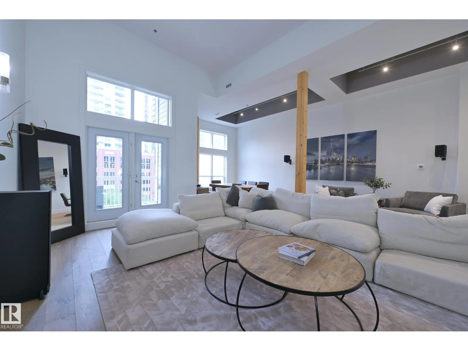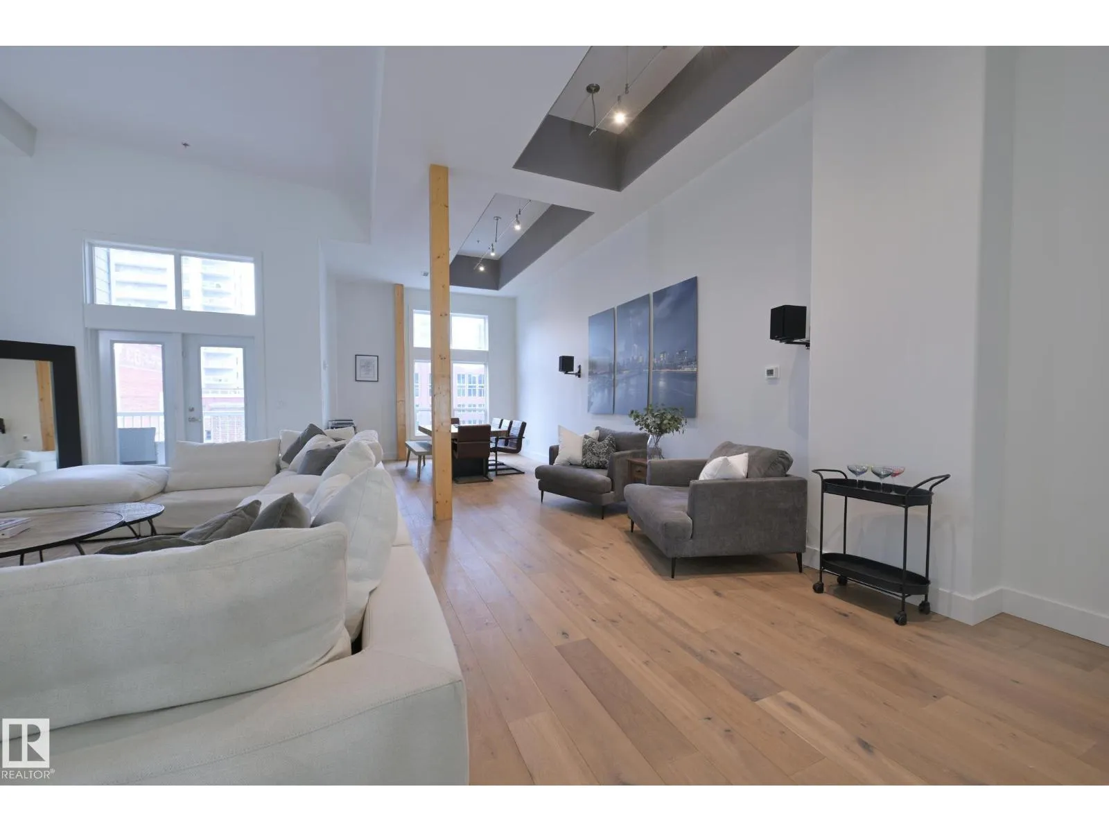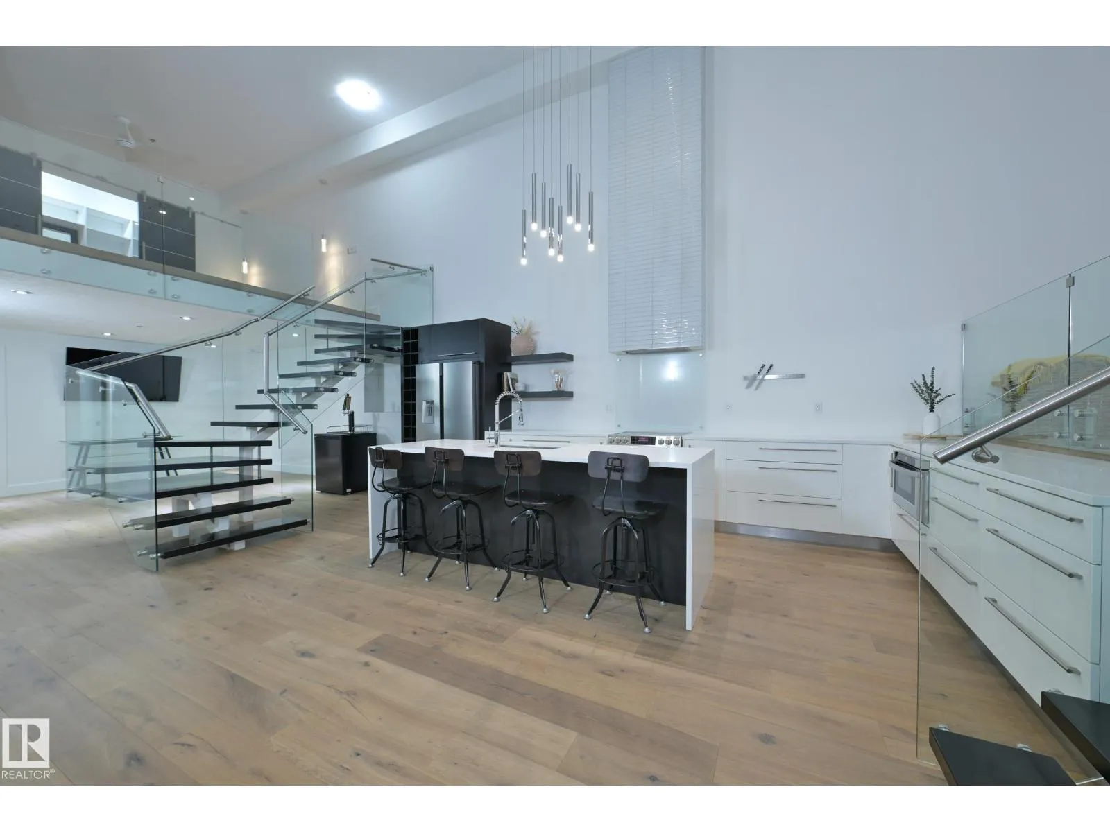 A very rare opportunity to own the PENTHOUSE suite in the sought after Morris Lofts, located in the heart of downtown Edmonton. Like nothing you've seen before, renovated from top to bottom, this home is absolutely spectacular. The bright & airy floor plan is flooding with natural light, hardwood floors, & soaring 24 foot ceilings that will take your breath away upon entry. Every detail of this home is well thought out creating the perfect layout. Offering a large storage room, laundry room, space for an office, pool table or workout space, living & dining space. Kitchen features 8 foot island w/ waterfall quartz countertops, expanding around the exterior allowing for tons of storage & counter space, custom tiled hood fan rising 12 ft, s/s appliances and custom cabinetry. The open glass riser staircase leads you to the luxurious suite with a lrg walk in closet, & tiled en-suite. Enjoy your summer evenings on your covered balcony which offers a view 104th street market & the sunset. (id:27476)