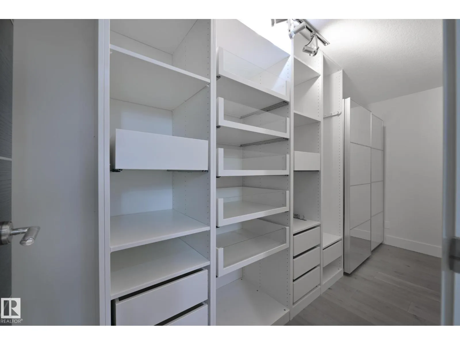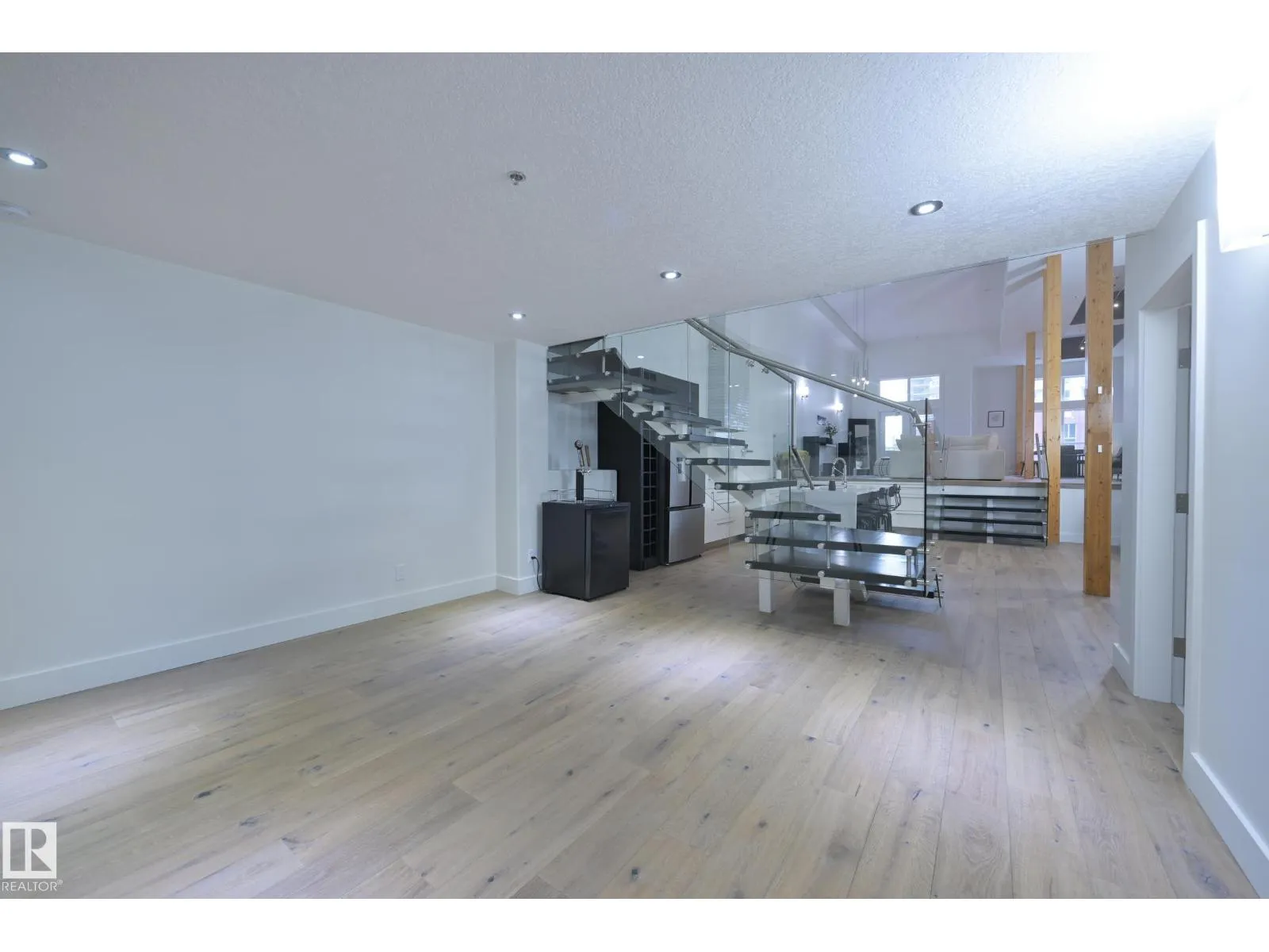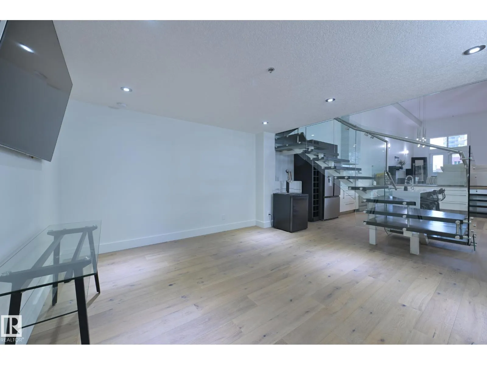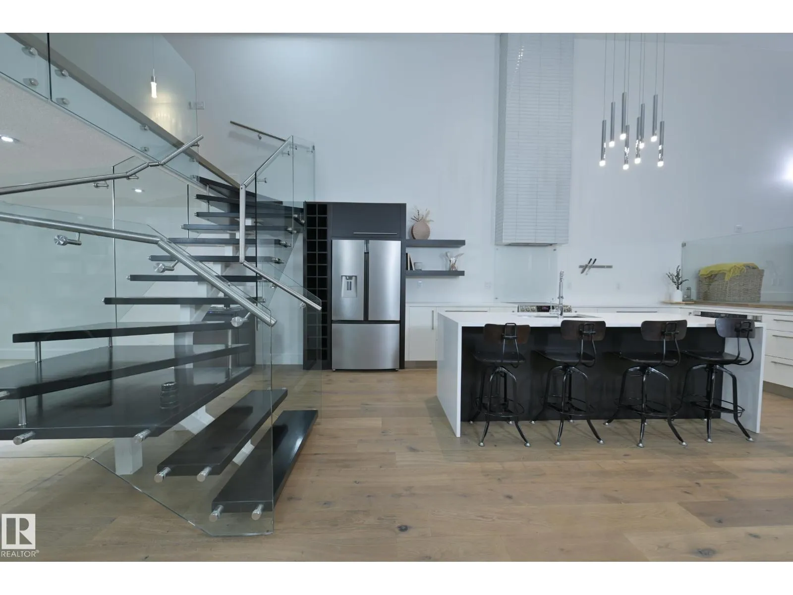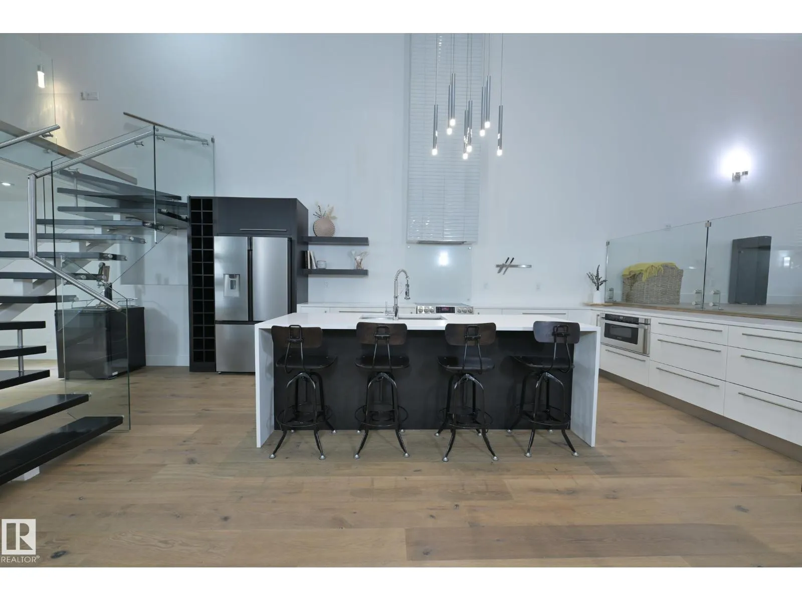 A very rare opportunity to own the PENTHOUSE suite in the sought after Morris Lofts, located in the heart of downtown Edmonton. Like nothing you've seen before, renovated from top to bottom, this home is absolutely spectacular. The bright & airy floor plan is flooding with natural light, hardwood floors, & soaring 24 foot ceilings that will take your breath away upon entry. Every detail of this home is well thought out creating the perfect layout. Offering a large storage room, laundry room, space for an office, pool table or workout space, living & dining space. Kitchen features 8 foot island w/ waterfall quartz countertops, expanding around the exterior allowing for tons of storage & counter space, custom tiled hood fan rising 12 ft, s/s appliances and custom cabinetry. The open glass riser staircase leads you to the luxurious suite with a lrg walk in closet, & tiled en-suite. Enjoy your summer evenings on your covered balcony which offers a view 104th street market & the sunset. (id:27476)