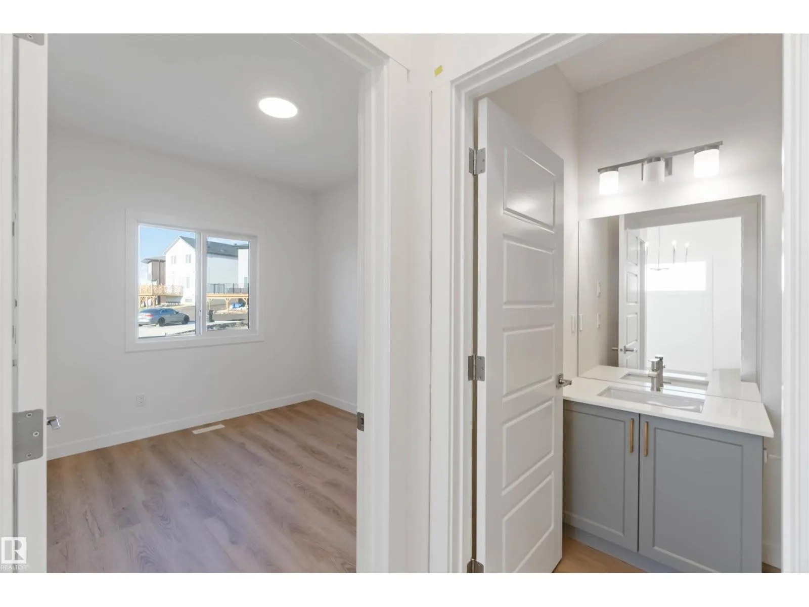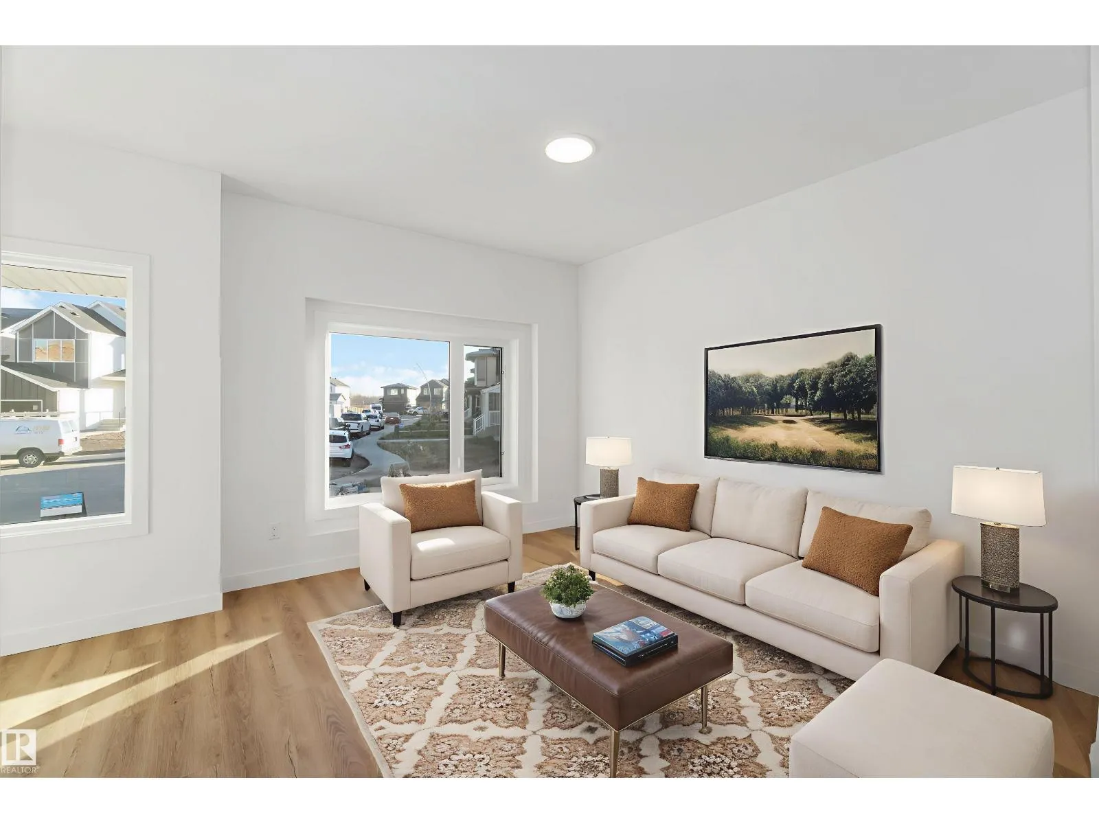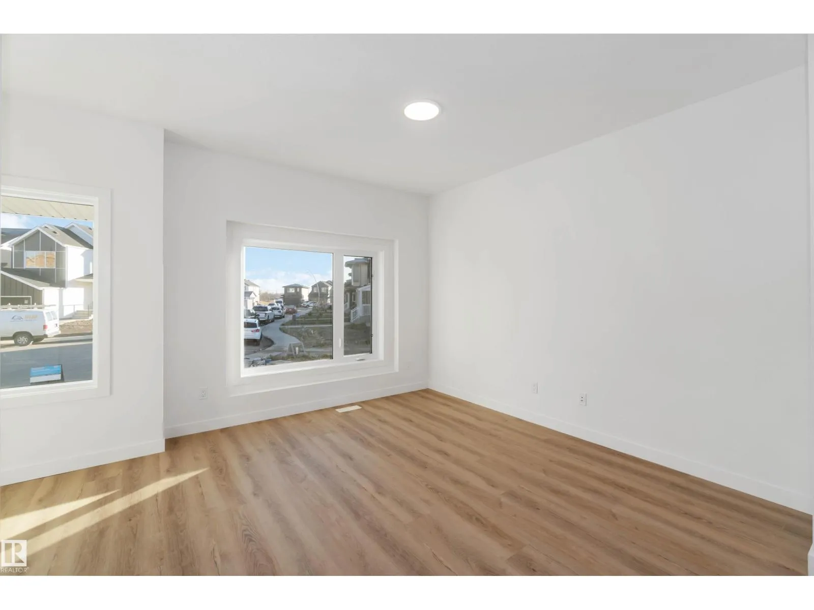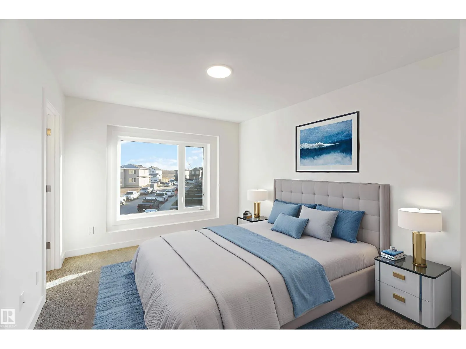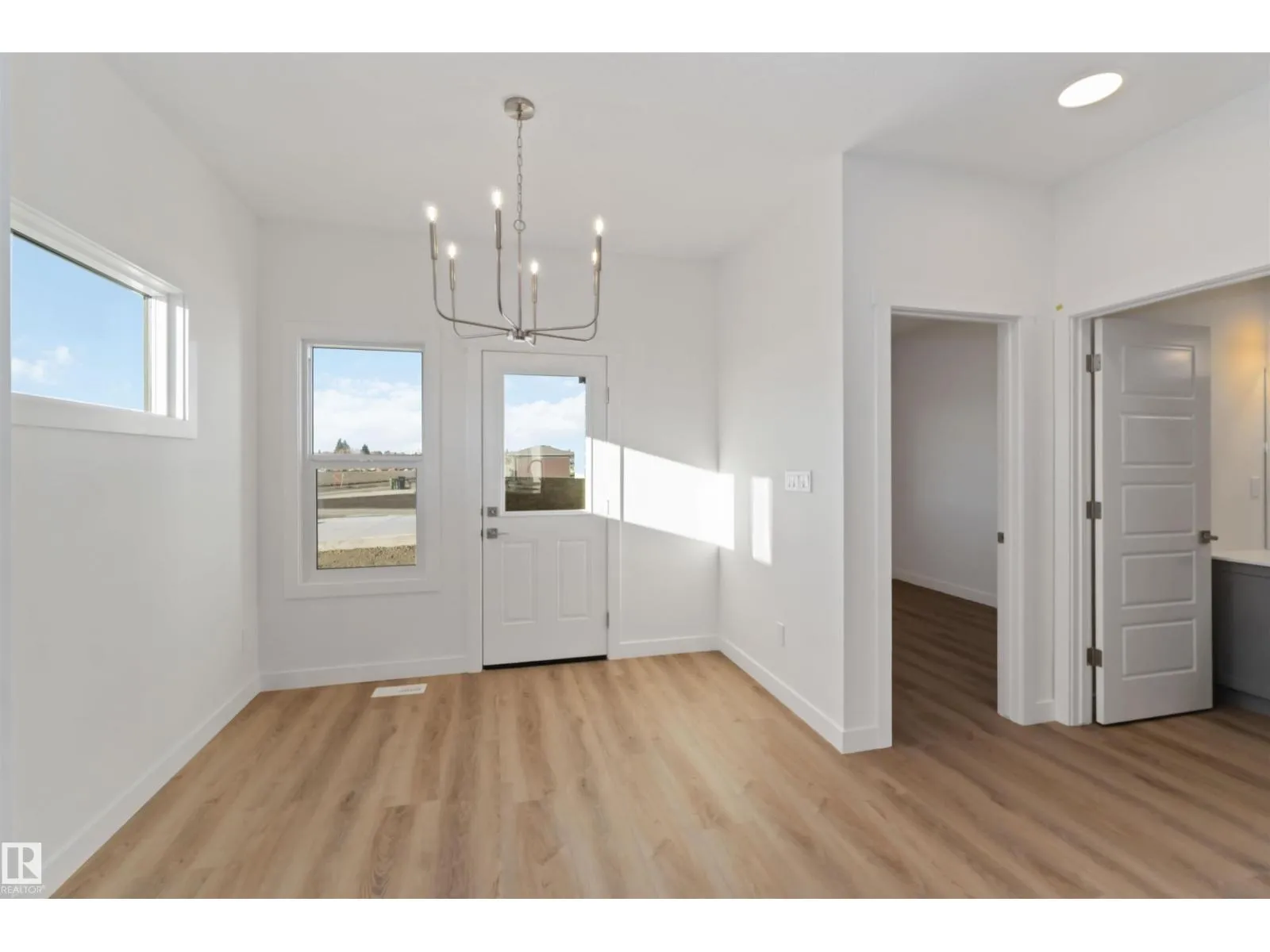 Welcome to The Sylvan by Sterling Homes, a beautifully designed home on a large pie lot with the option to add a triple car garage. The main floor features luxury vinyl plank flooring, 9â ceilings, and a welcoming foyer with a walk-in coat closet leading to a bright great room. The kitchen offers quartz countertops, an island with flush eating ledge and Silgranit undermount sink, Thermofoil cabinetry with soft-close doors and drawers, over-the-range microwave, and a pantry tucked by the staircase. A sunlit nook overlooks the backyard, with a main-floor bedroom, 3-piece bath, and garden door for outdoor access. Upstairs features a primary suite with walk-in closet and 3-piece ensuite, two additional bedrooms, a full bath, and a laundry closet. Brushed nickel fixtures, separate side entrance, basement rough-in, and a parking pad with option for detached garage complete this home. (id:27476)
