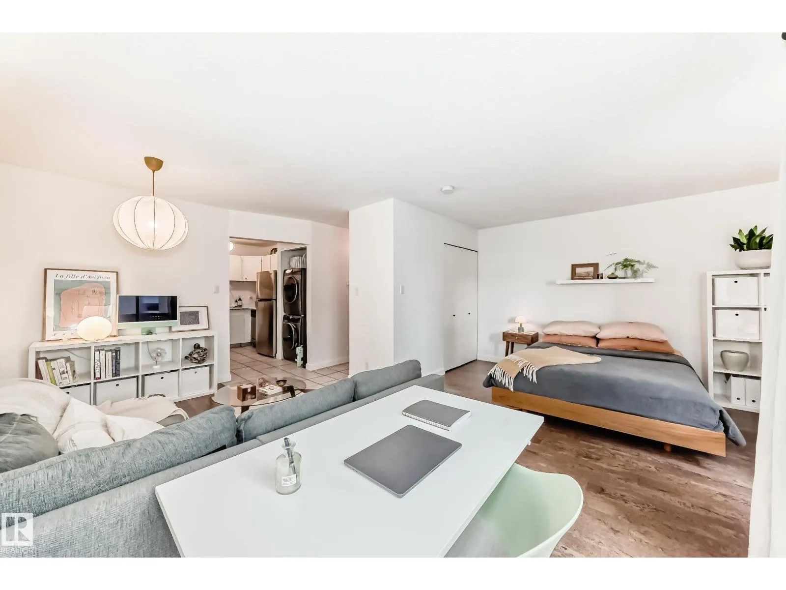 Welcome to The Solarium, this bright, top-floor west-facing studio offers an open-concept L-shaped floor plan, large closet, updated bathroom, freshly painted, in-suite laundry, and a spacious balcony perfect for sunsets. The kitchen features stainless steel appliances, new countertops, tile backsplash, and ample cabinetry. Including a large walk-in pantry. Modern cork flooring throughout. Well-managed building with condo fees under $500, private storage locker just steps away from your unit. Other amenities are the bike room, and courtyard. Mortgage + condo fees including your assigned parking stall- approx. $1,200/month or less depending on your downpayment. One of downtownâs best locationsâ with tree-lined streets and mature landscaping, this neighbourhood is one to enjoy. Only steps away to shopping, restaurants, transit, and the river valley. Bright, quiet, and move-in ready. So, whether you want to stop renting & own your own space or are you an investor, this unit is the one for you! (id:27476)