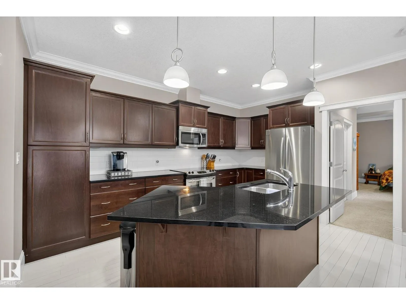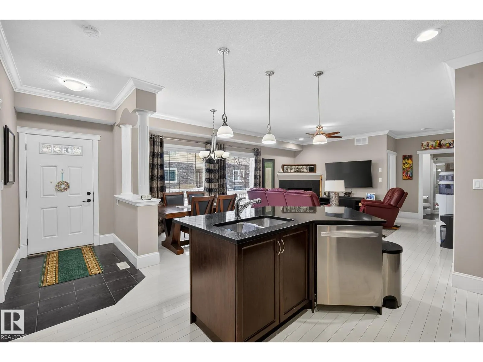 Welcome to this beautiful bungalow townhouse conveniently located in South Terwillegar right off the Anthony Henday! Main entrance sheltered by large carport area with NG hook-up, provides direct access to spacious kitchen that boasts solid maple cabinets, upgraded S/S appliances, oversized island all finished with granite countertops that flow into bright living & dining room areas. The main living area is open concept with elevated 9â ceilings, decorative crown moulding and modern white hardwood flooring. Foyer, bathrooms & in-suite laundry area laid with durable ceramic tile, upgraded carpet in bedrooms. Main bedroom accompanied with 4 pcs ensuite & walk-in-closet, on opposite end 2nd bed has 3 pcs bath near by. Home equipped with A/C and upgraded ceiling fans/lights with remotes. Laundry room & bsmt access are steps away from the single attached garage entrance. Easy parking access & additional parking outside. Condo fees include water & heat. Low maintenance living and steps away from ALL amenities!! (id:27476)