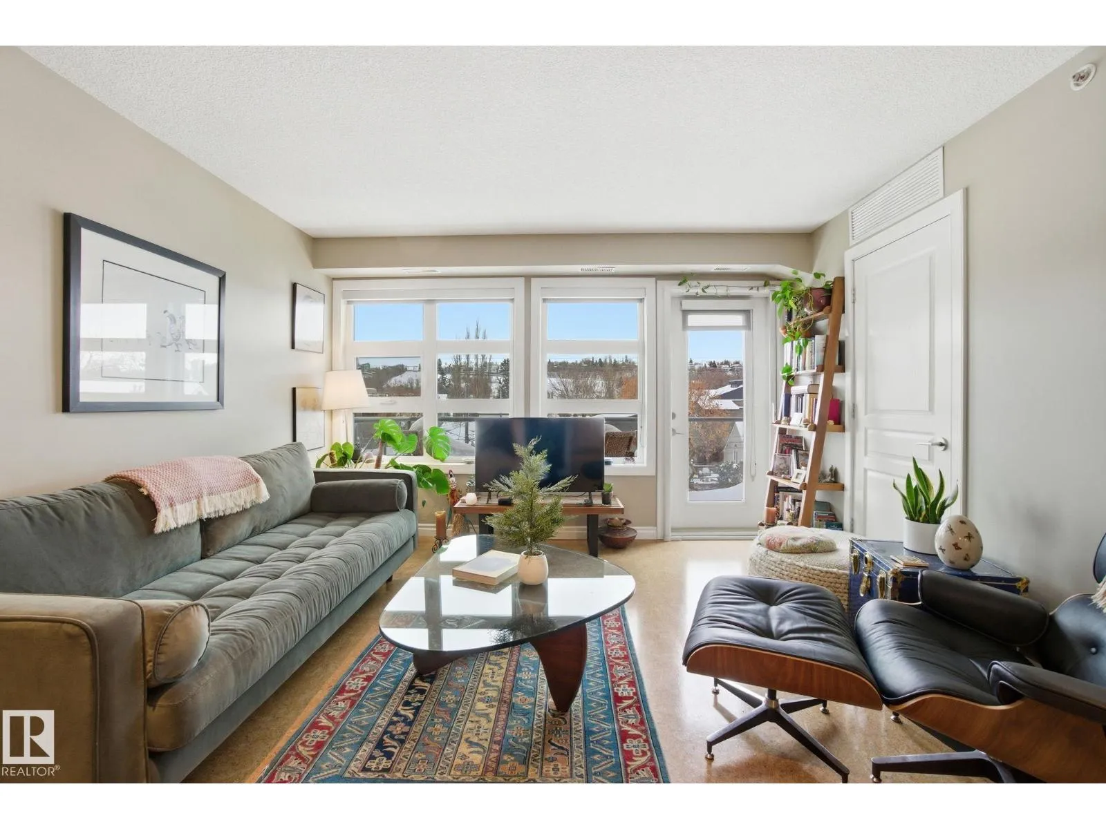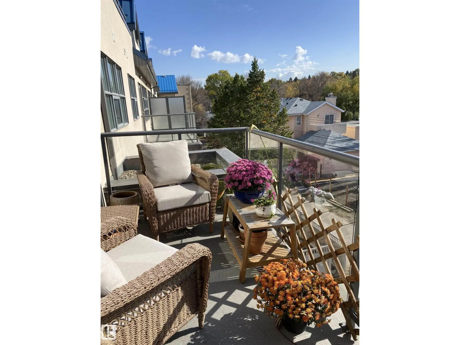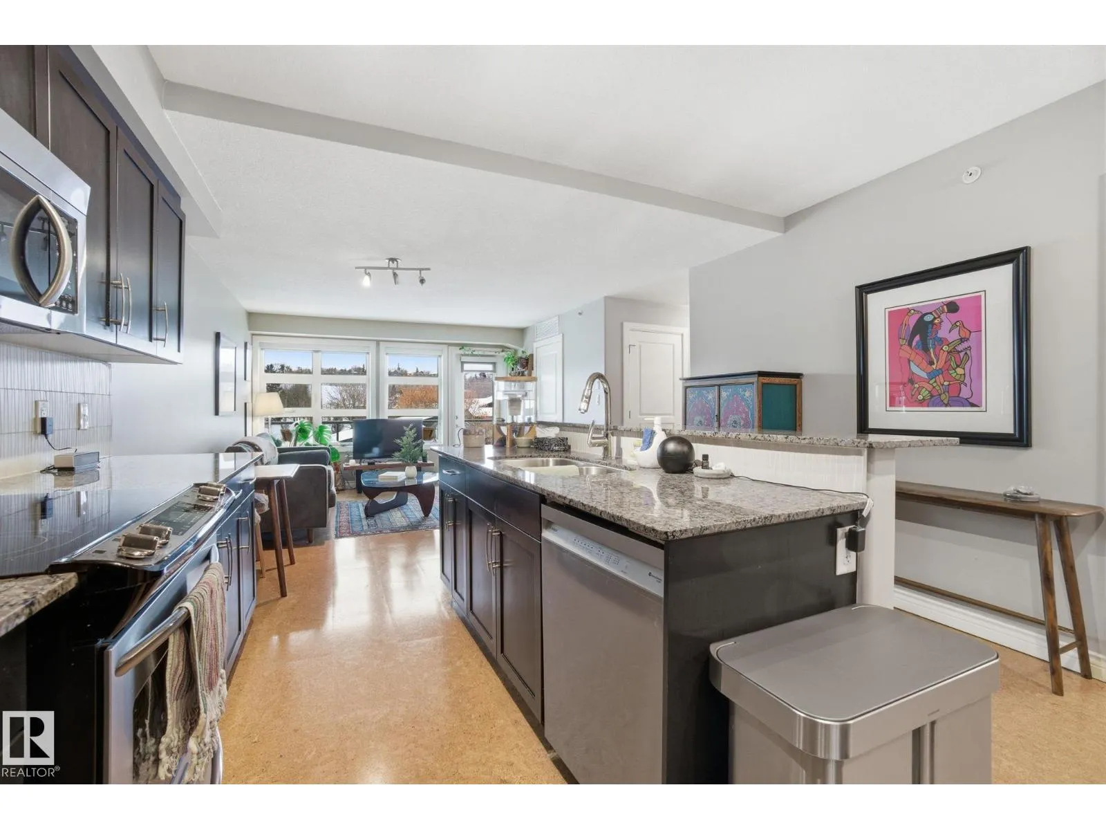Perched on the top floor with a desirable corner unit, this refined 2 bed, 2 bath residence in Waterside Estates delivers a balance of urban convenience and natural surroundings. Sunlight pours through the south facing windows, enhancing the open-concept layout while offering a polished feel throughout. The spacious primary bedroom is thoughtfully designed to accommodate a king-sized bed and seating area, complete with a 6-pc ensuite featuring double sinks, generous counter space, and a walk-in closet. A second bedroom and full bath provide flexibility for guests, a home office, or shared living. New cork flooring adds warmth and continuity across the unit, while in-suite laundry, private balcony, and access to a car wash bay elevate everyday comfort. Extensive building upgrades including new windows, balconies, and energy-efficient exterior. Steps from River Valley trails, the LRT, Muttart and minutes to downtown, this is effortless city living with unmatched access to nature, culture, and connectivity. (id:27476)