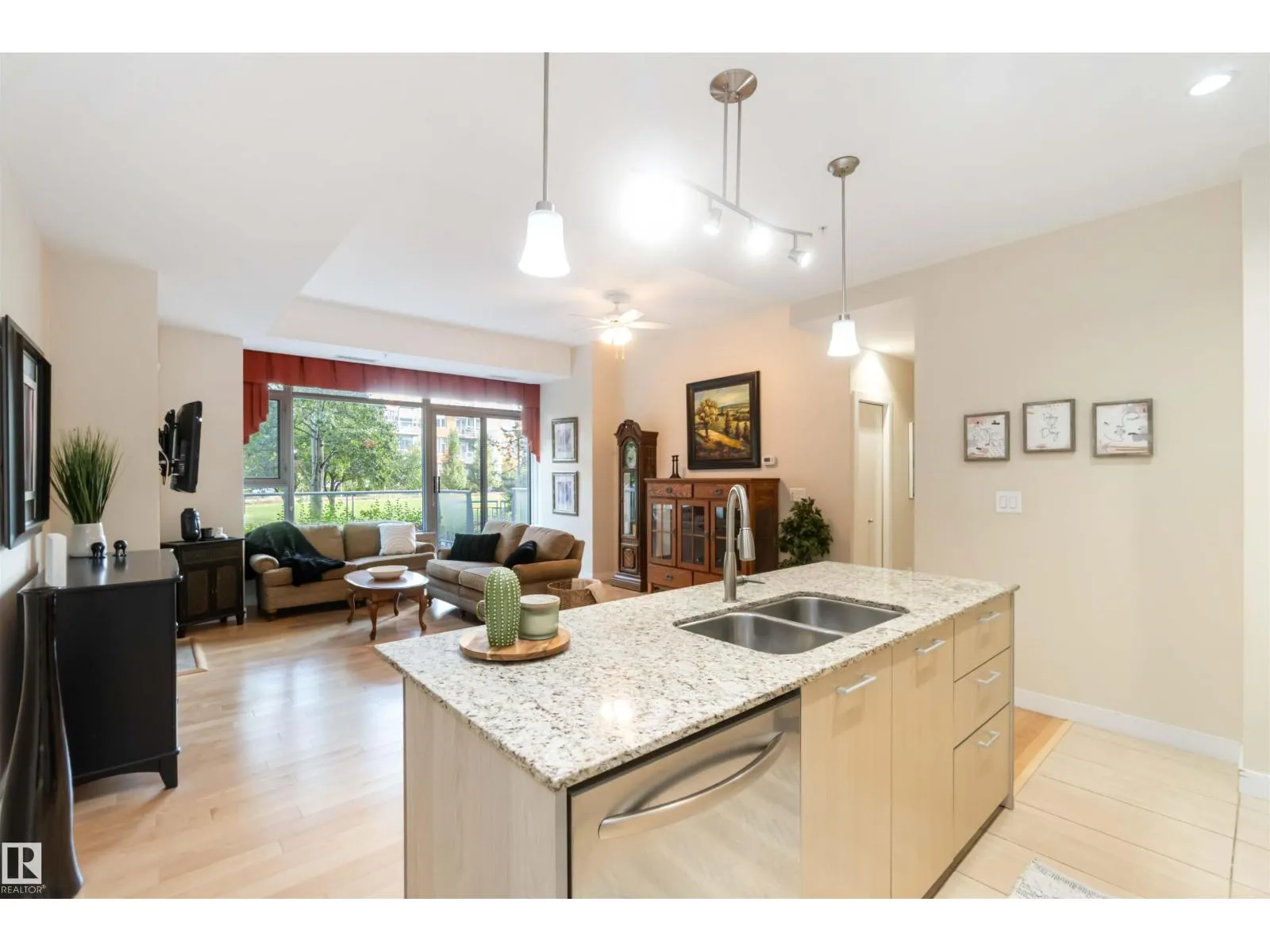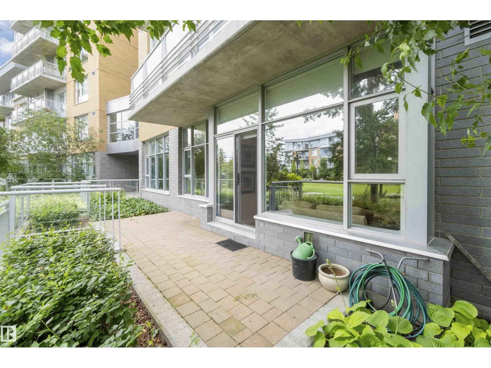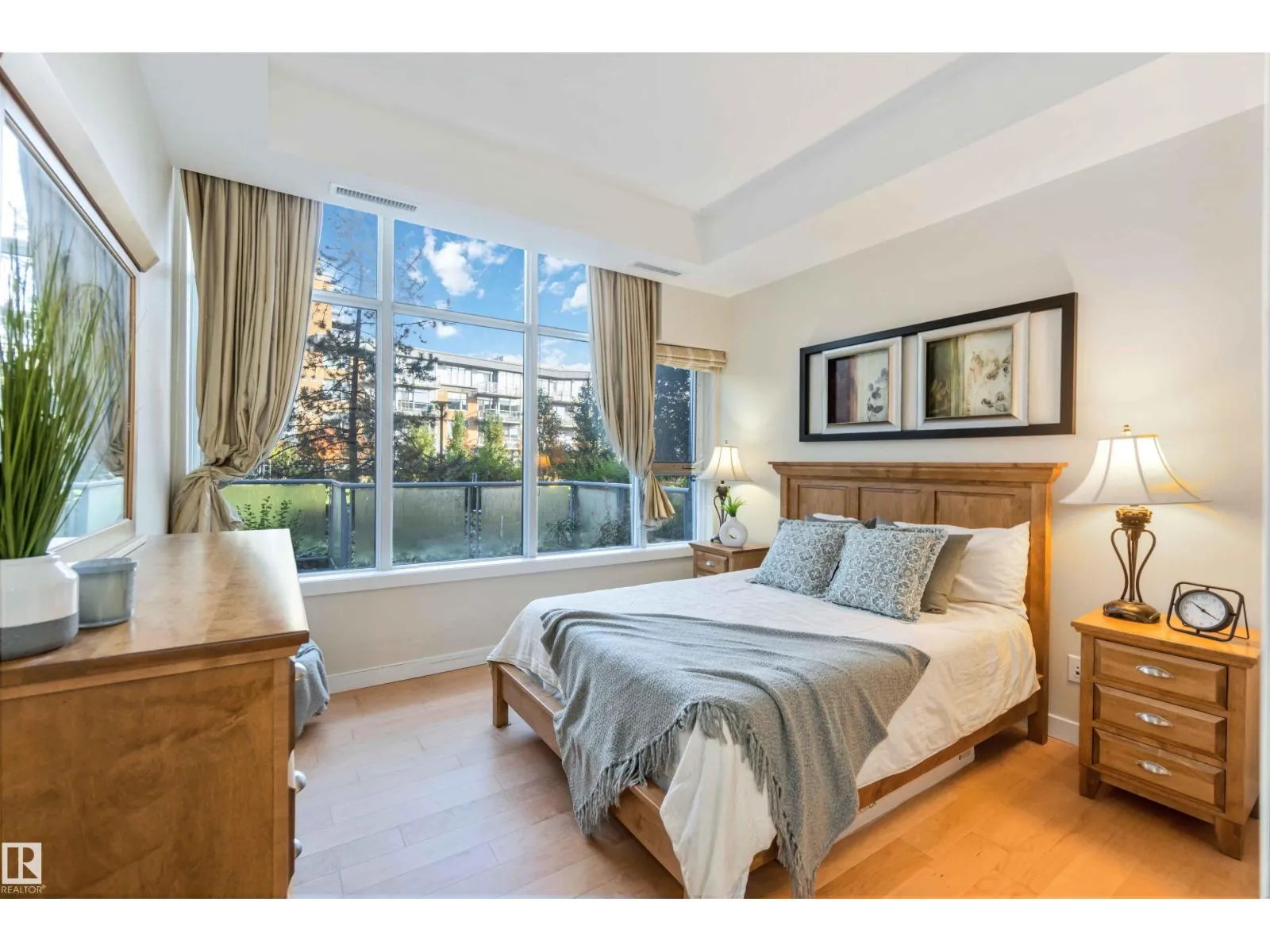 A Stylish and Refreshed 2 Bed, 2 Bath condo in sought-after Ermineskin! This beautiful ground-floor unit showcases serene courtyard views through a wall of windows and features soaring ceilings that create a bright, mini mansion feel. With the ease of taking your pet outside for a walk just by leaving your patio doors. Enjoy elegant hardwood floors, granite countertops, and tile in the kitchen and baths. The chef-inspired kitchen includes a gas cooktop, built-in oven and microwave, and smart pull-out cabinetry. Large Master Retreat with 5pc Ensuite and Second Bedroom with Murphy Bed. Oversized concrete patio surrounded by low-maintenance perennials for summer beauty. With in-suite laundry, titled underground parking & titled storage, this pet-friendly, well-managed complex also offers an exercise room. Condo fees include HEAT and WATER. With a move-in-ready vibeâjust steps to grocery shopping, LRT station, and green space! (id:27476)