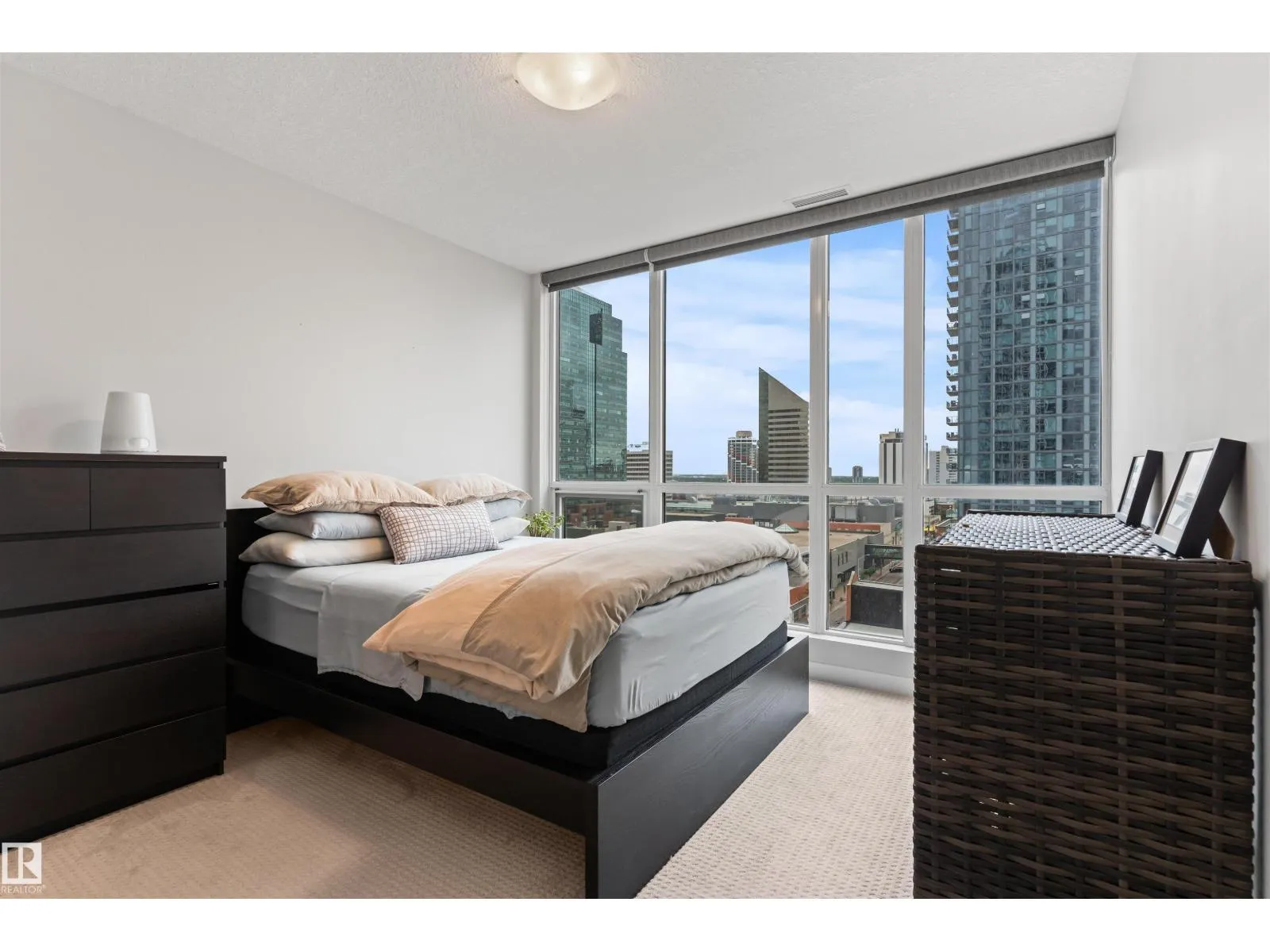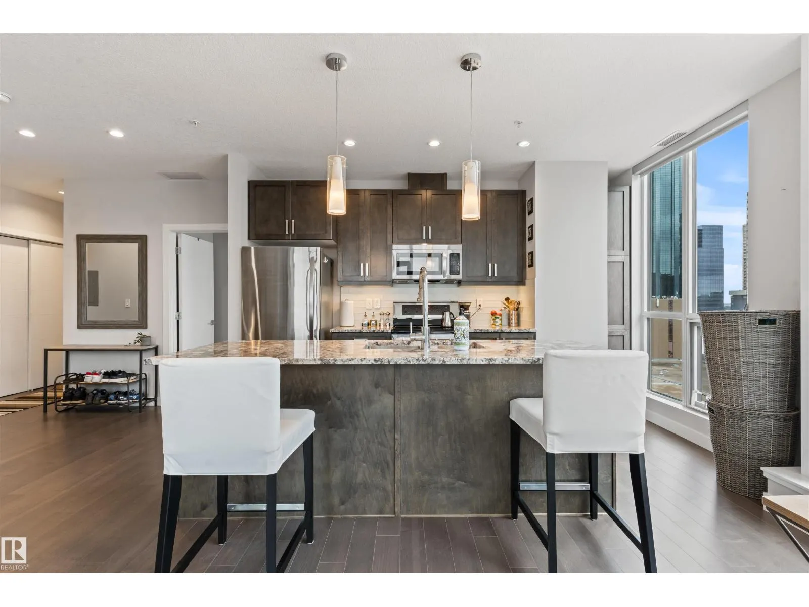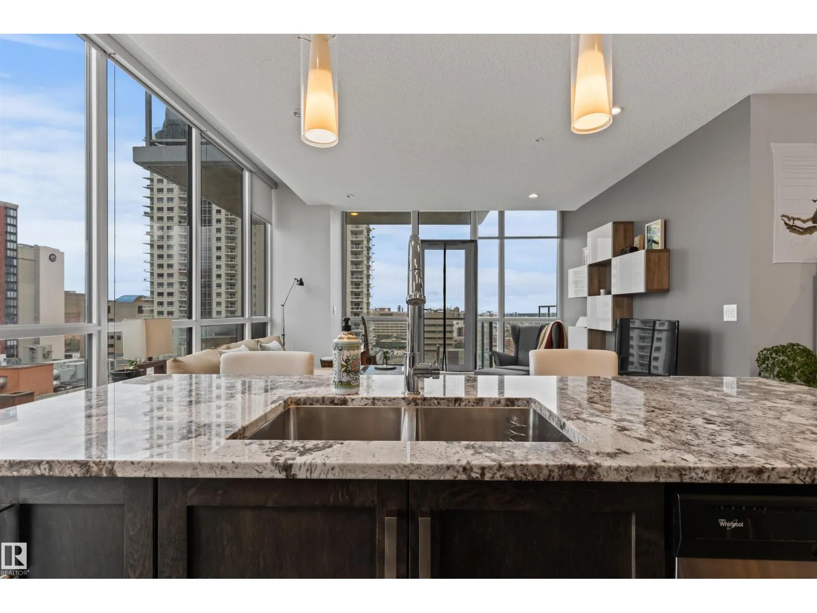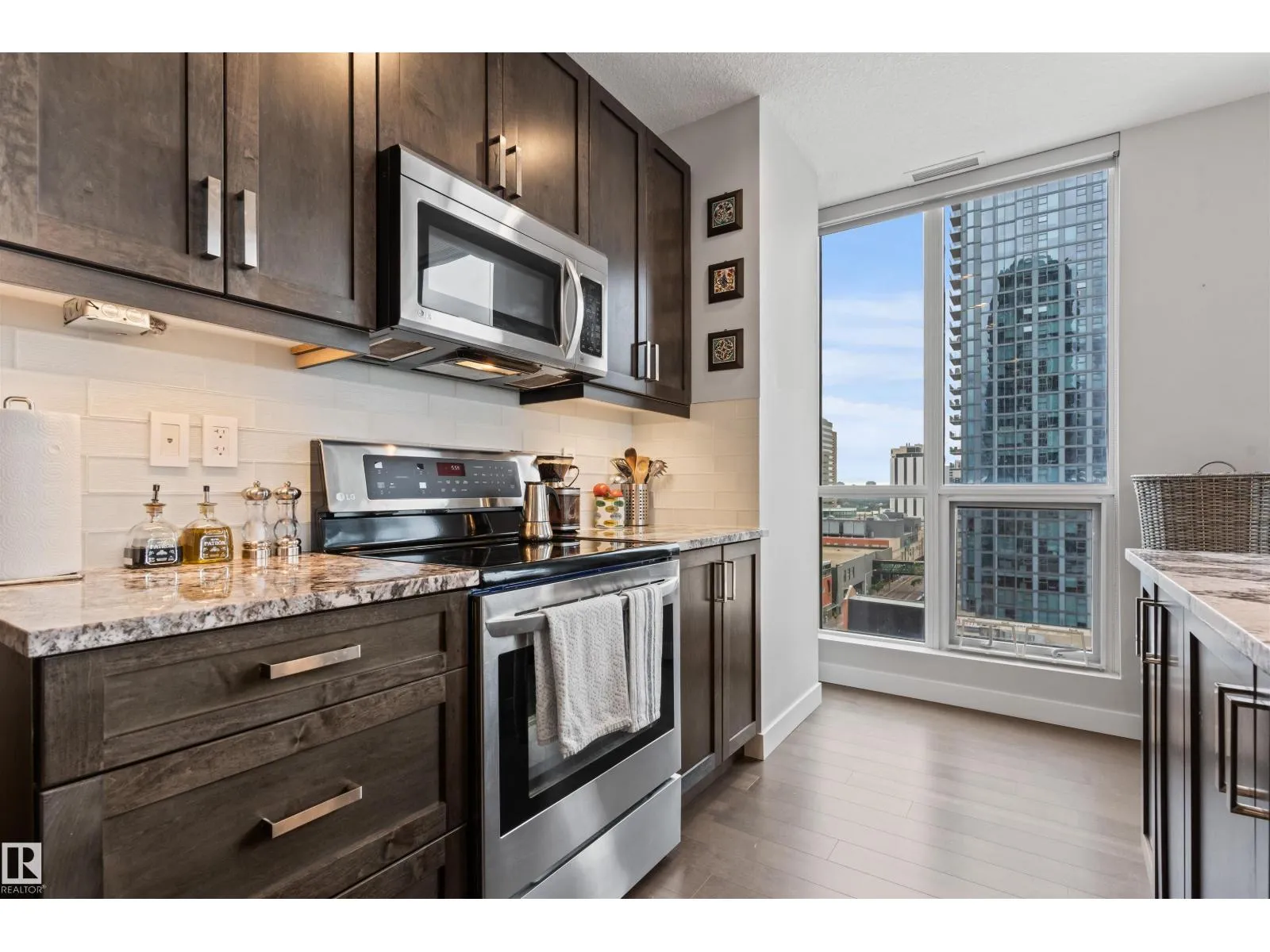 Pristine corner unit with a stunning bright view apartment, boasting large, sunlit windows. This 2 bedroom, 2.5 bathroom gem features southwest exposure, abundant natural light, and floor-to-ceiling windows. The modern finishes and spacious layout just shy of 1000 sq. ft. offer comfort and style. Enjoy a large balcony, underground heated parking with a storage cage, all in an unbeatable downtown location. The two primary bedrooms each have ensuite bathrooms, plus there's an extra half bath, perfect for entertainingâan uncommon feature at this price! The expansive kitchen includes mocha brown cabinets, stainless steel appliances, granite countertops, and a large island with seating. In-suite laundry, luxurious wood flooring in main areas, upgraded tile in the 2.5 baths, and plush carpeting in the bedrooms enhance the living experience. Ultima Tower provides excellent amenities like a gym, showers, hot tub, BBQs, a party lounge, three elevators, and 24/7 security/concierge. (id:27476)