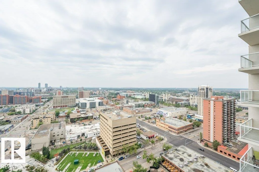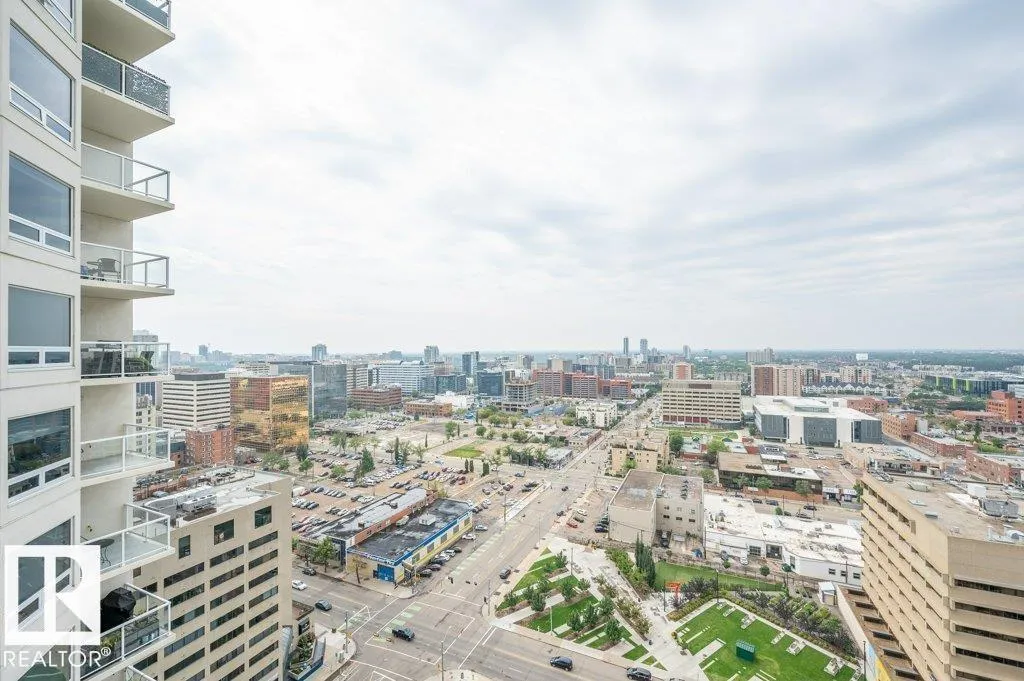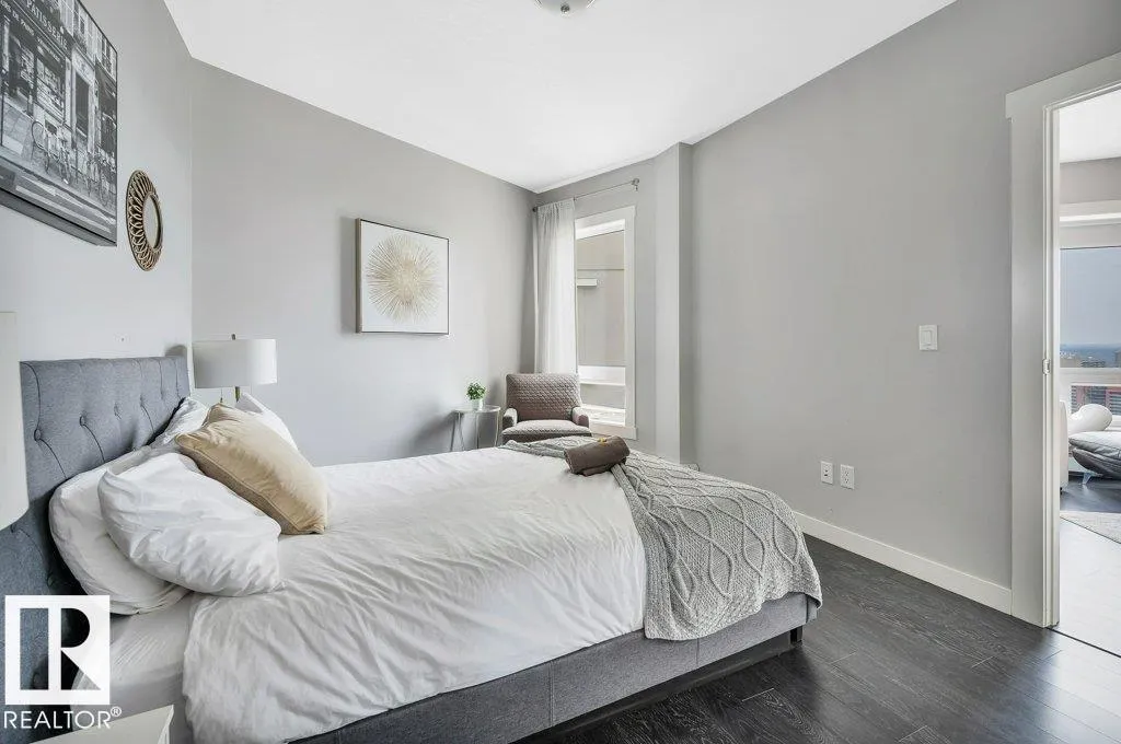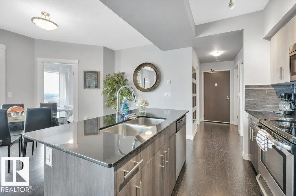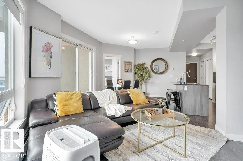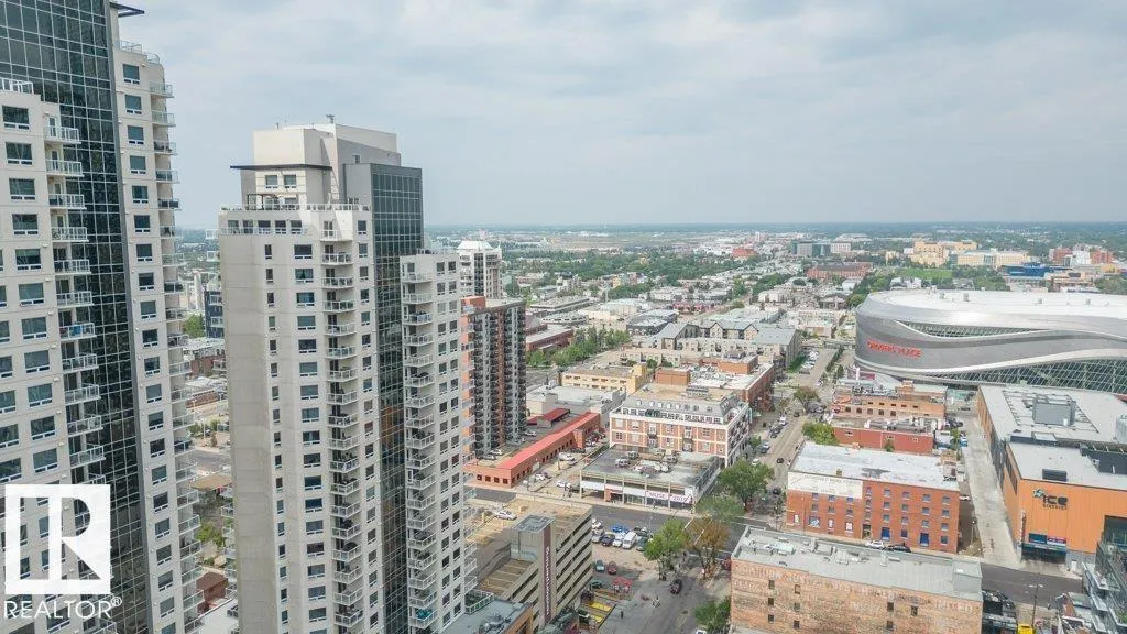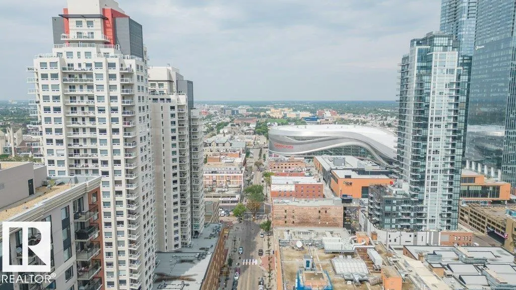 Spacious 2-bedroom, 2 bathroom condo in Fox One, just one block from Rogers Place! This modern unit features an open-concept layout with a bright living room, dining area, and a stylish kitchen with a large, functional island. The foyer is flanked by a 4 -piece main bathroom and a convenient laundry room. The primary bedroom boasts a walk-in closet and a 4-piece ensuite, while the second bedroom is located just off the dining area. Enjoy plenty of natural light and breathtakng downtown views from your private 21st floor balcony. This unit also includes a heated parking stall and a heated visitor parking. With a dog park across the street and an array of restaurants and shops within walking distance. This is urban living at its finest! (id:27476)