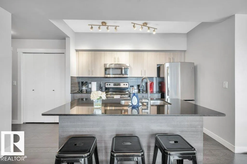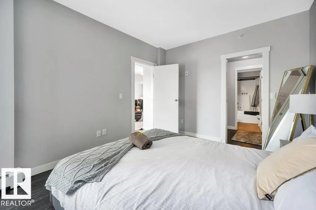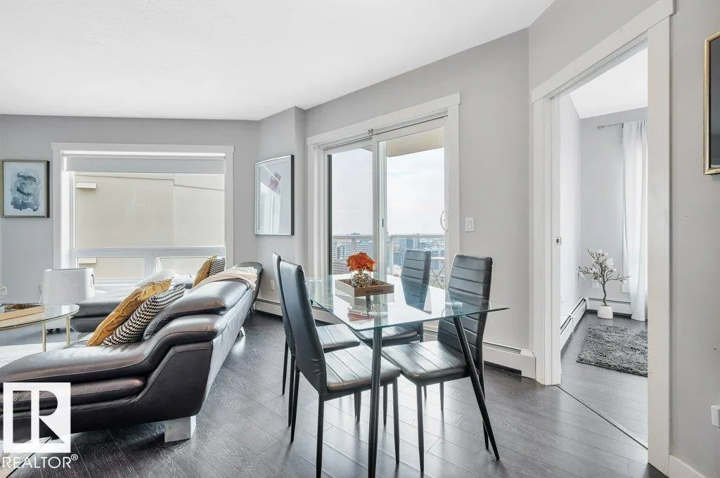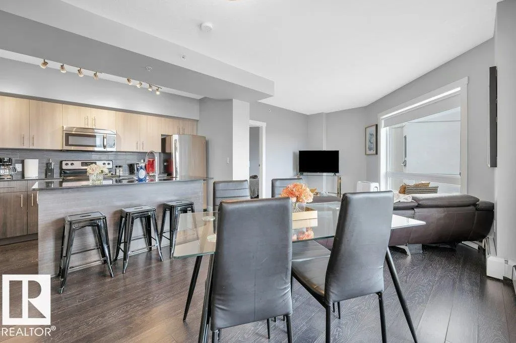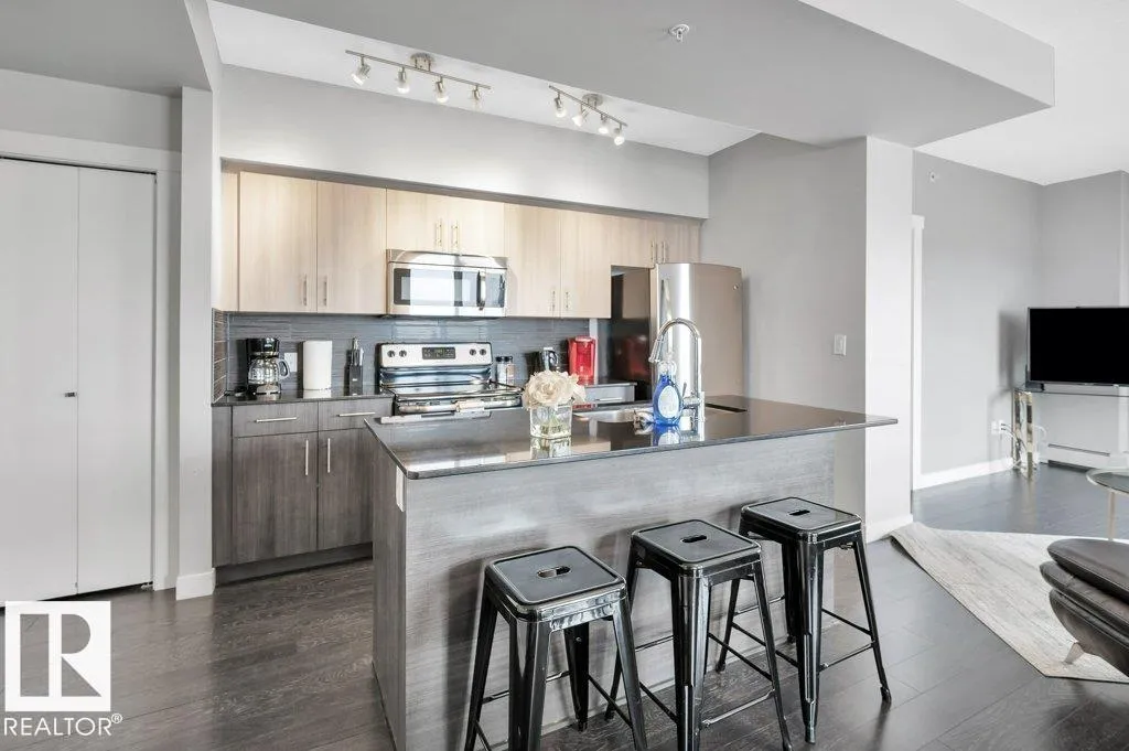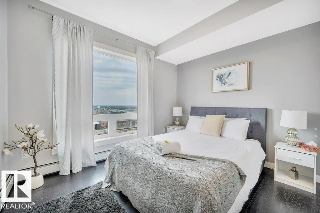 Spacious 2-bedroom, 2 bathroom condo in Fox One, just one block from Rogers Place! This modern unit features an open-concept layout with a bright living room, dining area, and a stylish kitchen with a large, functional island. The foyer is flanked by a 4 -piece main bathroom and a convenient laundry room. The primary bedroom boasts a walk-in closet and a 4-piece ensuite, while the second bedroom is located just off the dining area. Enjoy plenty of natural light and breathtakng downtown views from your private 21st floor balcony. This unit also includes a heated parking stall and a heated visitor parking. With a dog park across the street and an array of restaurants and shops within walking distance. This is urban living at its finest! (id:27476)