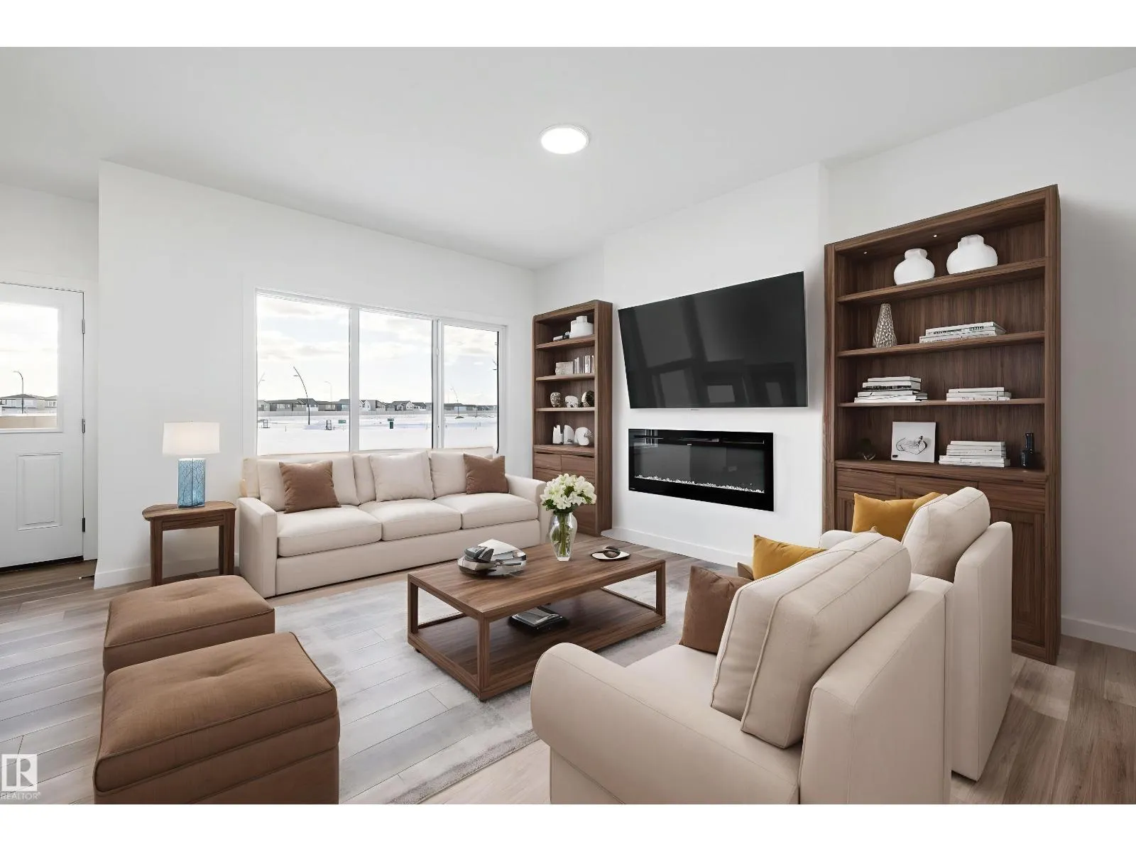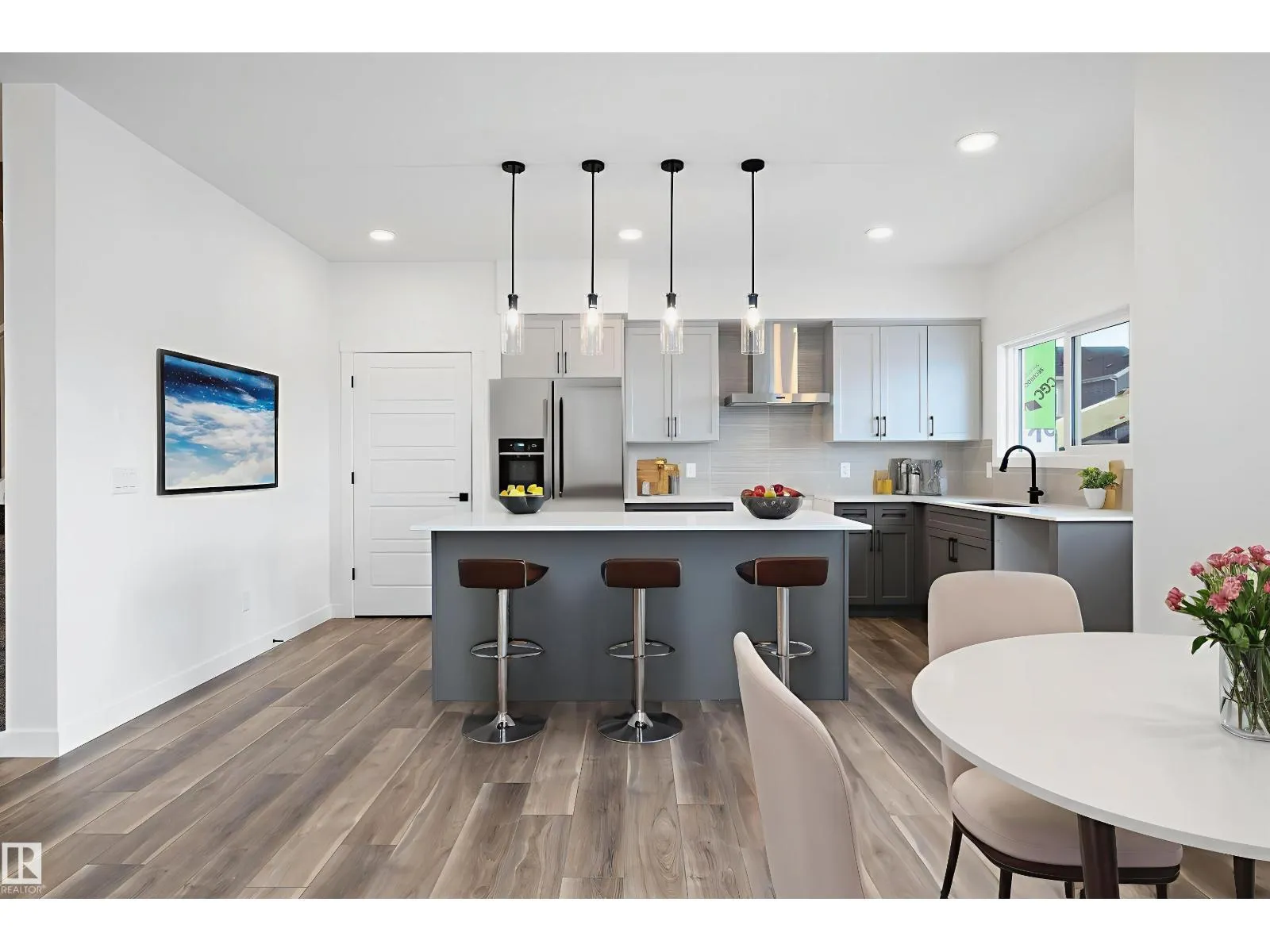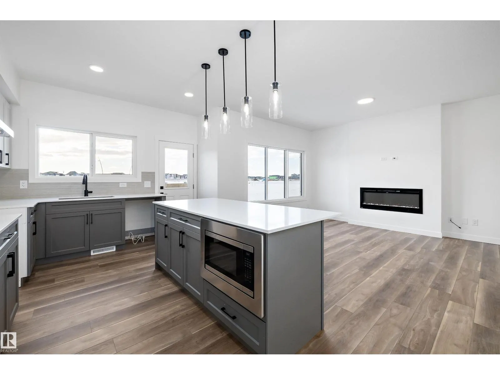 Experience refined contemporary living in the Apex, a masterfully crafted four-bedroom residence designed for longevity and style. This Sterling Signature home features soaring 9' ceilings on both the main and basement levels, a double attached garage with floor drain, and a separate side entrance. The versatile main floor showcases luxury vinyl plank flooring and a rare secondary bedroom adjacent to a full three-piece bathroom with a walk-in shower. At the heart of the home, the gourmet kitchen boasts quartz countertops, a flush-ledge island, Winston-profile soft-close cabinetry, and a chimney-style hood fan. Natural light fills the open-concept great room, highlighted by a modern fireplace and large windows. Upstairs, the primary retreat features a five-piece ensuite with dual sinks, a soaking tub, and a glass-enclosed shower leading to a massive walk-in closet. A central bonus room, upstairs laundry, and brushed nickel accents complete this exceptional move-in ready package. (id:27476)