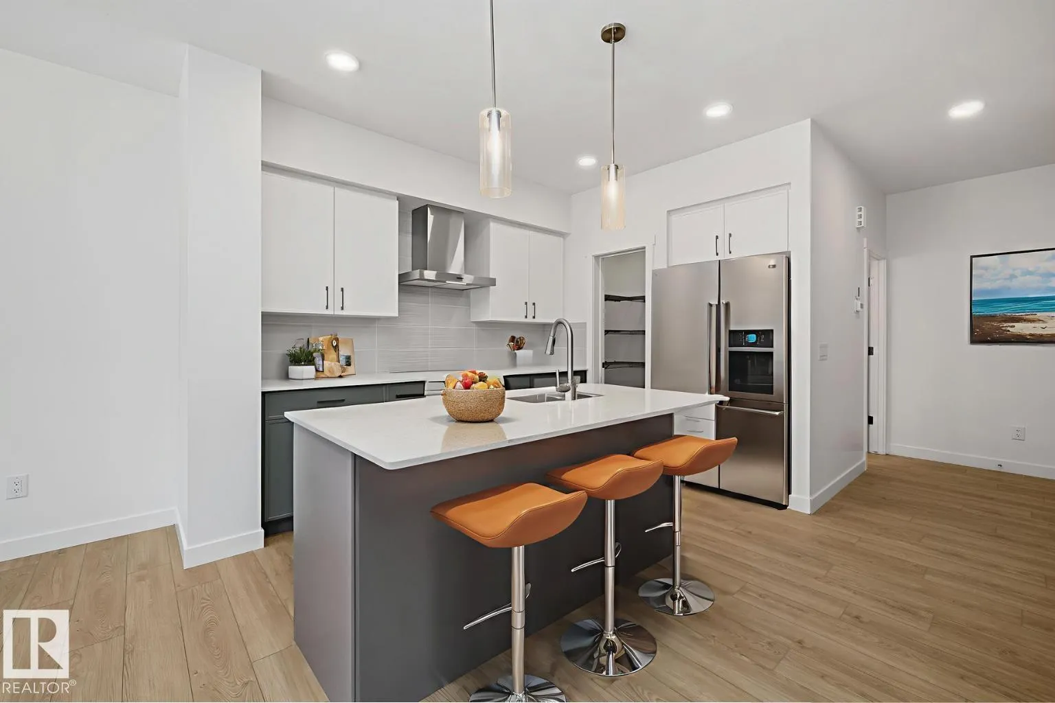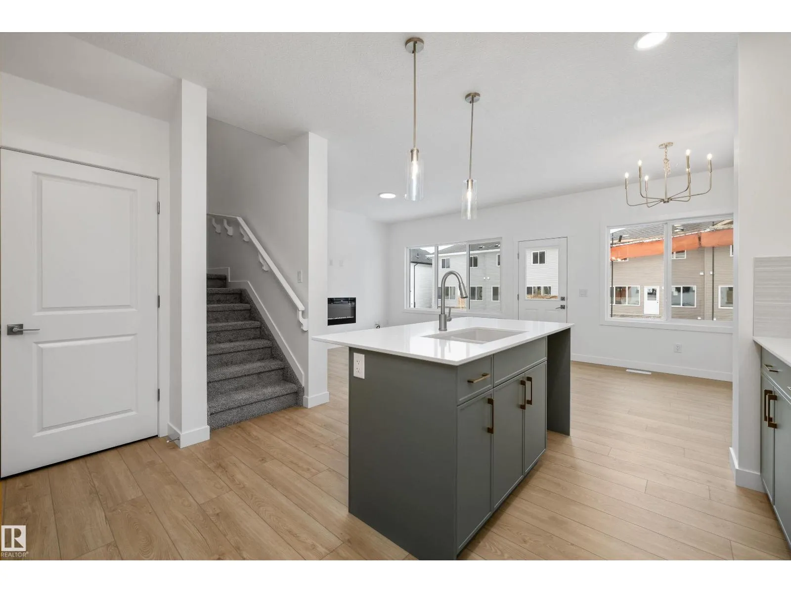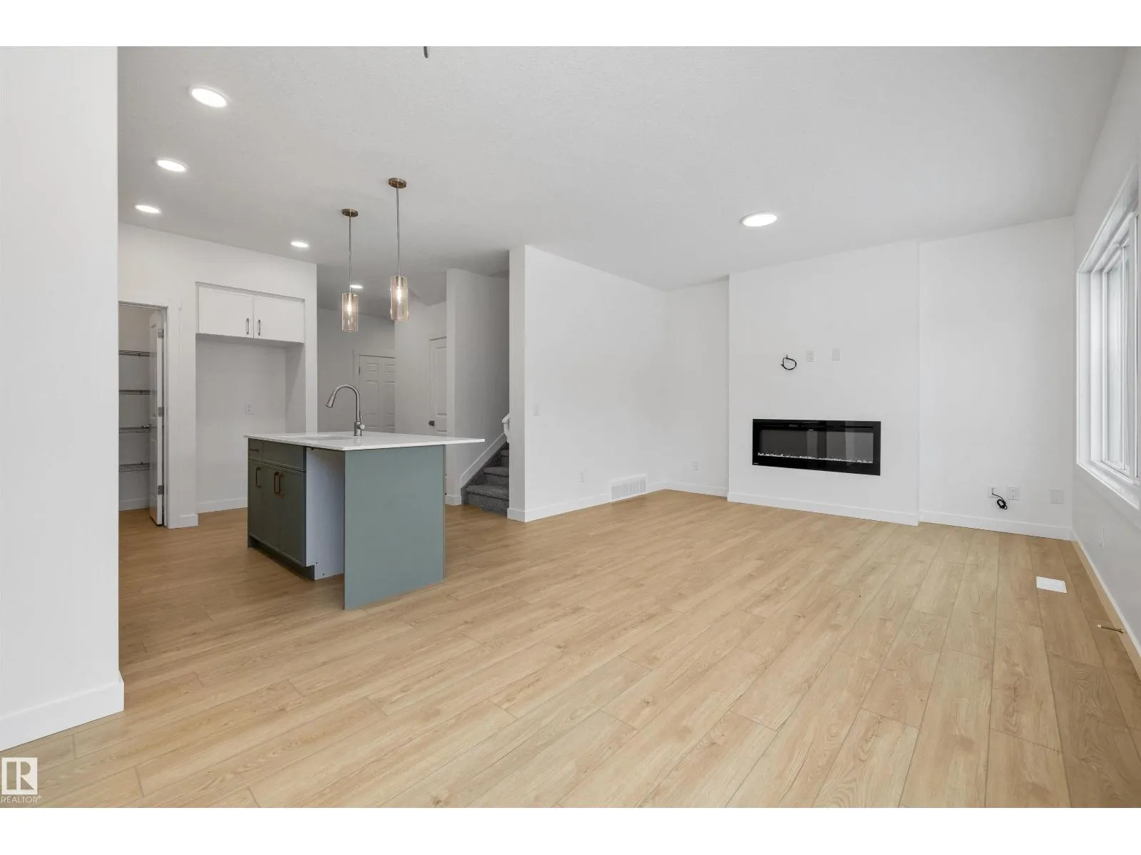 Modern luxury meets everyday functionality in The Renew, a beautifully finished half-duplex featuring impressive 9-foot ceilings on both the main floor and basement. The open-concept main level is styled with durable luxury vinyl plank flooring and a welcoming foyer. At the heart of the home, the designer kitchen showcases quartz countertops, upgraded soft-close Thermofoil cabinetry, and a chimney-style hood fan with a full-height backsplash. The central island with a Silgranit undermount sink and pendant lighting overlooks a bright great room, complete with an electric fireplace and access to the future deck. Upstairs, you will find a versatile bonus room, laundry area, and three bedrooms, including a primary suite with a walk-in closet and private ensuite. Notable extras include a double attached garage with a floor drain, a separate side entrance, brushed nickel fixtures, and basement rough-ins for two future bedrooms. This home is designed for comfort and growth. (id:27476)