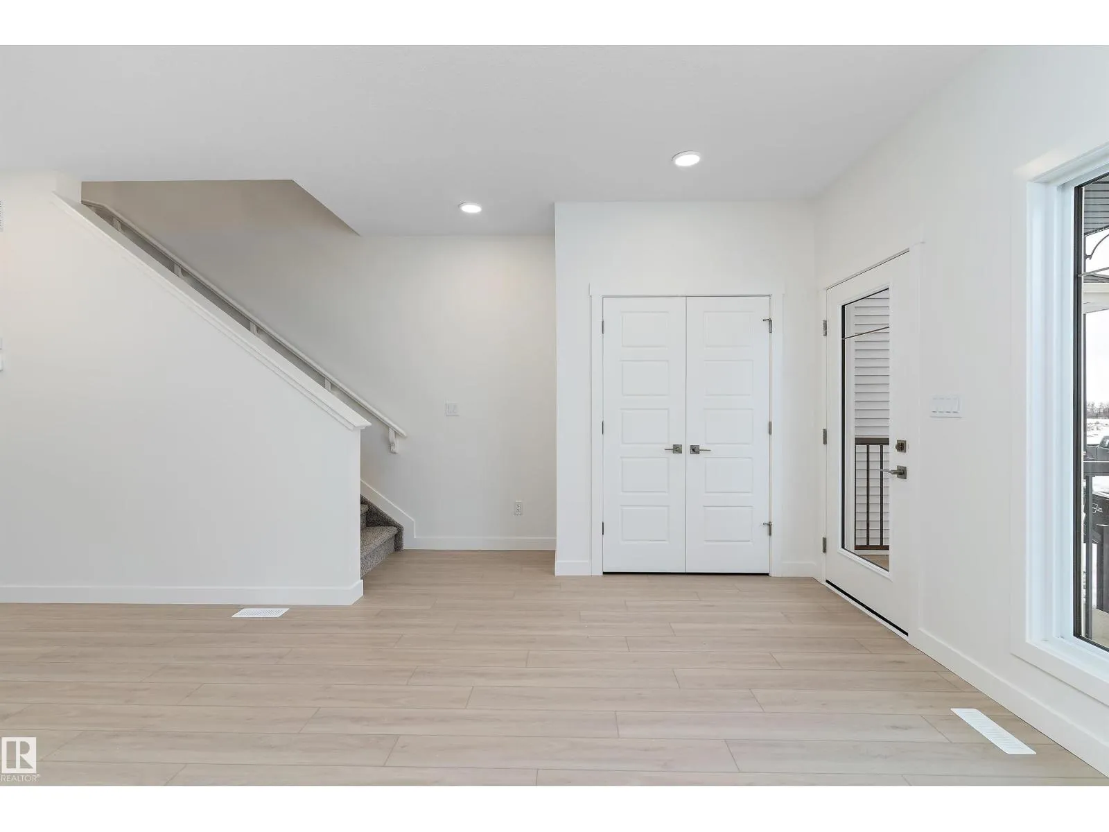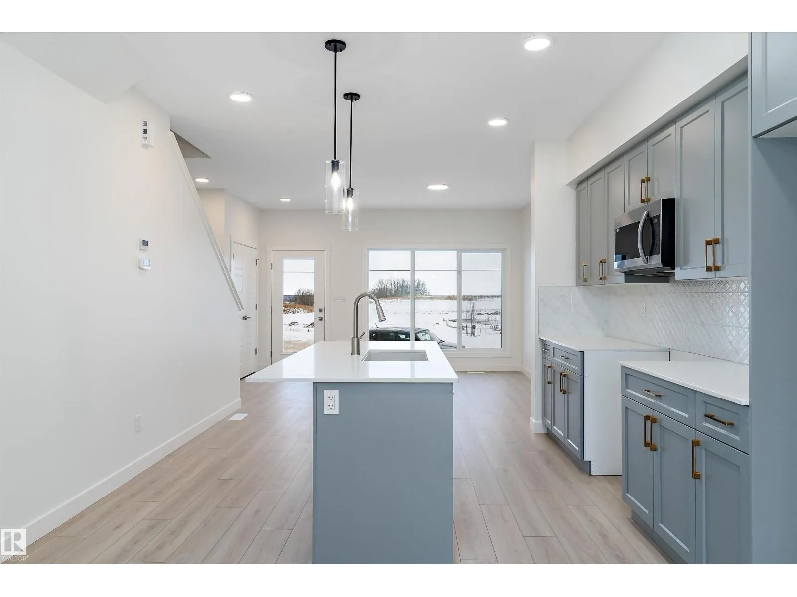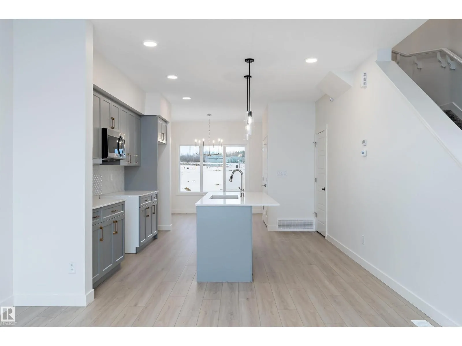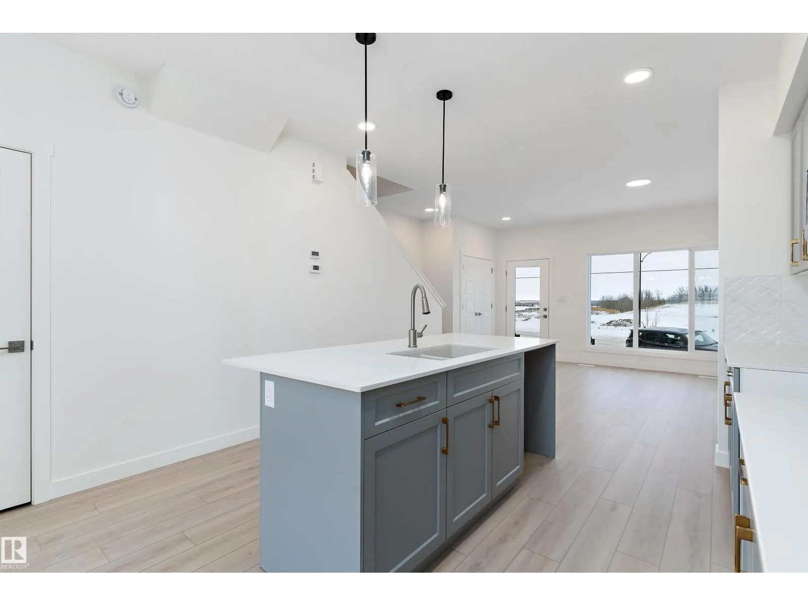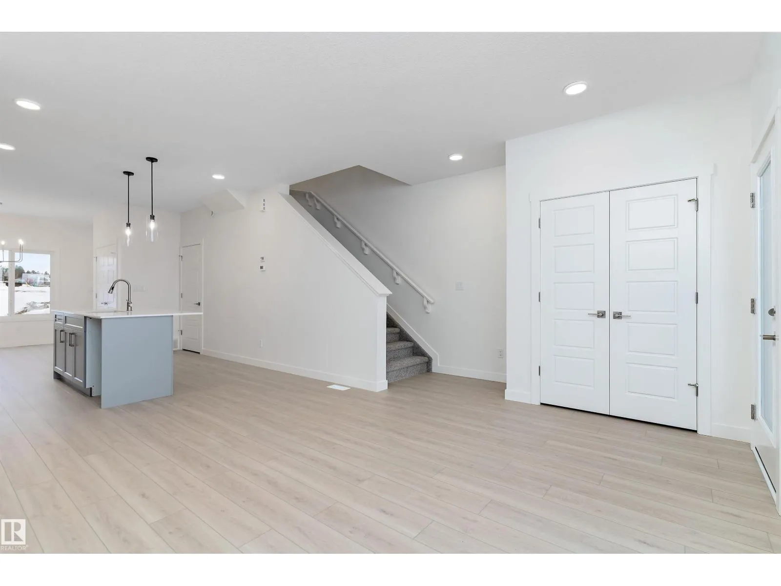 The Stellar offers modern comfort and efficient design with luxury vinyl plank flooring and 9â ceilings on the main floor. A bright foyer with coat closet leads into a sun-filled great room with a large front window. The central kitchen features quartz countertops throughout, an island with eating ledge, undermount composite sink, upgraded Thermofoil cabinetry, and a spacious pantry. The rear dining area overlooks the backyard and sits alongside a convenient powder room and back entry to a parking pad, with the option to add a detached double garage. Upstairs includes an open loft, a primary bedroom with walk-in closet and 3-piece ensuite, two additional bedrooms, a main 3-piece bath, and a stackable laundry closet. Added features include brushed nickel fixtures, 9â ceilings on the main and basement levels, a separate side entrance, and basement rough-in plumbing. (id:27476)