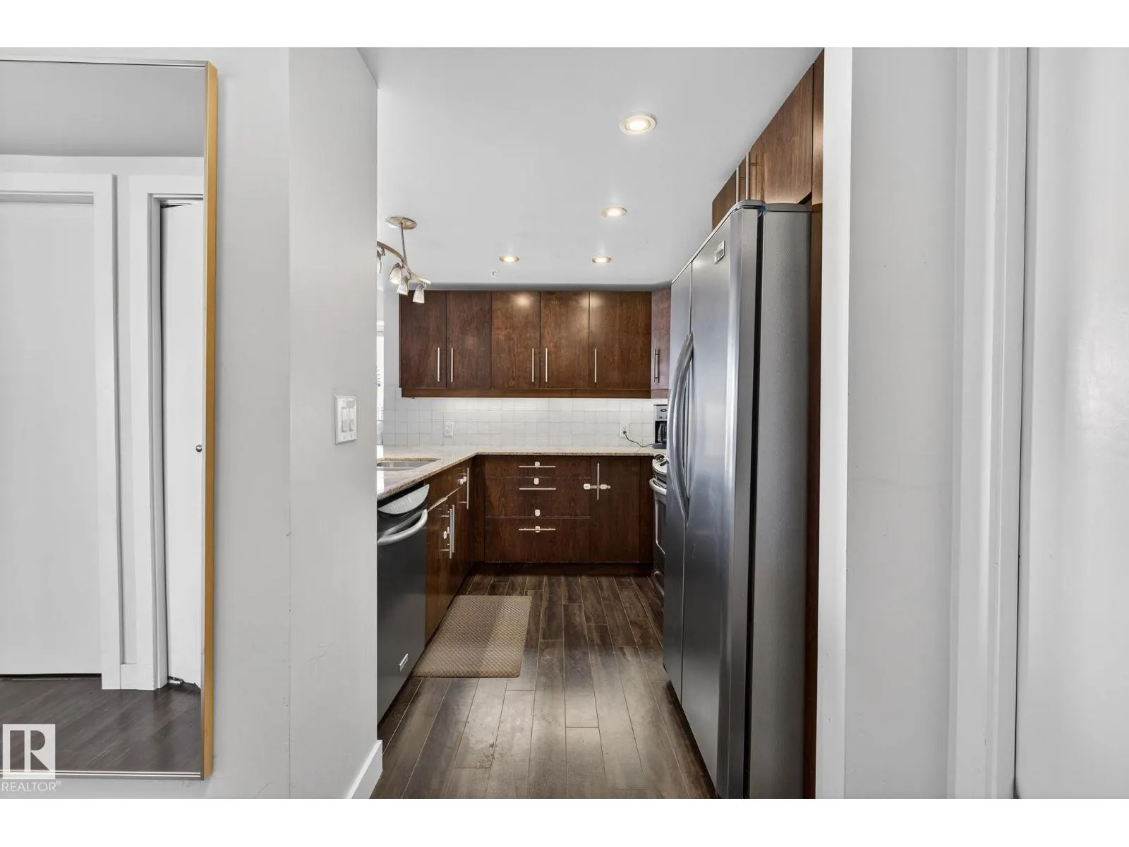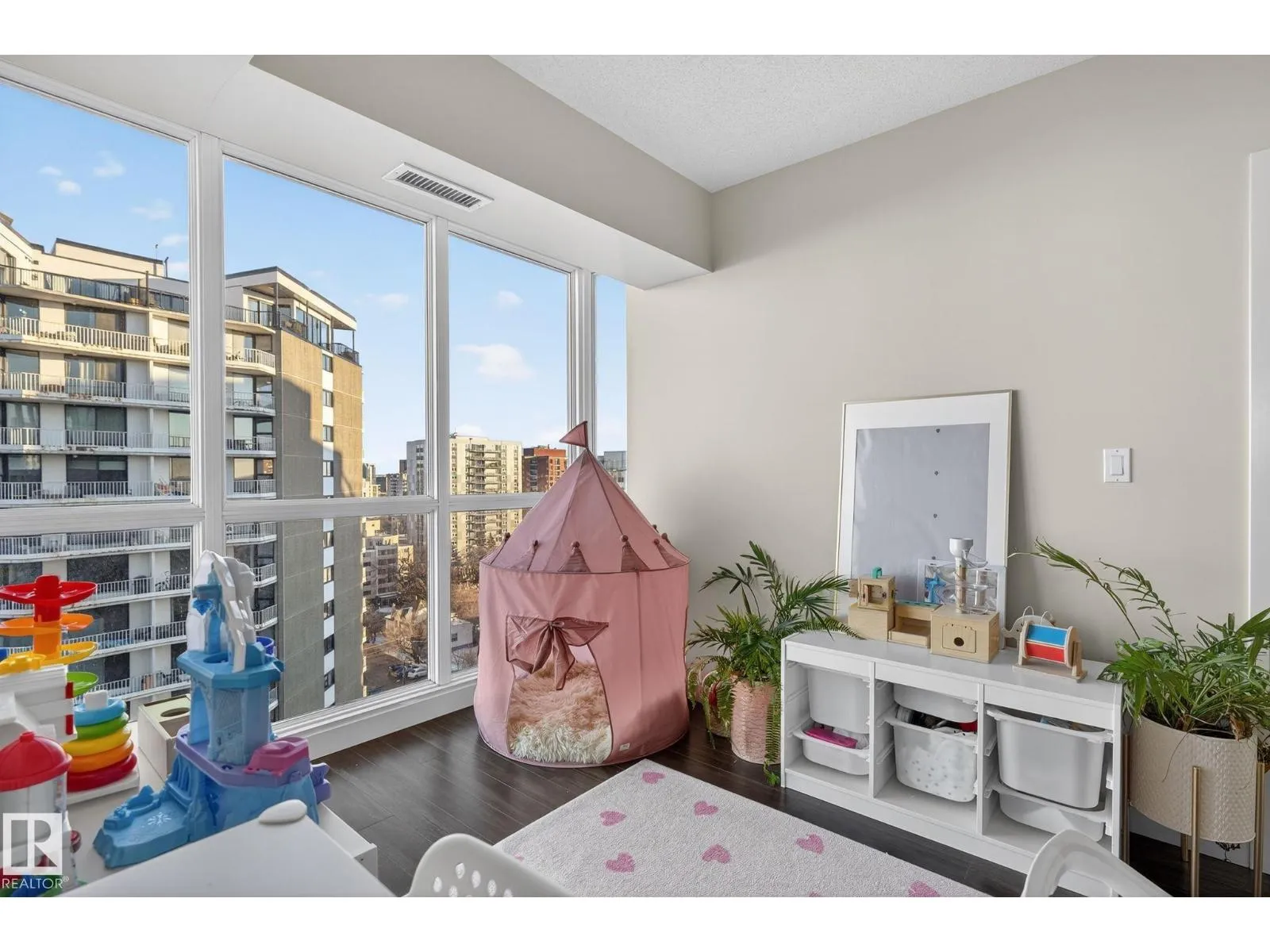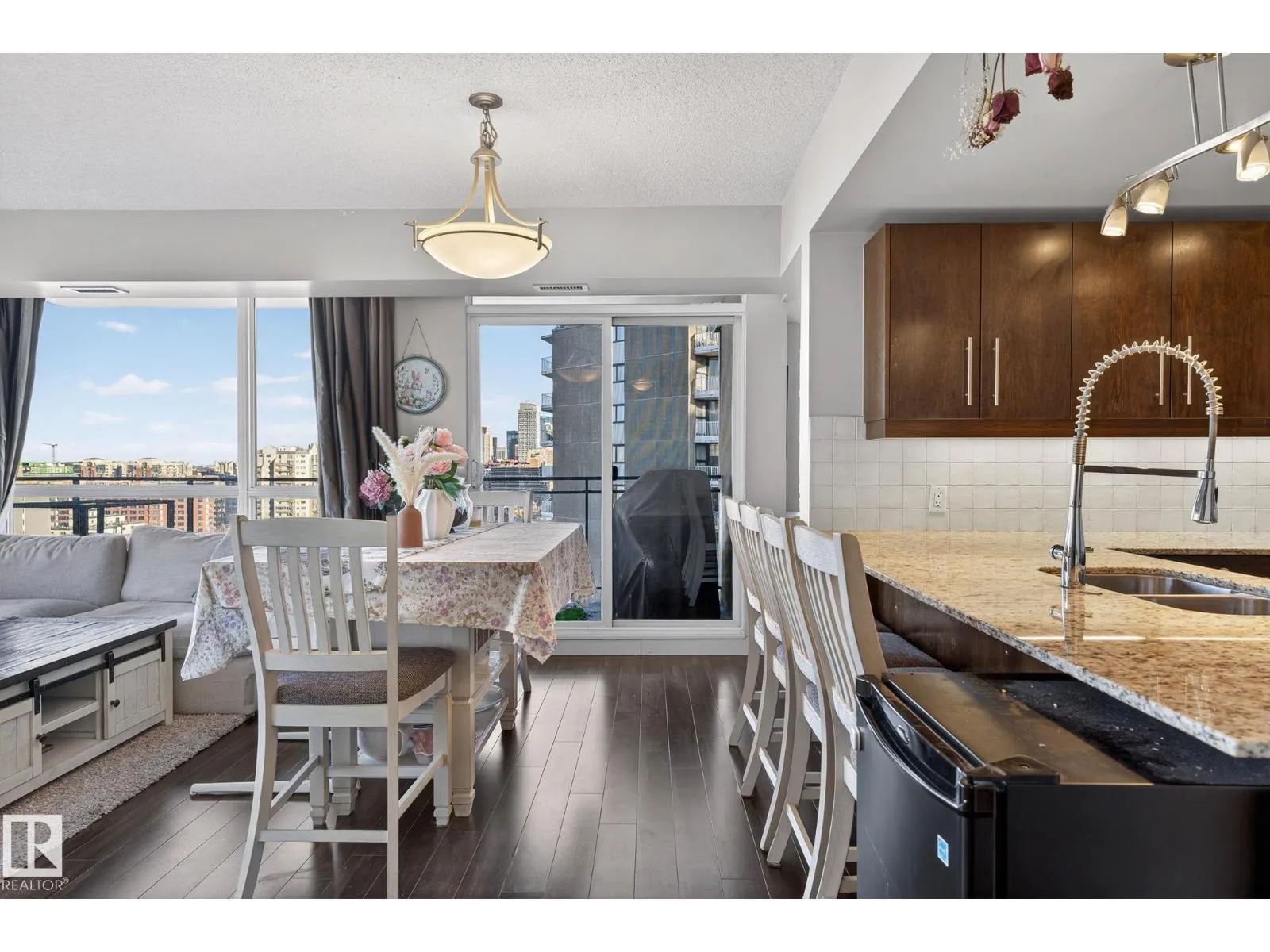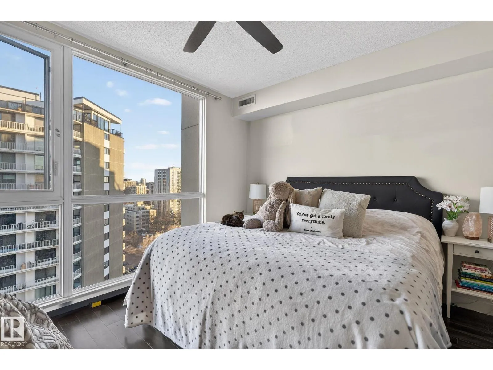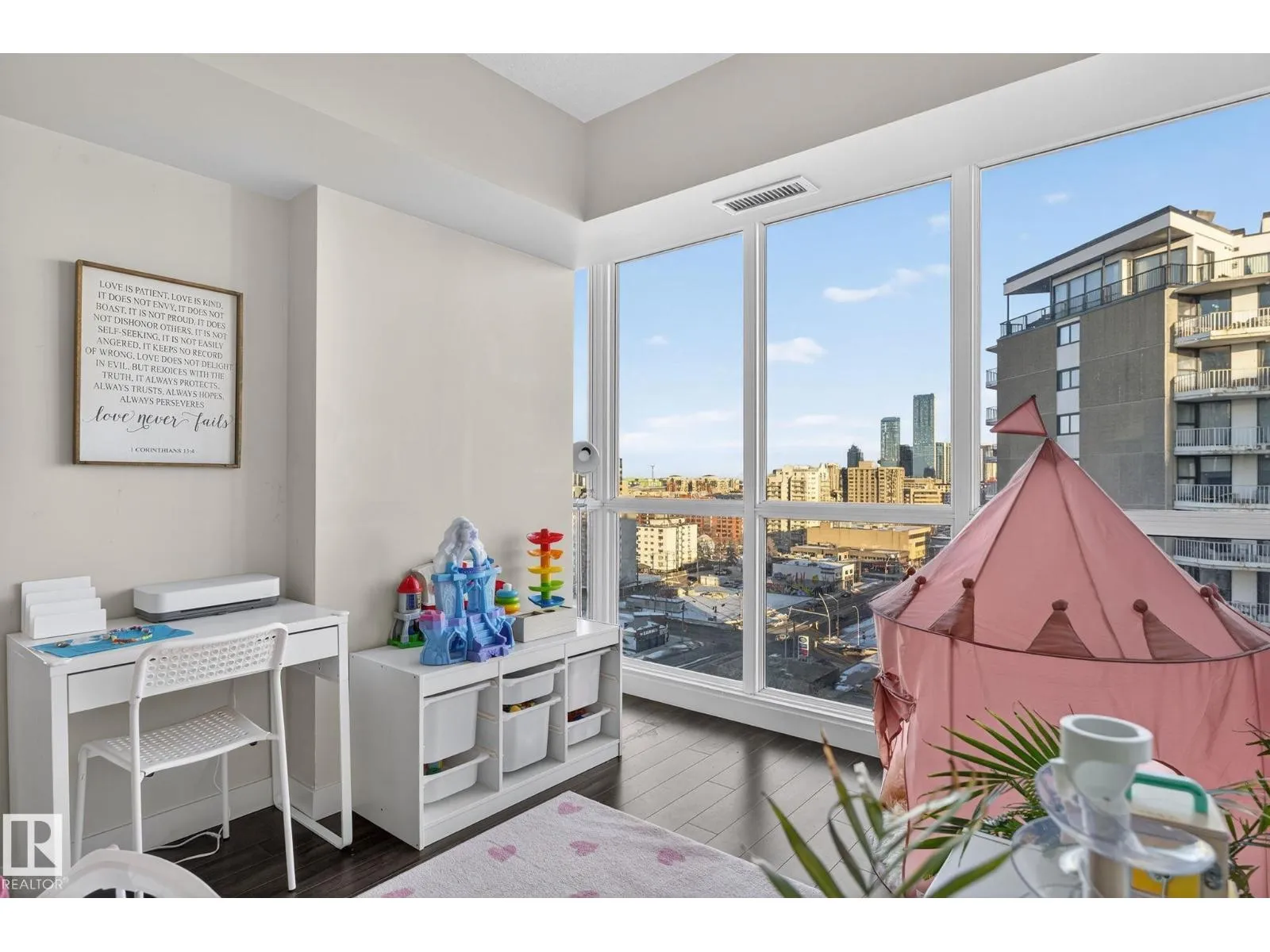 Enhance your downtown lifestyle in Uptown Estates, where breathtaking city and river valley views begin right outside your front door. This executive 14th-floor corner unit offers an exceptional blend of style, comfort, and location in the heart of it all. Spanning 1,042 sq ft, this thoughtfully designed condo features 2 spacious bedrooms, 2 full baths, & a versatile den. Floor-to-ceiling windows flood the space w/ natural light & showcase north to east exposures, framing stunning urban & river valley sight lines. The modern kitchen is both sleek & functional, highlighted by hardwood flooring, granite countertops, & S/S appliances, seamlessly flowing into the open-concept living area. Residents of Uptown Estates enjoy premium amenities including a main-floor fitness centre, upscale lobby area & titled underground parking. Step outside & youâre just moments from downtownâs best restaurants, cafes & entertainment, offering the ultimate urban living experience downtown Edmonton! (id:27476)