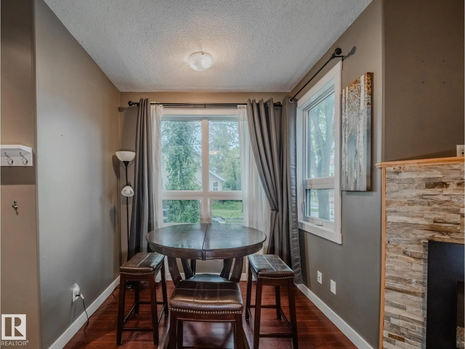 IMMEDIATE POSSESSION. Incredible townhouse with THREE TITLED PARKING STALLS, a titled 13x13 workshop plus two balconies, nestled on a tree lined street, in the heart of Garneau. Less than a 5 minute walk to the U 0f A. This corner unit allows in tons of natural light from the numerous windows & 9' ceilings. The kitchen features a huge eat up island, granite counter tops, stainless steel appliances with gas stove & pantry. The open living/dining area has a stone encased gas fireplace & hardwood flooring. On the second level is a family room with large east facing balcony & built in shelving. Finishing this level is a three piece bathroom with large luxurious tiled shower & granite counter tops. The full size washer & dryer are stacked in this bathroom. On the upper level is the primary bedroom with south facing balcony, four piece en-suite & walk-in closet. The spacious titled workshop is located in the parkade. All three stalls are together. Additional sound insulation. A/C. Condo fees cover heat & water. (id:27476)