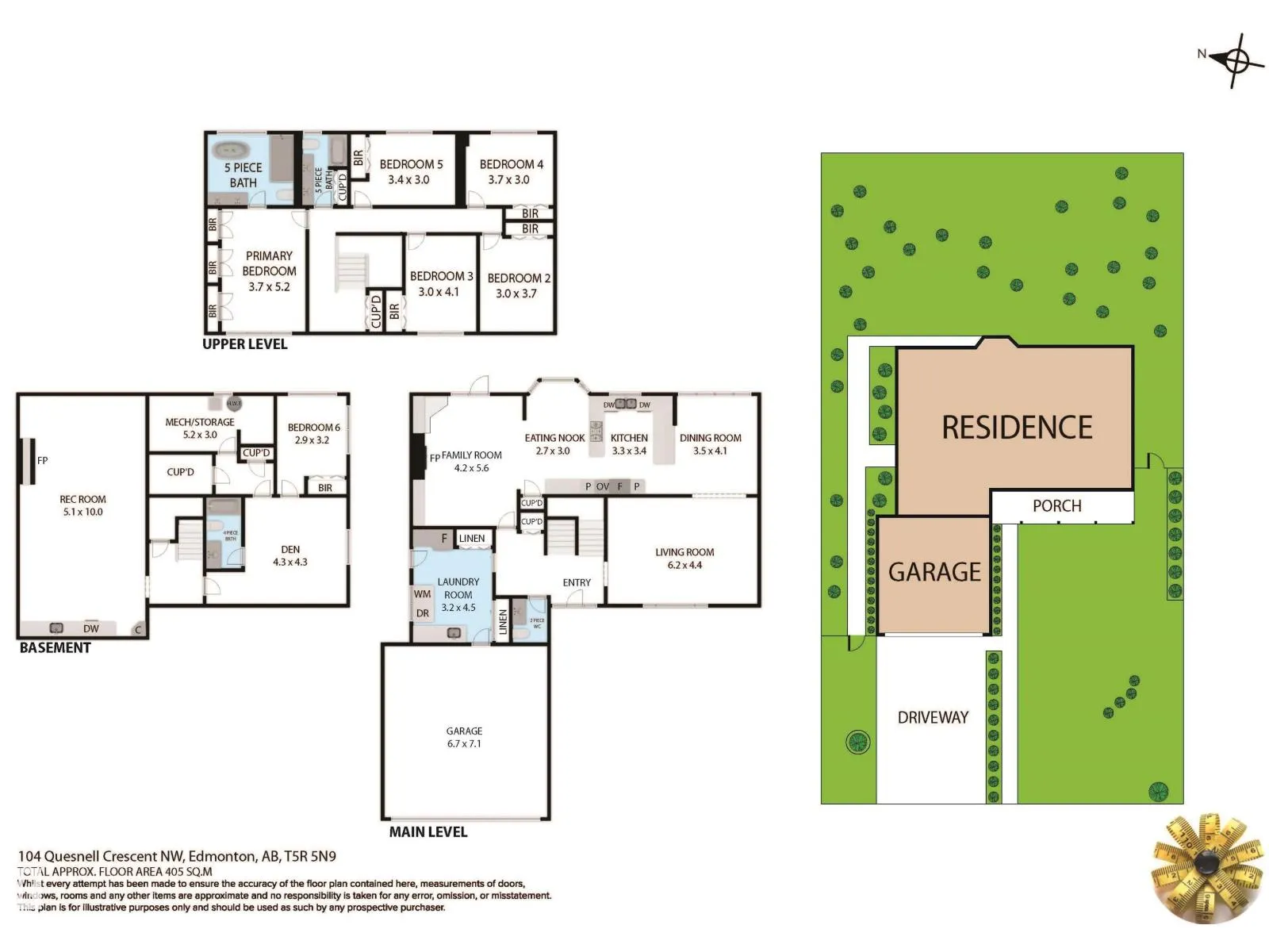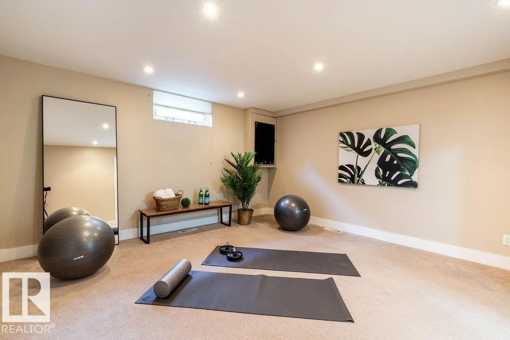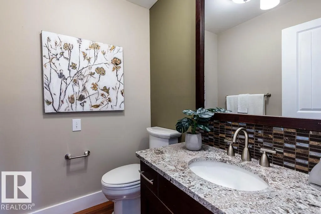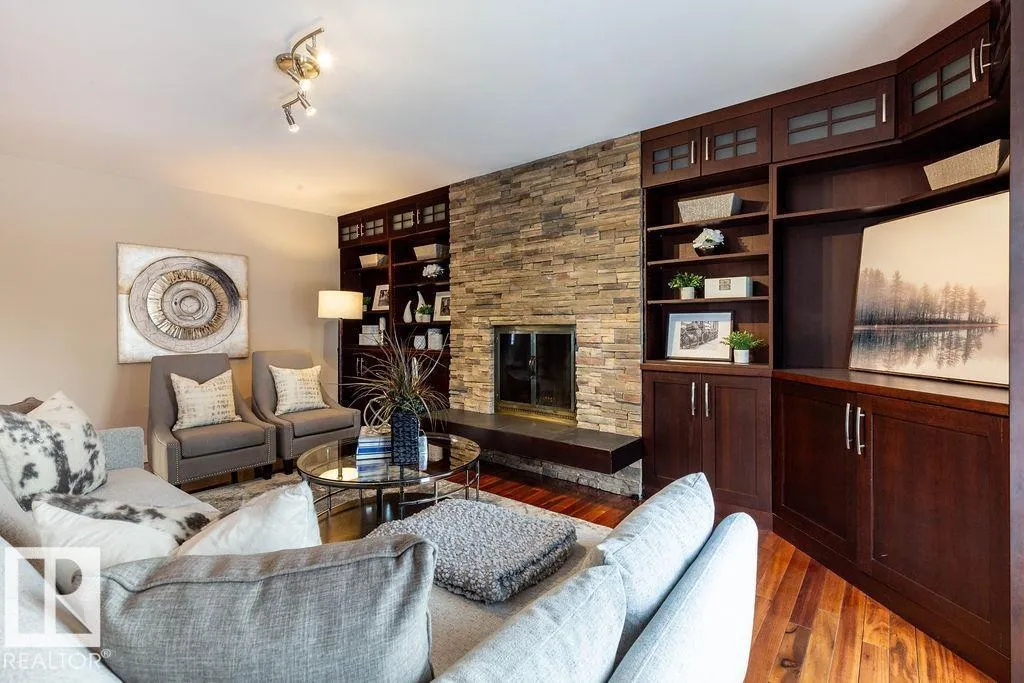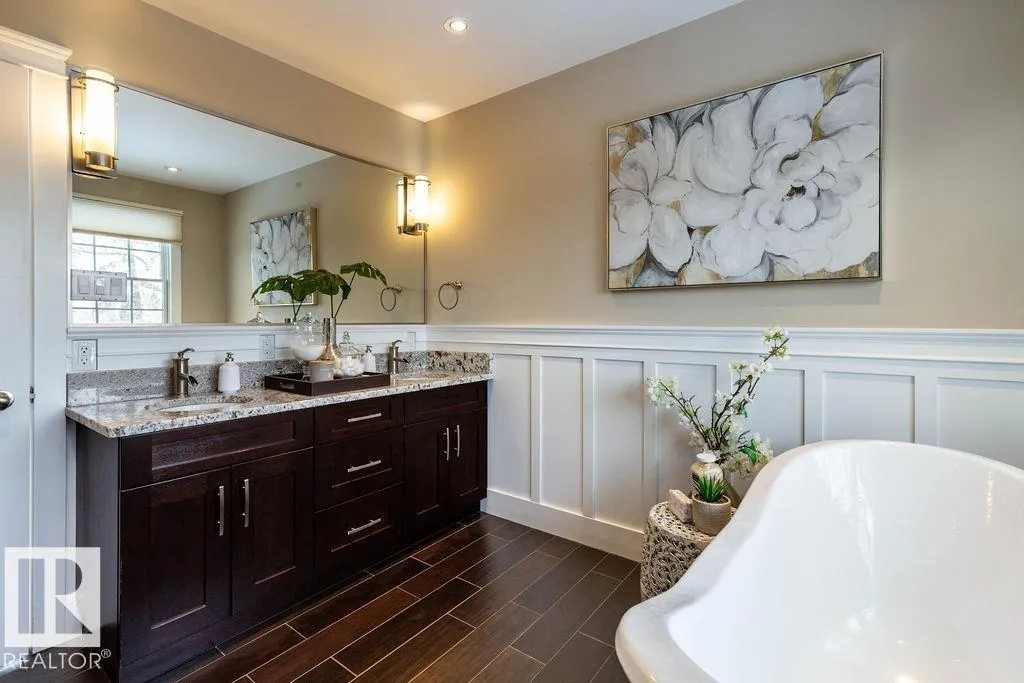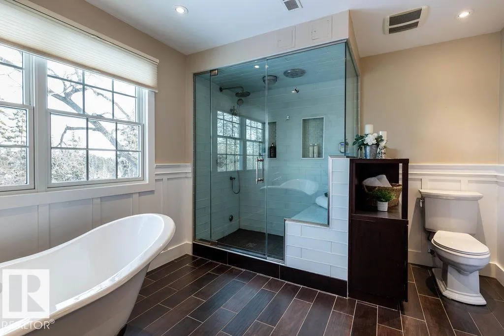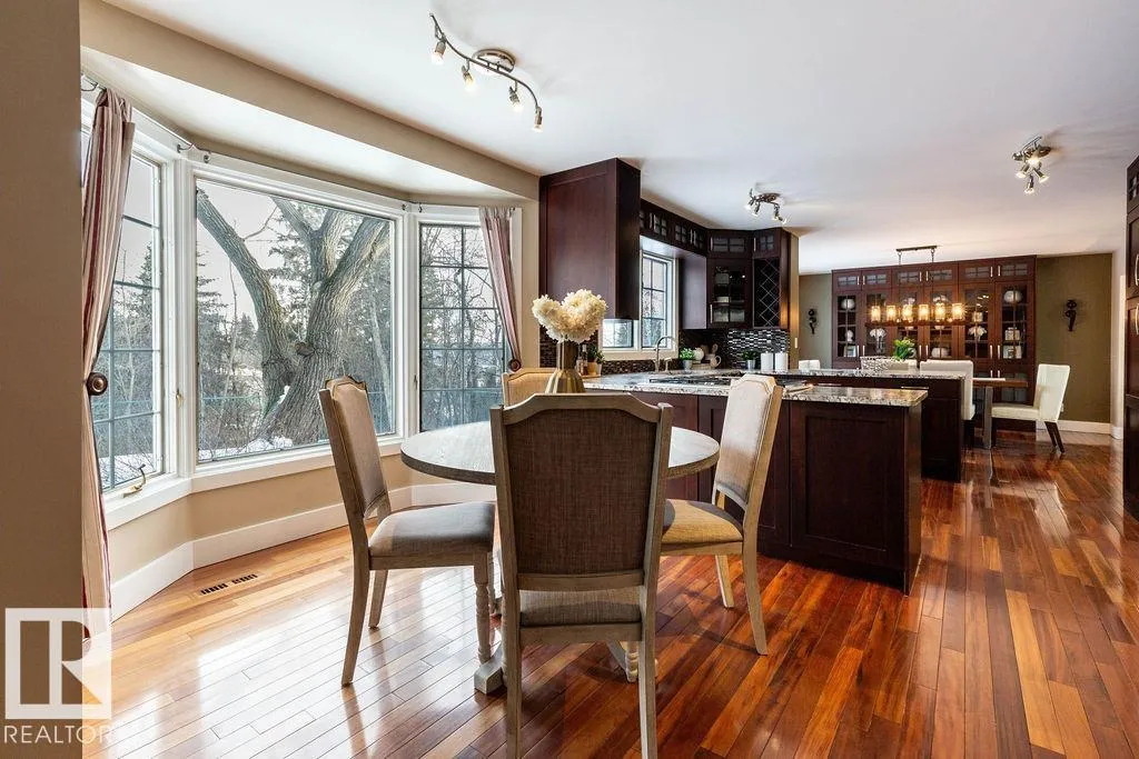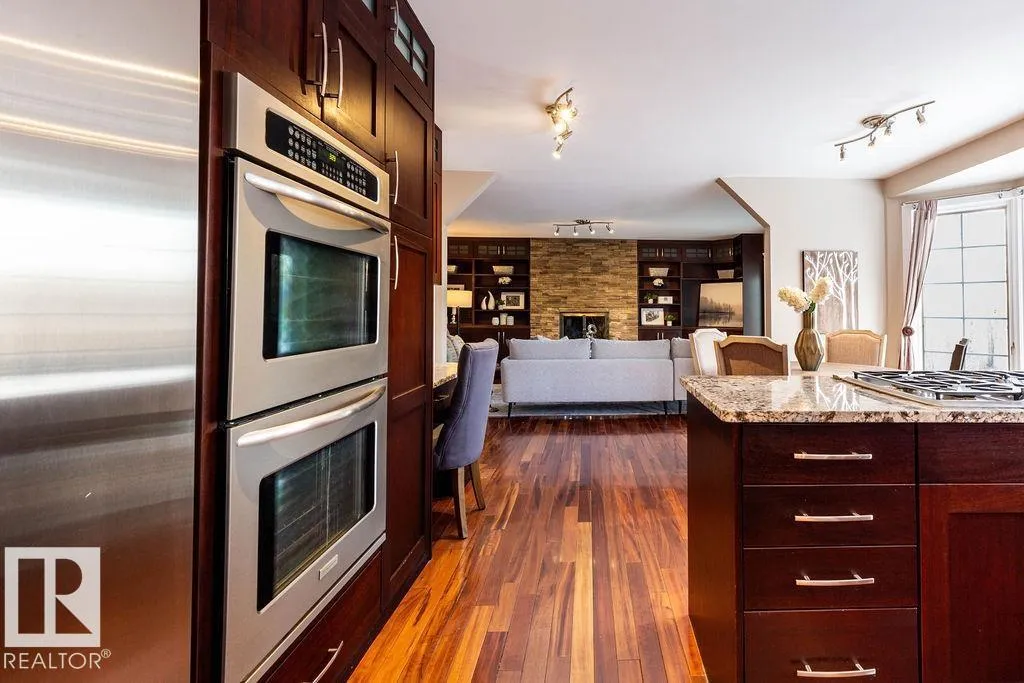 Quesnell Ravine Property! This 6-bedroom, 2-storey home offers over 4,300 sq ft of upgraded living space on a rare 14,000 sq ft lot backing onto mature trees and the Whitemud. A gentle hum reminds you youâre close to everything, while the setting offers exceptional privacyâno rear neighbours and the freedom to truly enjoy your space. Rich tigerwood floors lead through the open main level to a chefâs kitchen with cherry cabinetry, granite counters, stainless appliances, double ovens, 5-burner gas cooktop, oversized fridge, and wine cooler. The family room with wood-burning fireplace opens to a private backyard with patio and gas firepit. Main-floor laundry with sink and ample storage. Upstairs the primary suite features a walk-in closet and luxurious 5-piece ensuite with steam shower and clawfoot tub. Finished basement with rec room w/keg cooler, dishwasher, a bedroom, den, and bath. Balcony above the heated double garage overlooks the landscaped yard with sprinklers and lighting. A unique opportunity! (id:27476)