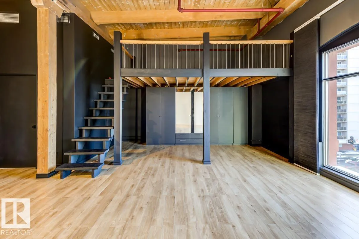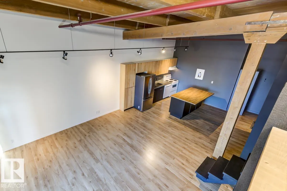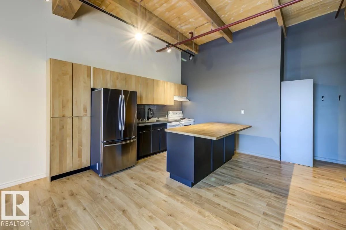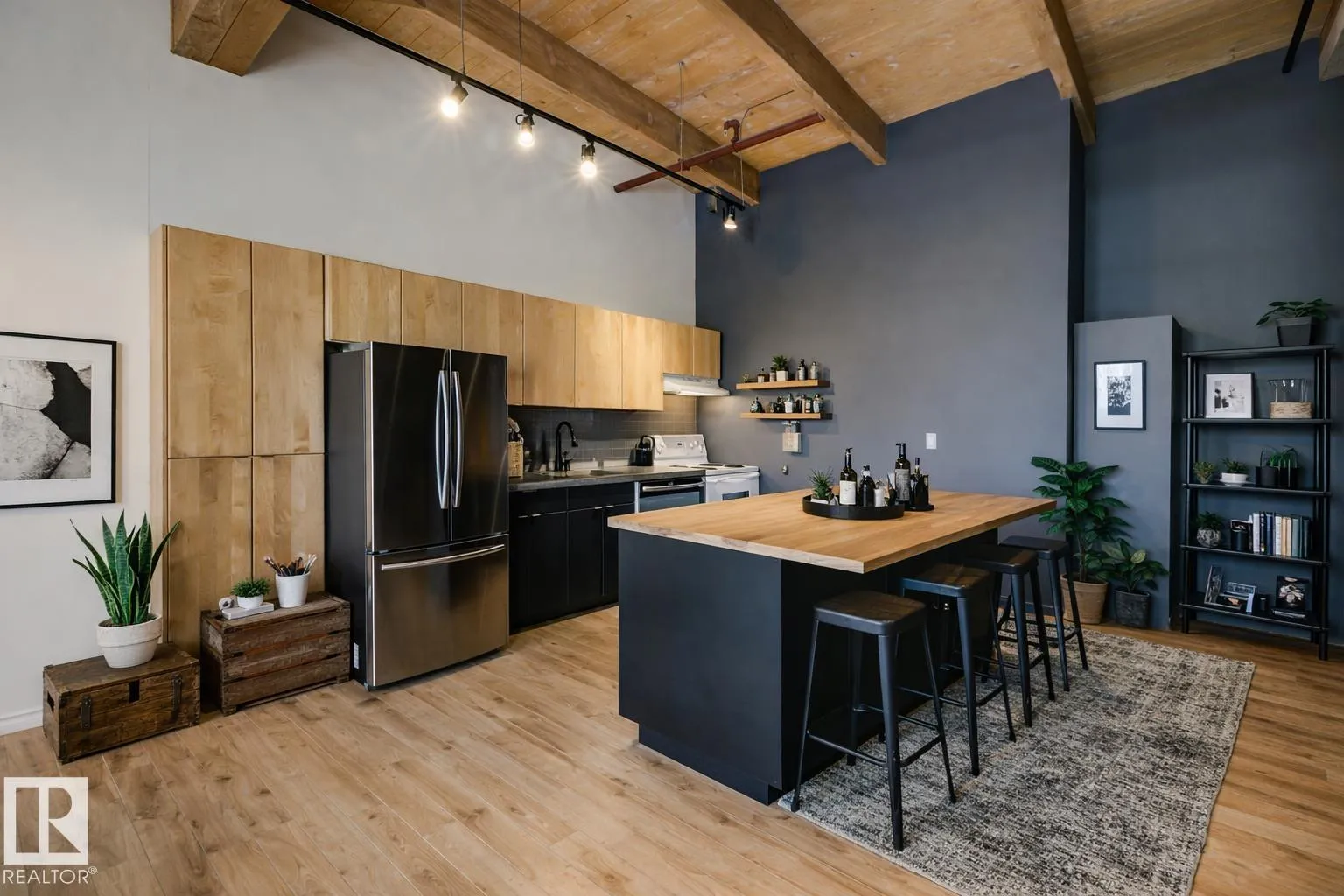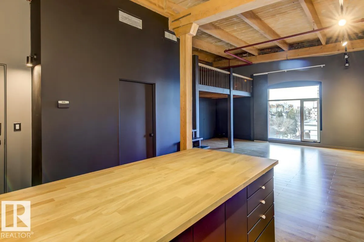 This is a true historic warehouse loft, authentic, architectural, and incredibly rare. Located in one of Edmontonâs most respected warehouse conversions, this top-floor corner-unit loft offers approximately open, flexible living space with soaring 13-foot exposed timber ceilings, original beams and columns, and beautiful west-facing light. The open-concept layout is currently configured as a one-bedroom plus den with a raised loft and massive built-in wardrobe, while still allowing for creative customization. Thoughtful updates include new laminate flooring, concrete countertops, a modern kitchen island, in-suite laundry, air conditioning, and a beautifully renovated bathroom. Underground titled parking and exceptionally low condo fees that include heat and water add tremendous value. Perfectly situated in the Warehouse District, steps from 104 Street, the Ice District, Brewery District, and post-secondary institutions, this is authentic urban loft living. (id:27476)