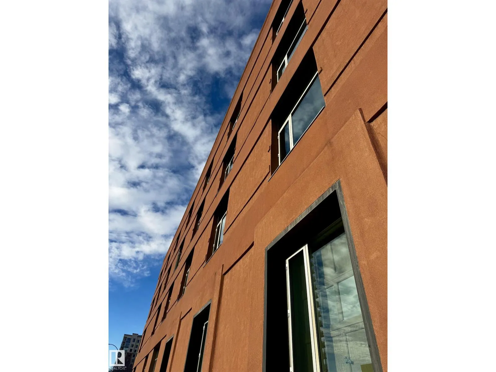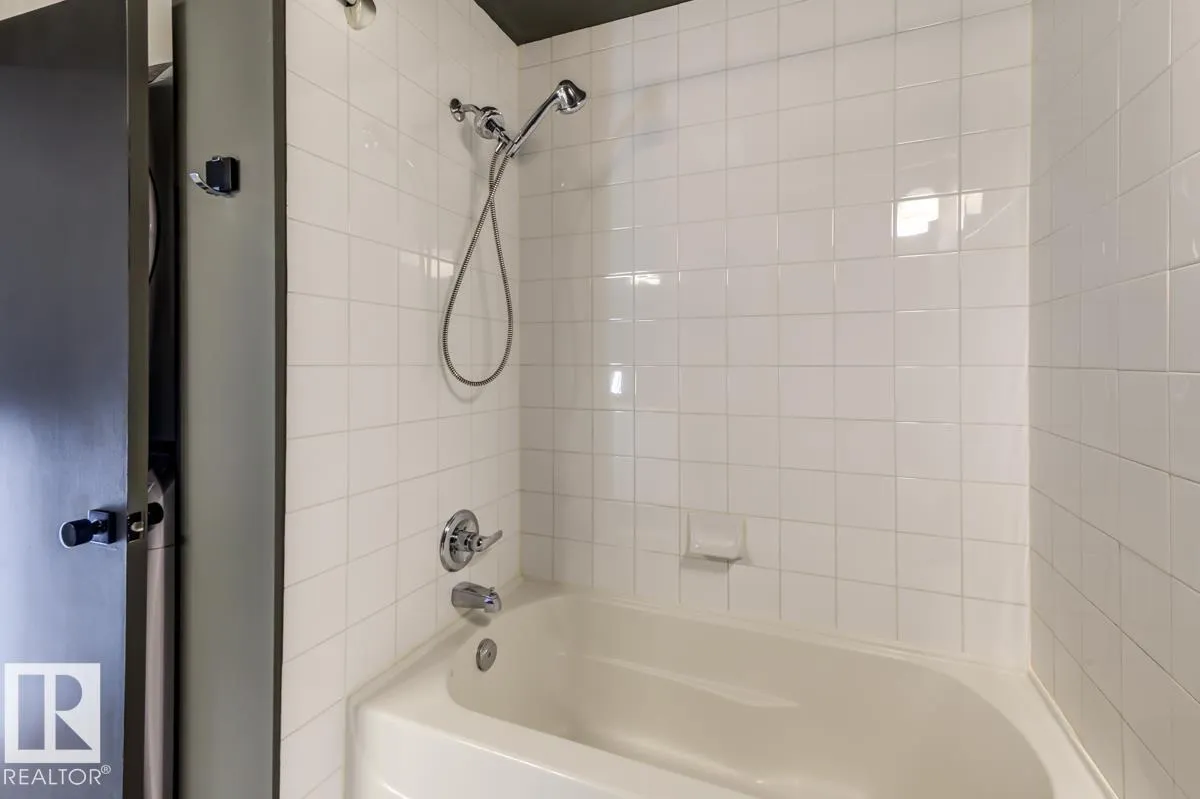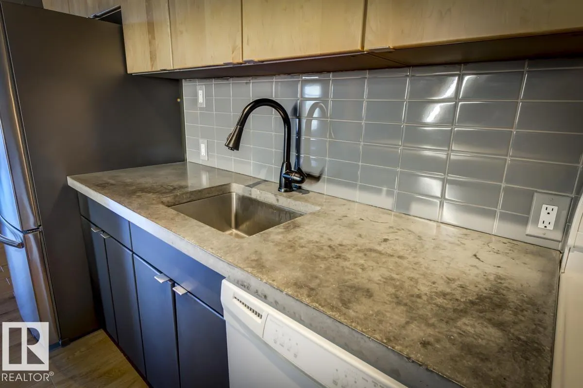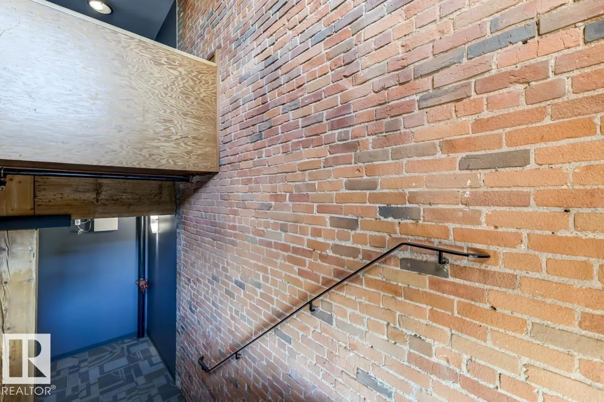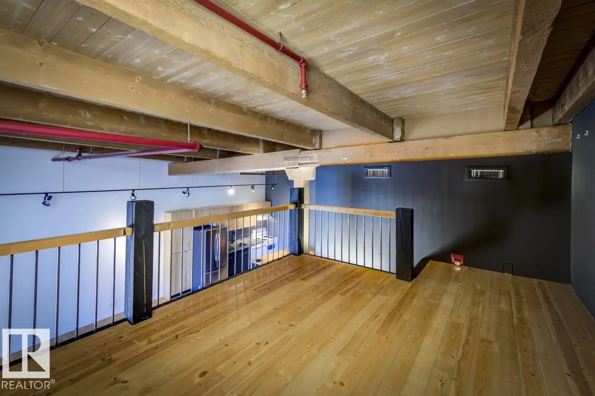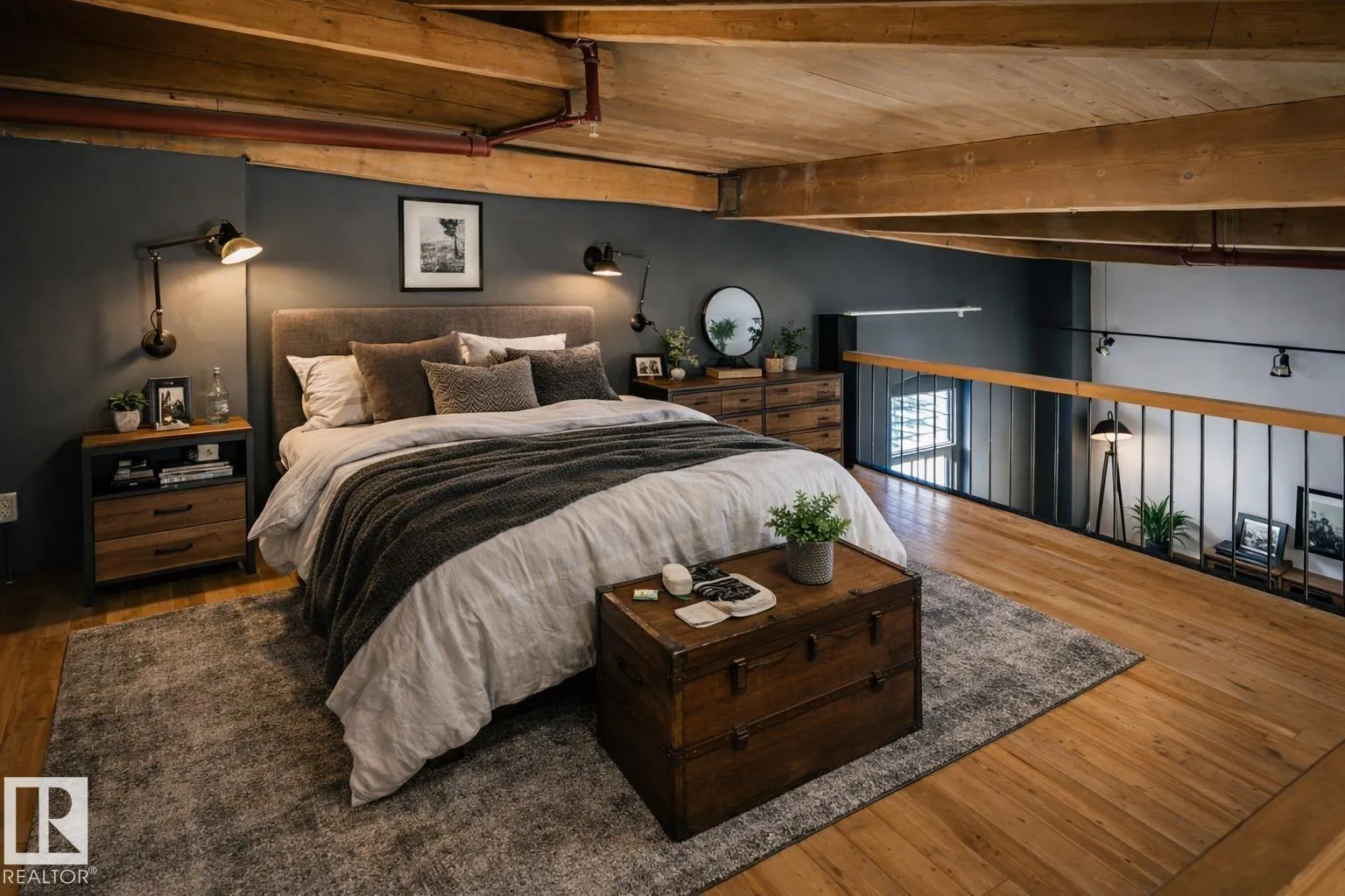 This is a true historic warehouse loft, authentic, architectural, and incredibly rare. Located in one of Edmontonâs most respected warehouse conversions, this top-floor corner-unit loft offers approximately open, flexible living space with soaring 13-foot exposed timber ceilings, original beams and columns, and beautiful west-facing light. The open-concept layout is currently configured as a one-bedroom plus den with a raised loft and massive built-in wardrobe, while still allowing for creative customization. Thoughtful updates include new laminate flooring, concrete countertops, a modern kitchen island, in-suite laundry, air conditioning, and a beautifully renovated bathroom. Underground titled parking and exceptionally low condo fees that include heat and water add tremendous value. Perfectly situated in the Warehouse District, steps from 104 Street, the Ice District, Brewery District, and post-secondary institutions, this is authentic urban loft living. (id:27476)