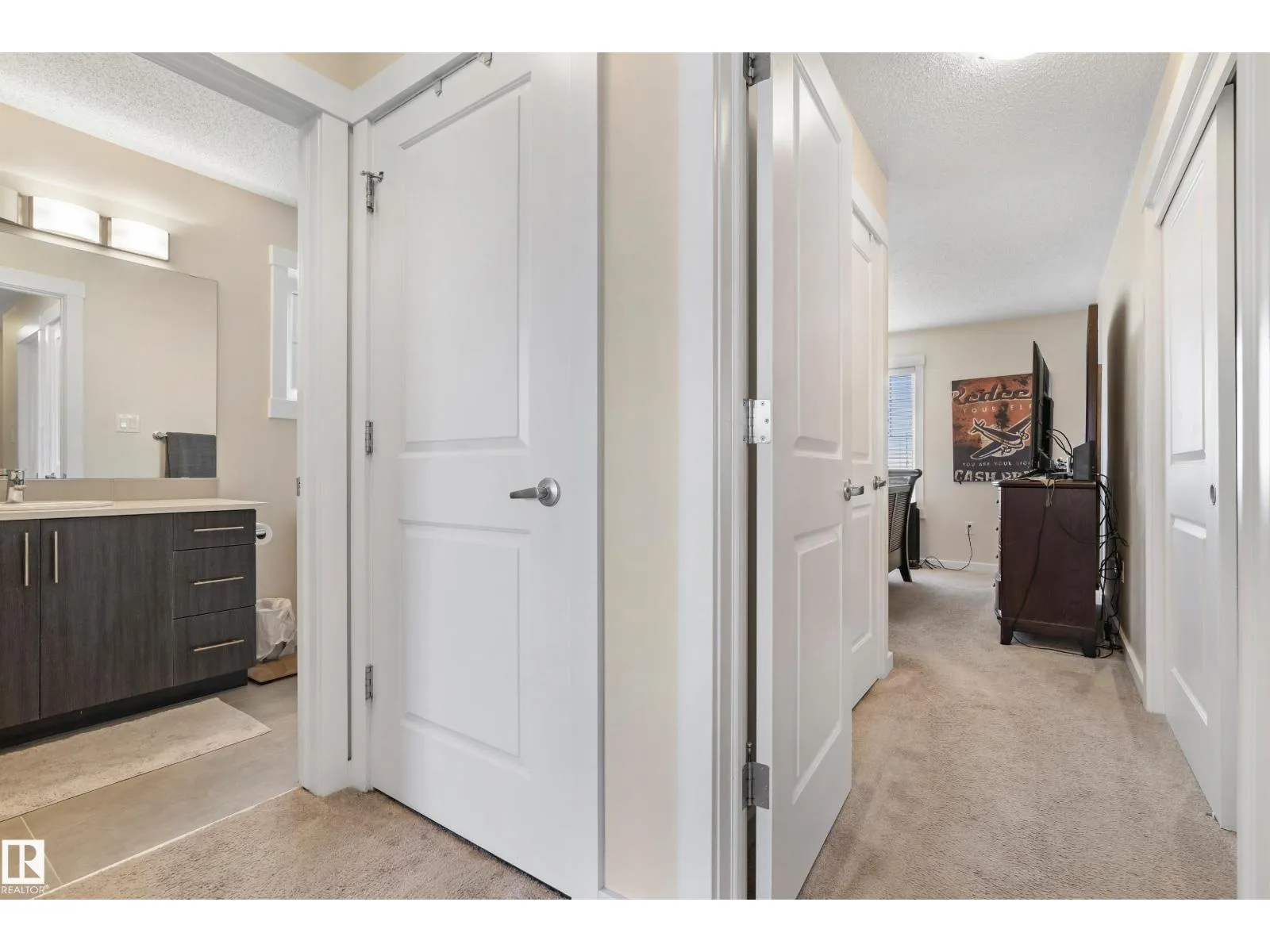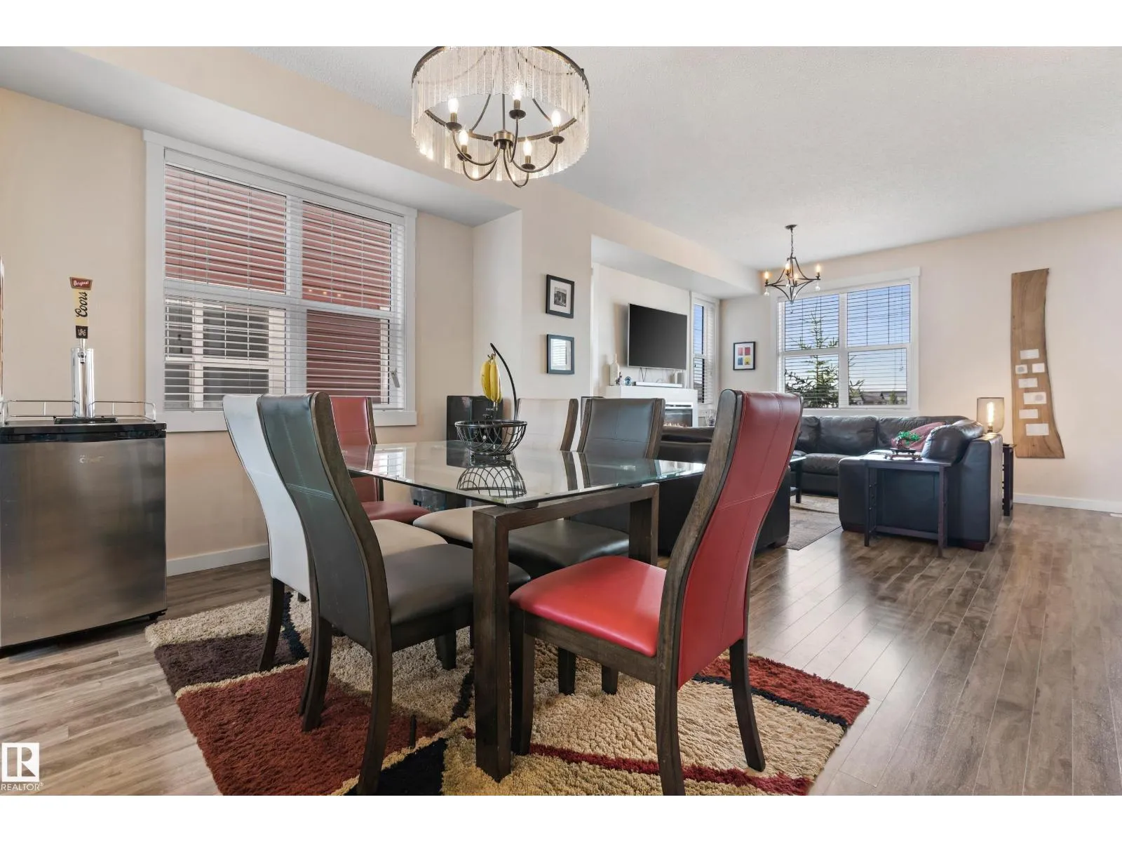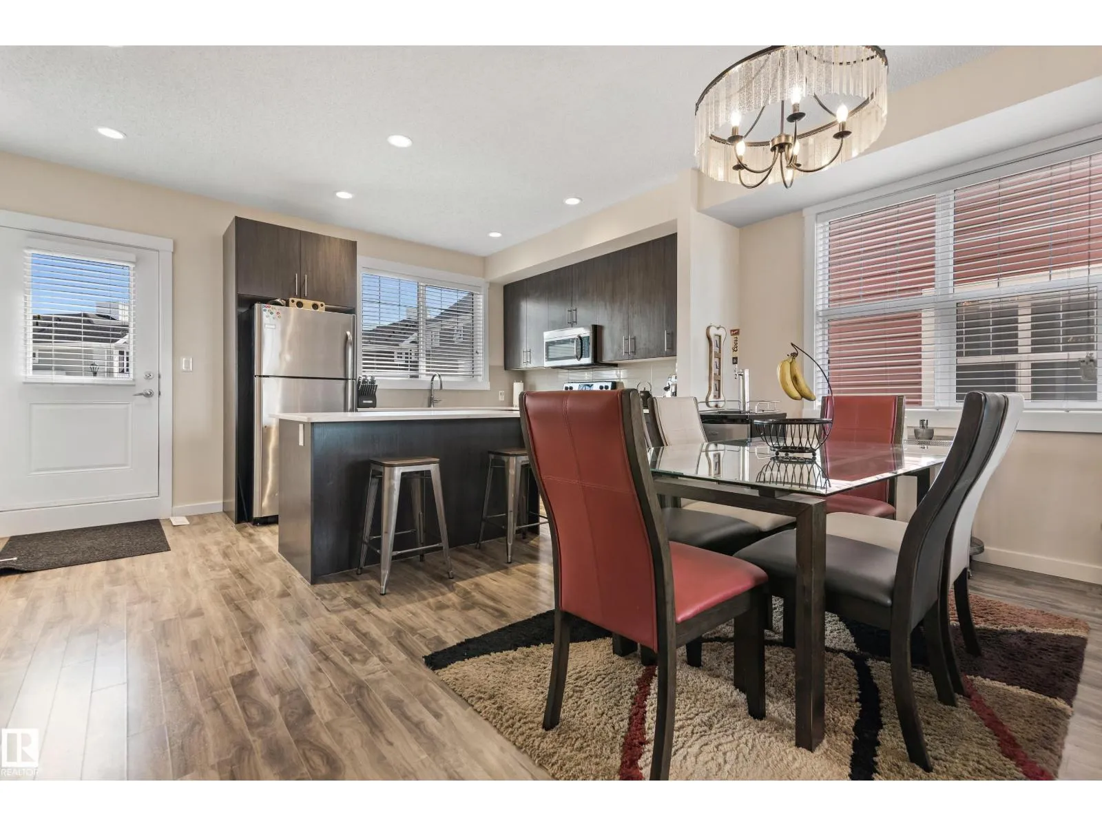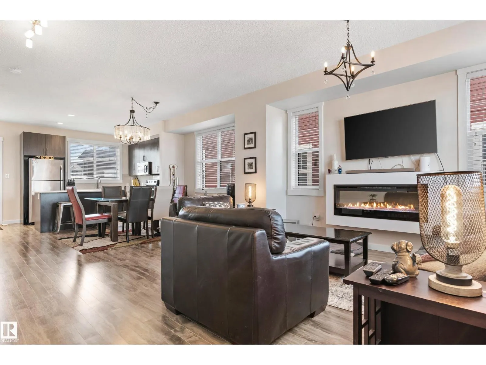 Welcome to this lovely 3-bedroom, 2.5 bath, double attached garage end unit townhome. Located in a great family area across from a pond in Crystallina. Easy access to Anthony Henday, CFB Edmonton, shops and restaurants. This nicely maintained townhouse has A/C, which comes in handy for those hot summer days. Other notable features are 9 ft ceilings on the main floor, beautiful kitchen cabinets, quartz countertops, spacious open bright floor plan, dining room, living room with electric fireplace, vinyl plank floors, and ceramic tiles in the 2 pc bath. Stainless steel appliances, spacious deck with gas line for BBQ, and central vac. The upper level has 3 good size bedrooms with a 4 pc bath and a 3 pc ensuite and a walk-in closet. Carpet and ceramic floors in bathrooms and a stackable front load washer/dryer. The double attached garage is drywalled, insulated, and has 11 ft ceilings. (id:27476)