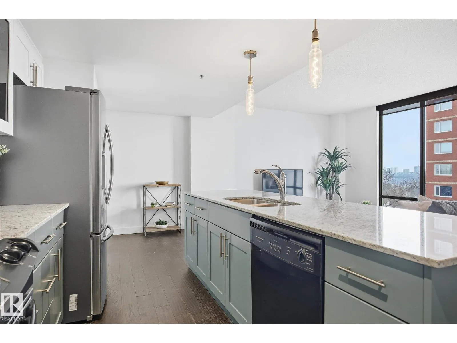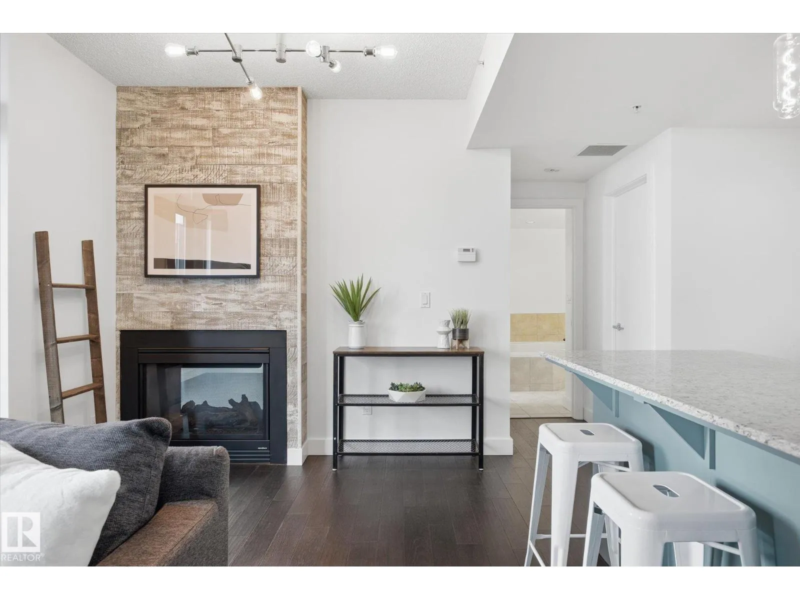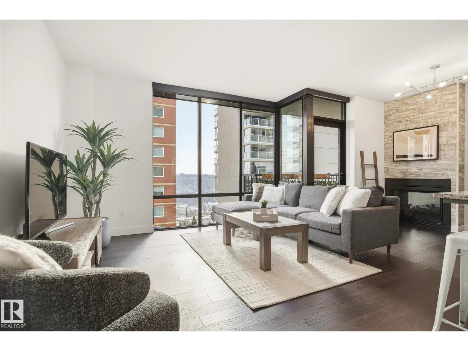 This stunning condo offers a bright and spacious living room featuring floor-to-ceiling windows and a cozy fireplaceâperfect for relaxing. The renovated modern kitchen is both stylish and functional, with an island for extra prep space and warm pops of color in the BRAND NEW cabinetry. The bedroom also includes its own fireplace, creating a comfortable and inviting retreat. The bathroom features a luxurious soaker tub. Step outside to enjoy your private balcony. Located just steps from tons of restaurants, shopping, and entertainment. Includes one stall in a heated garage. A perfect blend of comfort, style, and convenience! (id:27476)