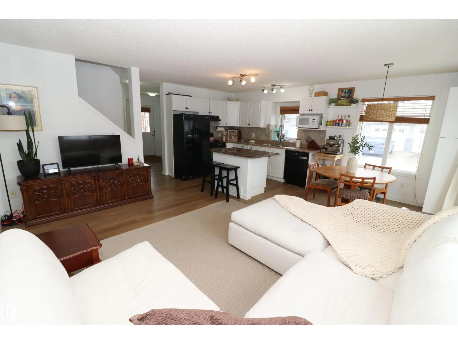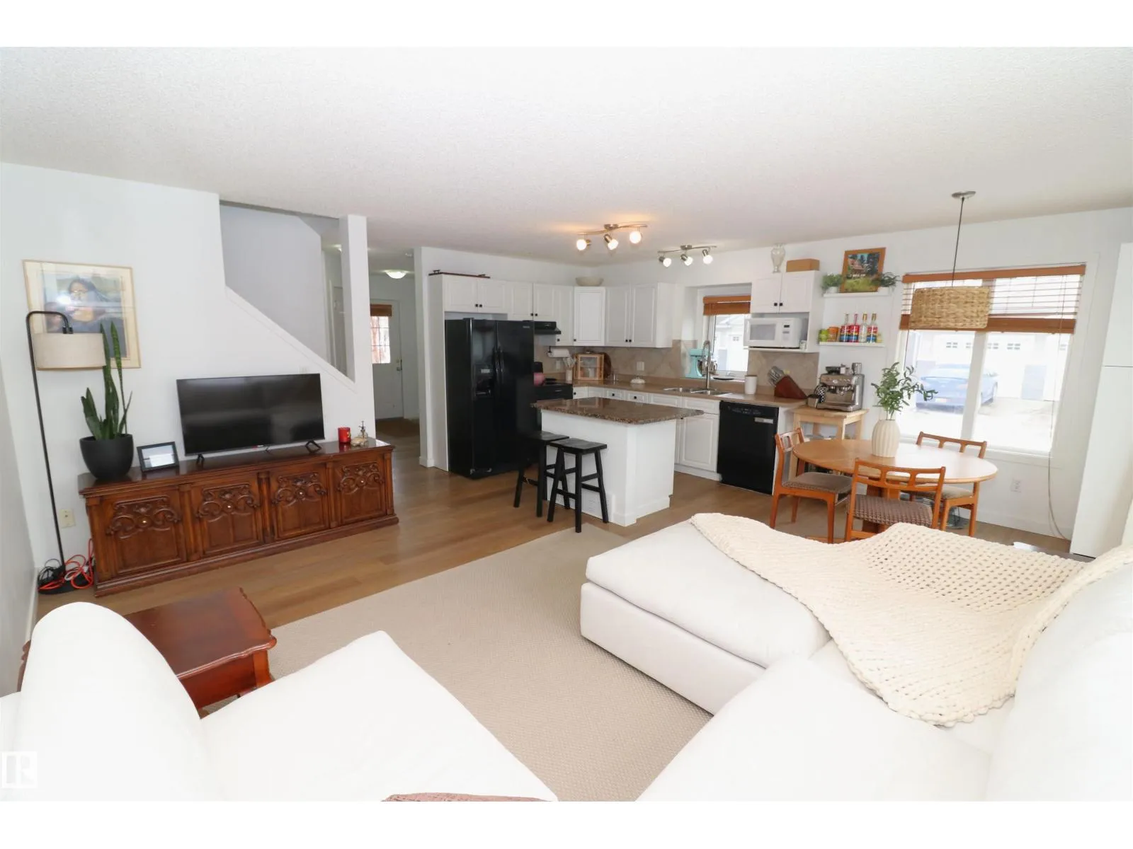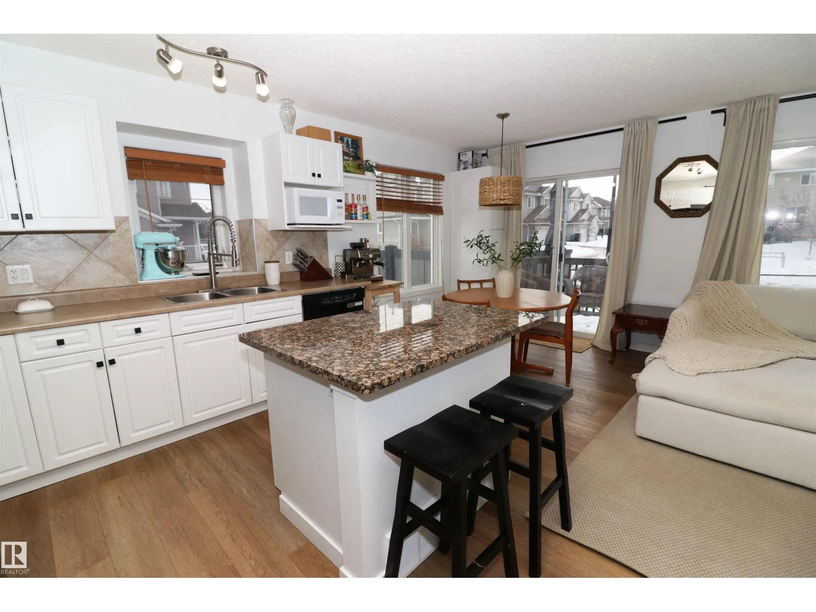 Gorgeous updated half duplex backing green space in Magrath! This beautiful property has so much going for it - new vinyl plank floors main floor & laminate in the basement, bright white paint showing off the natural light of the many windows throughout. The open concept kitchen has white cabinets with modern black hardware, there is a granite island for extra work space & friends to cheers. The large living space isn't limited by a fireplace, so big furniture can fill it out in your layout choice. The dining nook sits in front of the patio door which leads to the deck, south facing yard & view of the greenspace. Upstairs are 2 huge bedrooms - the 16x12 primary with an ensuite and walk-in closet & the 2nd bedroom which is 15x11 has its own walk-in closet as well. There is a 2nd full bath upstairs as well. The finished basement is a great rec space and houses laundry & utilties as well. Single garage attached & driveway space for a 2nd. Great location surrounded by grocery, restaurants, quick to Henday LRT (id:27476)