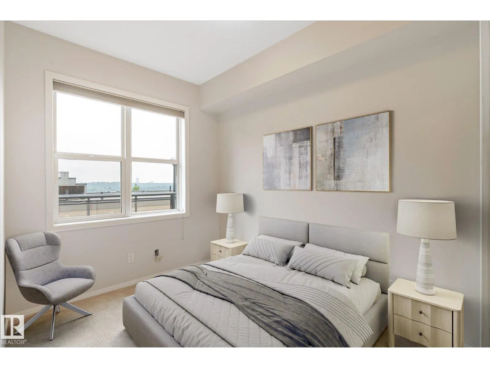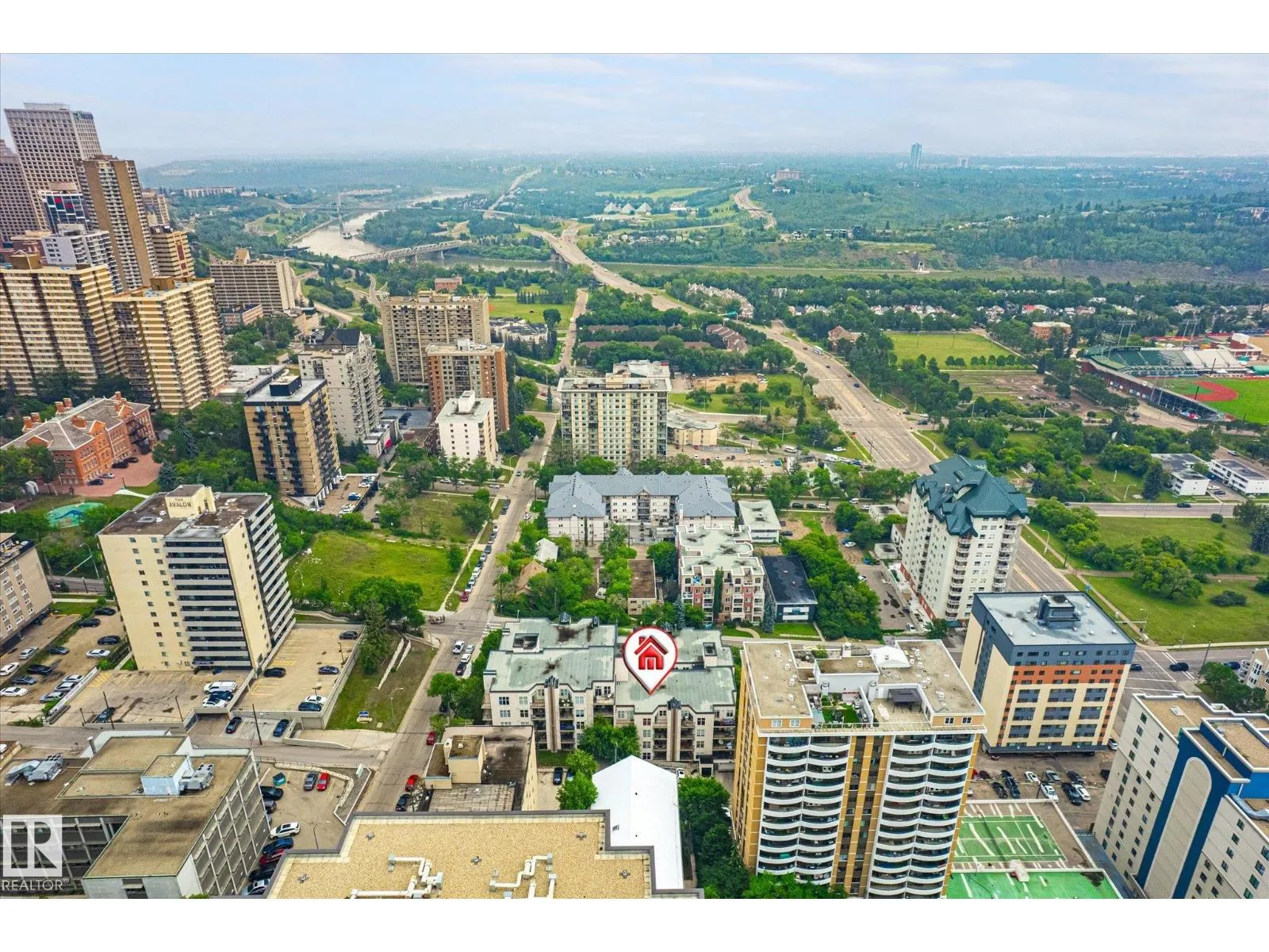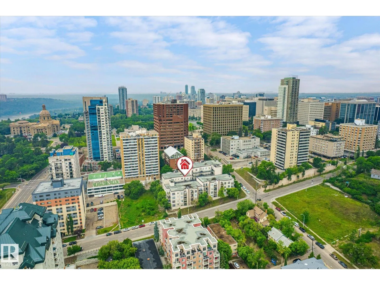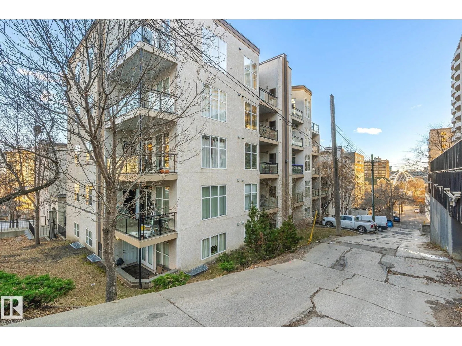 Top floor river valley unit! This contemporary condo is in a fantastic location, steps away from the Legislature, the river valley and the baseball park! As you walk to the suite's front door you will notice that your front entry and 2nd bedroom overlooks the river valley. Inside 9ft ceilings with floor to ceiling windows allows the sunlight in to bounce off of your hardwood flooring. A maple island kitchen with eating bar and tons of counters and cabinets is perfect for the chef in the family and it is also nicely equipped with stainless steel appliances. Patio doors lead to a balcony that faces west, A/C will keep you cool. The large master bedroom has a walk in closet and a full ensuite with tile tub surround and tile flooring. Main bathroom with tile flooring and shower, stackable washer and dryer and secure underground parking stall round out the features. There is ample visitor parking in the alley on the west side of the building. Some pictures are virtually staged. (id:27476)