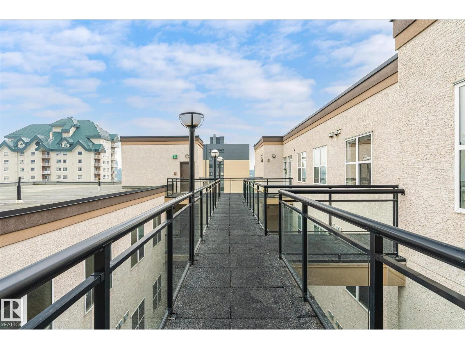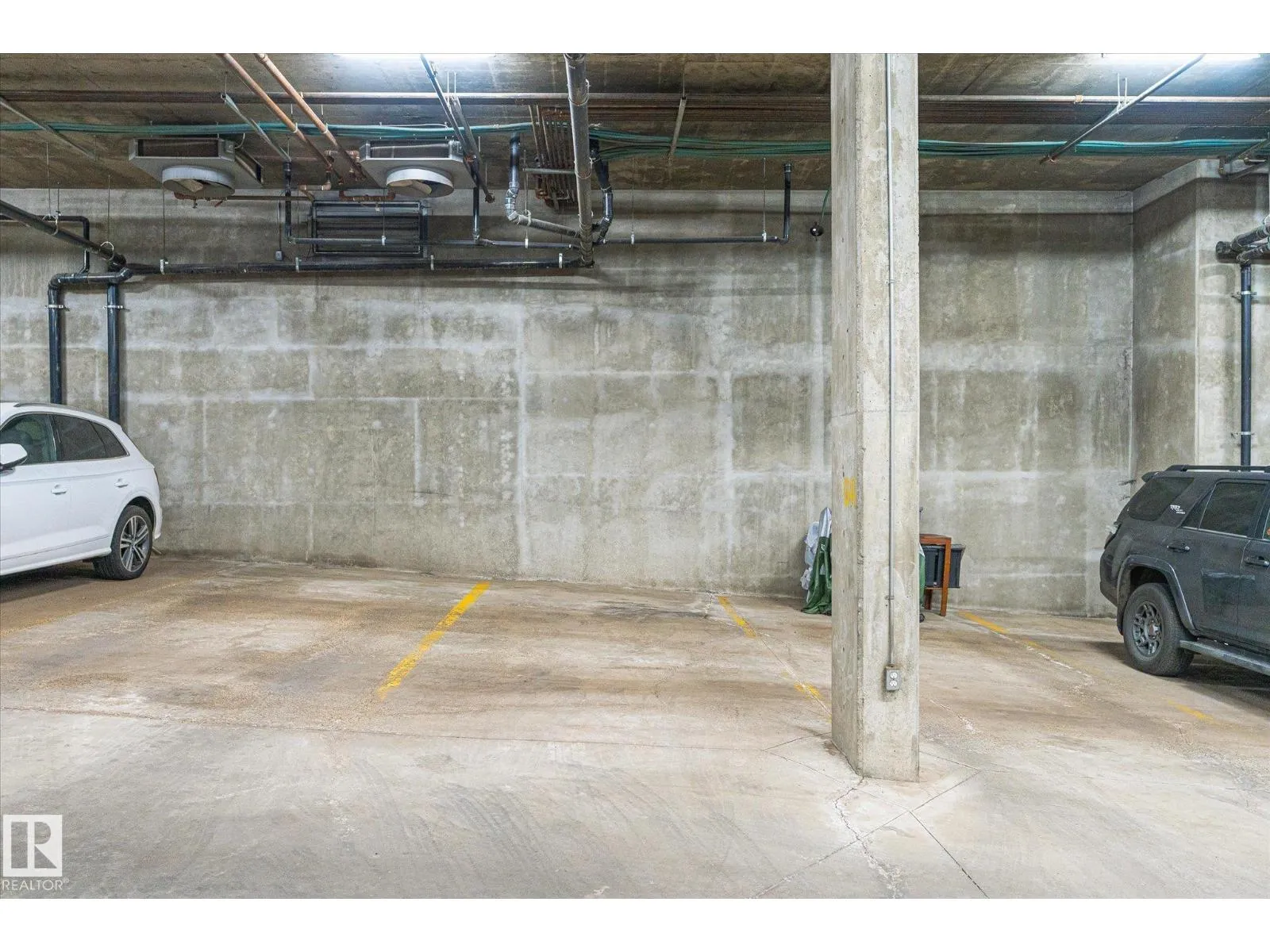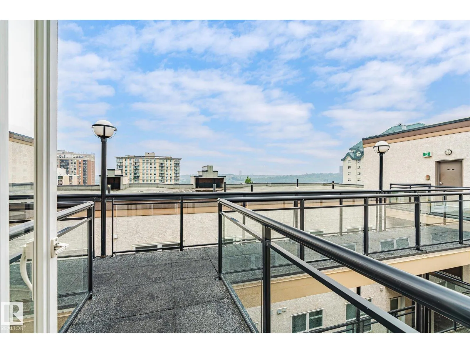 Top floor river valley unit! This contemporary condo is in a fantastic location, steps away from the Legislature, the river valley and the baseball park! As you walk to the suite's front door you will notice that your front entry and 2nd bedroom overlooks the river valley. Inside 9ft ceilings with floor to ceiling windows allows the sunlight in to bounce off of your hardwood flooring. A maple island kitchen with eating bar and tons of counters and cabinets is perfect for the chef in the family and it is also nicely equipped with stainless steel appliances. Patio doors lead to a balcony that faces west, A/C will keep you cool. The large master bedroom has a walk in closet and a full ensuite with tile tub surround and tile flooring. Main bathroom with tile flooring and shower, stackable washer and dryer and secure underground parking stall round out the features. There is ample visitor parking in the alley on the west side of the building. Some pictures are virtually staged. (id:27476)