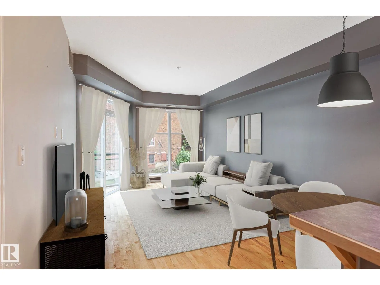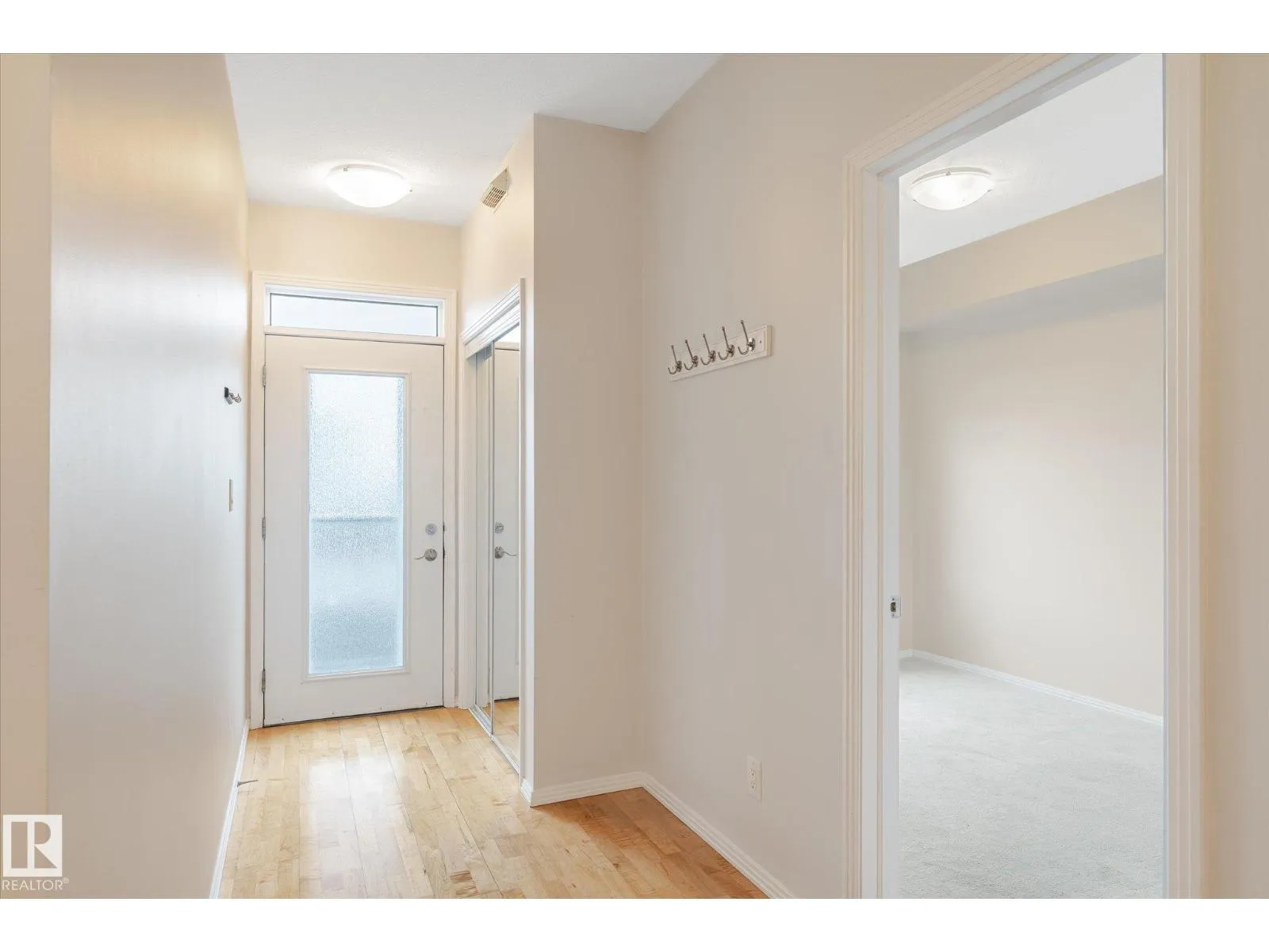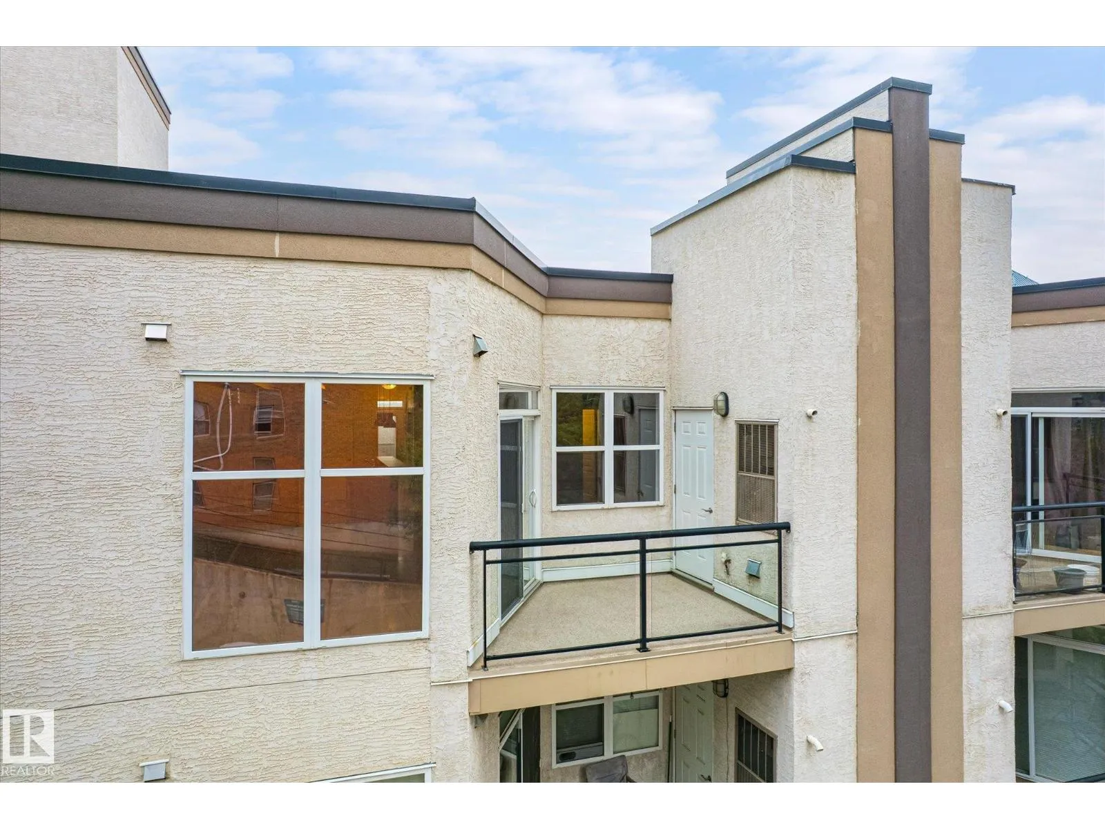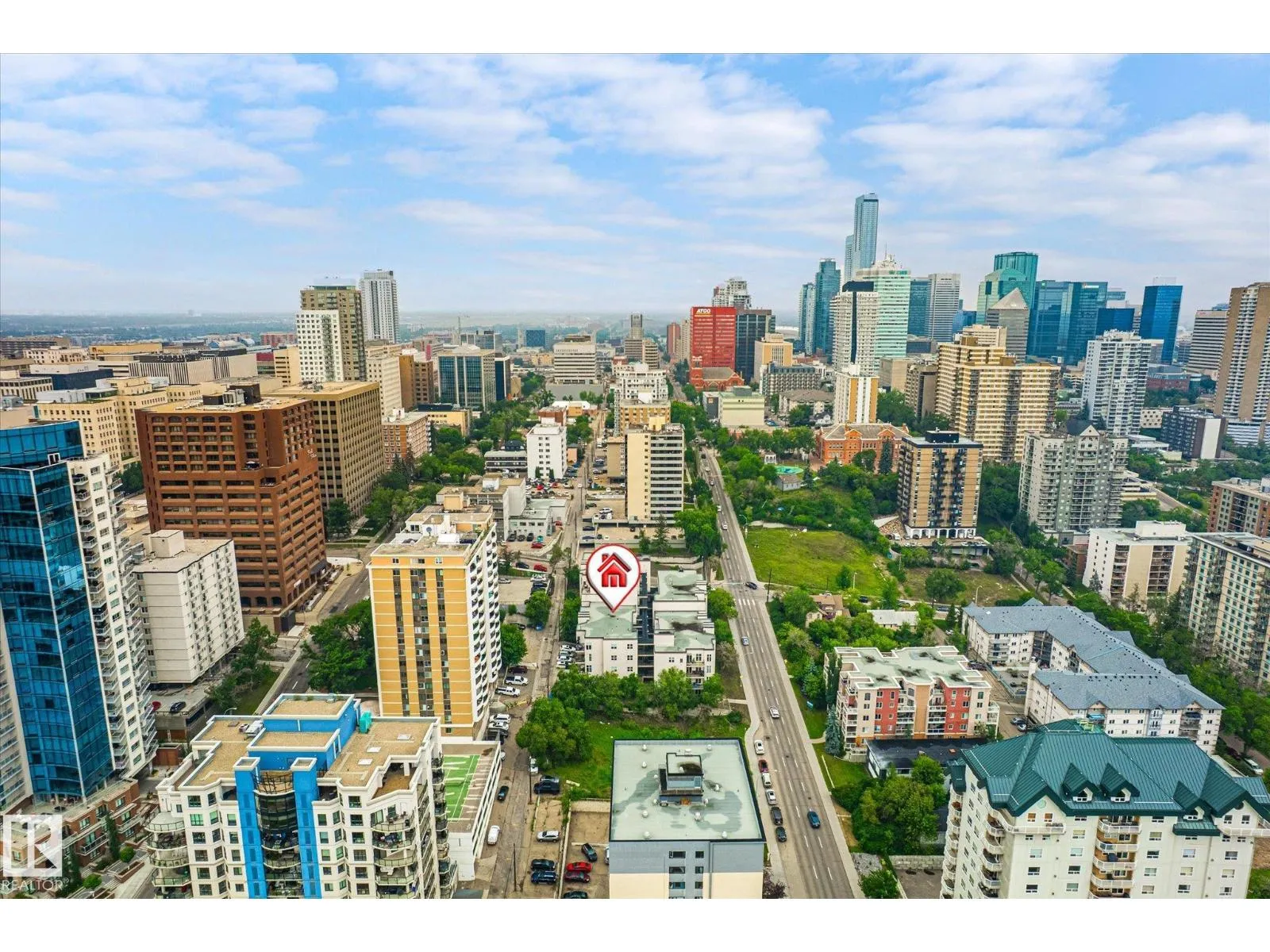 Top floor river valley unit! This contemporary condo is in a fantastic location, steps away from the Legislature, the river valley and the baseball park! As you walk to the suite's front door you will notice that your front entry and 2nd bedroom overlooks the river valley. Inside 9ft ceilings with floor to ceiling windows allows the sunlight in to bounce off of your hardwood flooring. A maple island kitchen with eating bar and tons of counters and cabinets is perfect for the chef in the family and it is also nicely equipped with stainless steel appliances. Patio doors lead to a balcony that faces west, A/C will keep you cool. The large master bedroom has a walk in closet and a full ensuite with tile tub surround and tile flooring. Main bathroom with tile flooring and shower, stackable washer and dryer and secure underground parking stall round out the features. There is ample visitor parking in the alley on the west side of the building. Some pictures are virtually staged. (id:27476)