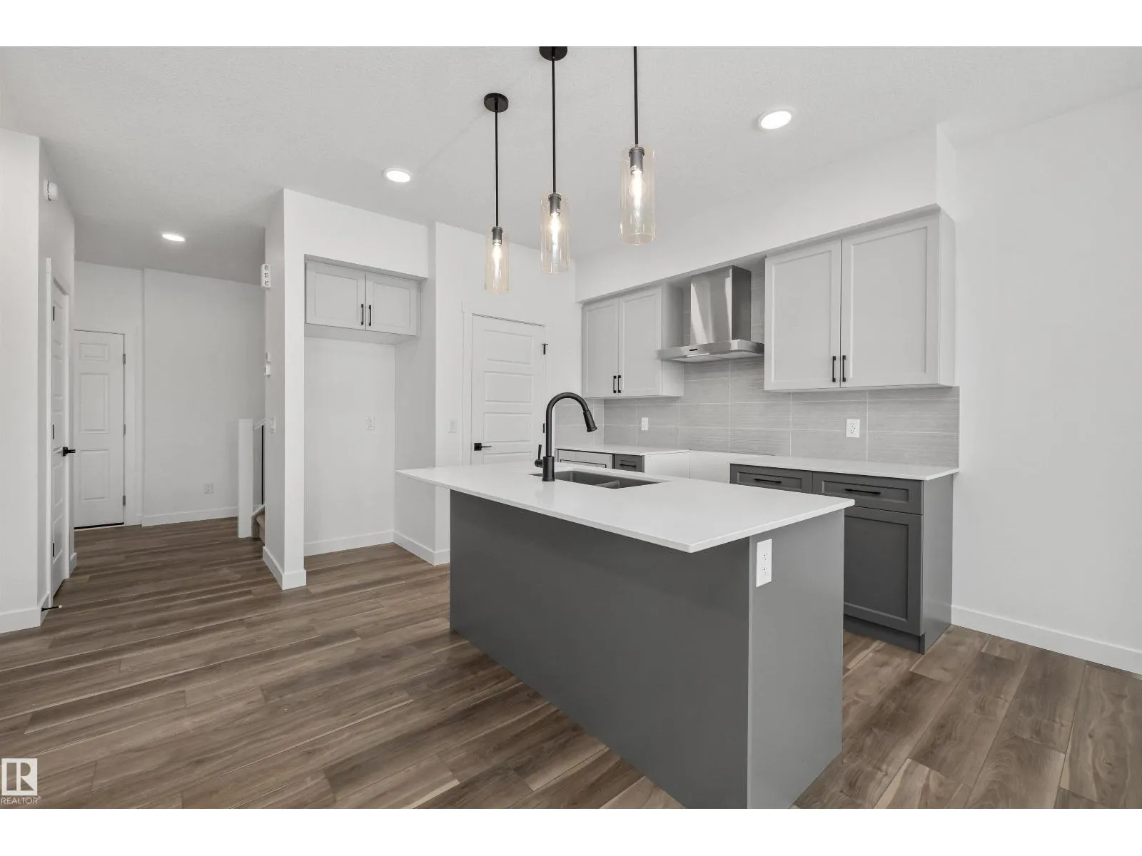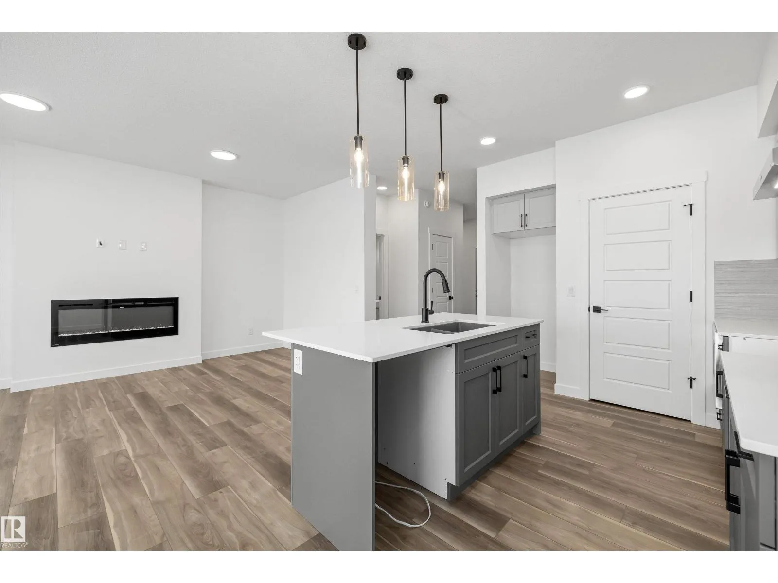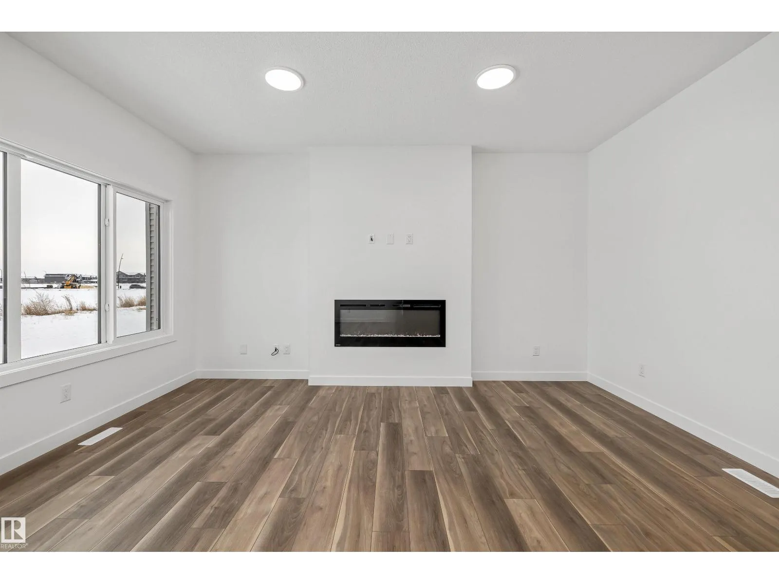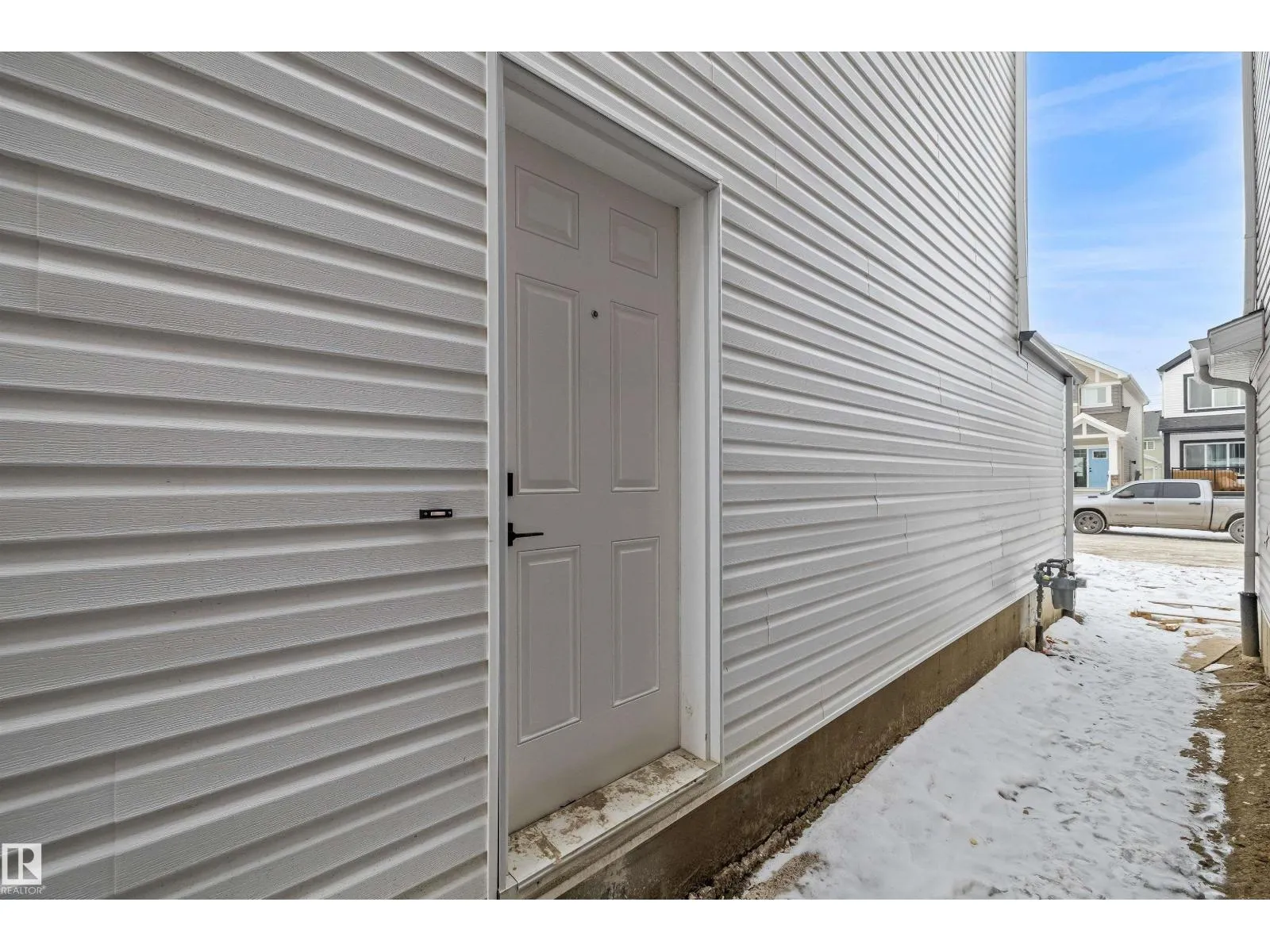 Built by Sterling Homes, this beautifully finished duplex in Aster offers bright, modern living in a welcoming, family-friendly community. Triple-pane windows and 9â ceilings flood the main floor with natural light, creating an open, inviting feel. The kitchen impresses with quartz countertops, a central island with seating, upgraded cabinetry, full-height tile backsplash, a corner pantry, and a sleek chimney hood fanâperfect for everyday living and entertaining. The great room features an electric fireplace and flows into the dining nook with patio doors to the future deck and backyard. Upstairs, a spacious bonus room adds flexible space. The primary suite includes a walk-in closet and 3-piece ensuite, while two more bedrooms, a full bath, and upper-floor laundry add convenience. Finished with luxury vinyl plank flooring, a separate side entrance, double attached garage with floor drain, and basement rough-ins, this home blends comfort, style, and long-term value. (id:27476)