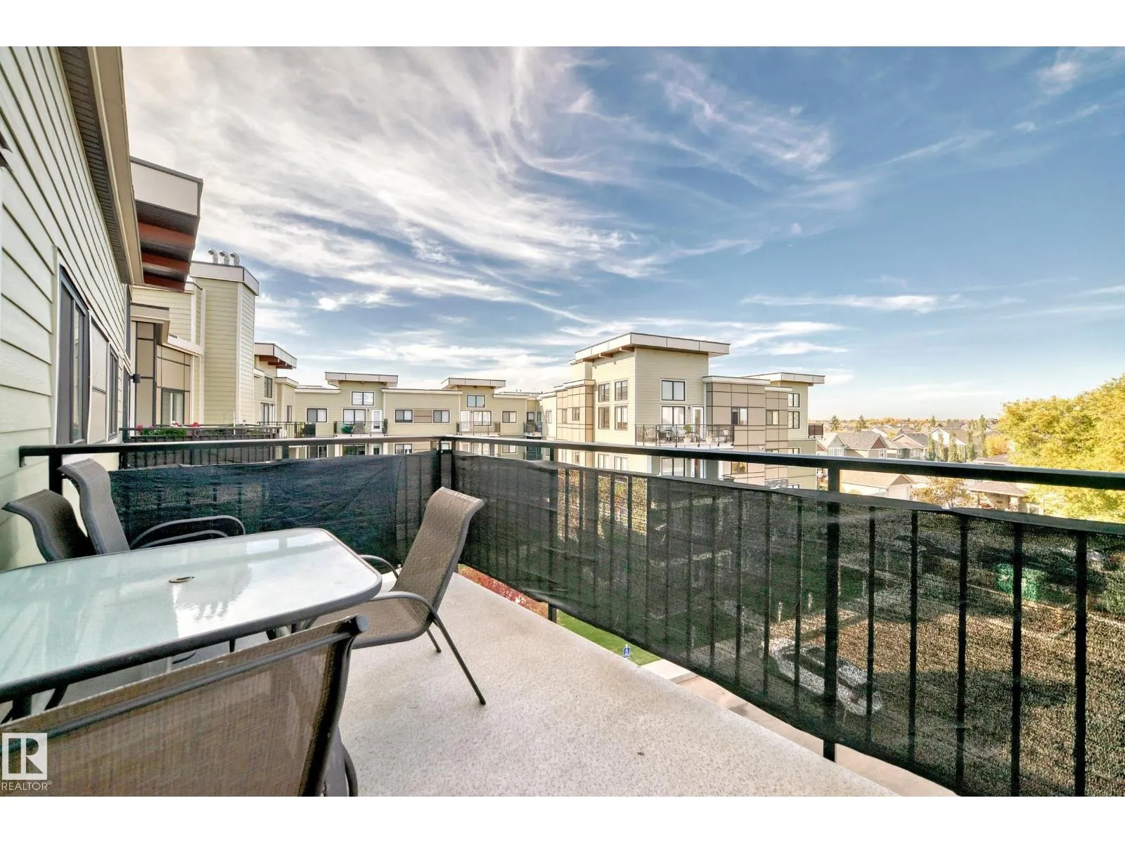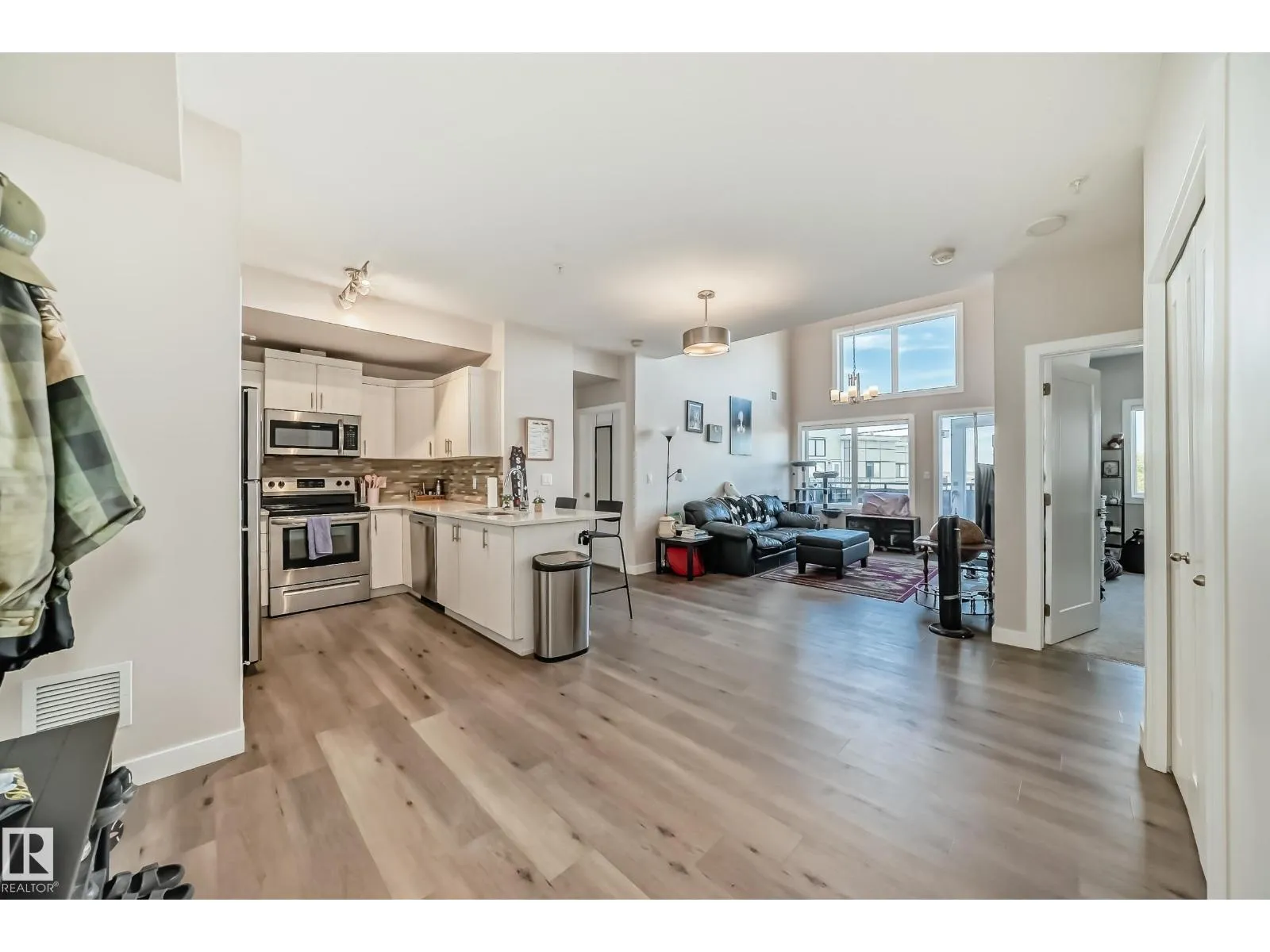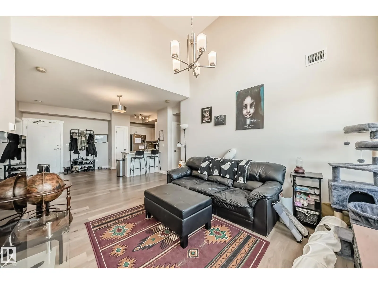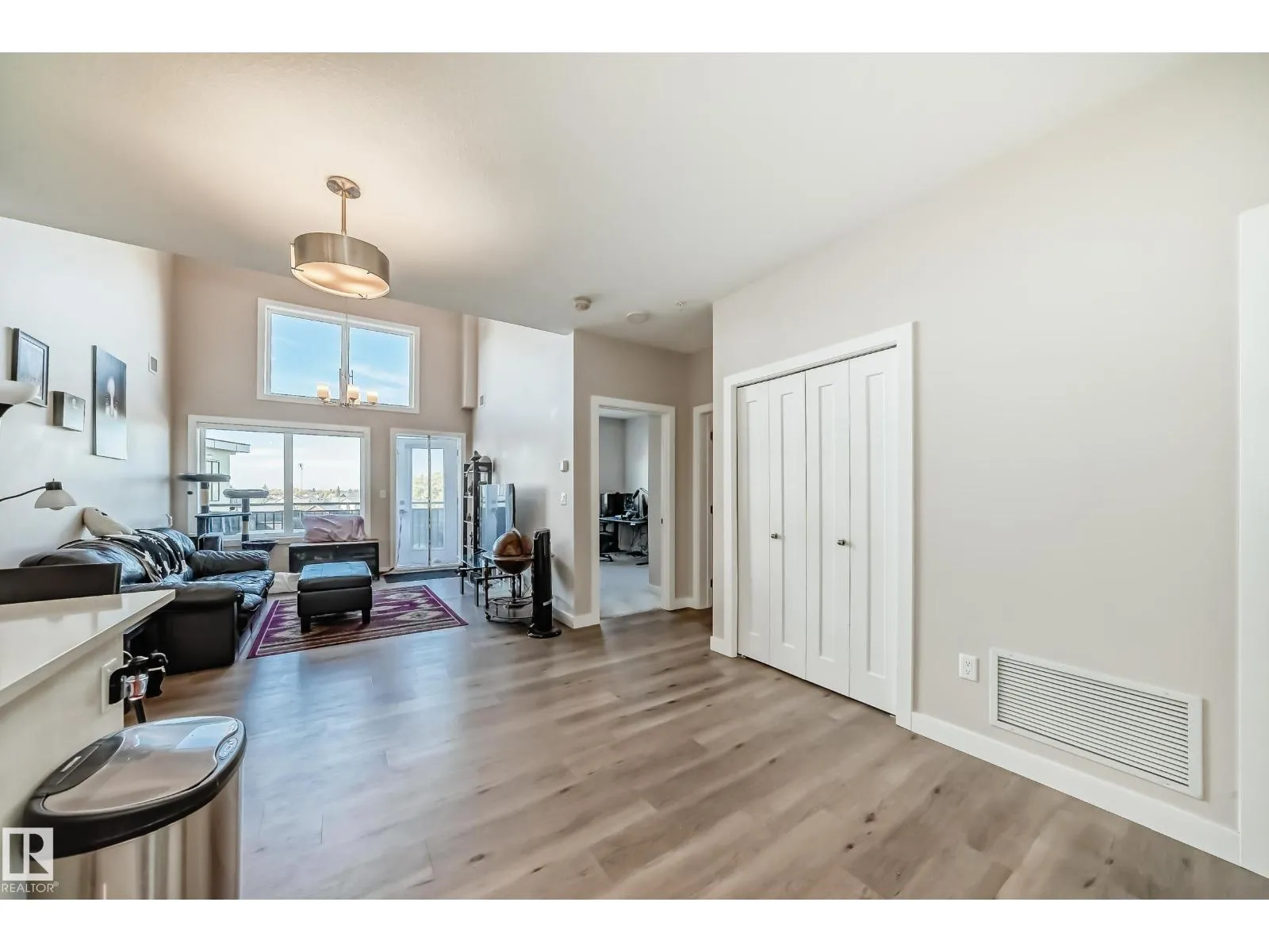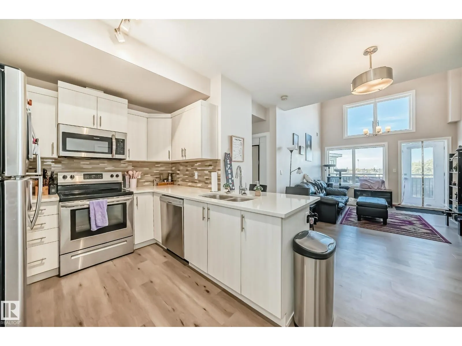 The Connaught at Griesbach - Welcome home to this stunning top-floor, north-facing 2 bedroom, 2 bathroom suite featuring a bright open-concept design and modern finishes throughout. With a builderâs size of 1,000 sq. ft., this suite offers quartz countertops, soft-close cabinetry, and low-maintenance vinyl plank flooring in the main living areas, complemented by plush carpet in the bedrooms. The impressive two-storey living room is filled with natural light from expansive windows, with a bedroom conveniently located on each side for added privacy. Step out onto the spacious deck, complete with a natural gas hookup for barbecuing. Enjoy the many building amenities, including a fitness centre, social/amenity room, library, car wash bay, and secure key fob access. Additional features include Hunter Douglas window coverings, stainless steel appliances, in-suite laundry with stacking washer and dryer, and one underground parking stall. Building was treated with fire retardant spray during construction. (id:27476)
