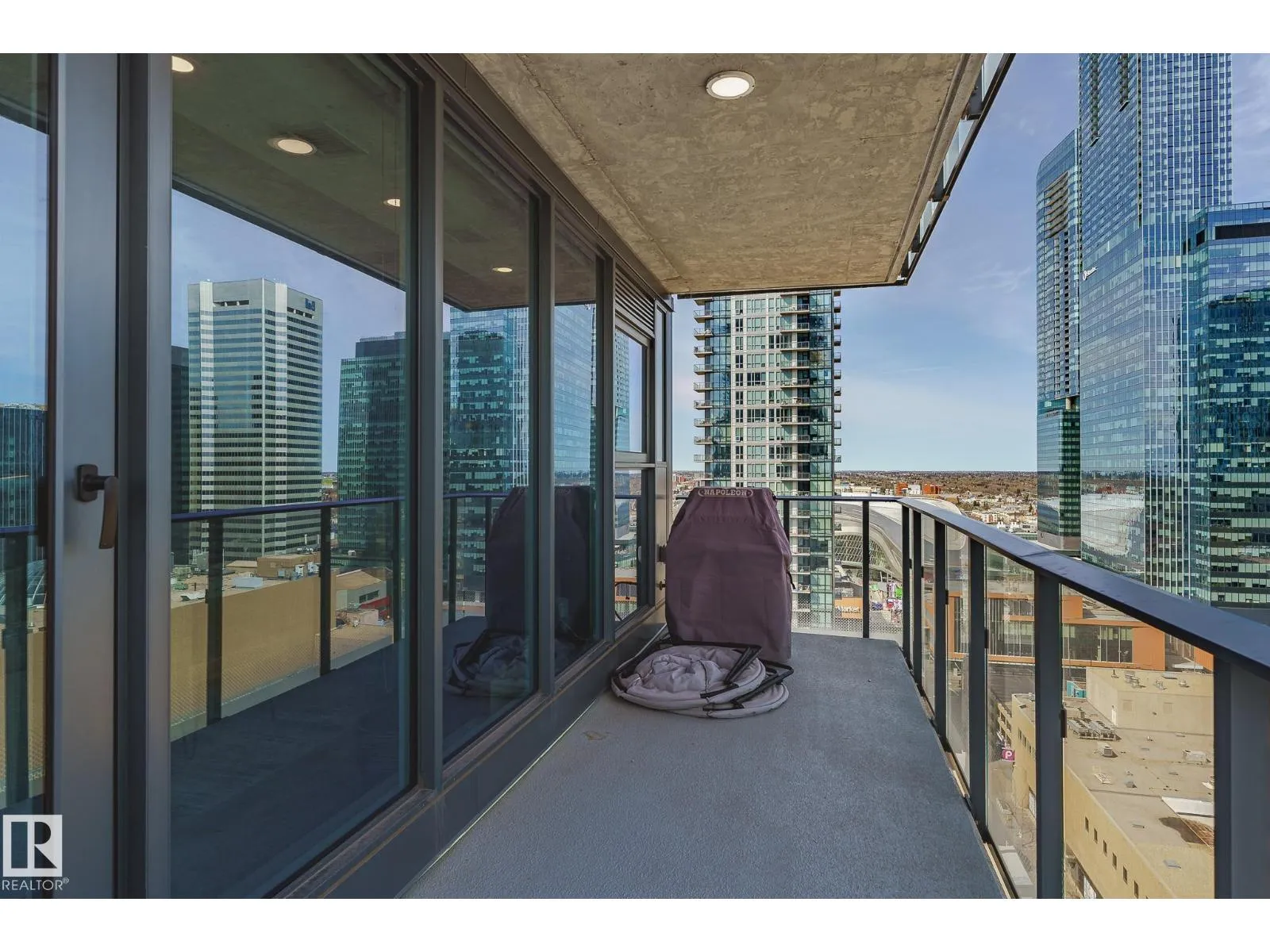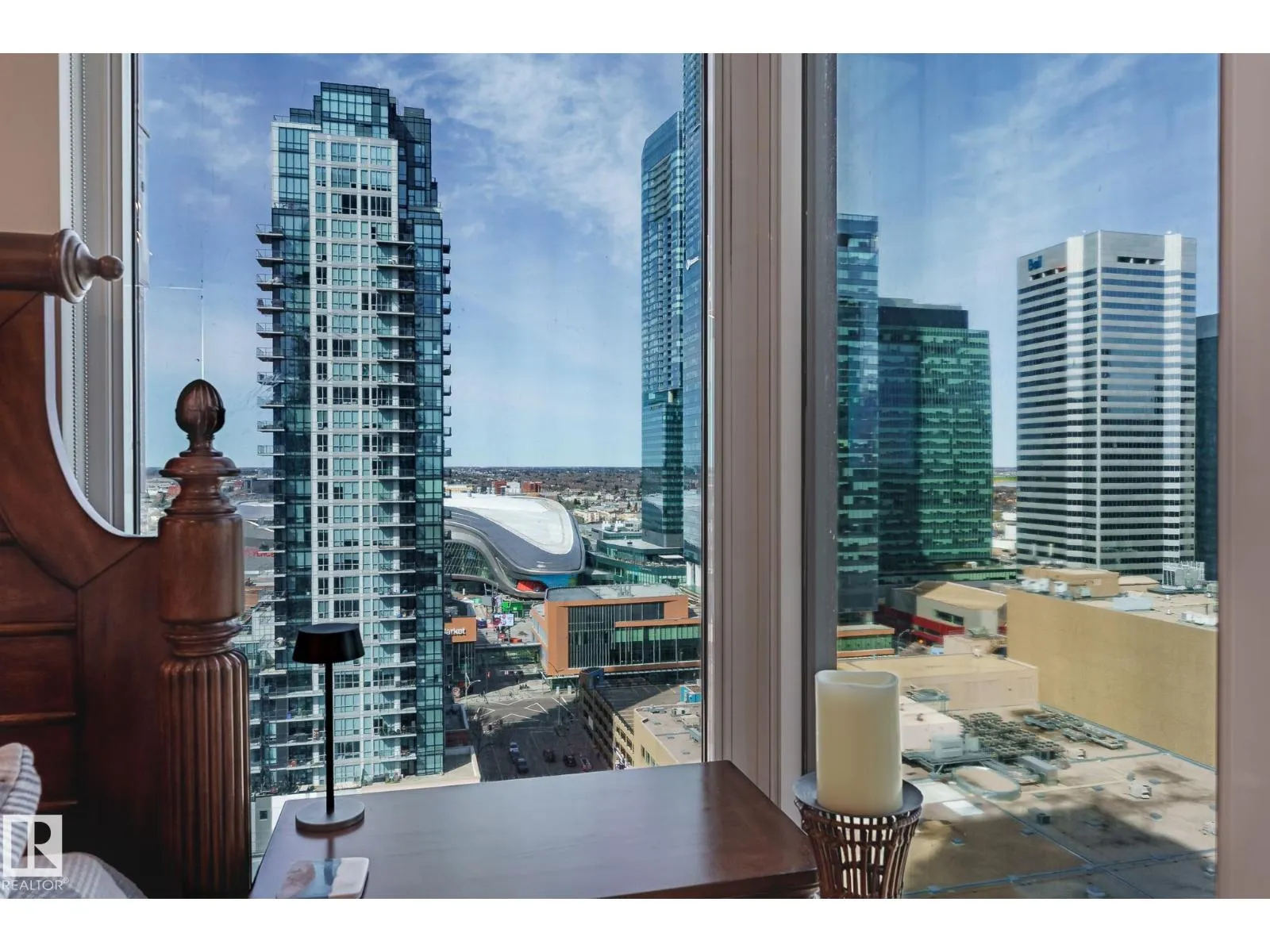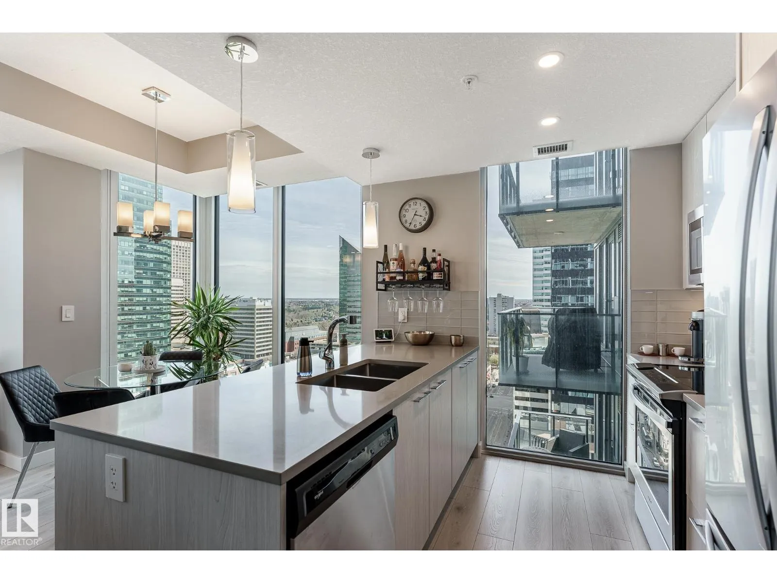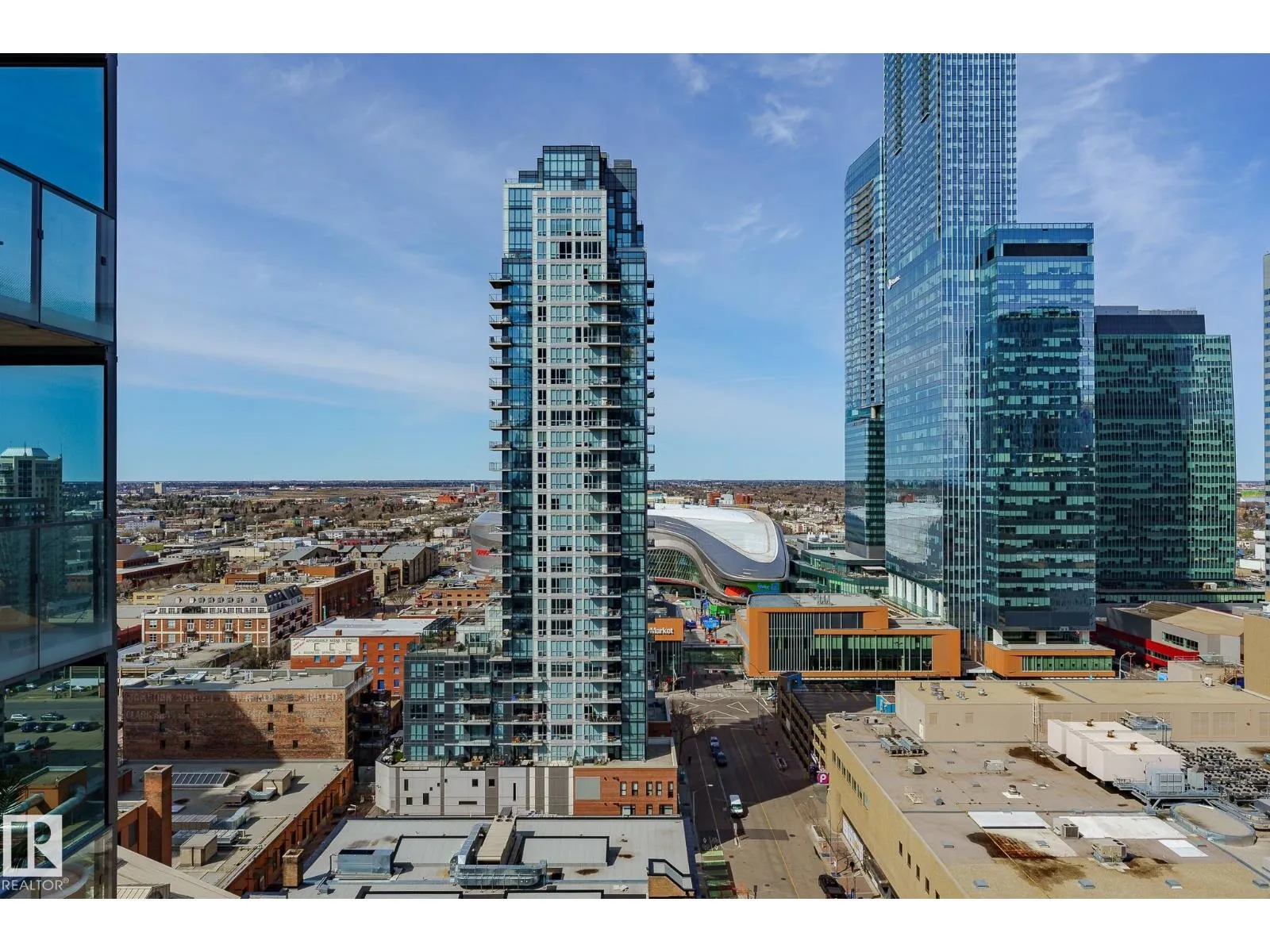 CUSTOM ONE OF A KIND UNIT IN THE WHOLE COMPLEX! Boasting the Square Footage of a Two Bedroom this One Bedroom / Two Bath unit has lower condo fees, great space is in mint condition. You get all the advantages of a larger unit with East, North, and South Views. Largest balcony!! Floor to ceiling windows offering unobstructed views of Rogers Place, Stantec Tower, and the River Valley. This unit features a modern light color pallet, designer kitchen with sit up bar, quartz counter tops throughout, built in appliances, spacious living room, dining area and window coverings! Encore Tower has a gorgeous 3 storey lobby w/full concierge service & an expansive amenity floor including a fitness facility & indoor/outdoor entertaining lounge. Located on the corner of 102 Ave & 103 Street, just steps from Rogers Arena, ICE District, restaurants, coffee shops. Title Parking Stall #220 is conveniently located on P2 next to the elevator (This is definitely a huge bonus). This is a Must See! (id:27476)