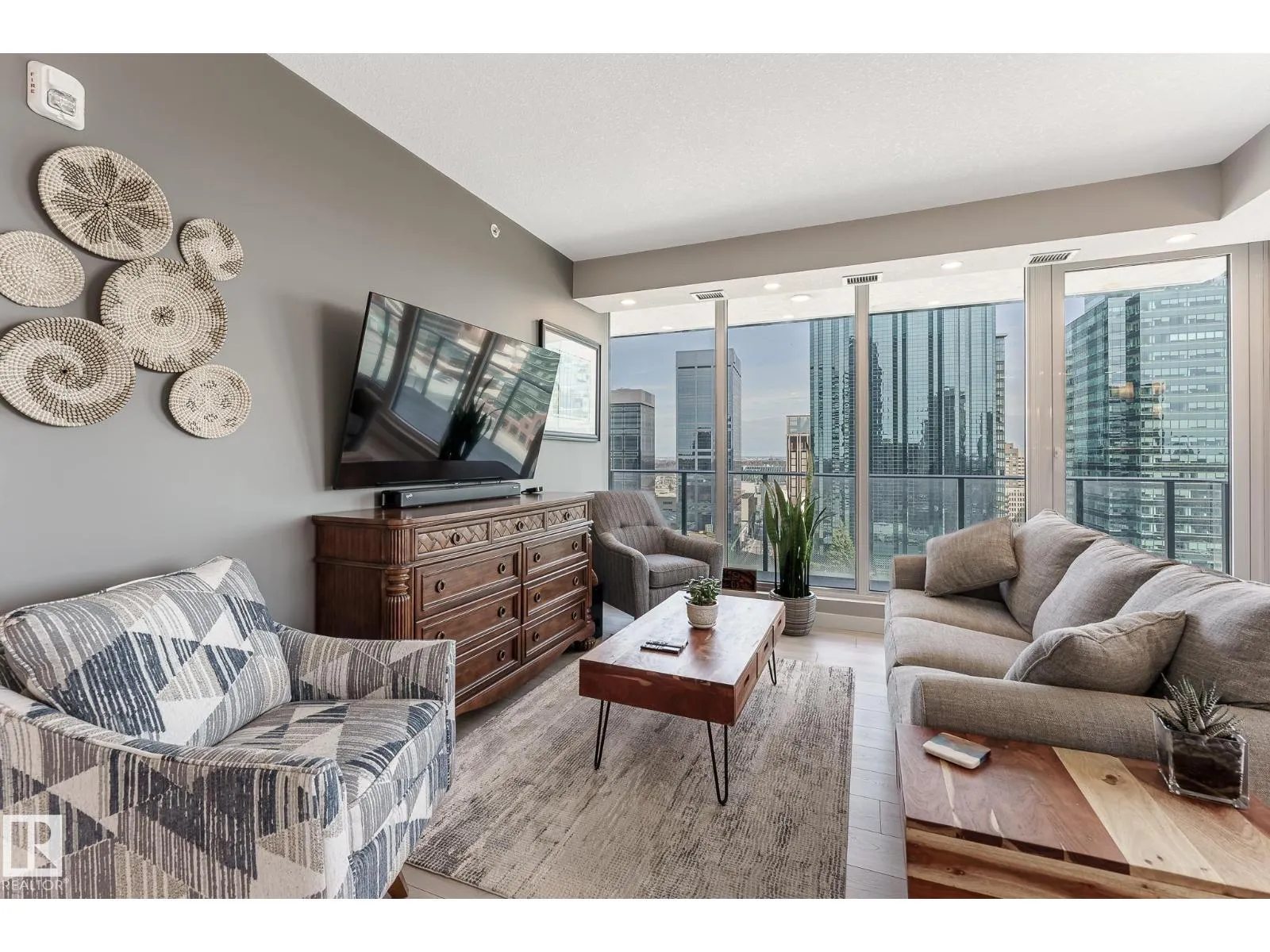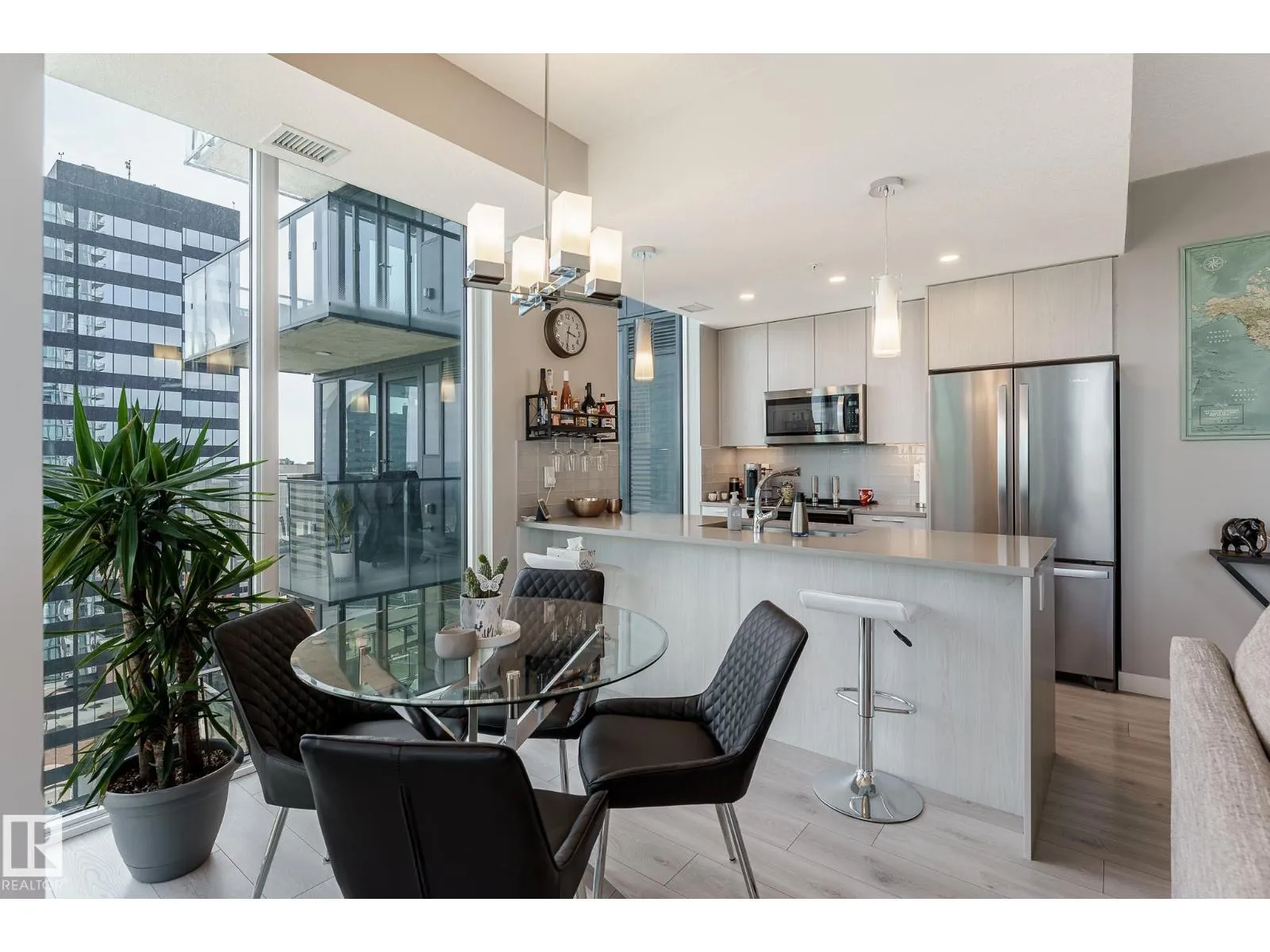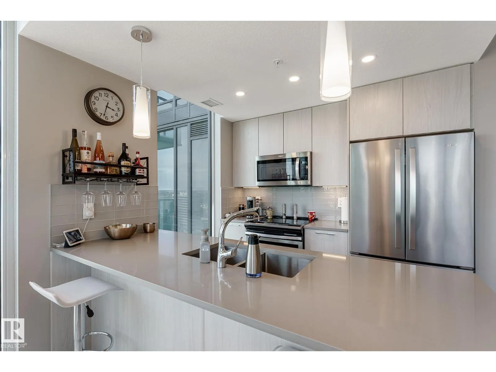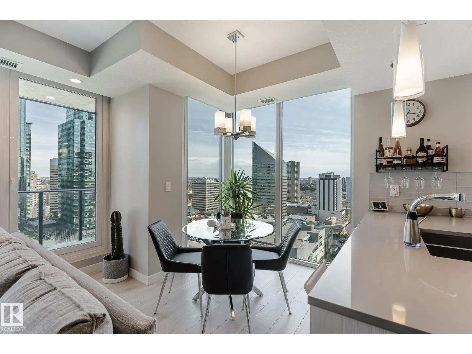 CUSTOM ONE OF A KIND UNIT IN THE WHOLE COMPLEX! Boasting the Square Footage of a Two Bedroom this One Bedroom / Two Bath unit has lower condo fees, great space is in mint condition. You get all the advantages of a larger unit with East, North, and South Views. Largest balcony!! Floor to ceiling windows offering unobstructed views of Rogers Place, Stantec Tower, and the River Valley. This unit features a modern light color pallet, designer kitchen with sit up bar, quartz counter tops throughout, built in appliances, spacious living room, dining area and window coverings! Encore Tower has a gorgeous 3 storey lobby w/full concierge service & an expansive amenity floor including a fitness facility & indoor/outdoor entertaining lounge. Located on the corner of 102 Ave & 103 Street, just steps from Rogers Arena, ICE District, restaurants, coffee shops. Title Parking Stall #220 is conveniently located on P2 next to the elevator (This is definitely a huge bonus). This is a Must See! (id:27476)