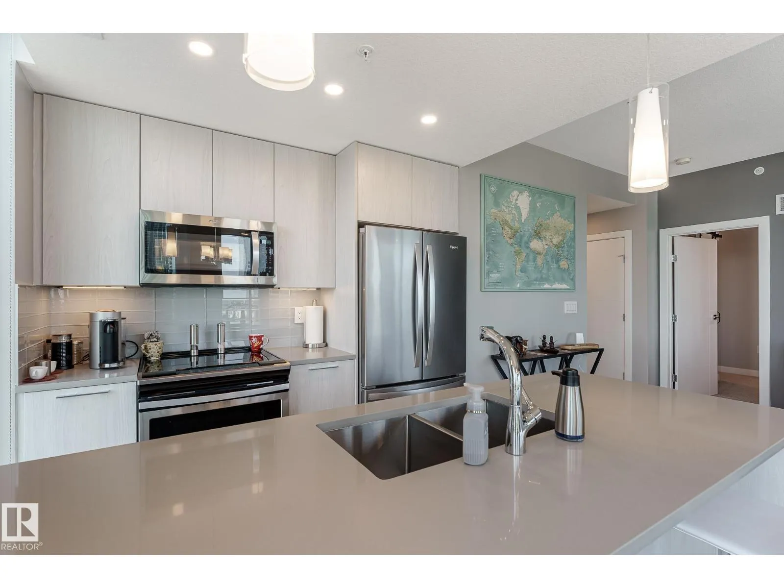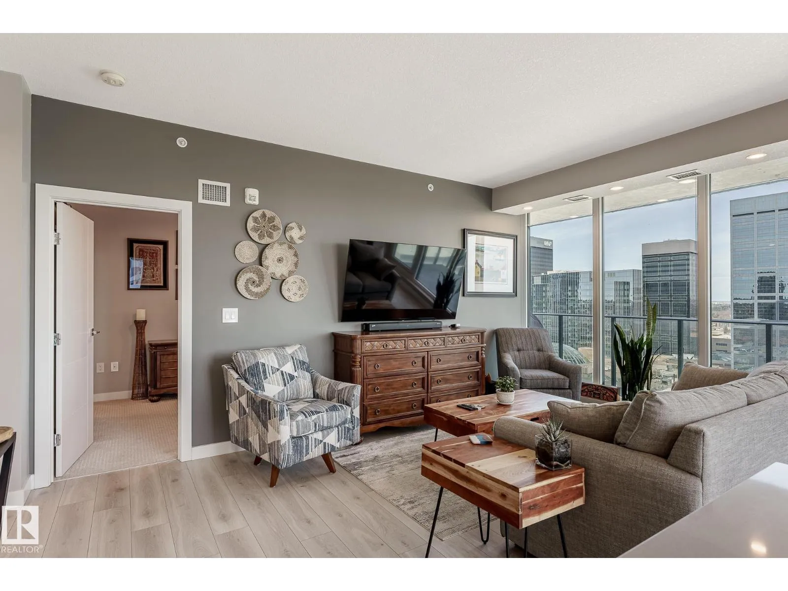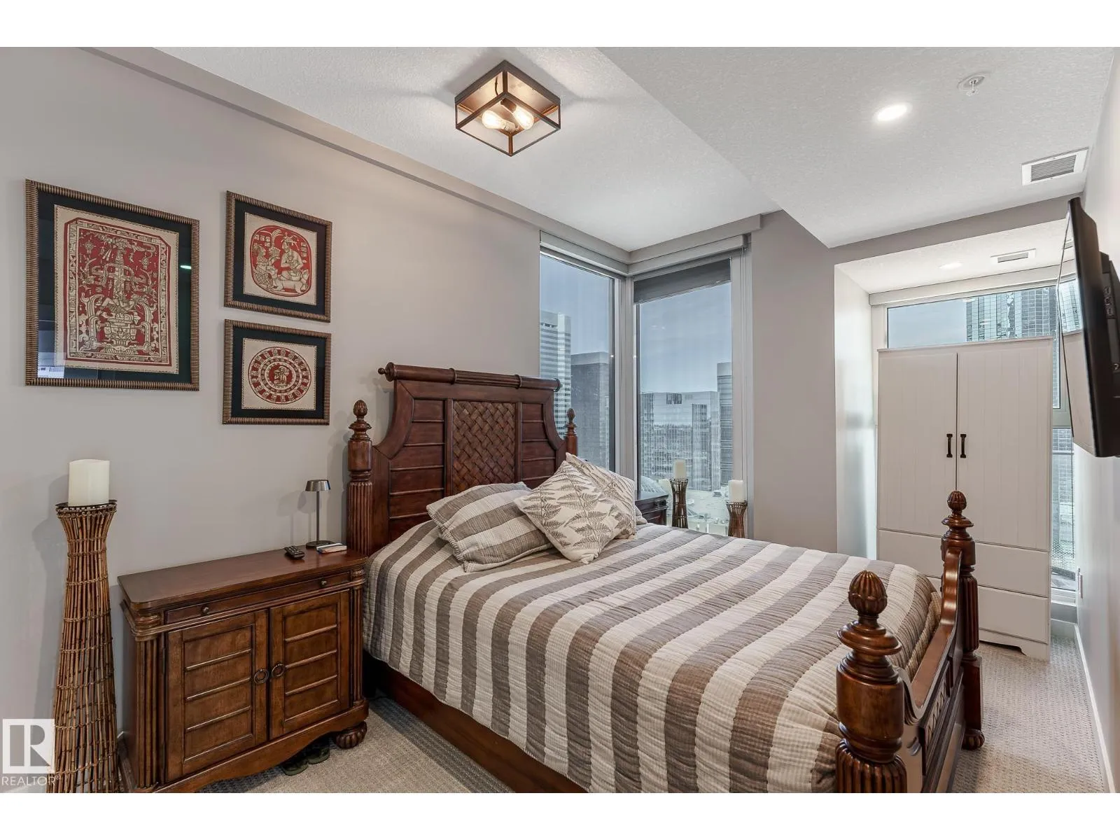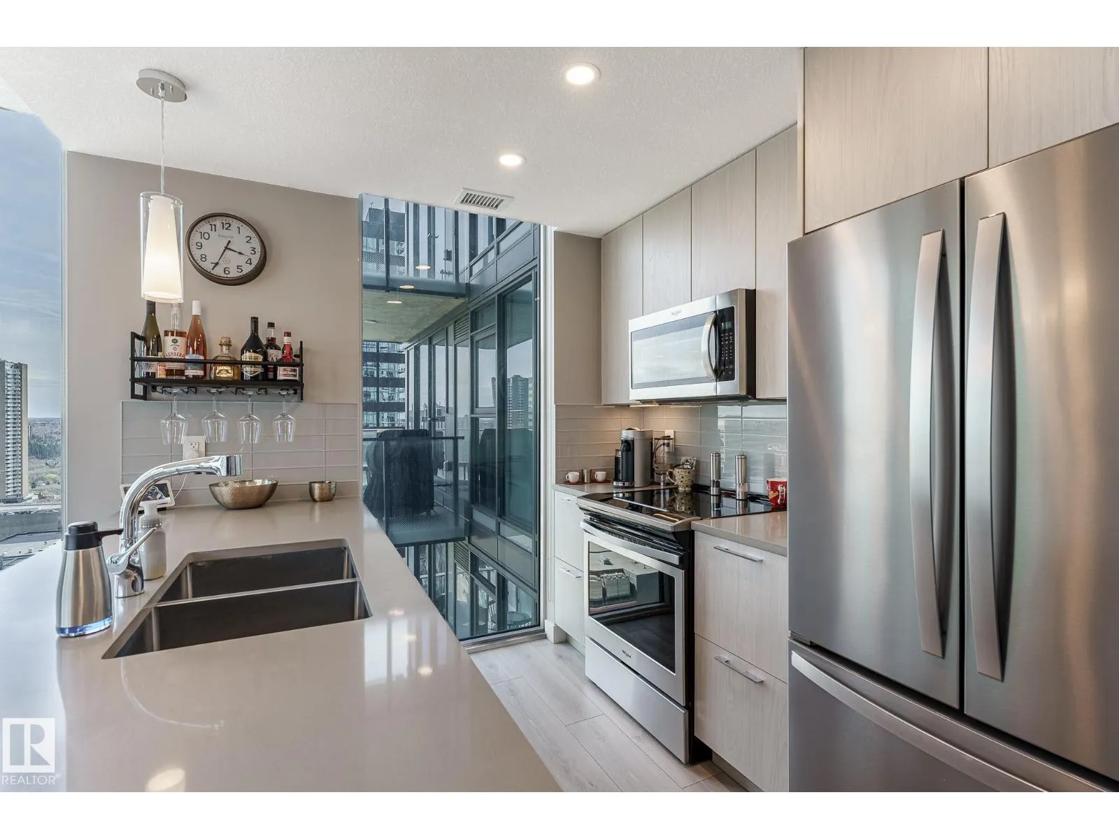 CUSTOM ONE OF A KIND UNIT IN THE WHOLE COMPLEX! Boasting the Square Footage of a Two Bedroom this One Bedroom / Two Bath unit has lower condo fees, great space is in mint condition. You get all the advantages of a larger unit with East, North, and South Views. Largest balcony!! Floor to ceiling windows offering unobstructed views of Rogers Place, Stantec Tower, and the River Valley. This unit features a modern light color pallet, designer kitchen with sit up bar, quartz counter tops throughout, built in appliances, spacious living room, dining area and window coverings! Encore Tower has a gorgeous 3 storey lobby w/full concierge service & an expansive amenity floor including a fitness facility & indoor/outdoor entertaining lounge. Located on the corner of 102 Ave & 103 Street, just steps from Rogers Arena, ICE District, restaurants, coffee shops. Title Parking Stall #220 is conveniently located on P2 next to the elevator (This is definitely a huge bonus). This is a Must See! (id:27476)