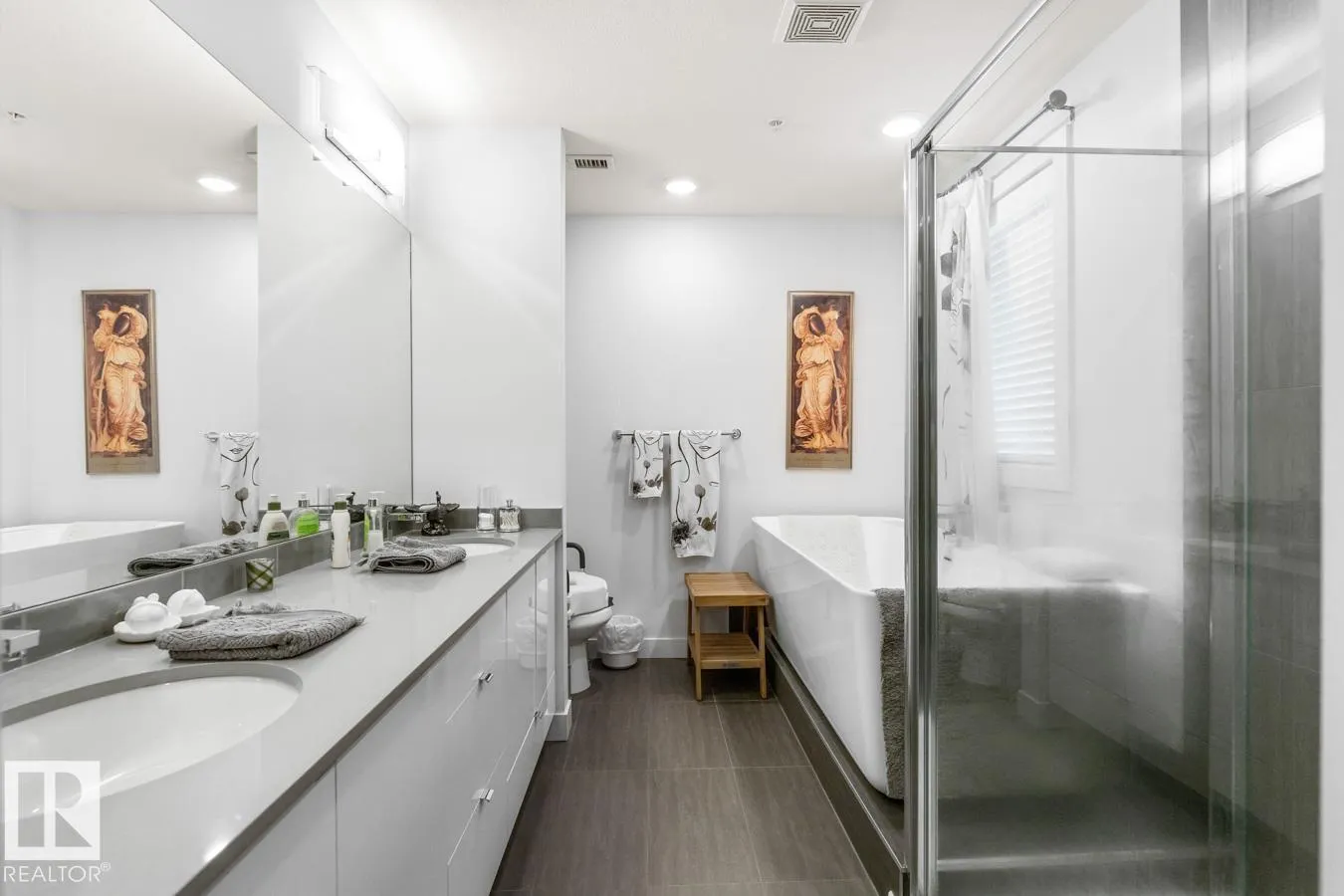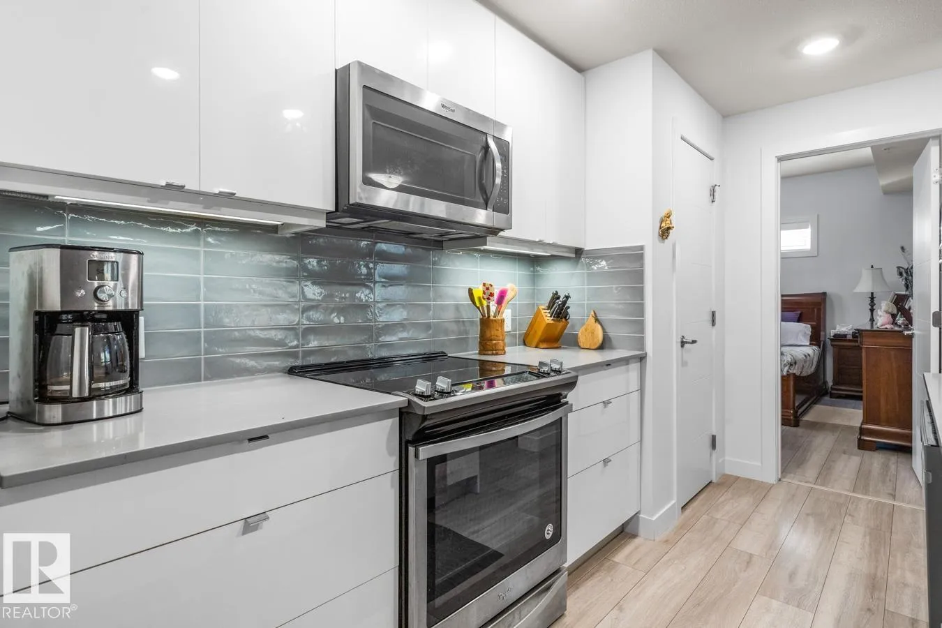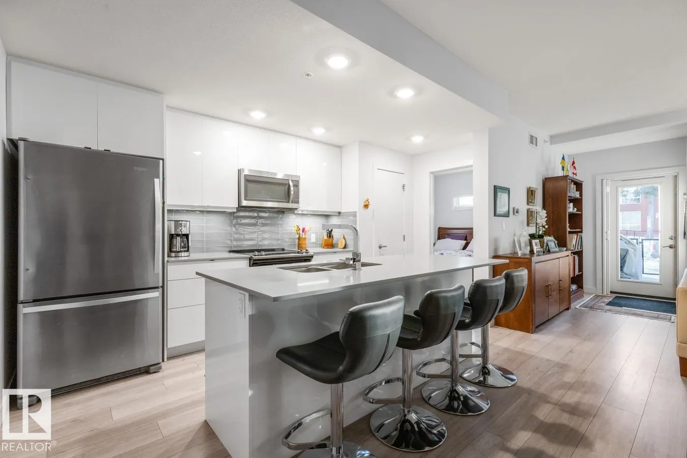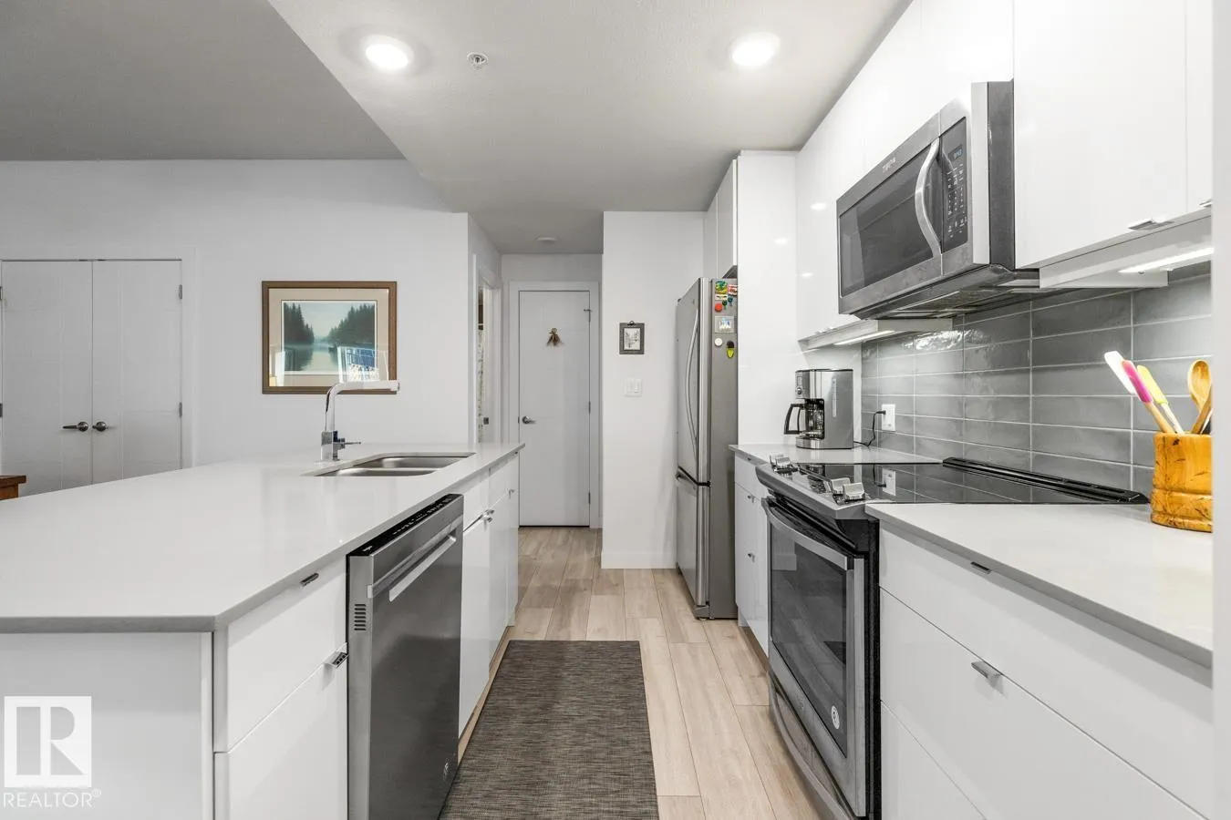 Welcome to this bright and beautifully finished 2 bed, 2 bath corner unit condo in the heart of Bonnie Doon. Youâll love the open-concept layout, designed for both everyday comfort and effortless entertaining. The kitchen features quartz countertops, a large island, glass tile backsplash, and stainless steel appliances. The spacious living & dining area all bathed in natural light from generous windows, opens to a large patio, perfect for relaxing mornings and summer evenings. The primary suite offers a walk-through closet and spa-like 5-piece ensuite with dual vanity and a relaxing standalone soaker tub. A second bedroom and full 4-piece bath offer flexibility for guests or a home office. Thoughtful touches include in-suite laundry with extra storage, A/C, heated underground parking with storage cage, and a location thatâs truly walkableâclose to parks, transit, cafés, and restaurants. All this in a well-built concrete building on a beautiful tree-lined street. (id:27476)