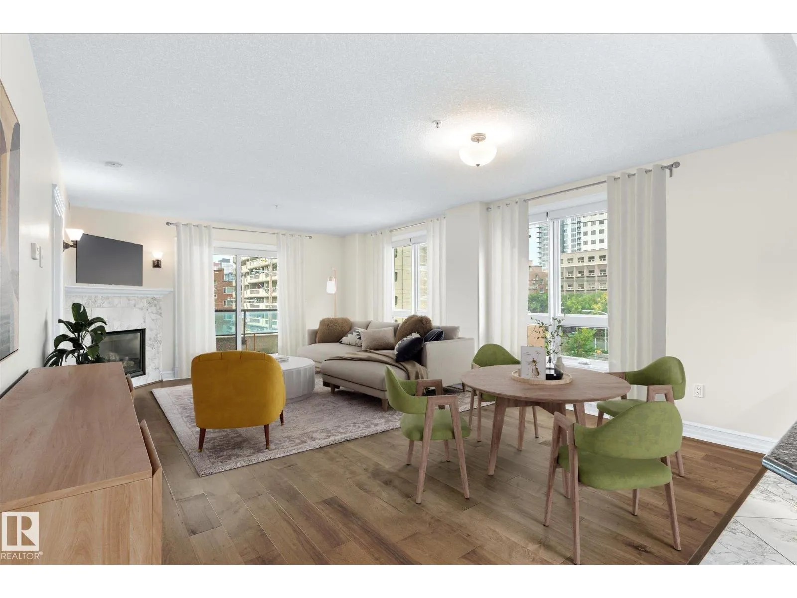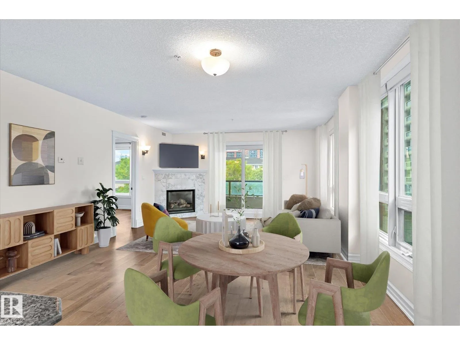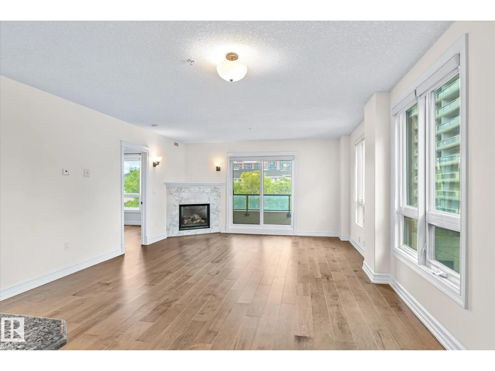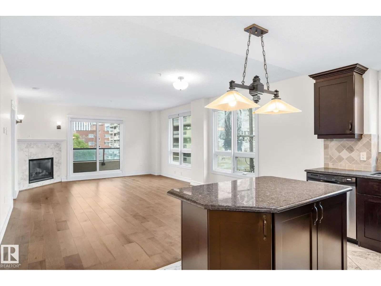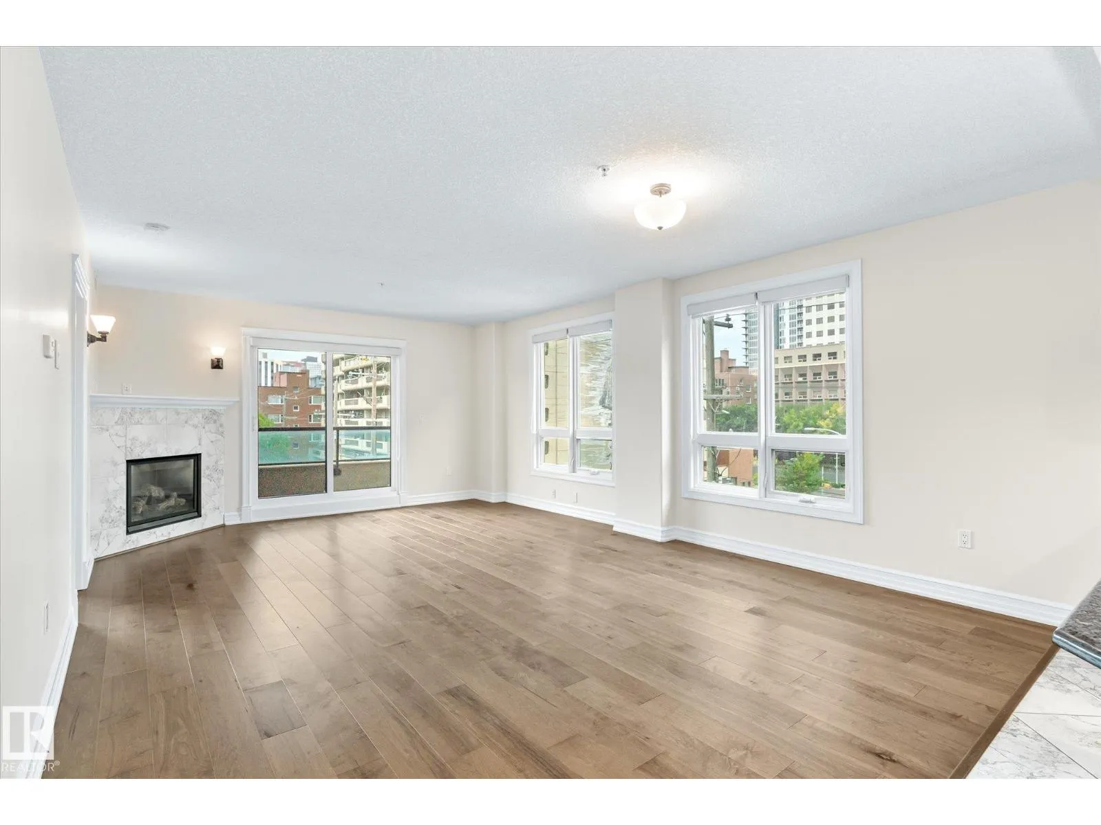 Experience refined urban living in this 3rd floor CORNER UNIT at the spectacular MERIDIAN PLAZA. Designed for entertaining, the open-concept layout showcases hardwood floors, 9' ceilings, a cozy gas fireplace, and an elegant living and dining area bathed in NATURAL LIGHT from south-facing windows & patio doors to the balcony. The well-appointed kitchen features granite countertops, stainless steel appliances, and a stylish breakfast bar. The primary suite offers a spa-inspired 5pc ensuite with dual vanities, soaker tub, glass shower, and a spacious walk-in closet. A second generous bedroom and full bath are privately situated on the opposite side of the suite. Additional highlights include in-suite laundry with storage, TITLED UNDERGOUND PARKING, and access to PREMIUM AMENITIES: a Mediterranean-style atrium, fitness centre, owners' lounge, event space with a full kitchen, & bike storage. Just one block to Jasper Ave and steps from restaurants, trails, shopping conveniences, & the Ice District. (id:27476)