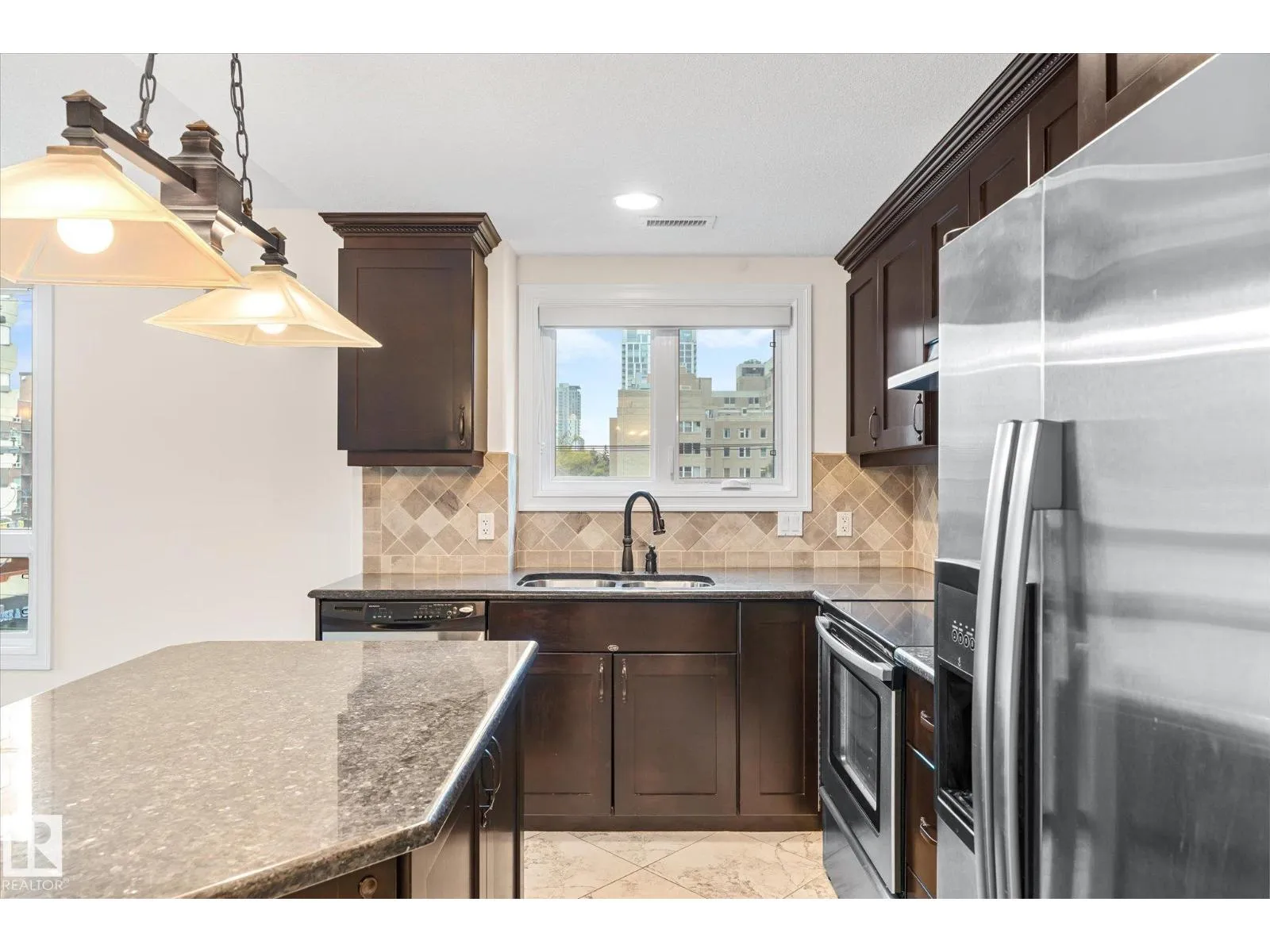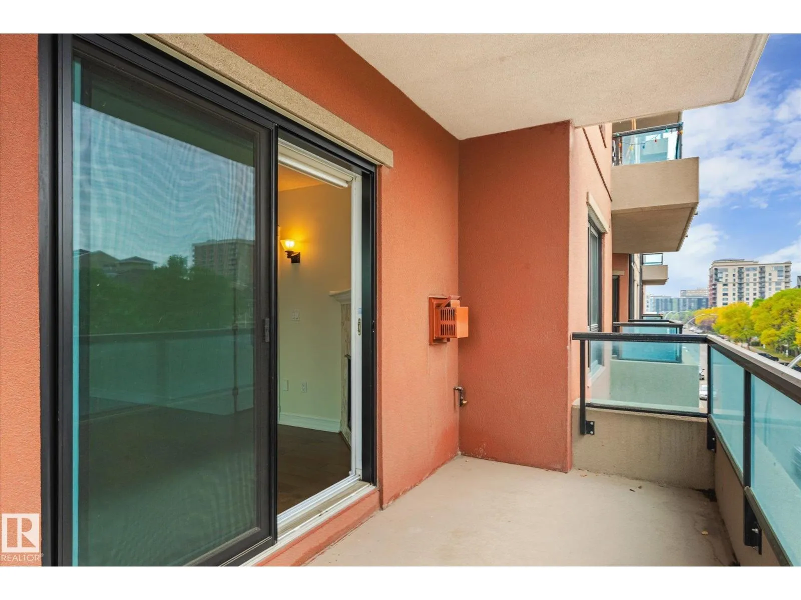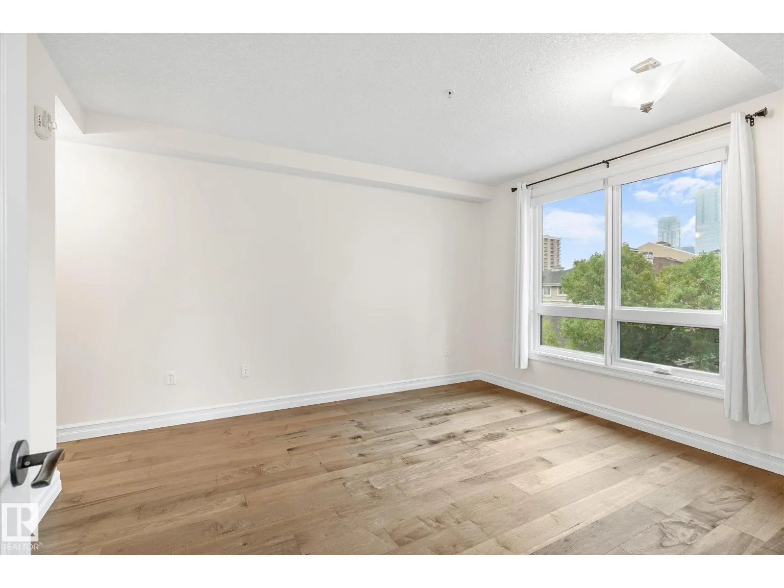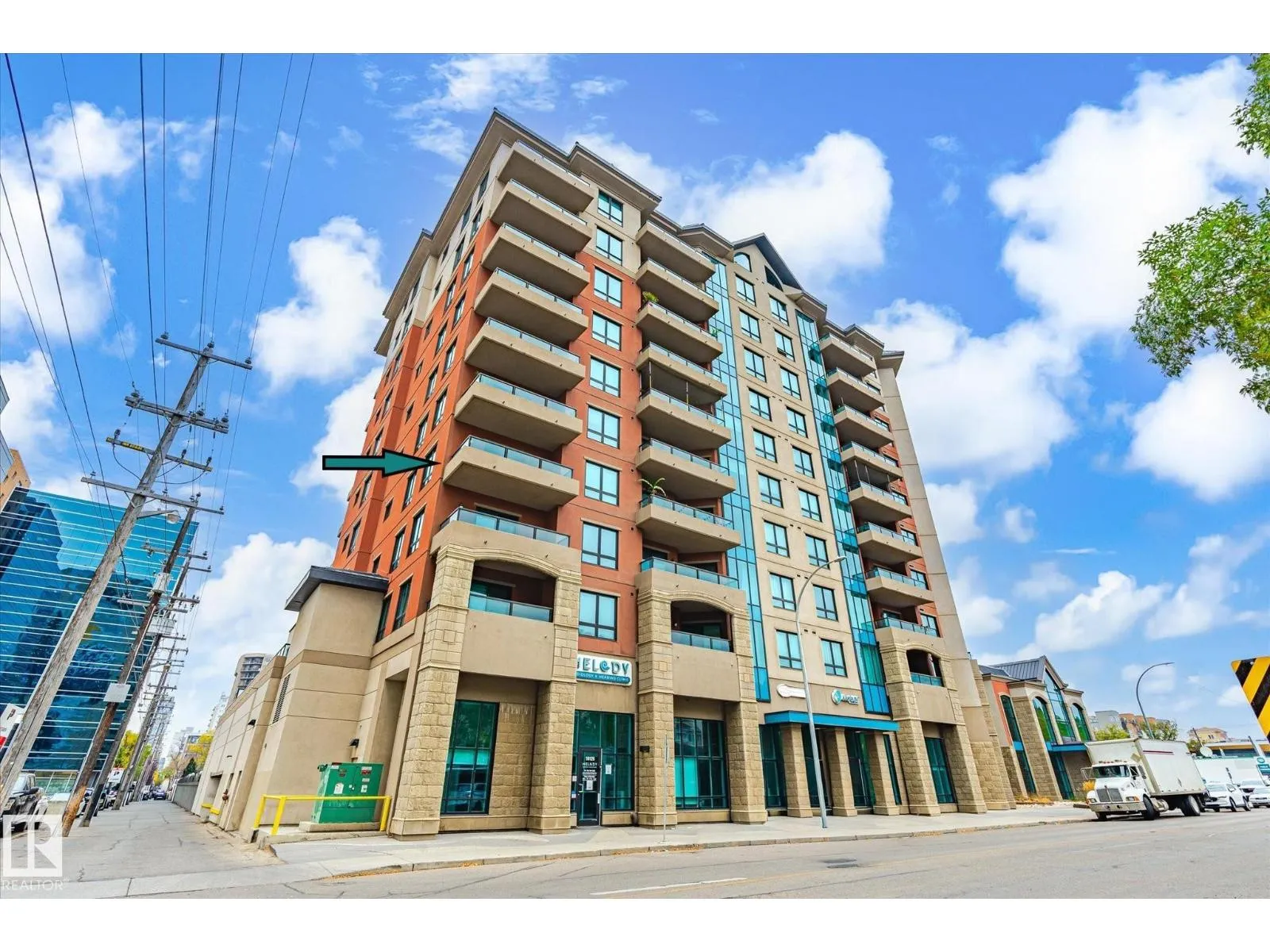 Experience refined urban living in this 3rd floor CORNER UNIT at the spectacular MERIDIAN PLAZA. Designed for entertaining, the open-concept layout showcases hardwood floors, 9' ceilings, a cozy gas fireplace, and an elegant living and dining area bathed in NATURAL LIGHT from south-facing windows & patio doors to the balcony. The well-appointed kitchen features granite countertops, stainless steel appliances, and a stylish breakfast bar. The primary suite offers a spa-inspired 5pc ensuite with dual vanities, soaker tub, glass shower, and a spacious walk-in closet. A second generous bedroom and full bath are privately situated on the opposite side of the suite. Additional highlights include in-suite laundry with storage, TITLED UNDERGOUND PARKING, and access to PREMIUM AMENITIES: a Mediterranean-style atrium, fitness centre, owners' lounge, event space with a full kitchen, & bike storage. Just one block to Jasper Ave and steps from restaurants, trails, shopping conveniences, & the Ice District. (id:27476)