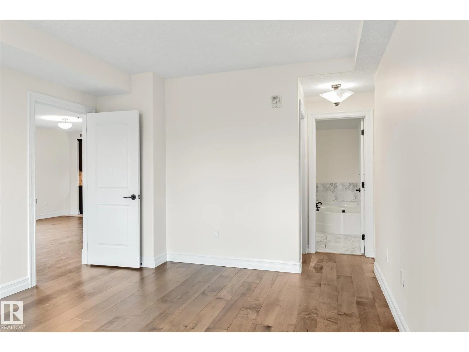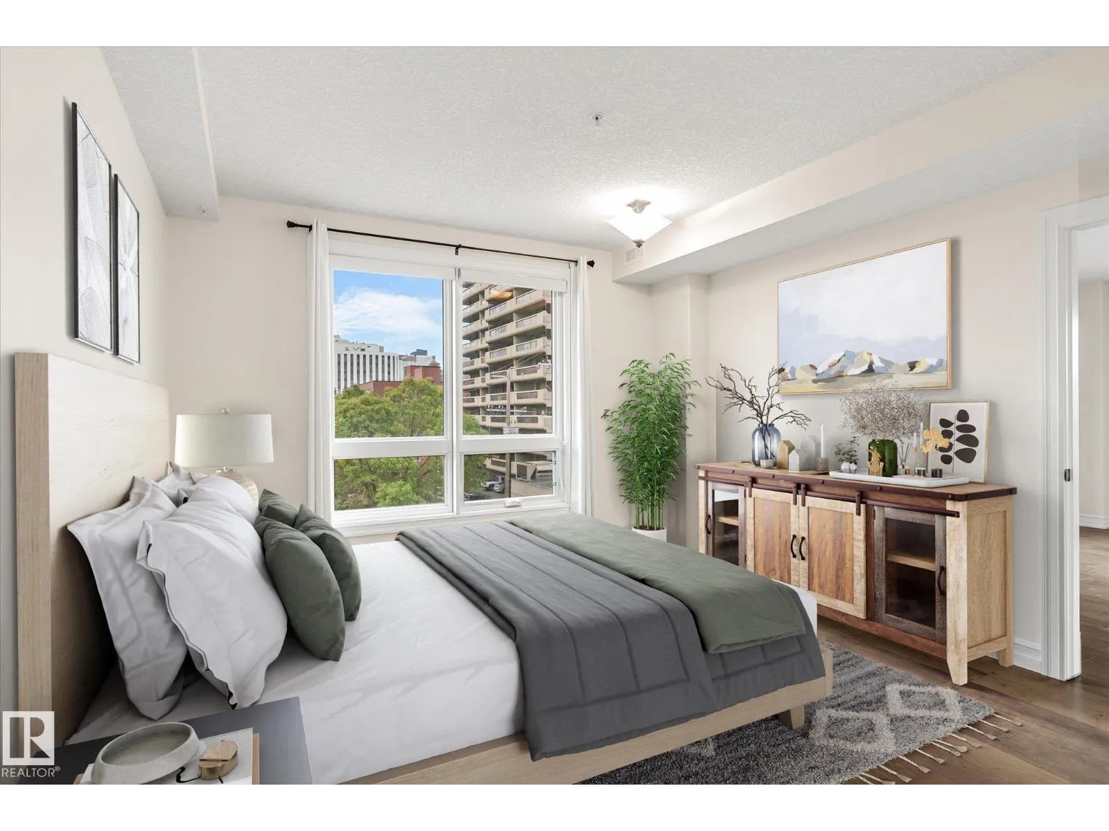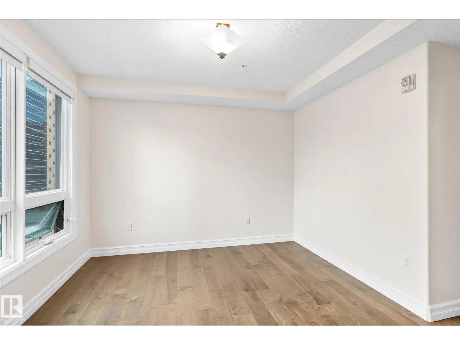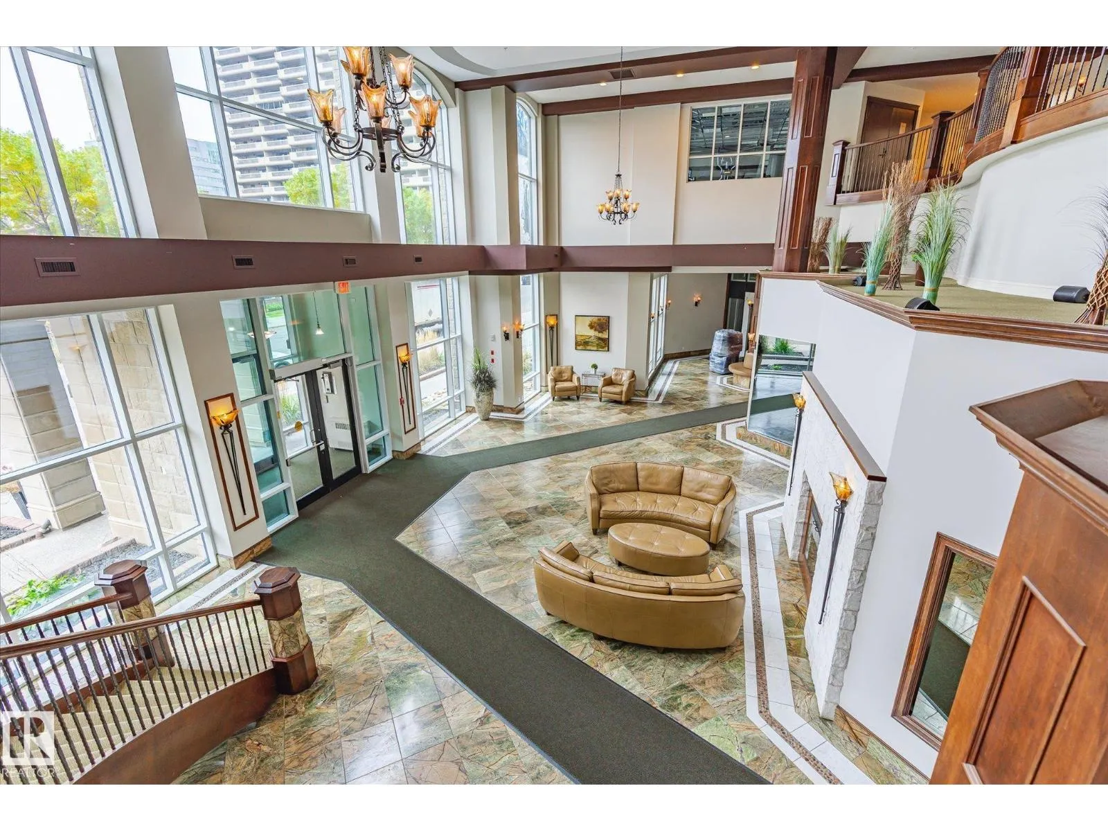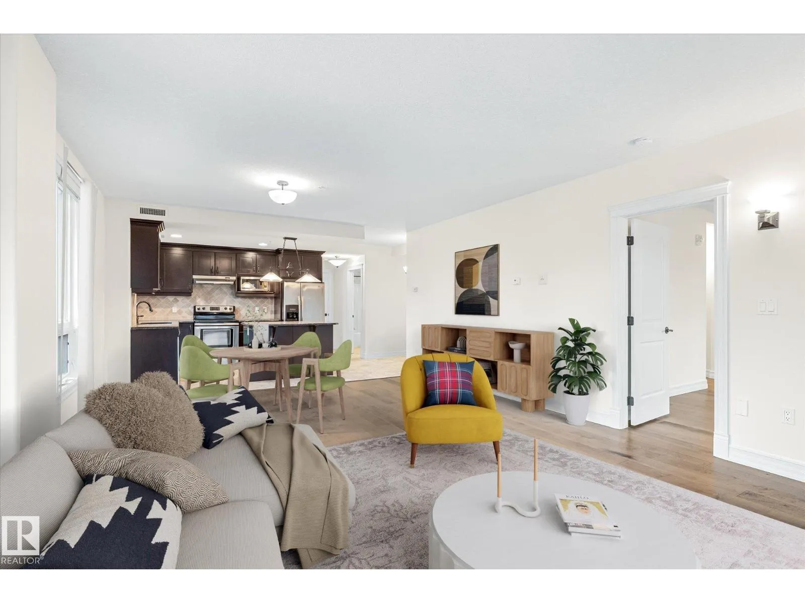 Experience refined urban living in this 3rd floor CORNER UNIT at the spectacular MERIDIAN PLAZA. Designed for entertaining, the open-concept layout showcases hardwood floors, 9' ceilings, a cozy gas fireplace, and an elegant living and dining area bathed in NATURAL LIGHT from south-facing windows & patio doors to the balcony. The well-appointed kitchen features granite countertops, stainless steel appliances, and a stylish breakfast bar. The primary suite offers a spa-inspired 5pc ensuite with dual vanities, soaker tub, glass shower, and a spacious walk-in closet. A second generous bedroom and full bath are privately situated on the opposite side of the suite. Additional highlights include in-suite laundry with storage, TITLED UNDERGOUND PARKING, and access to PREMIUM AMENITIES: a Mediterranean-style atrium, fitness centre, owners' lounge, event space with a full kitchen, & bike storage. Just one block to Jasper Ave and steps from restaurants, trails, shopping conveniences, & the Ice District. (id:27476)