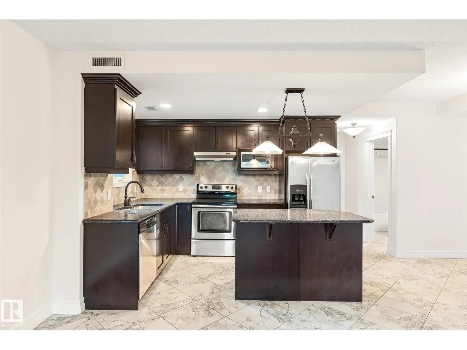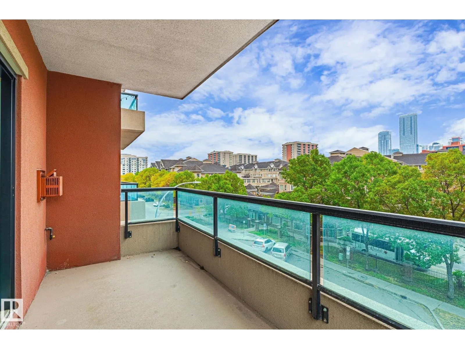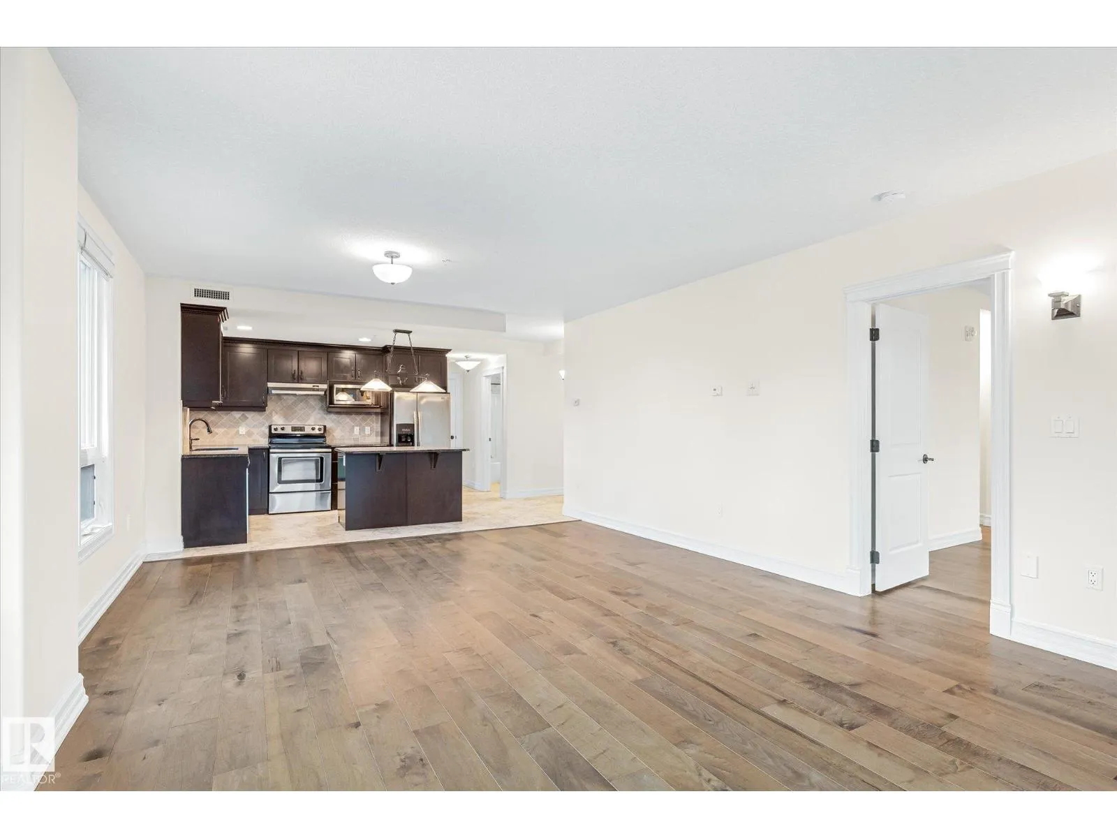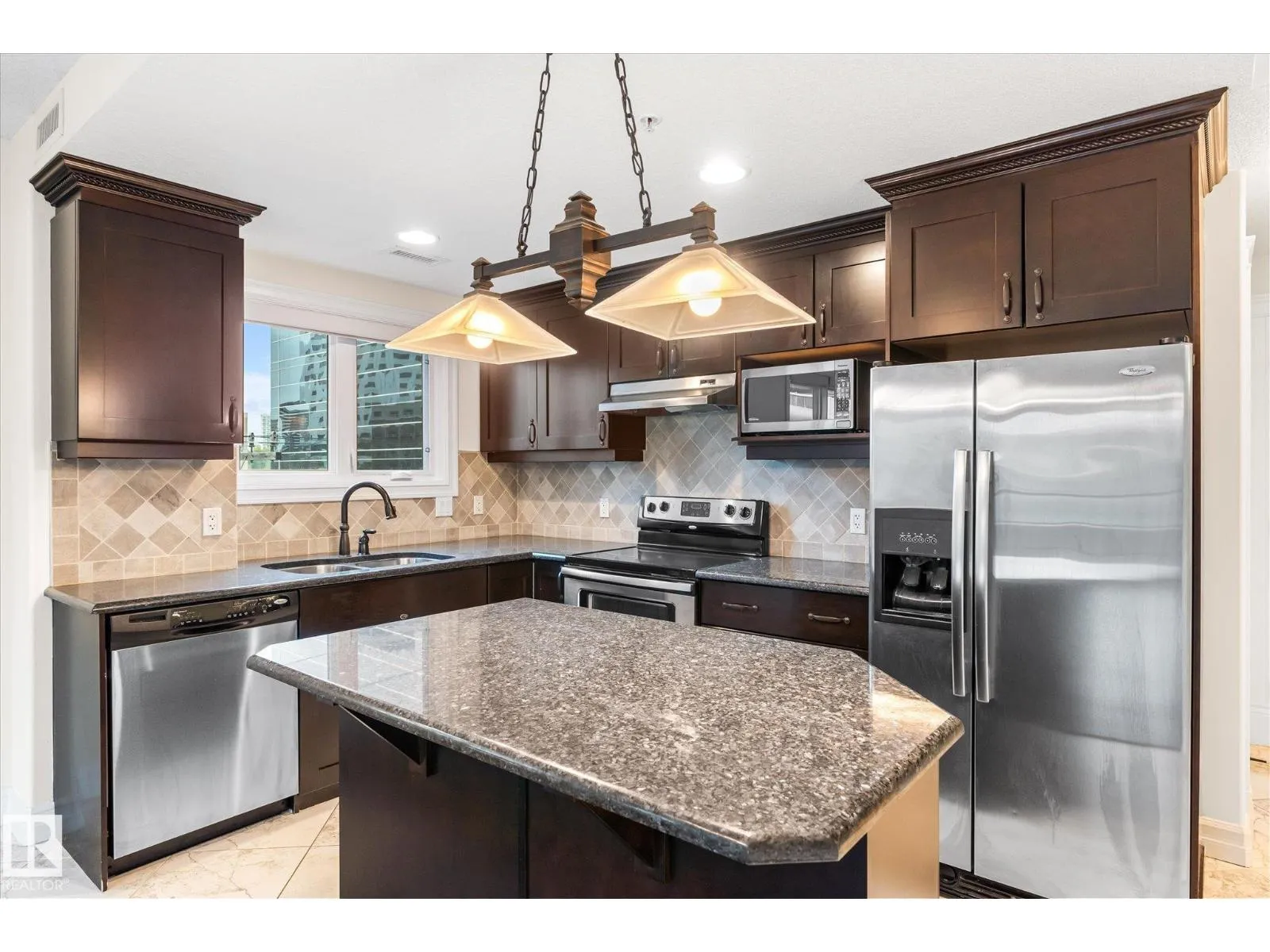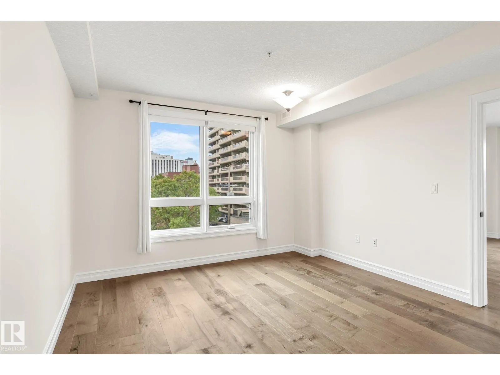 Experience refined urban living in this 3rd floor CORNER UNIT at the spectacular MERIDIAN PLAZA. Designed for entertaining, the open-concept layout showcases hardwood floors, 9' ceilings, a cozy gas fireplace, and an elegant living and dining area bathed in NATURAL LIGHT from south-facing windows & patio doors to the balcony. The well-appointed kitchen features granite countertops, stainless steel appliances, and a stylish breakfast bar. The primary suite offers a spa-inspired 5pc ensuite with dual vanities, soaker tub, glass shower, and a spacious walk-in closet. A second generous bedroom and full bath are privately situated on the opposite side of the suite. Additional highlights include in-suite laundry with storage, TITLED UNDERGOUND PARKING, and access to PREMIUM AMENITIES: a Mediterranean-style atrium, fitness centre, owners' lounge, event space with a full kitchen, & bike storage. Just one block to Jasper Ave and steps from restaurants, trails, shopping conveniences, & the Ice District. (id:27476)