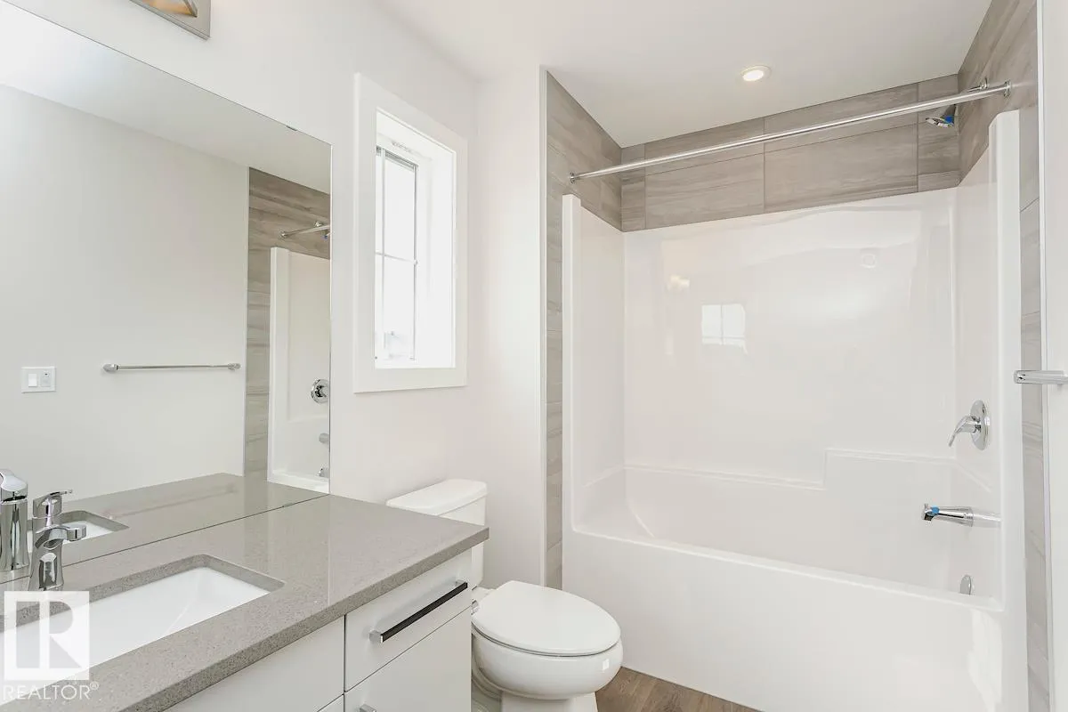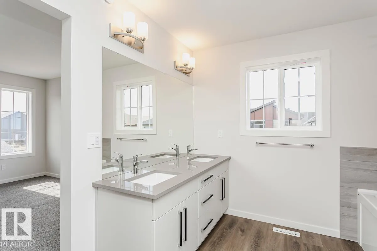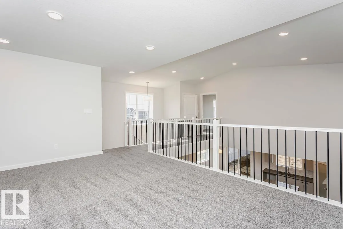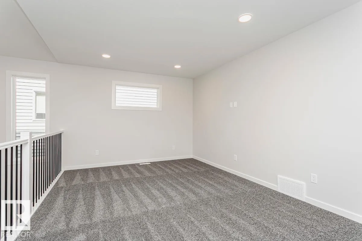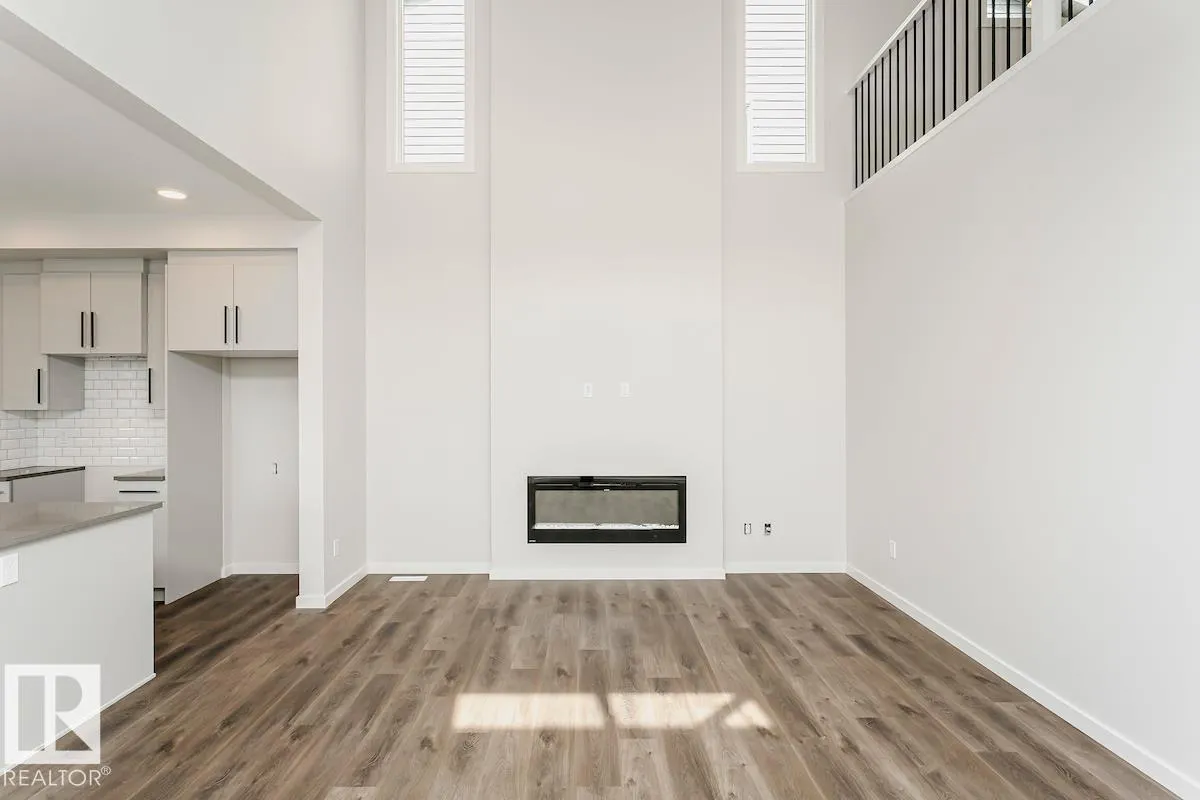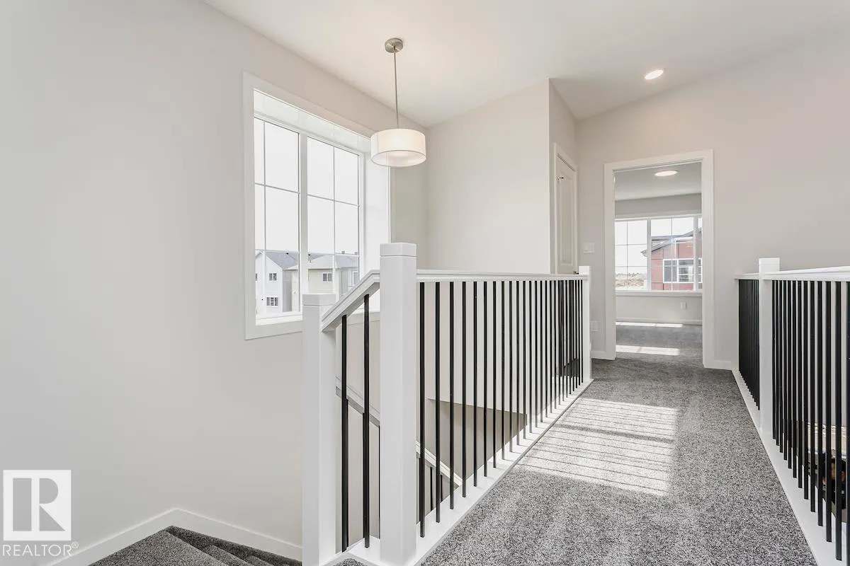 -Corner lot with abundant natural light, enhanced by extensive side windows and exterior detailing. -Extra two feet of width in both the home and garage for added comfort -Side entrance with direct basement access. -9â basement walls with two windows and 3-piece bathroom rough-in for future development. -Open-to-below design with bright, open-concept living spaces and a vaulted ceiling. -Electric Fire & Ice linear fireplace with timer and color controls, flanked by windows for added light. -Main floor mudroom with walk-in closet, built-in bench, shelving, and hooks. -Dedicated main floor office / flex room. -L-shaped kitchen with large island, walk-through corner pantry, ceiling-height cabinetry, and chimney-style hood fan. -Quartz countertops with undermount sinks throughout. -Convenient second-floor laundry. -Spacious primary bedroom with a 5-piece ensuite featuring dual vanities, tiled shower, tub, and private toilet. -High-efficiency furnace, hot water tank, and HRV system. (id:27476)