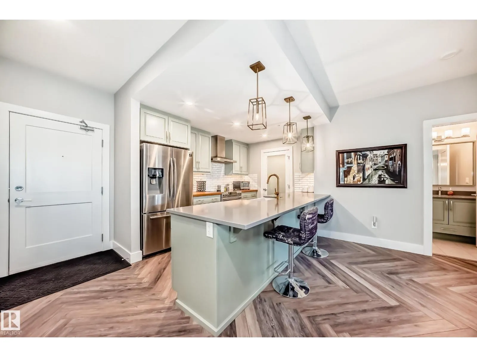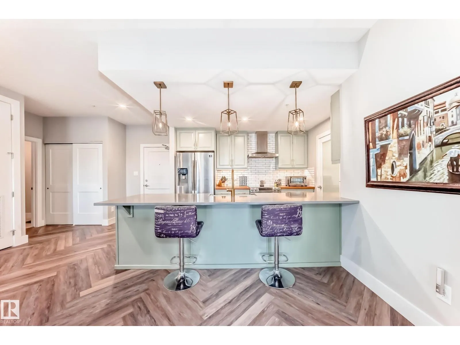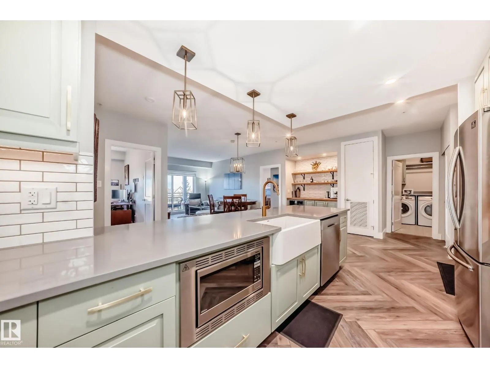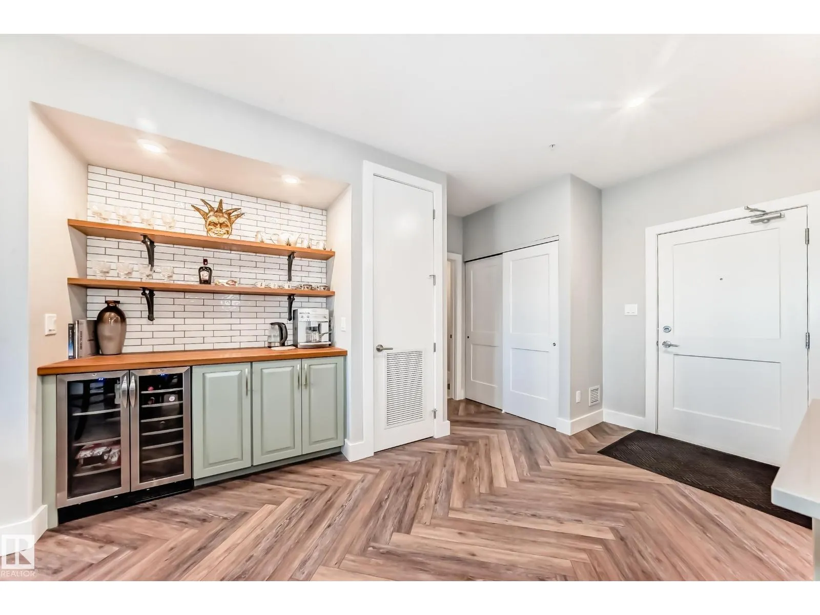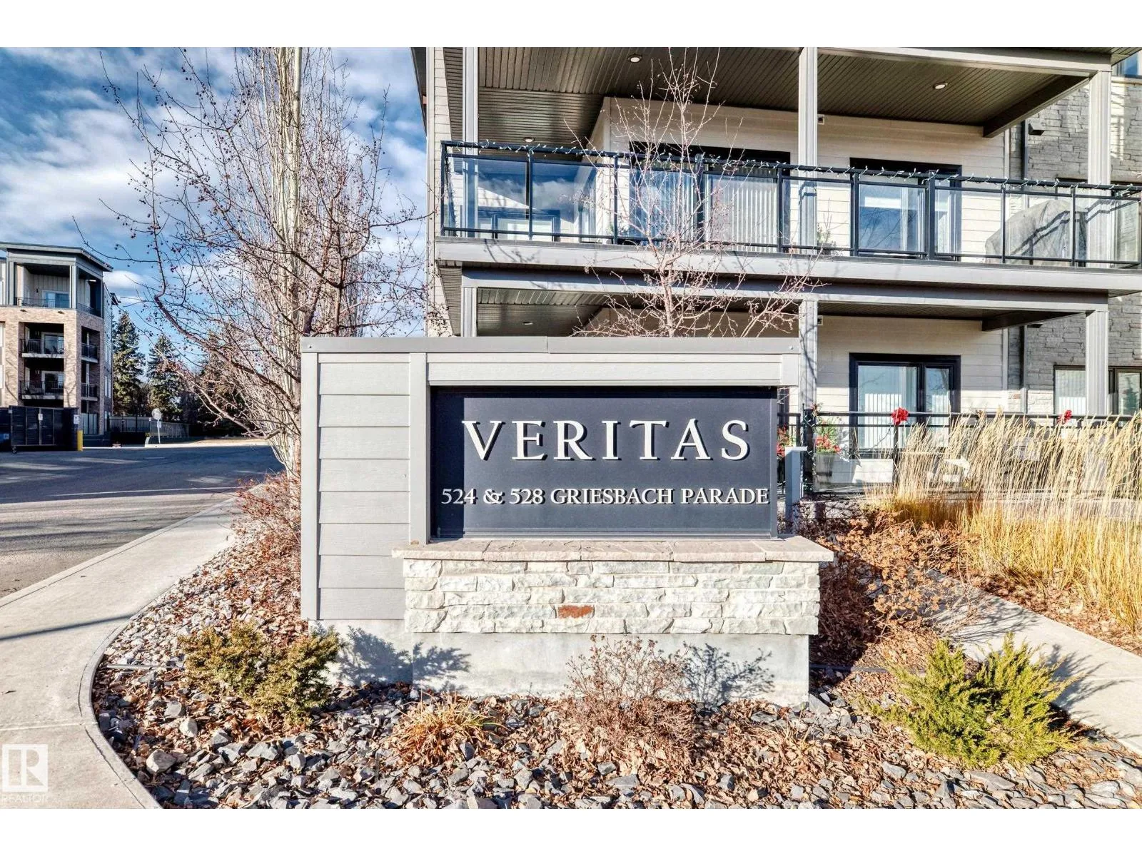 Beautiful Griesbach executive style 1,130 square foot, 2 bedroom, 2 bathroom, 2018 built, 3rd floor condo, in and incredible location backing onto greenspace and lake. The main floor has vinyl plank flooring, separate wet bar with mini fridge, and a great open floor plan with eat up island style kitchen having 2 tone cabinets, quartz countertops, upgraded stainless appliances, walk in pantry & sliding doors to a large balcony. The spacious primary bedroom has walk-through closets, and a 4 piece bathroom. The second bedroom is located close to the main 4 piece bathroom. There are 2 titled parking stalls included underground #98 and surface stall #11. The area has many amenities just minutes away, including shopping, transportation, schools, walking trails, and much more. The Veritas condominium complex has a beautiful front entrance and many extras including, fitness room, air conditioning, guest room, social room, & visitor parking out front. This unit shows pride of ownership and shows a 10 out of 10 (id:27476)