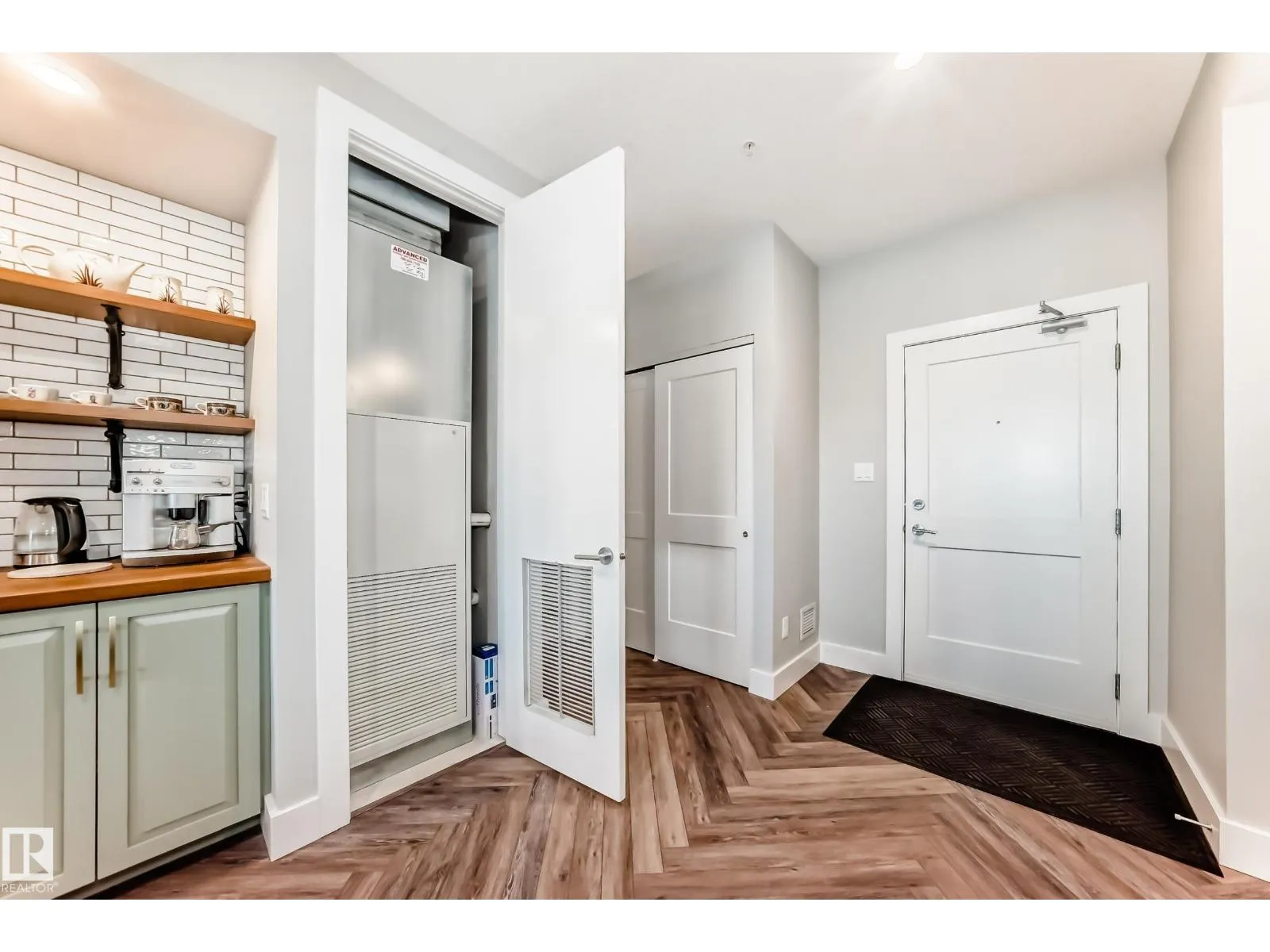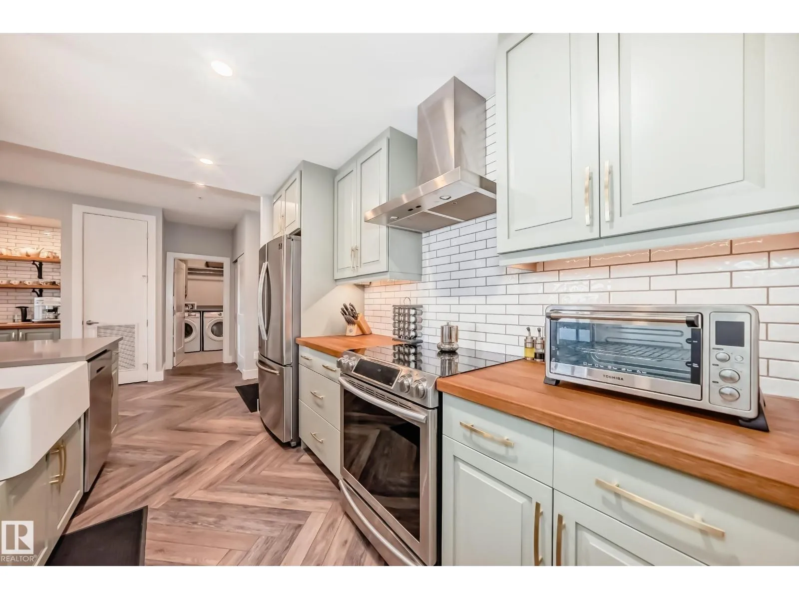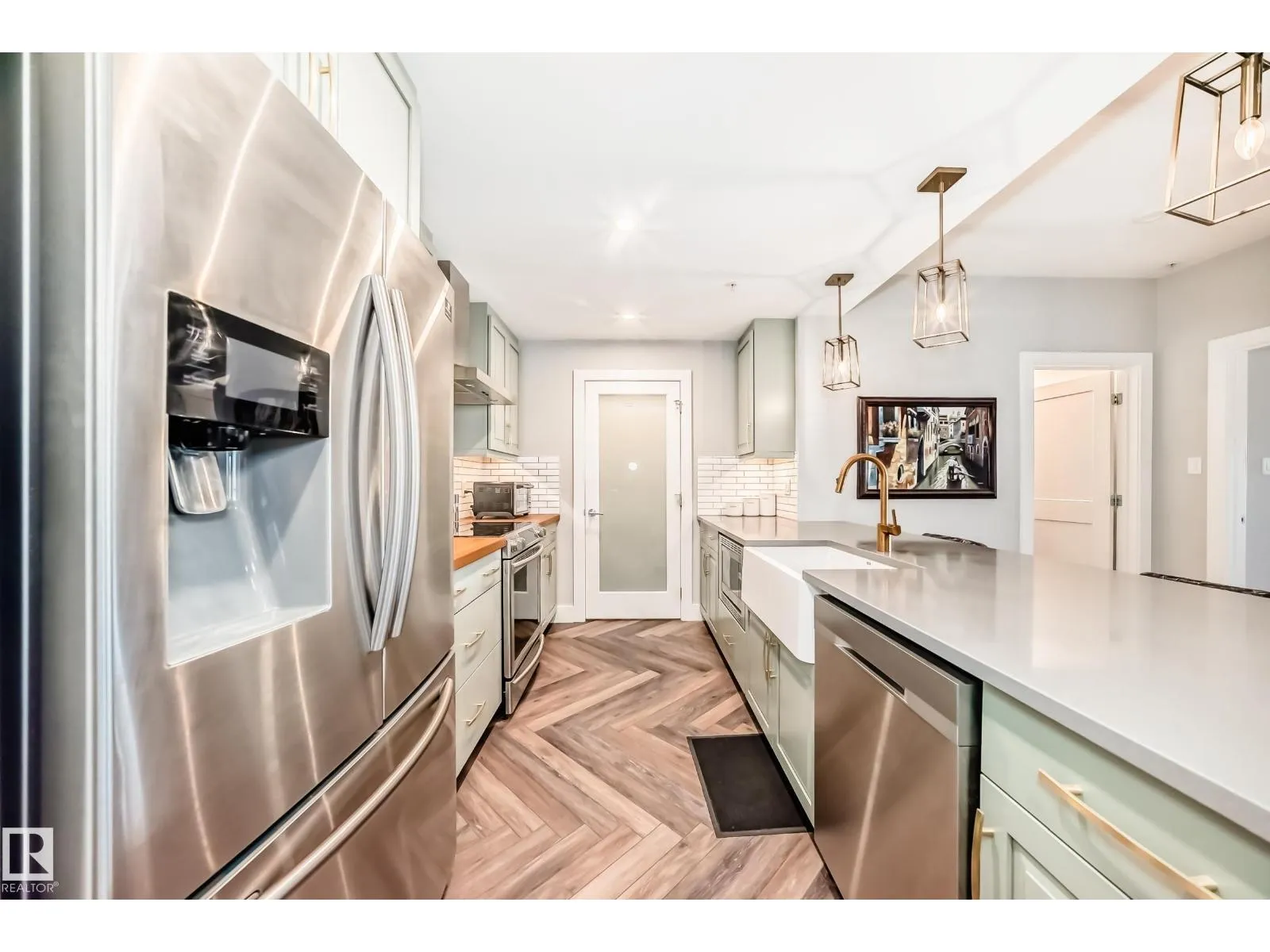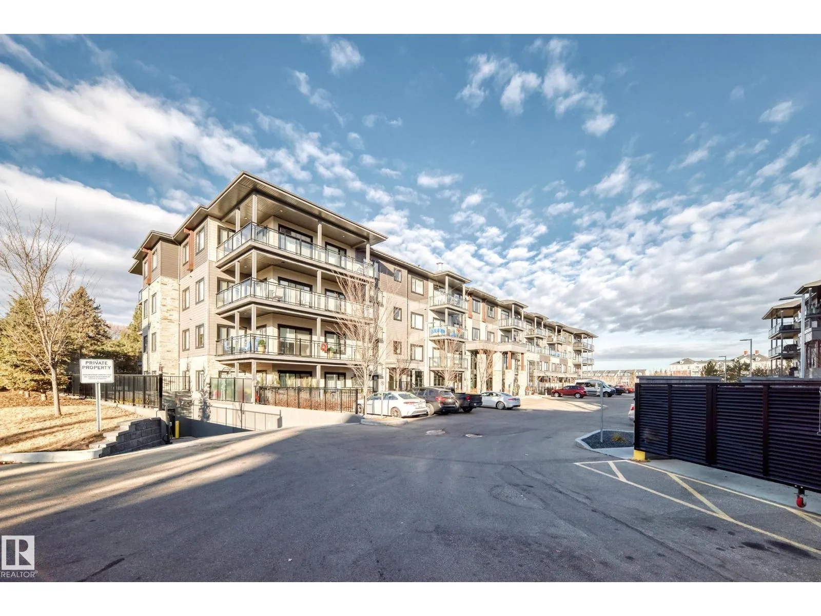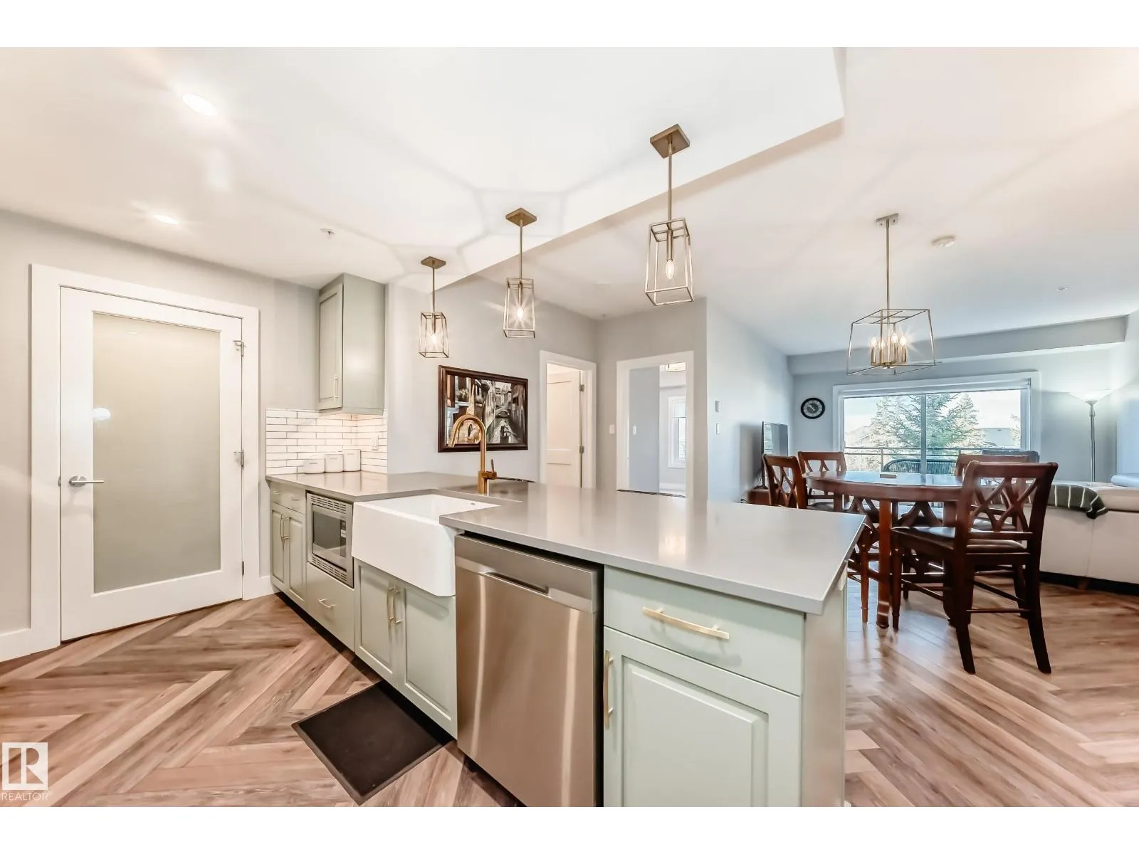 Beautiful Griesbach executive style 1,130 square foot, 2 bedroom, 2 bathroom, 2018 built, 3rd floor condo, in and incredible location backing onto greenspace and lake. The main floor has vinyl plank flooring, separate wet bar with mini fridge, and a great open floor plan with eat up island style kitchen having 2 tone cabinets, quartz countertops, upgraded stainless appliances, walk in pantry & sliding doors to a large balcony. The spacious primary bedroom has walk-through closets, and a 4 piece bathroom. The second bedroom is located close to the main 4 piece bathroom. There are 2 titled parking stalls included underground #98 and surface stall #11. The area has many amenities just minutes away, including shopping, transportation, schools, walking trails, and much more. The Veritas condominium complex has a beautiful front entrance and many extras including, fitness room, air conditioning, guest room, social room, & visitor parking out front. This unit shows pride of ownership and shows a 10 out of 10 (id:27476)