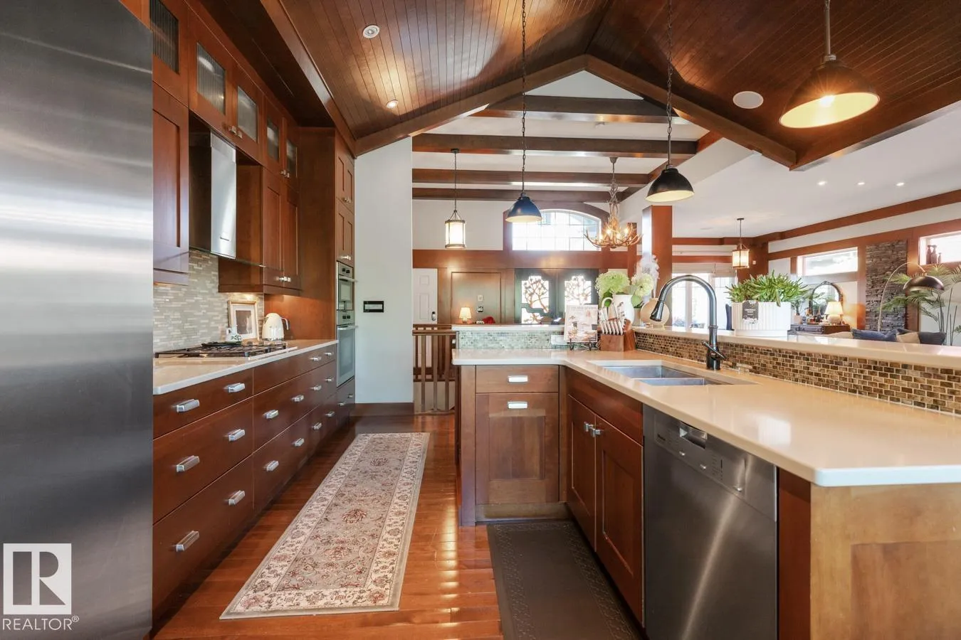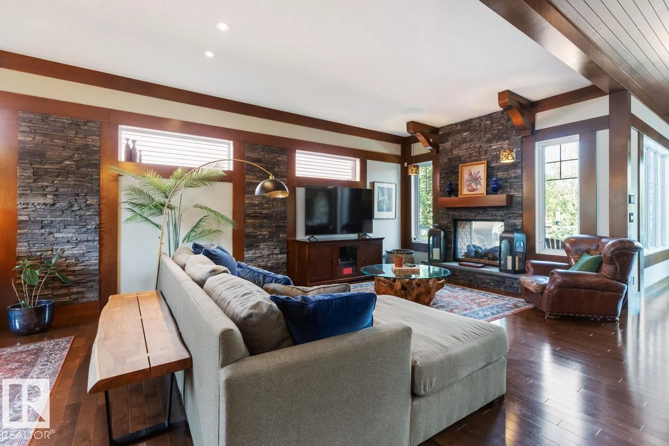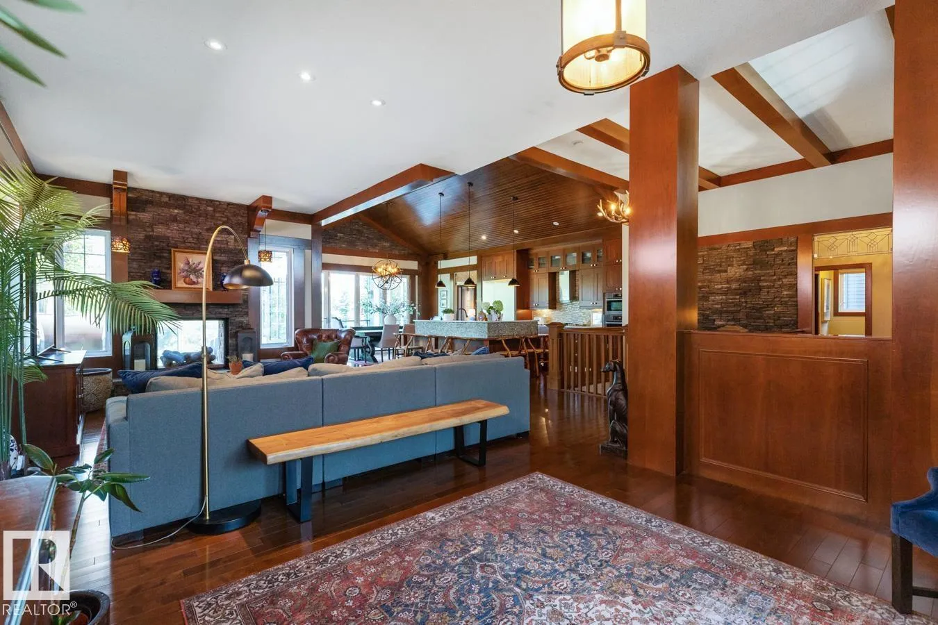 This stunning former Full House Lottery Dream Home offers luxury living in the exclusive Westpointe of Windermere, BACKING ONTO A TRANQUIL RAVINE. Built by Perry Built Homes, this WALKOUT BUNGALOW combines rustic elegance with high-end finishesâfeaturing soaring vaulted ceilings, rich wood and stone accents, and over 3,500 sqft of finished space. Inside you'll find Miele appliances, Control4 system, heated floors (basement + ensuite), a soundproofed theatre room, and a beautifully designed wine cellar. Expansive custom bifold sliding doors on both levels create seamless indoor-outdoor living. The double-sided fireplace anchors the open-concept main floor, while breathtaking landscaping enhances the front and back yards. Every detail of this home has been thoughtfully crafted for refined living and lasting enjoyment. With HardiePlank® siding, oversized garage, and ravine views, this home is a rare find that must be seen in person. (id:27476)