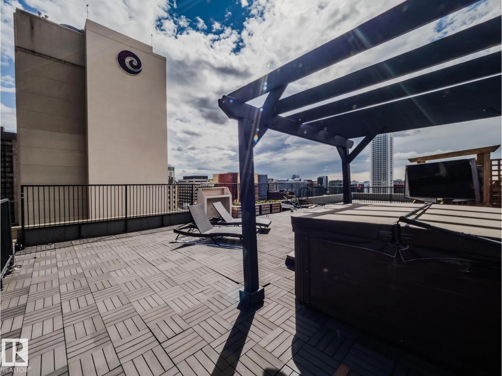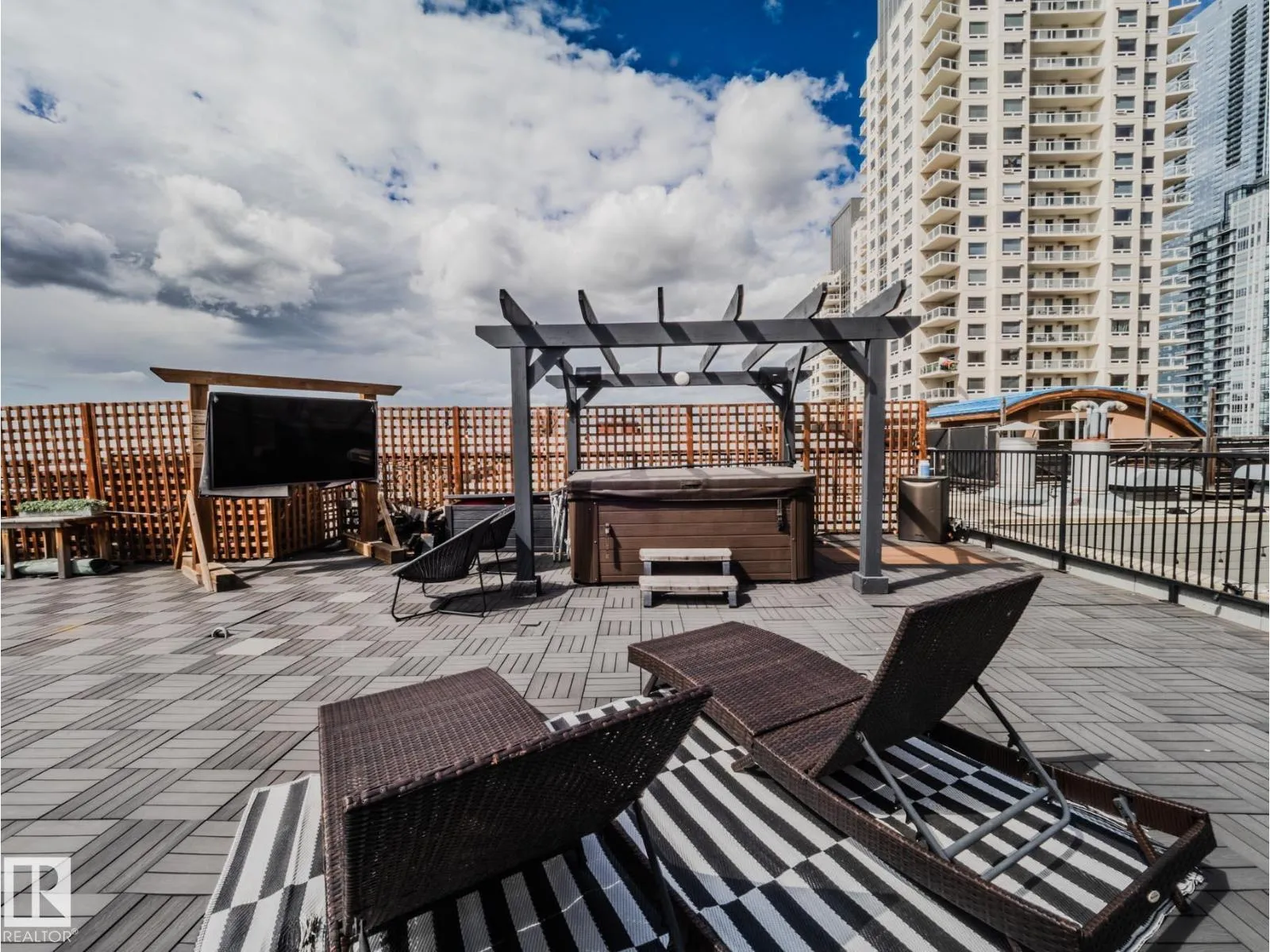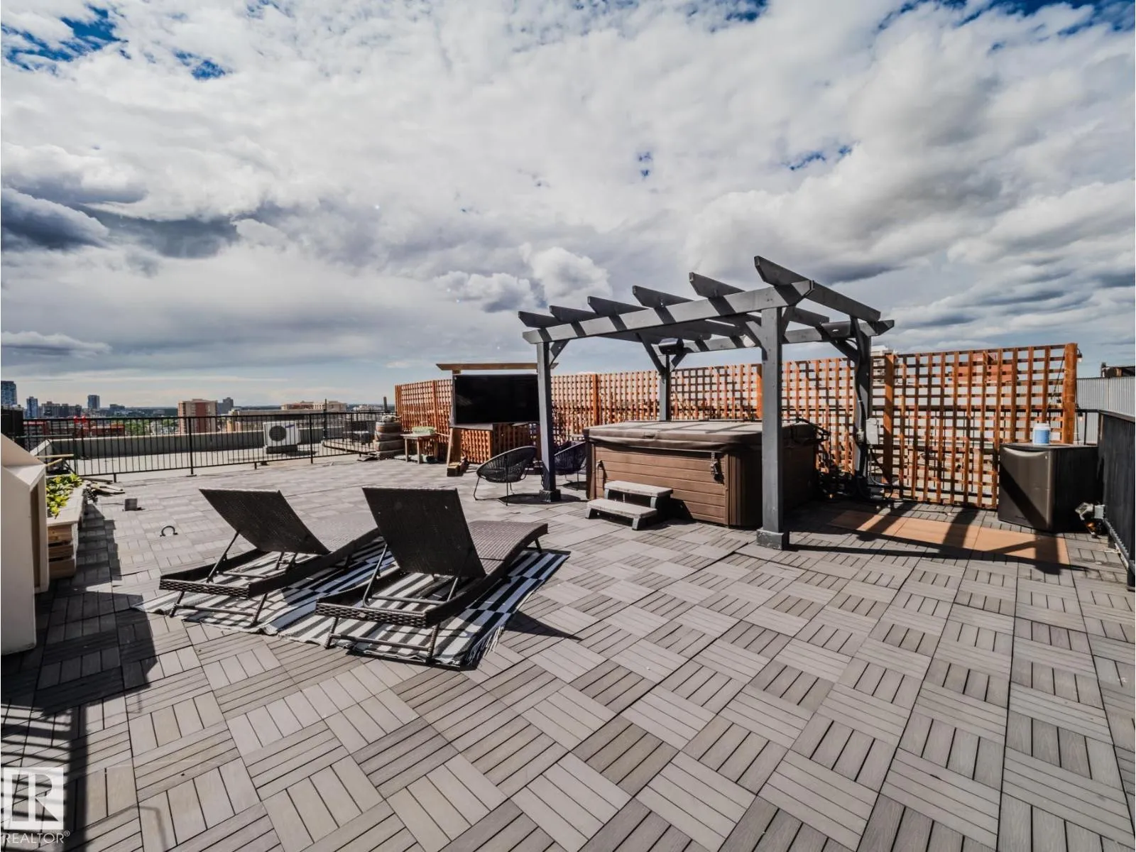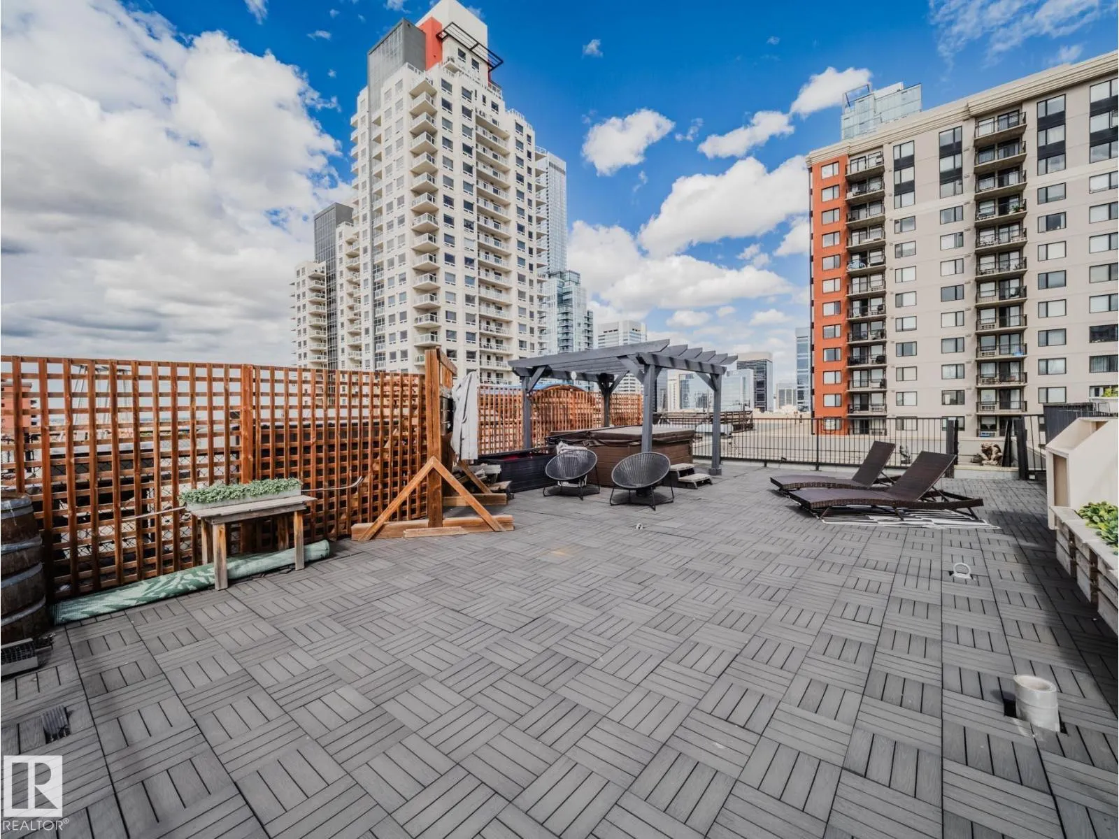Discover this stunning downtown Edmonton PENTHOUSE LOFT featuring soaring 14-foot ceilings and an impressive open concept design. The spacious kitchen offers ample counter space, abundant storage, DUAL FRIDGES, and STAINLESS STEEL APPLIANCESâperfect for entertaining. The bright living room boasts large windows that flood the space with natural light and connect seamlessly to the open-to-below loft, ideal for an office or den. The large primary bedroom includes custom built-in closets and a SPA-LIKE ENSUITE with walk-in shower. A 4-piece bathroom, generous storage room, and IN-SUITE LAUNDRY add convenience. Enjoy outdoor living with a BRAND NEW 500sqft courtyard patio with a basketball hoop, plus a private 1,000 sqft ROOF TOP PATIO with outdoor TV and HOT TUB. Walk to Rogers Place and the vibrant Ice District. Titled UNDERGROUND PARKING, LARGE TITLED STORAGE LOCKER, SURROUND SOUND, AIR CONDITIONING and a pet-friendly building complete this one-of-a-kind urban retreat. (id:27476)