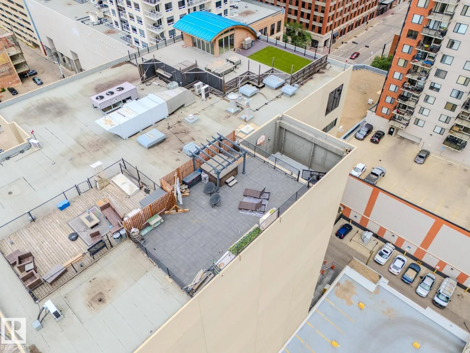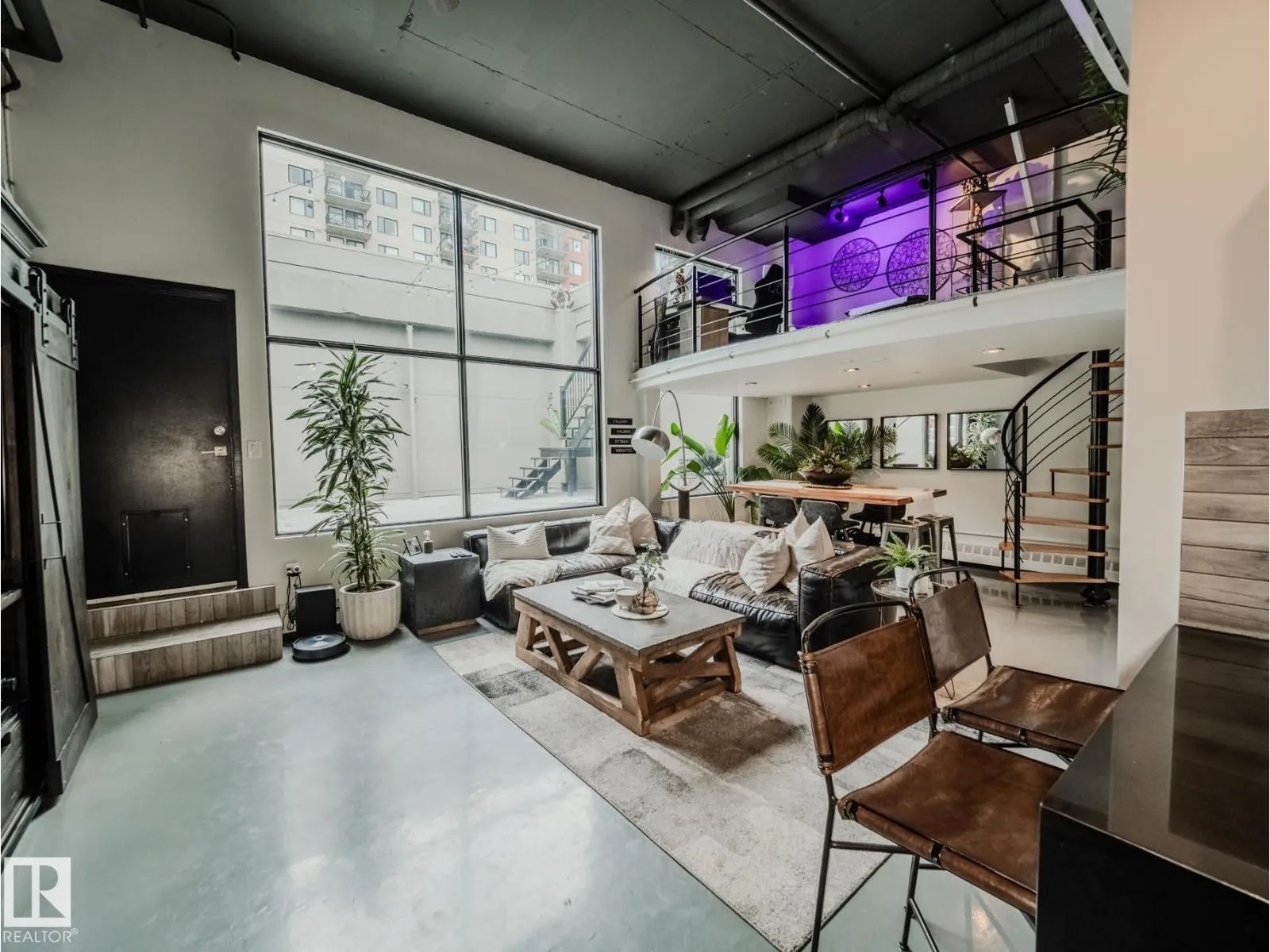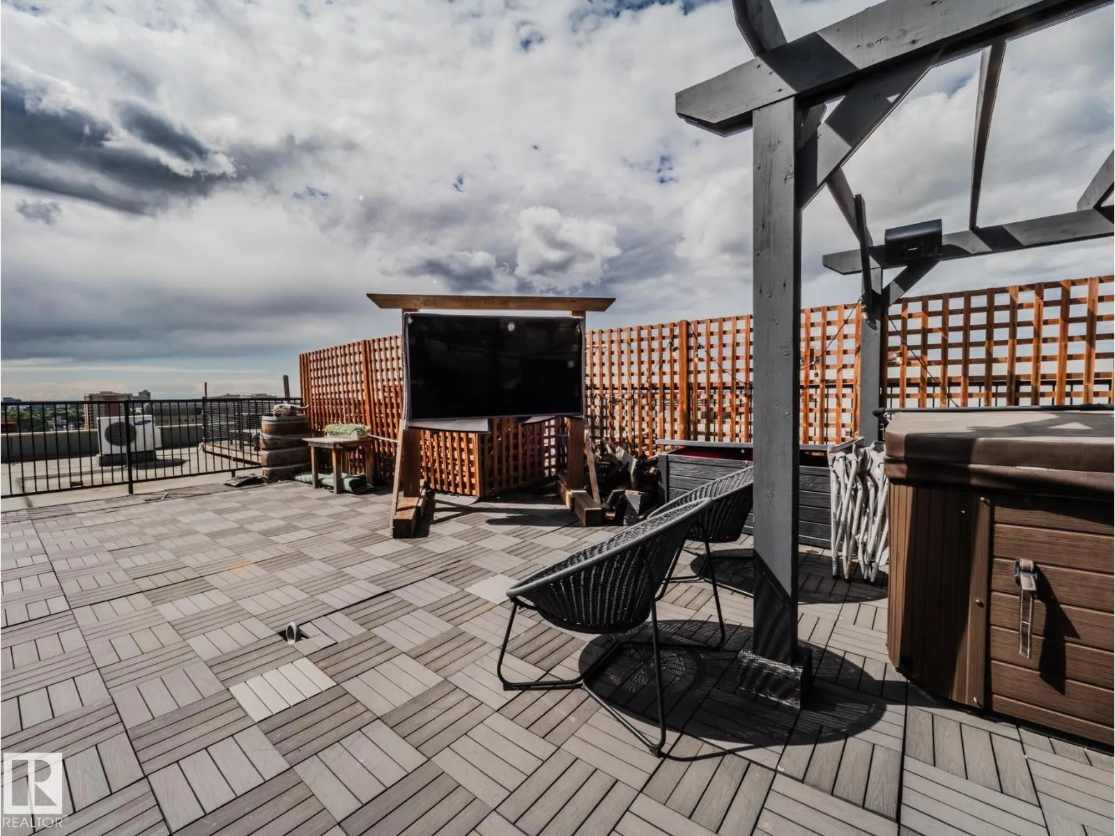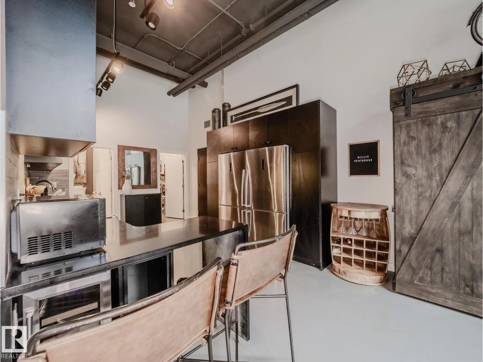 Discover this stunning downtown Edmonton PENTHOUSE LOFT featuring soaring 14-foot ceilings and an impressive open concept design. The spacious kitchen offers ample counter space, abundant storage, DUAL FRIDGES, and STAINLESS STEEL APPLIANCESâperfect for entertaining. The bright living room boasts large windows that flood the space with natural light and connect seamlessly to the open-to-below loft, ideal for an office or den. The large primary bedroom includes custom built-in closets and a SPA-LIKE ENSUITE with walk-in shower. A 4-piece bathroom, generous storage room, and IN-SUITE LAUNDRY add convenience. Enjoy outdoor living with a BRAND NEW 500sqft courtyard patio with a basketball hoop, plus a private 1,000 sqft ROOF TOP PATIO with outdoor TV and HOT TUB. Walk to Rogers Place and the vibrant Ice District. Titled UNDERGROUND PARKING, LARGE TITLED STORAGE LOCKER, SURROUND SOUND, AIR CONDITIONING and a pet-friendly building complete this one-of-a-kind urban retreat. (id:27476)