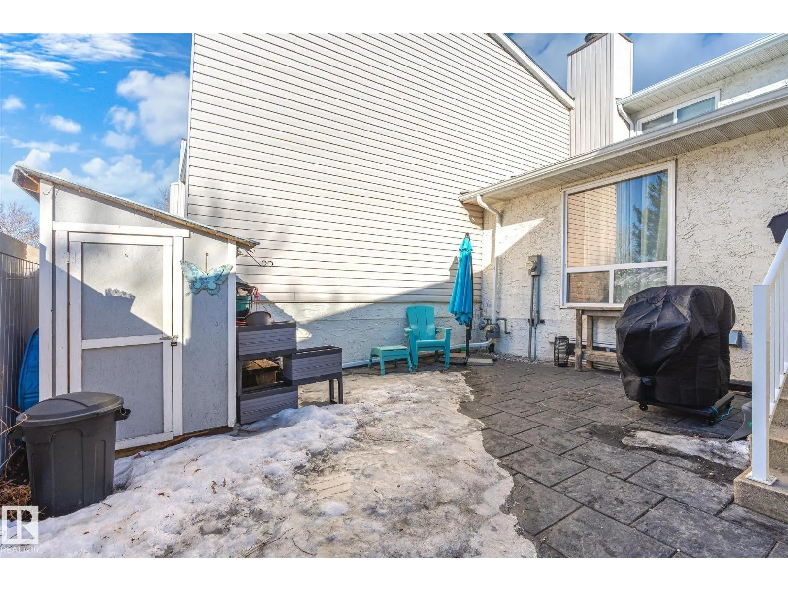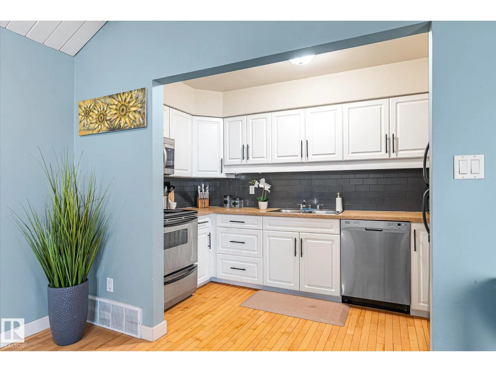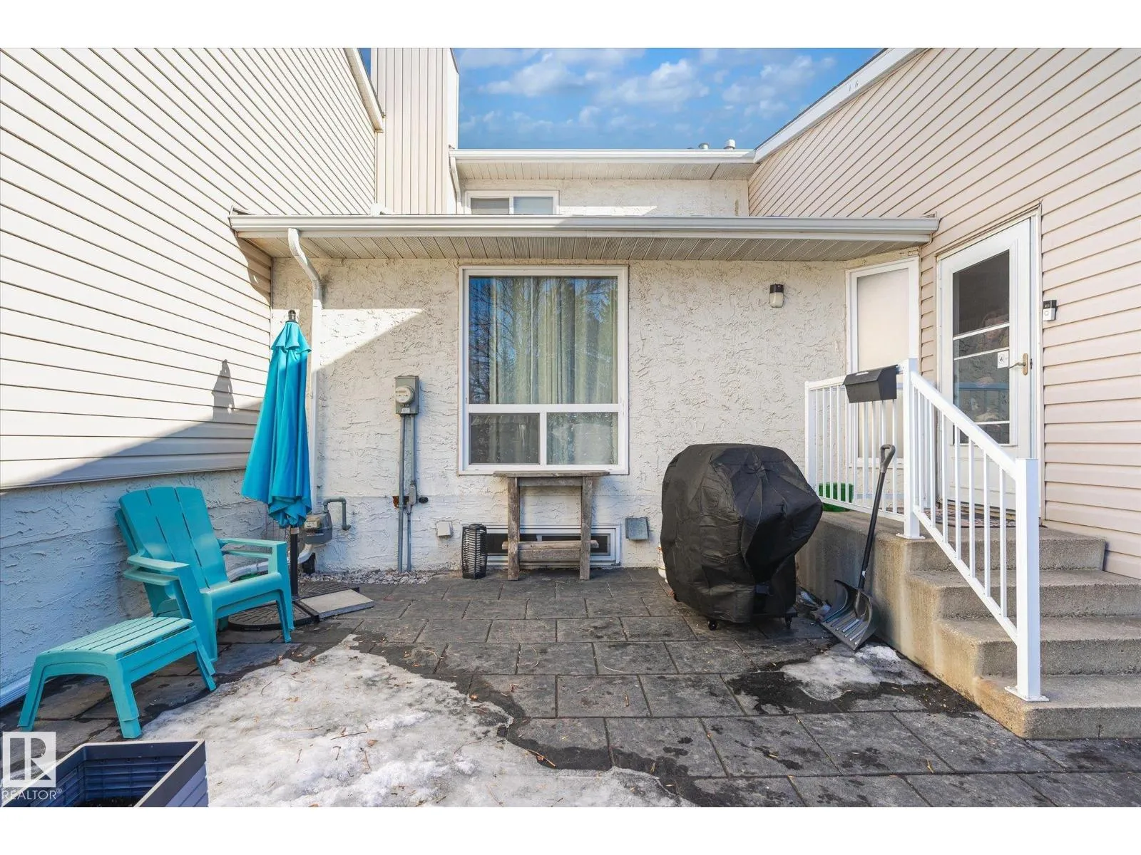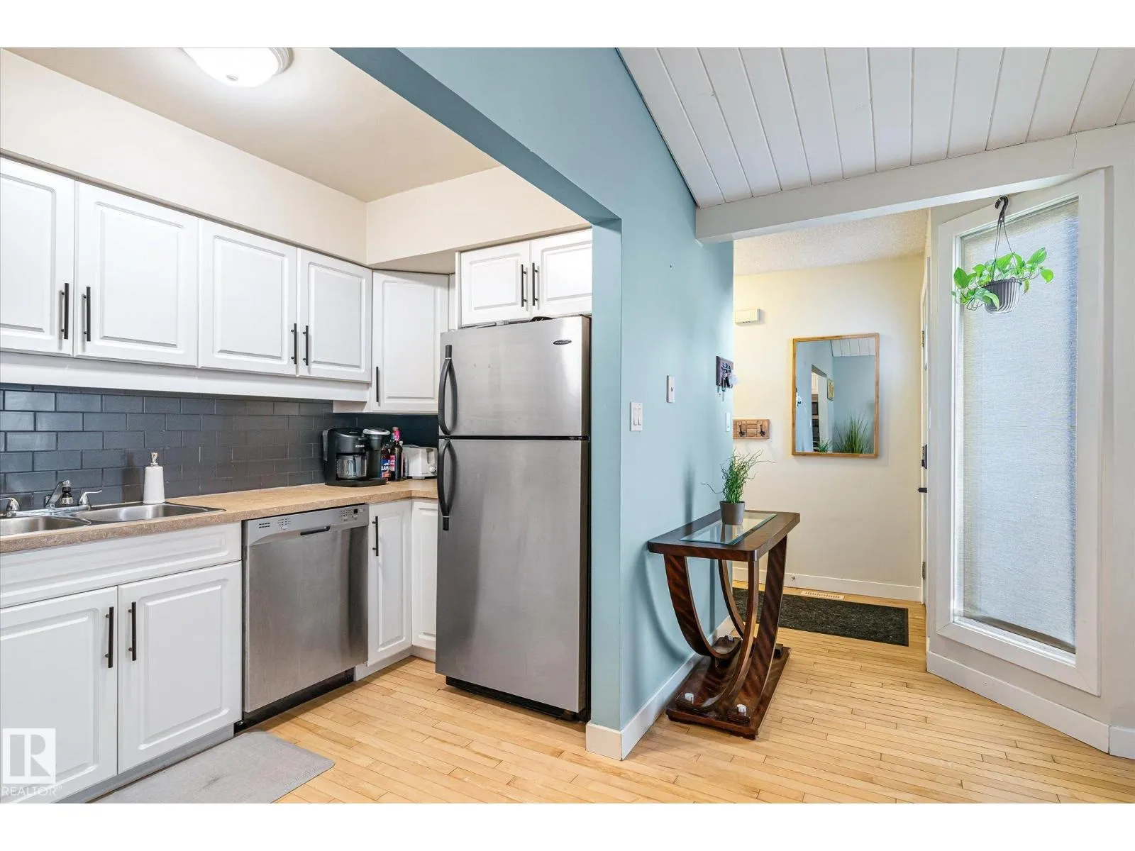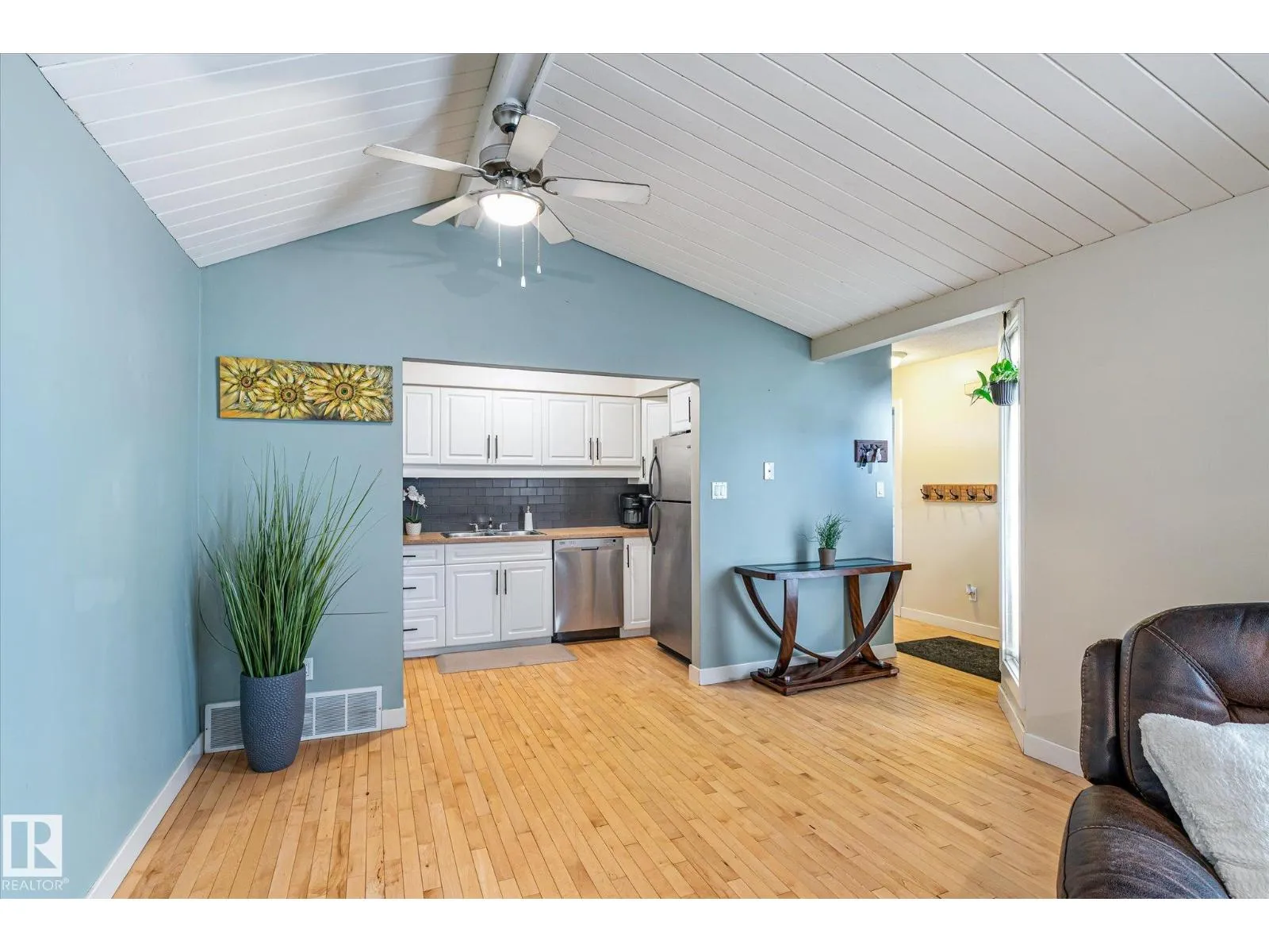 Welcome to this charming bungalow-style townhouse in the Caernarvon community! Beautiful maple hardwood flooring flows throughout the main level, creating a warm and inviting space. The updated kitchen features white cabinetry and stainless steel appliances and opens to a very spacious, cozy living room with room for a dining nook. Two large bedrooms and a spacious full bathroom complete the main floor. The basement offers a generous layout with one finished den with window and a large open area ready for future development or use as is, along with laundry and mechanical space. Enjoy the large fenced in & private front patio with plenty of room for relaxing, entertaining, or BBQing. This well-run complex is conveniently located close to schools, shopping, amenities, and public transportation. One parking stall is included, with ample street parking available. Great investment opportunity or home for a small family. (id:27476)