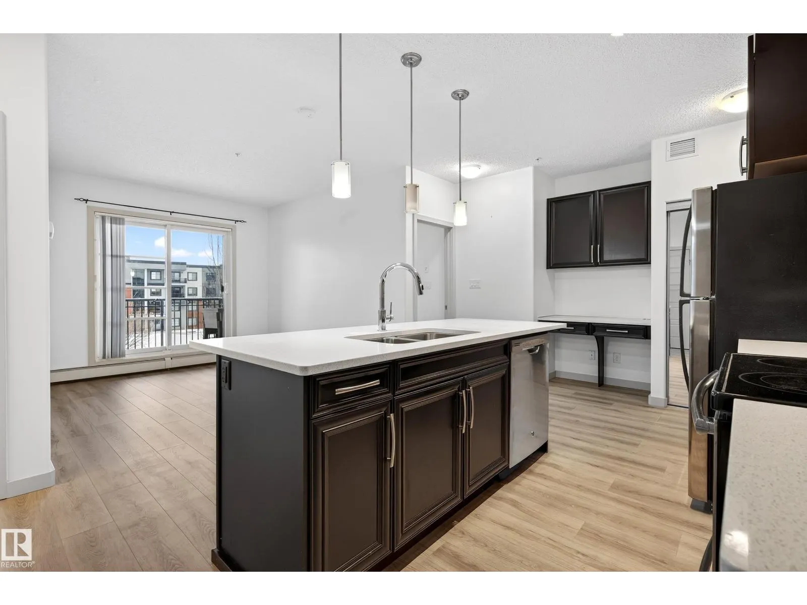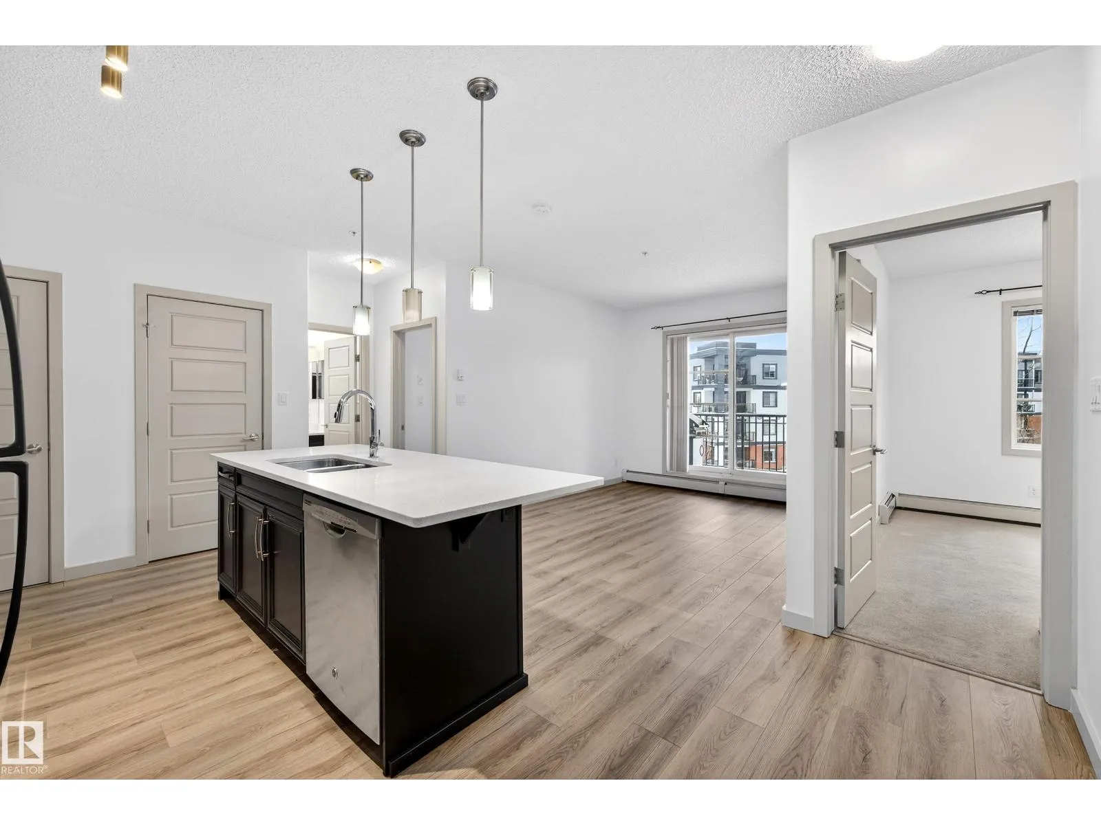 WELCOME TO ELAN! Another exceptional project by Carrington Communities! This 2 bed, 2 bath suite offers a partial ravine view and is loaded with upgrades: stainless steel appliances, full-height backsplash, quartz countertops throughout, pendant lighting, new laminate flooring, new paint, in-suite laundry, pantry, and a built-in tech center with added storage. The primary suite features a walk-through his & hers mirrored closet and a spacious 5' walk-in shower. Enjoy your private balcony with a natural gas BBQ line and one underground parking stall. Building amenities include a state-of-the-art fitness center, social room with wet bar & billiards, and video surveillance. Nestled next to the ravine, you're just minutes from scenic trails, shopping, transit, and Anthony Henday access. Donât miss your chance to own in this fantastic location! Virtually Staged (id:27476)