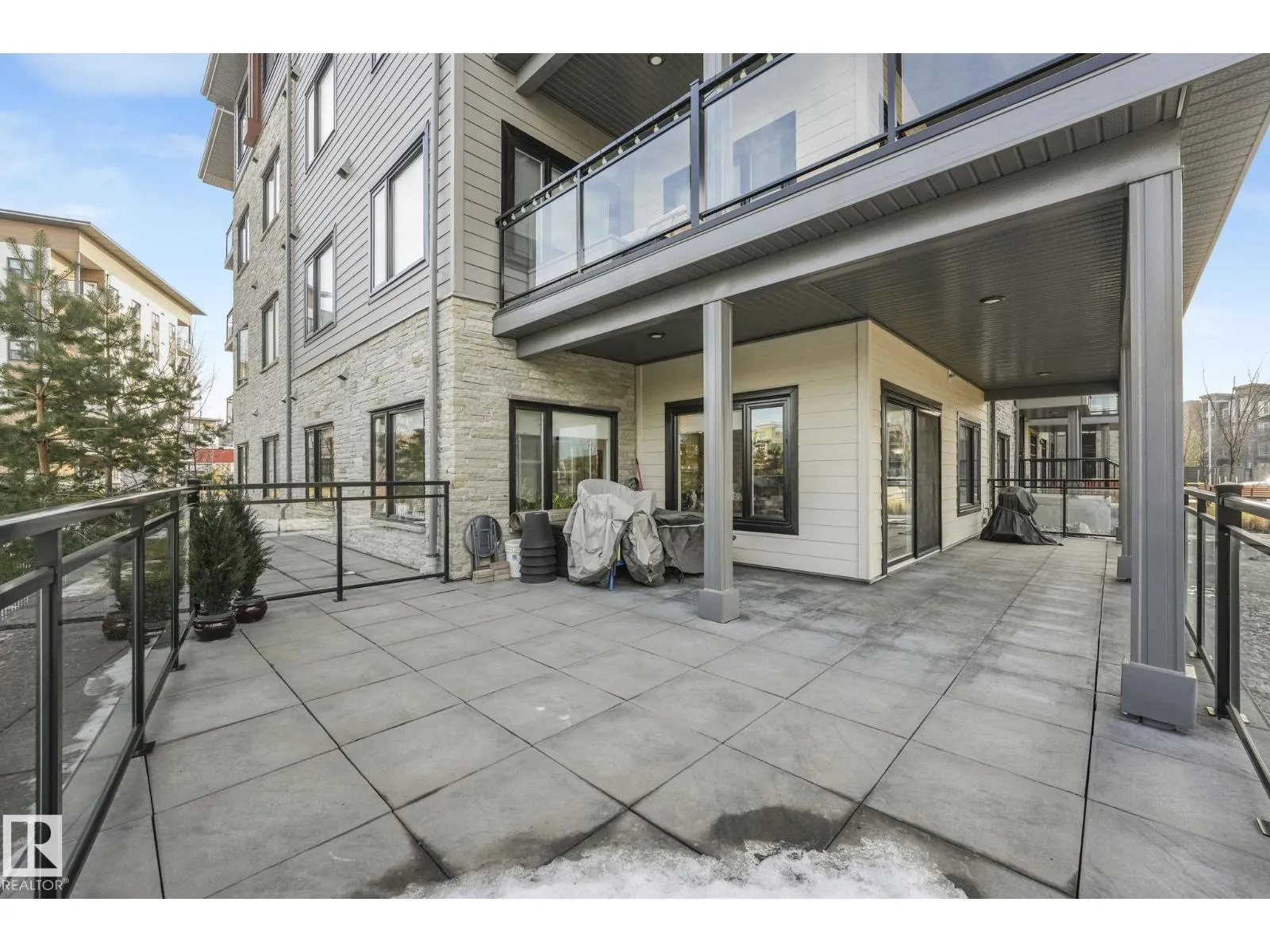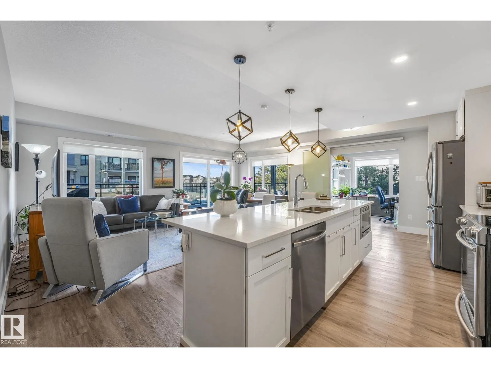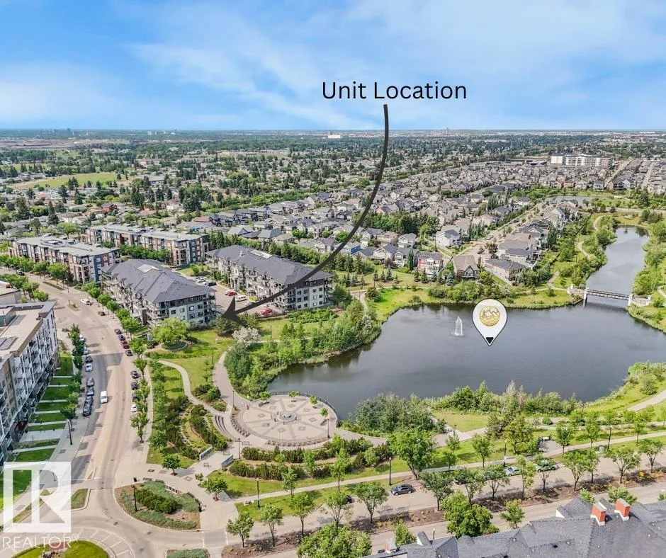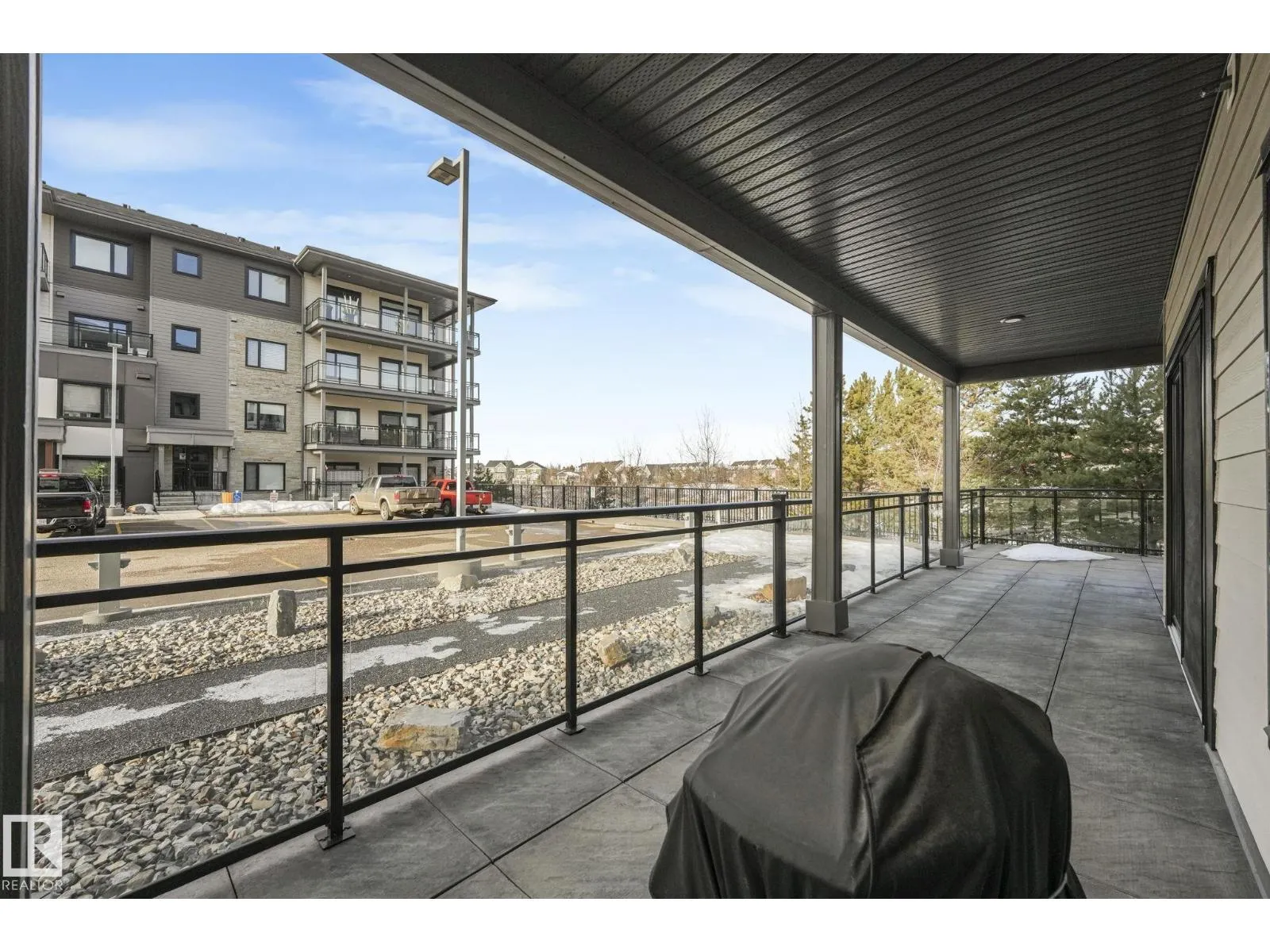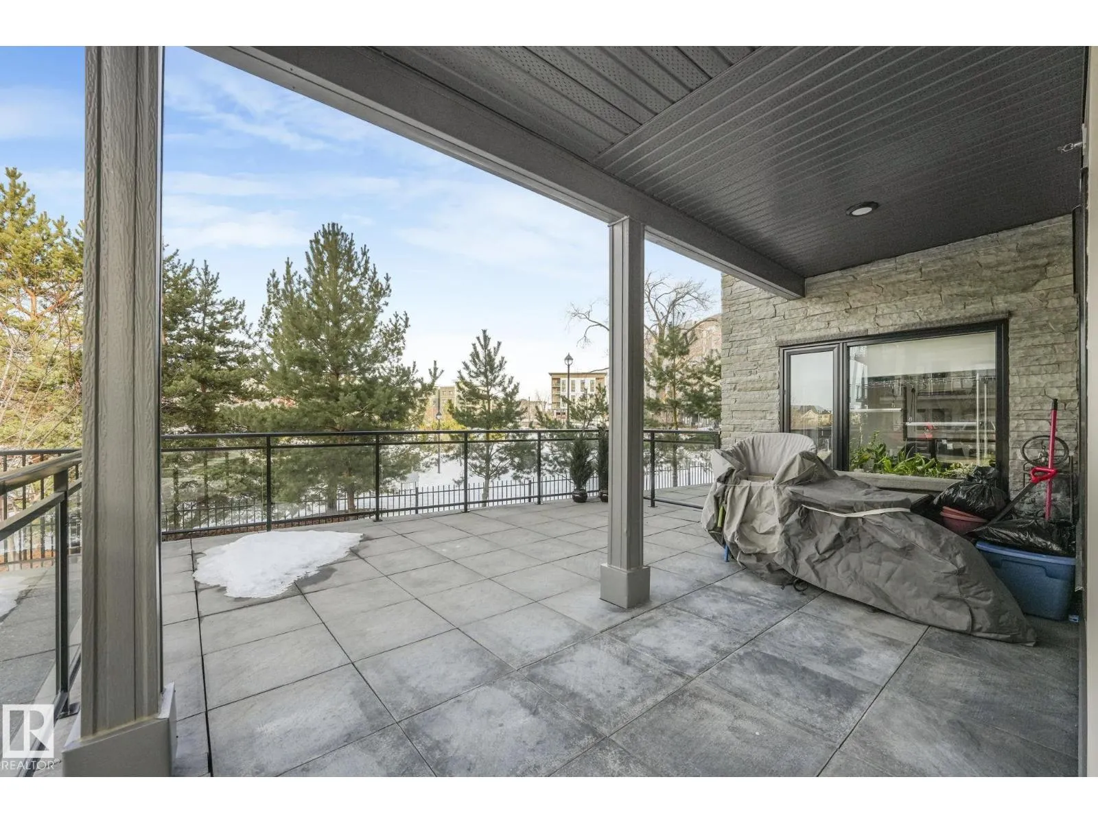 Pristine Original Owner 2 Bed, 2 Bath + Den Condo. Step into Style & Taste! Featuring 1316 sf, 9' Ceilings, Expansive Windows w/Custom Blinds, Kitchen w/Quartz Counter Top, 10' Island, SS Appliances & Crisp White Shaker Cabinets w/ Extended Uppers. The Open Layout is Perfect for Entertaining w/ Seating at the Island, Large Dining Space, Welcoming Living Rm & Huge 545 sf Wrap Around Patio w/West & North Exposures & Gas BBQ line for Year Round Grilling. Thoughtfully Designed w/Spacious Primary Featuring a Gorgeous 4pc. Ensuite & Lg. Walk-In Closet, Functional & Bright Den w/ Lake View & Sliding Privacy Doors, Guest Bed w/its Own Walk-In Closet, Full Size Laundry Rm w/ Quartz Counter-Top & Upper Cabinets. Add'l Upgrades & Features; Closet Organizers, Central A/C & 2 Titled Parking Stalls incl. 1 Underground w/Storage Cage & 1 Surface Right Outside your Patio. One of Edmonton's Premiere Communities Surrounded by Over 5km of Walking Trails, Lakes, Amenities, Shops & Dining. Shows 10/10! (id:27476)