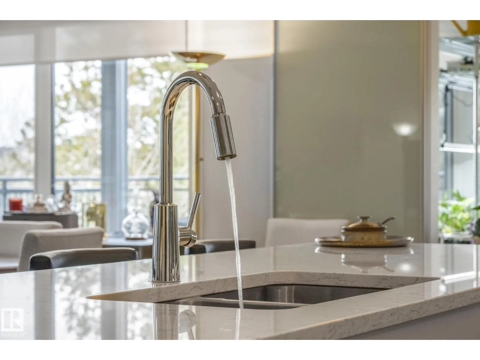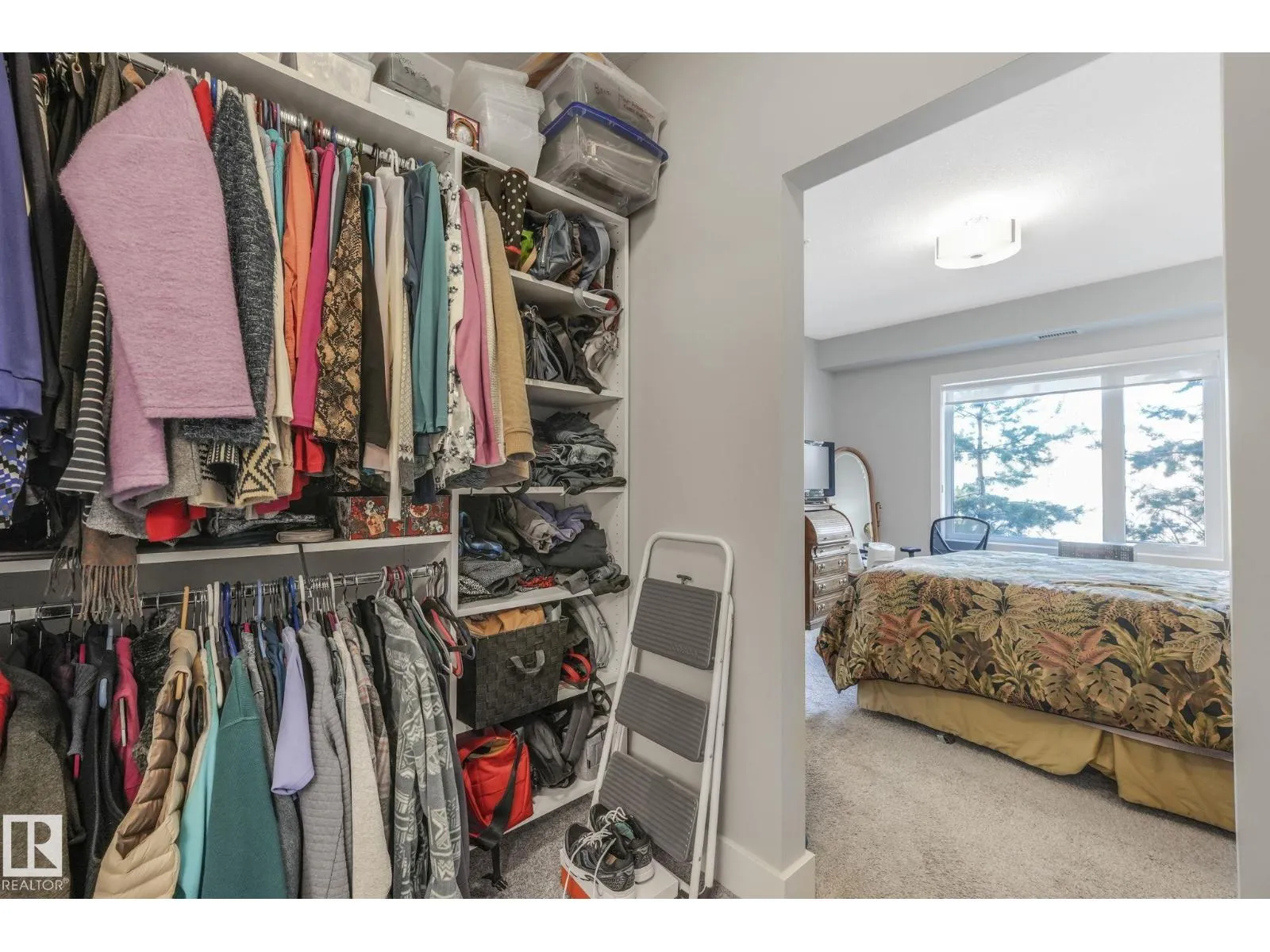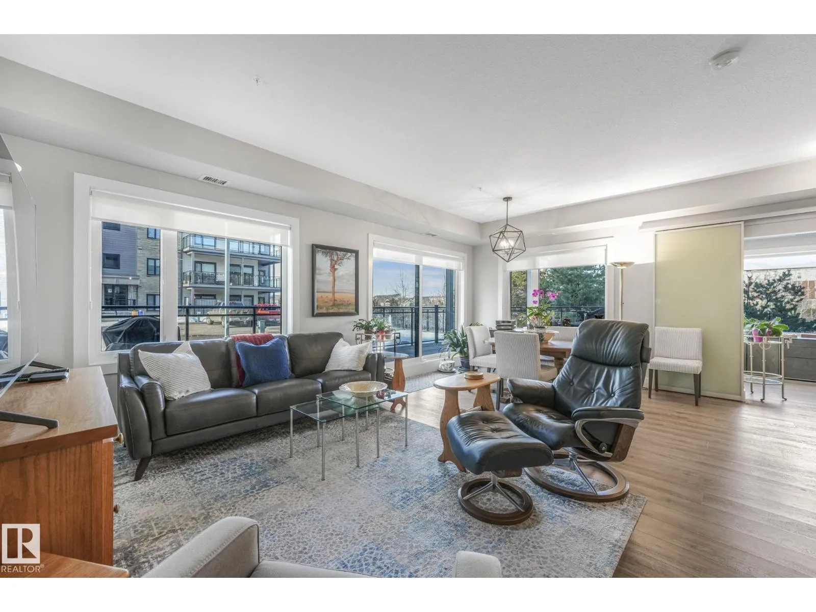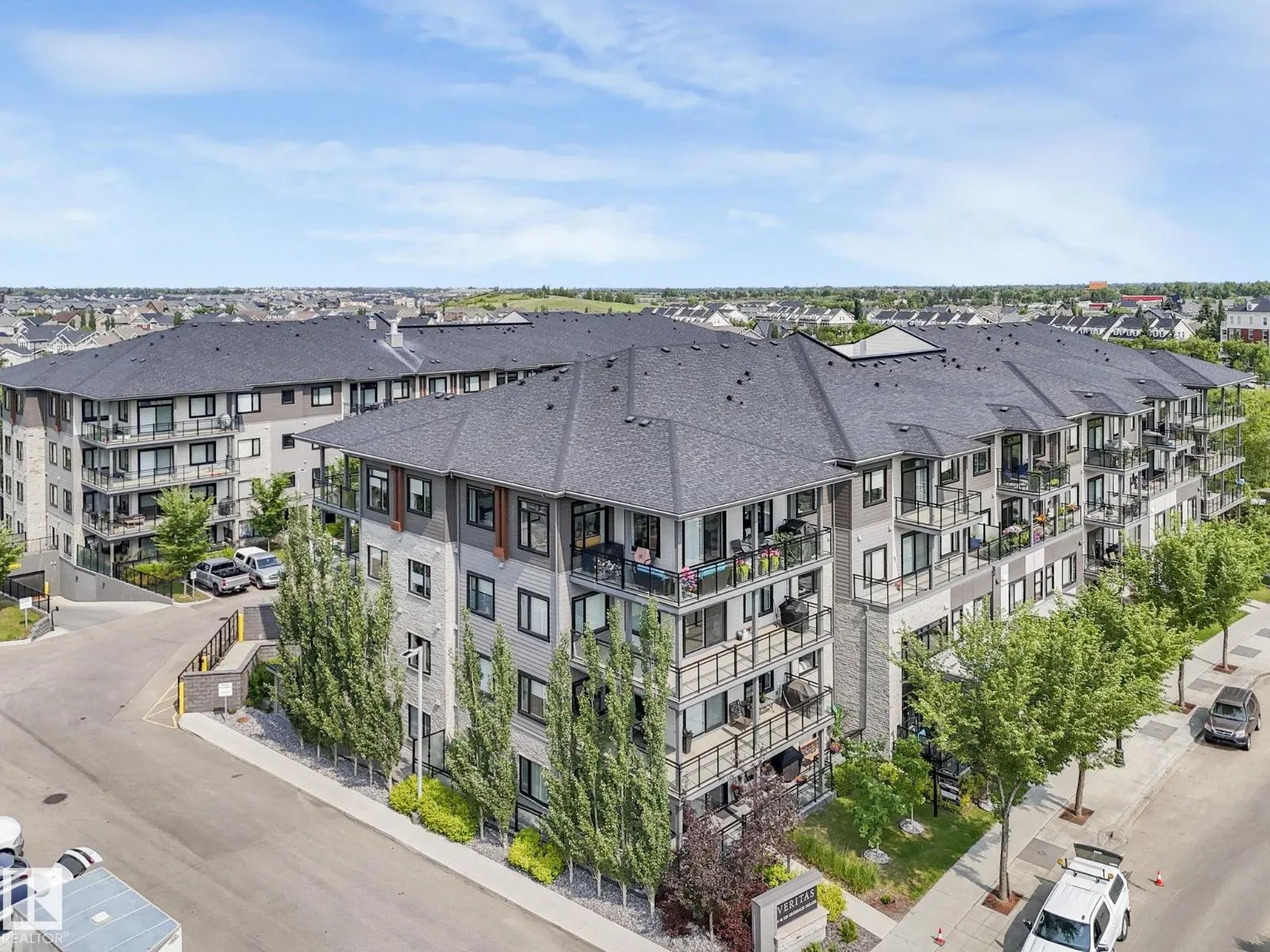 Pristine Original Owner 2 Bed, 2 Bath + Den Condo. Step into Style & Taste! Featuring 1316 sf, 9' Ceilings, Expansive Windows w/Custom Blinds, Kitchen w/Quartz Counter Top, 10' Island, SS Appliances & Crisp White Shaker Cabinets w/ Extended Uppers. The Open Layout is Perfect for Entertaining w/ Seating at the Island, Large Dining Space, Welcoming Living Rm & Huge 545 sf Wrap Around Patio w/West & North Exposures & Gas BBQ line for Year Round Grilling. Thoughtfully Designed w/Spacious Primary Featuring a Gorgeous 4pc. Ensuite & Lg. Walk-In Closet, Functional & Bright Den w/ Lake View & Sliding Privacy Doors, Guest Bed w/its Own Walk-In Closet, Full Size Laundry Rm w/ Quartz Counter-Top & Upper Cabinets. Add'l Upgrades & Features; Closet Organizers, Central A/C & 2 Titled Parking Stalls incl. 1 Underground w/Storage Cage & 1 Surface Right Outside your Patio. One of Edmonton's Premiere Communities Surrounded by Over 5km of Walking Trails, Lakes, Amenities, Shops & Dining. Shows 10/10! (id:27476)