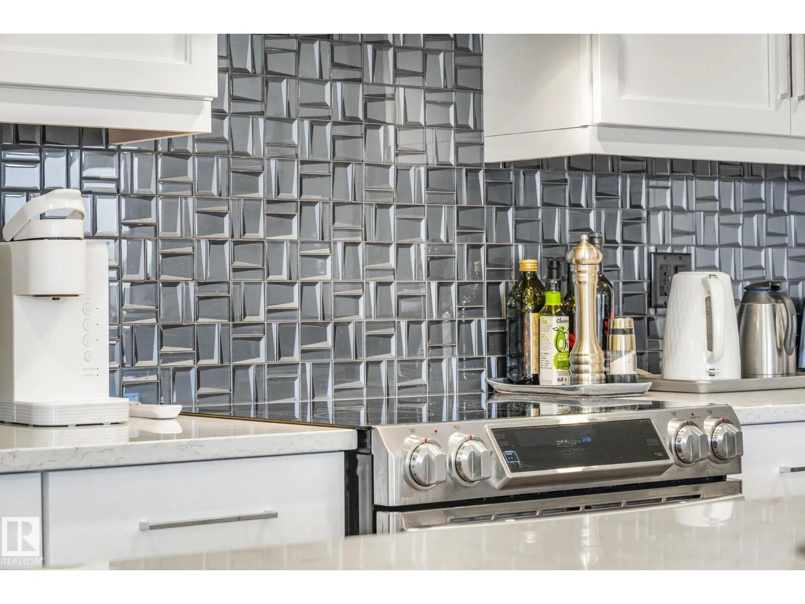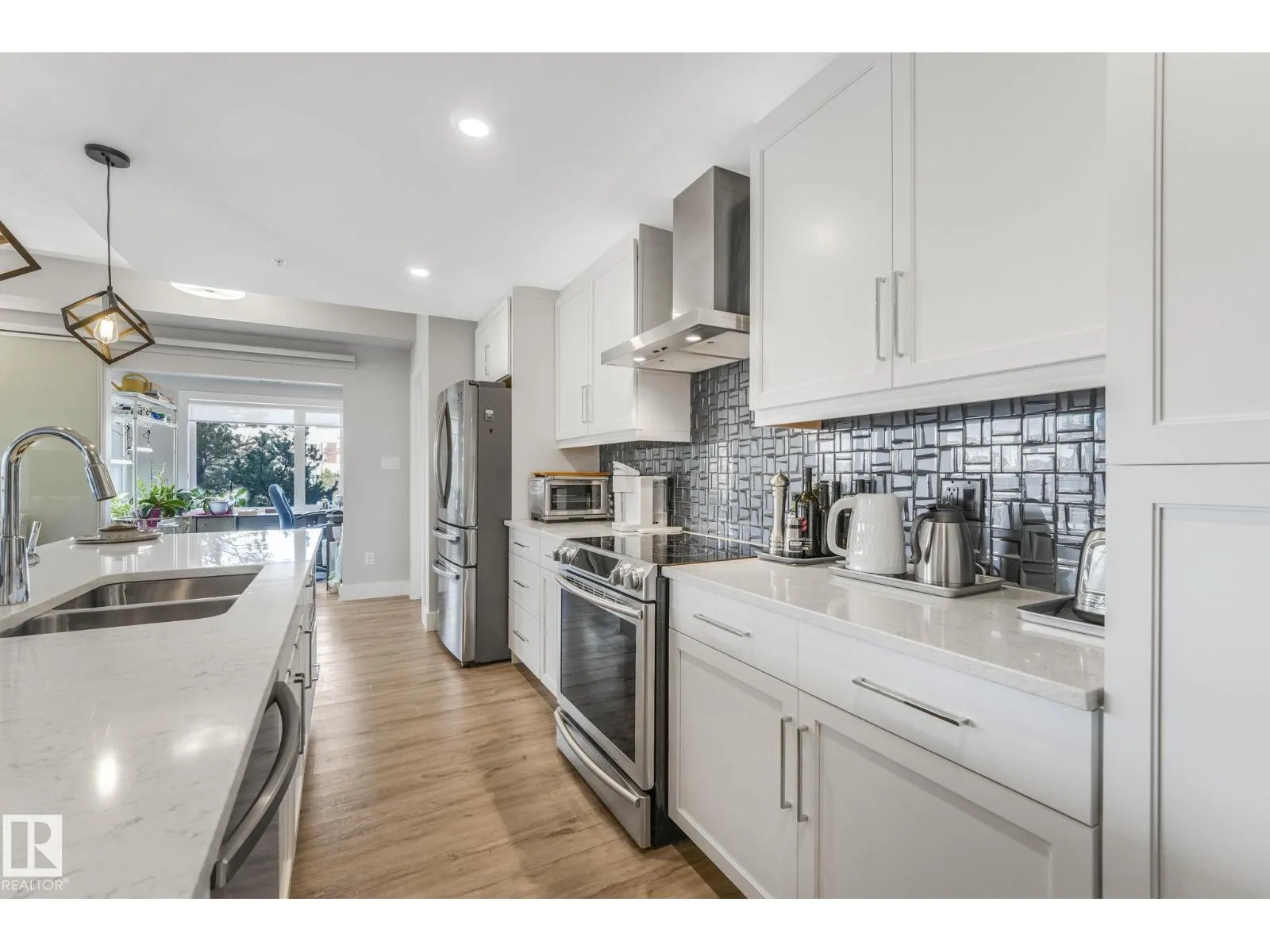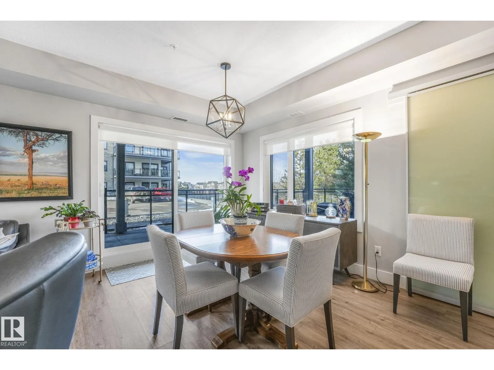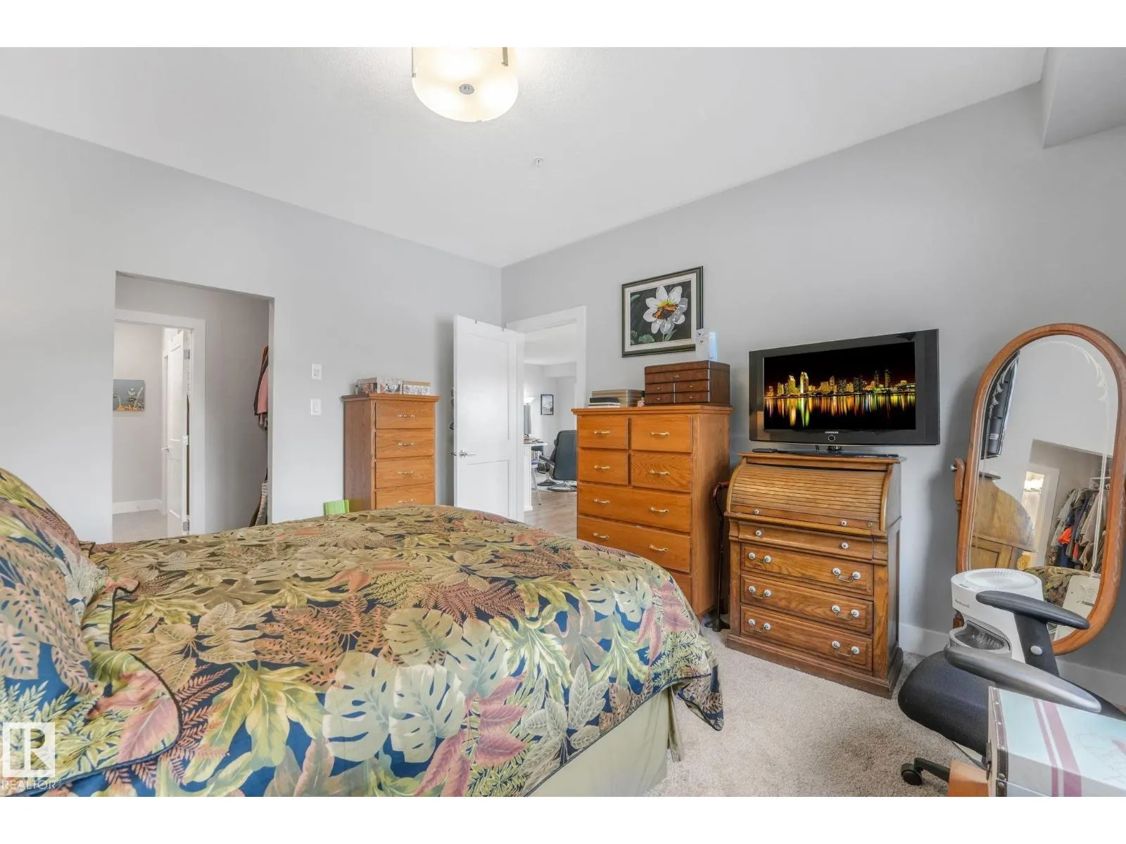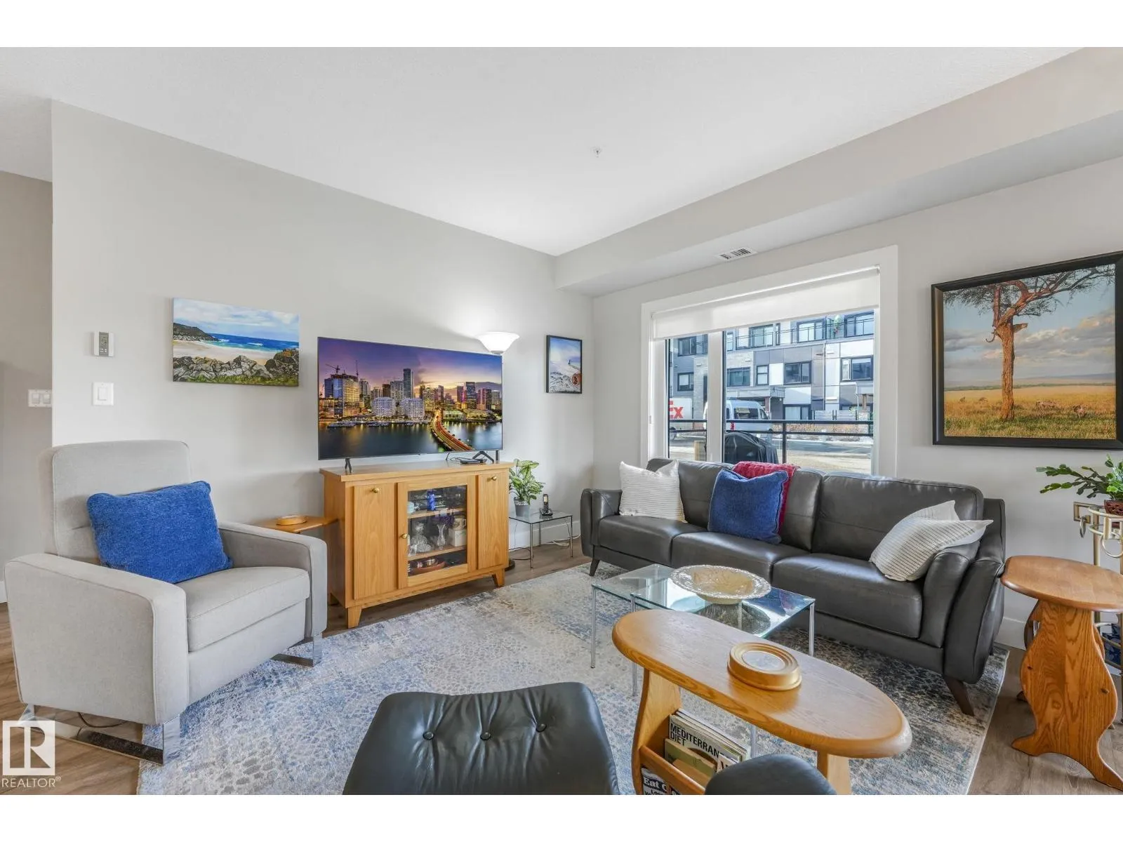 Pristine Original Owner 2 Bed, 2 Bath + Den Condo. Step into Style & Taste! Featuring 1316 sf, 9' Ceilings, Expansive Windows w/Custom Blinds, Kitchen w/Quartz Counter Top, 10' Island, SS Appliances & Crisp White Shaker Cabinets w/ Extended Uppers. The Open Layout is Perfect for Entertaining w/ Seating at the Island, Large Dining Space, Welcoming Living Rm & Huge 545 sf Wrap Around Patio w/West & North Exposures & Gas BBQ line for Year Round Grilling. Thoughtfully Designed w/Spacious Primary Featuring a Gorgeous 4pc. Ensuite & Lg. Walk-In Closet, Functional & Bright Den w/ Lake View & Sliding Privacy Doors, Guest Bed w/its Own Walk-In Closet, Full Size Laundry Rm w/ Quartz Counter-Top & Upper Cabinets. Add'l Upgrades & Features; Closet Organizers, Central A/C & 2 Titled Parking Stalls incl. 1 Underground w/Storage Cage & 1 Surface Right Outside your Patio. One of Edmonton's Premiere Communities Surrounded by Over 5km of Walking Trails, Lakes, Amenities, Shops & Dining. Shows 10/10! (id:27476)