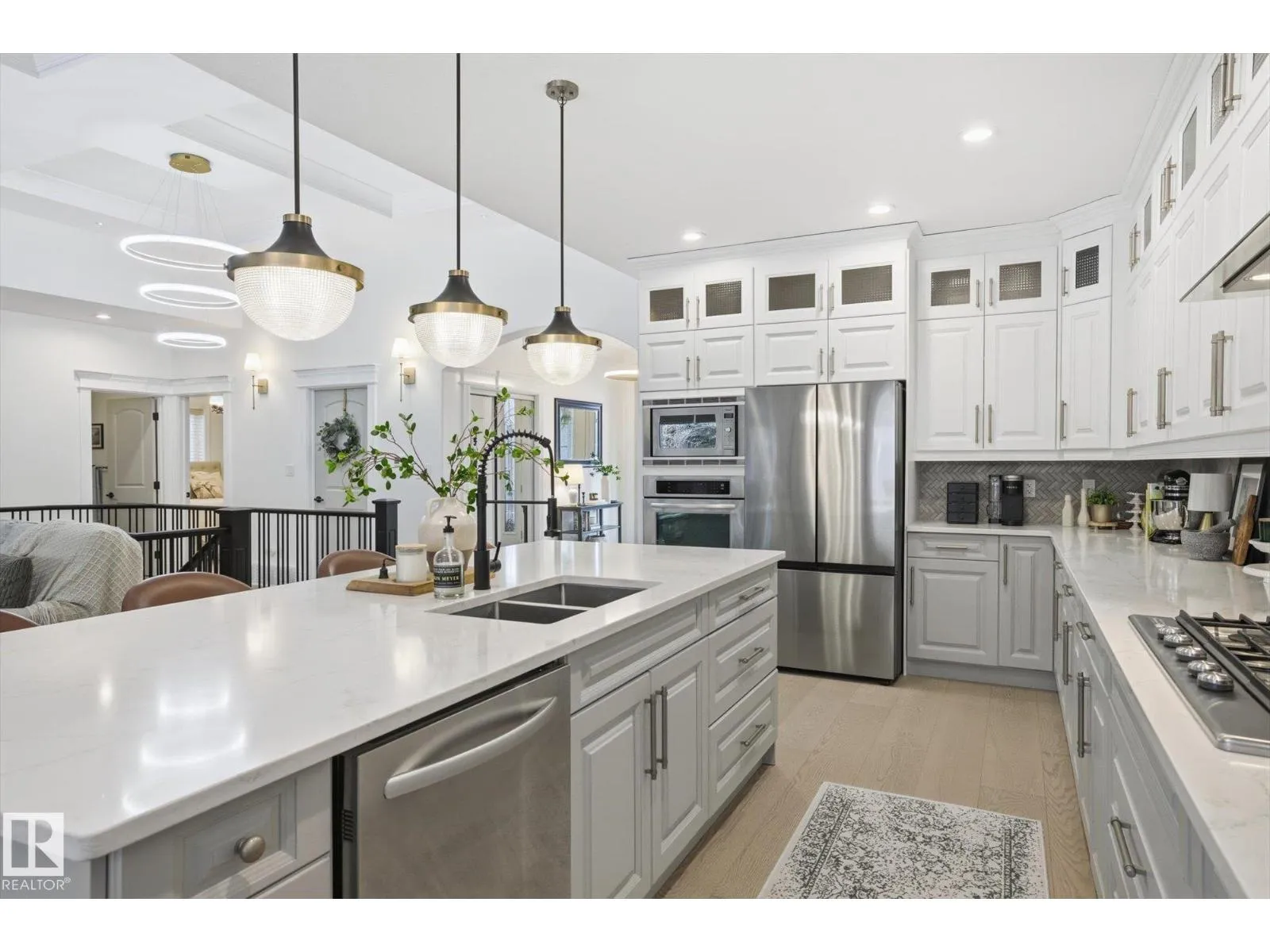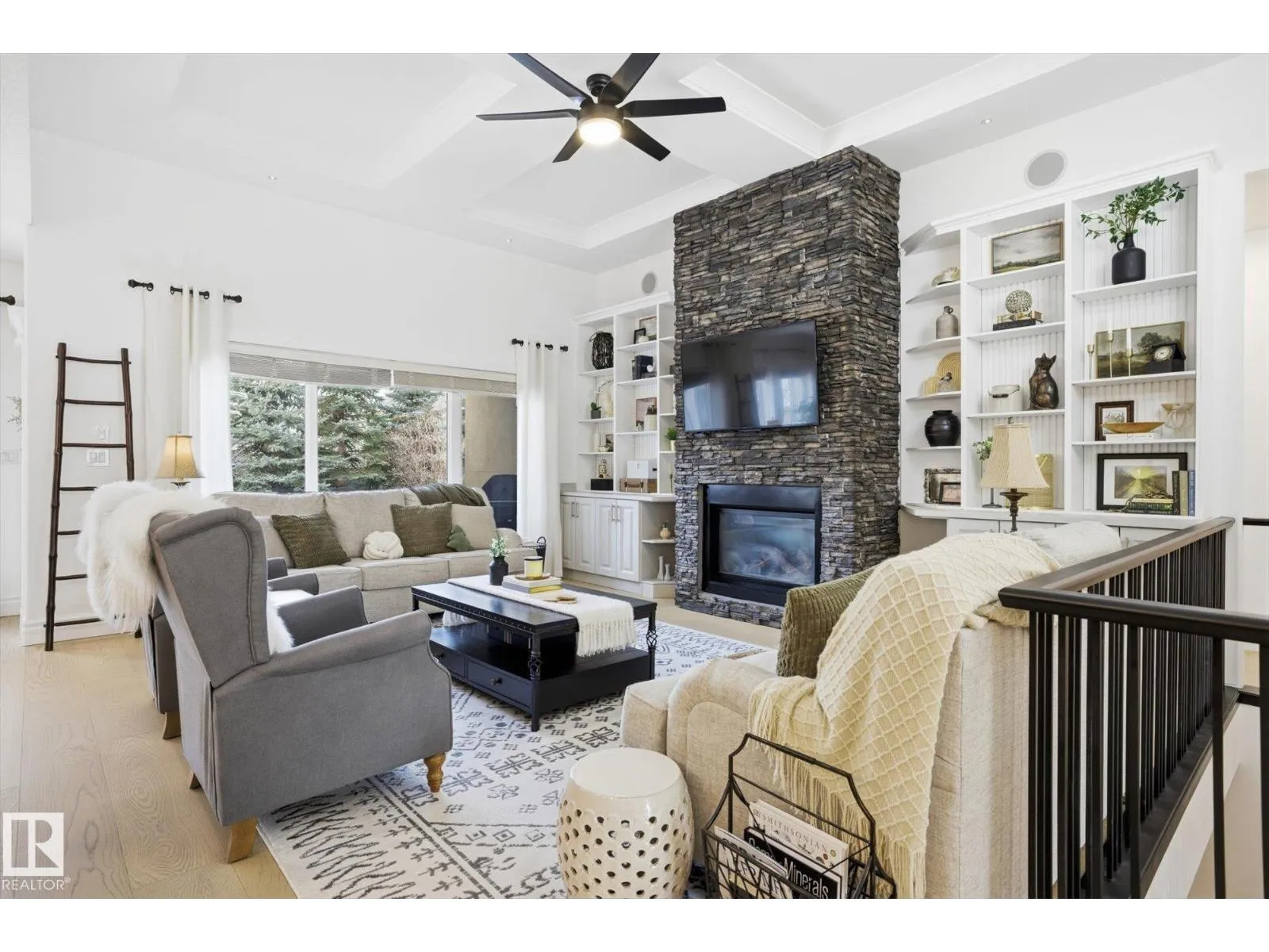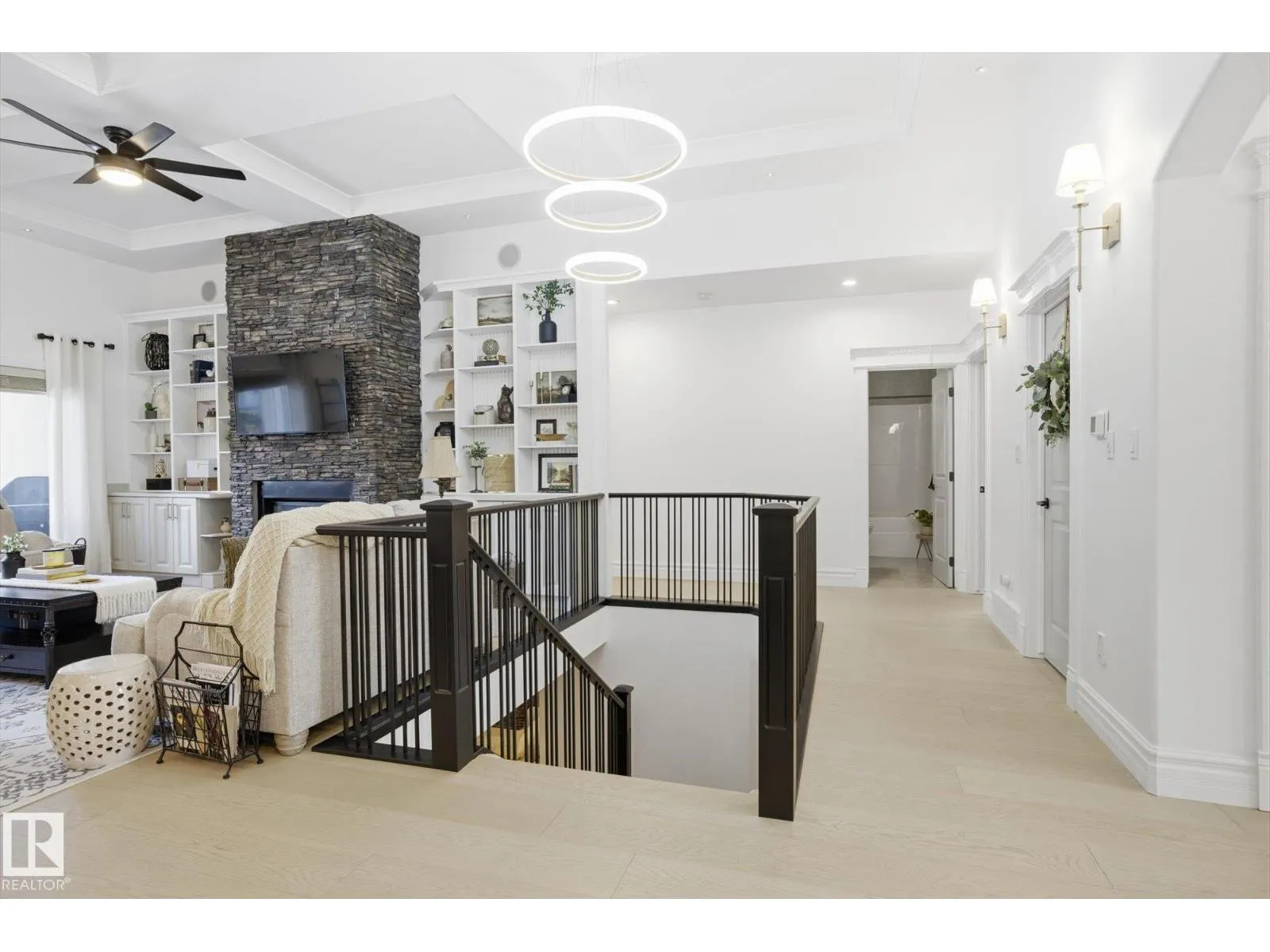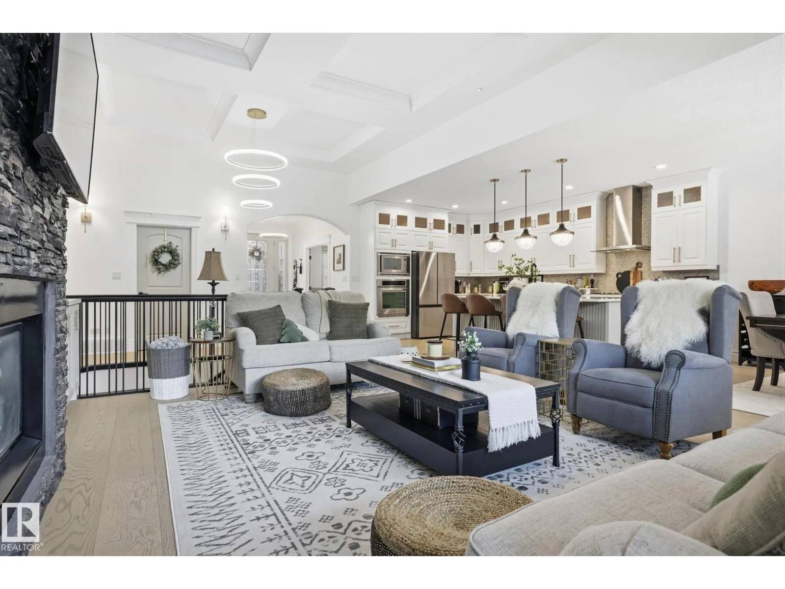 Fully renovated executive bungalow offering nearly 3,700 sq ft of finished living space in the exclusive gated community of Ravines of Richford. The open-concept main floor features 11â coffered ceilings, stacked-stone NG FP, custom built-ins, & new 9â white oak hardwood flooring throughout. Recent updates include fresh paint, lighting, tilework, refinished cabinetry, & upgraded appliances, creating a bright, cohesive aesthetic. The kitchen offers granite countertops, a large island, & flows into the dining area overlooking a fully fenced, landscaped pie-shaped lot. The primary suite is generously sized w/ a 5-piece ensuite & walk-in closet. A den with French doors, second bedroom, full bath, & spacious laundry/mudroom complete the main level. The finished lower level includes a large games room, wet bar w/ beverage cooler, media/theatre room w/ surround sound, 2 bedrooms, full bath, & ample storage. 2025 high-efficiency furnace, humidifier, & water-conditioner plus it comes w/ AC & double att. garage! (id:27476)